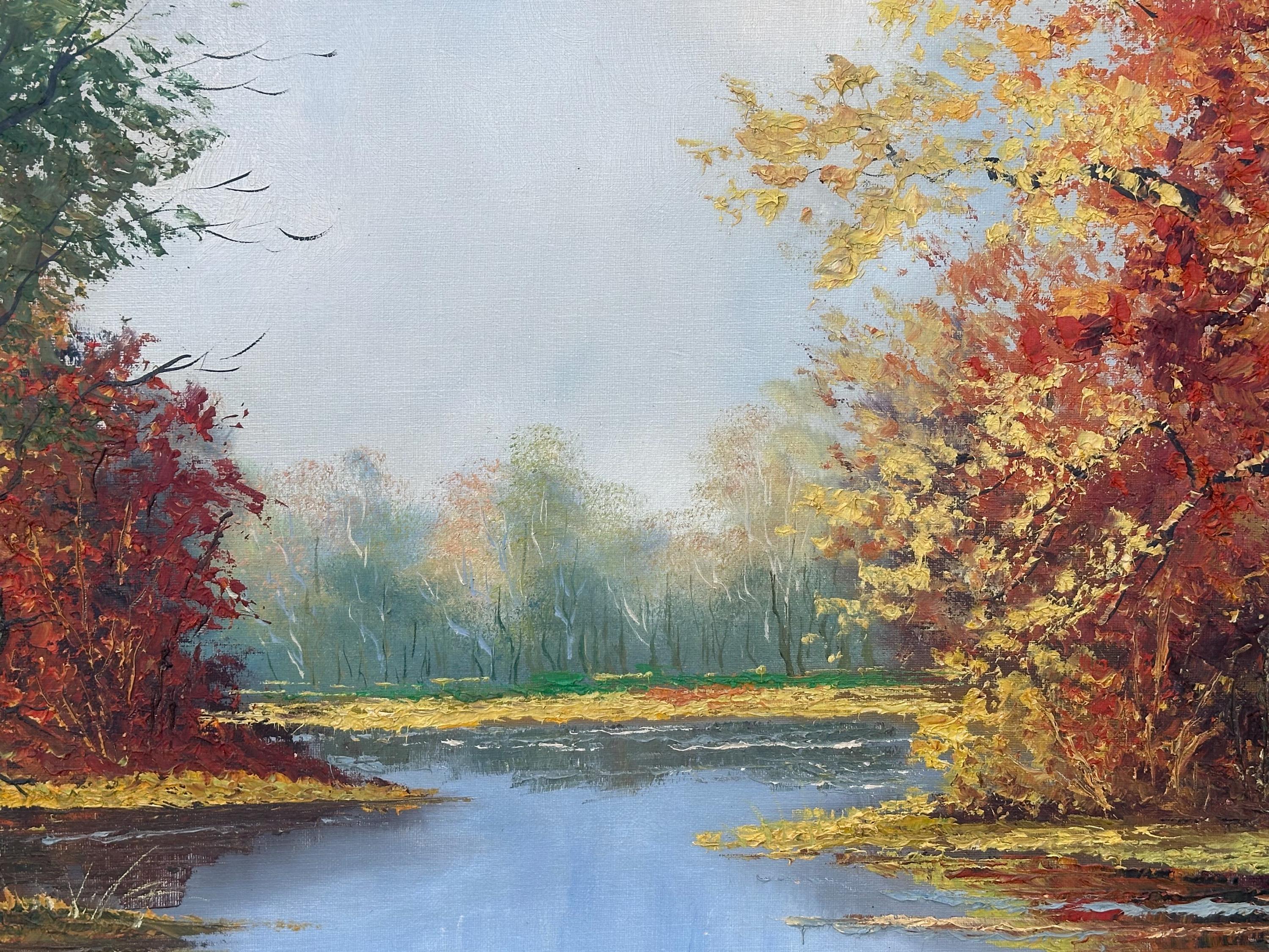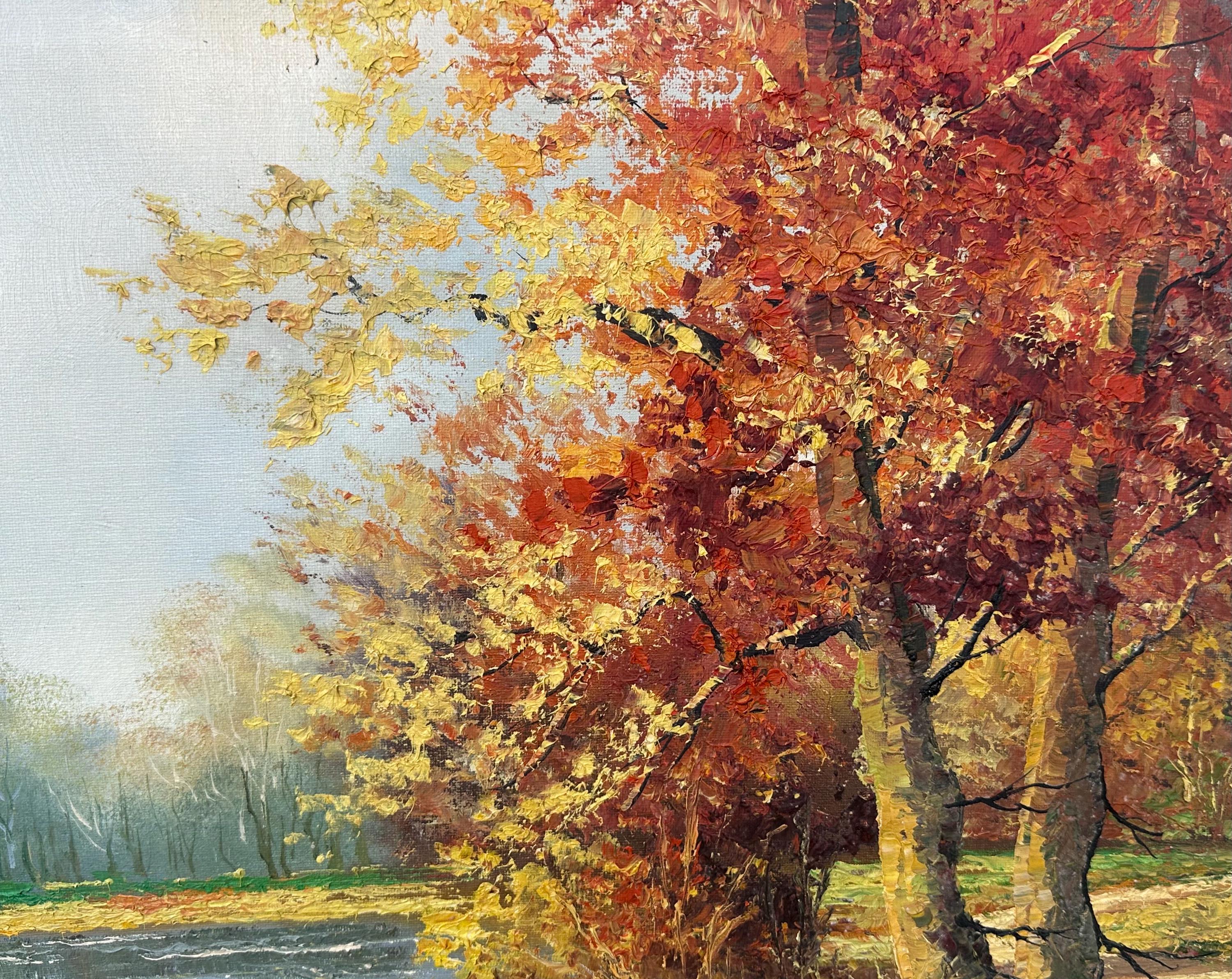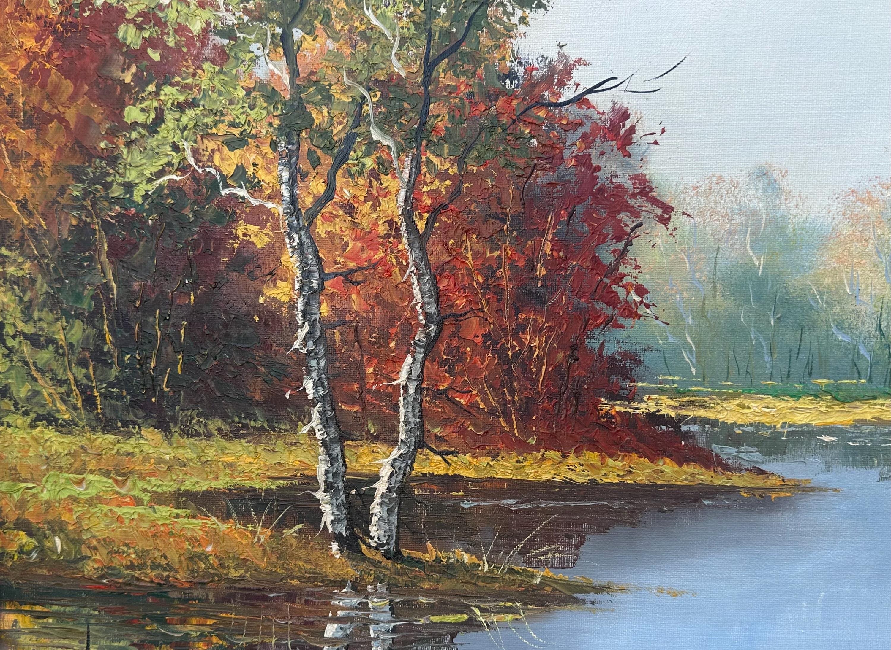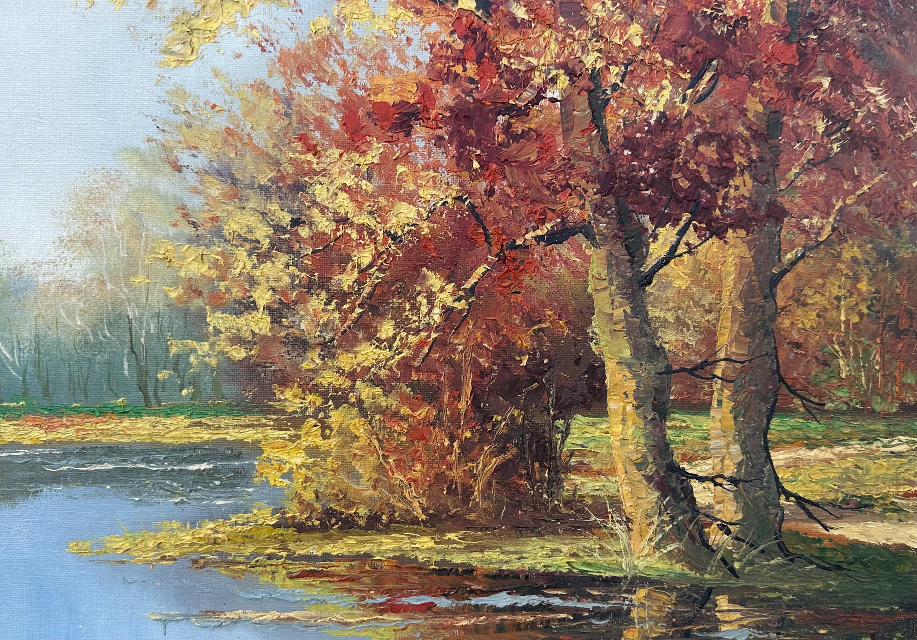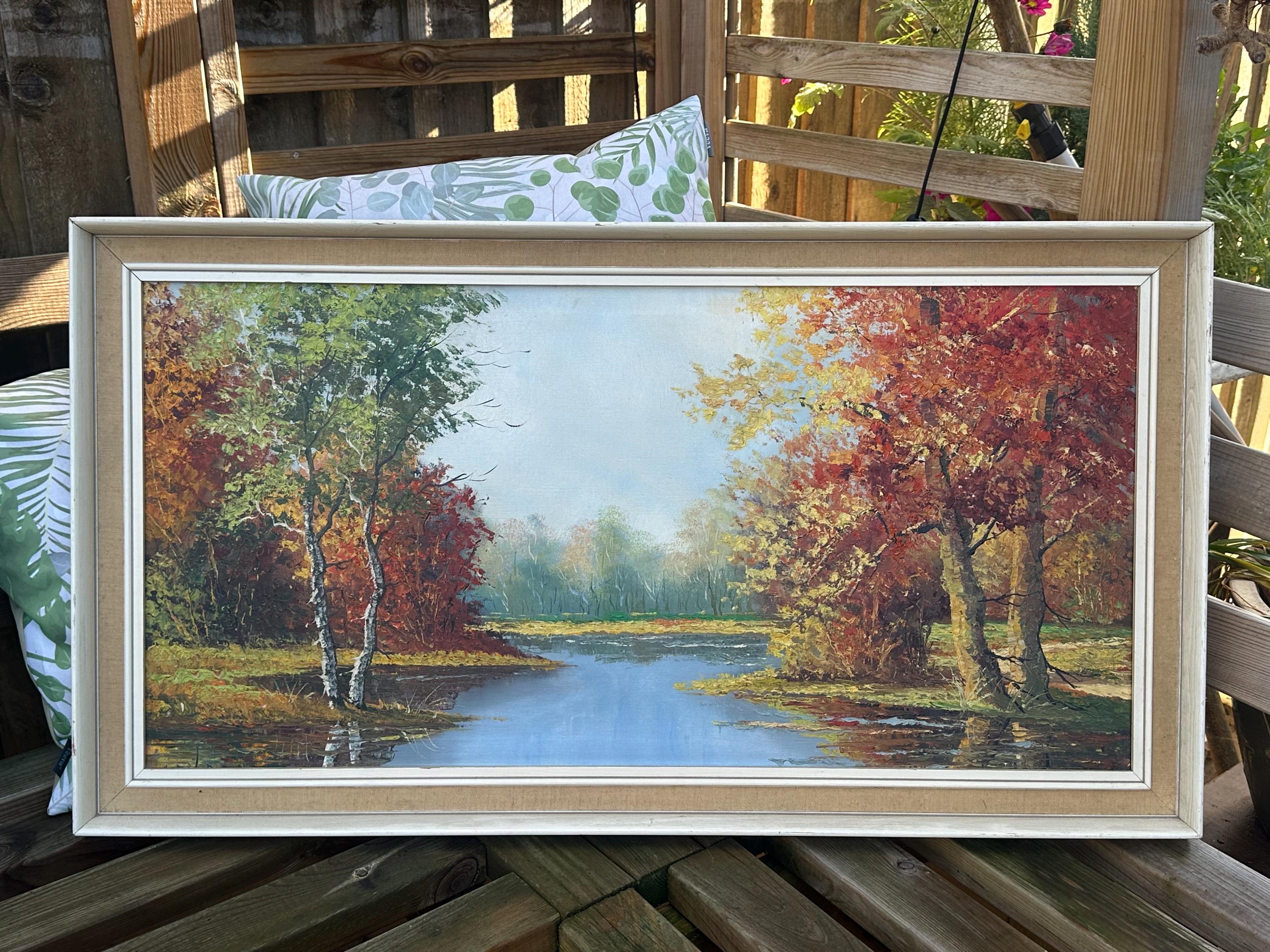 Painted with confident brushwork and vibrant texture, the work features deep crimson and golden trees reflected in still water, with soft light drawing the eye into the peaceful distance. A classic and highly decorative piece, ideal for traditional or country-style interiors.