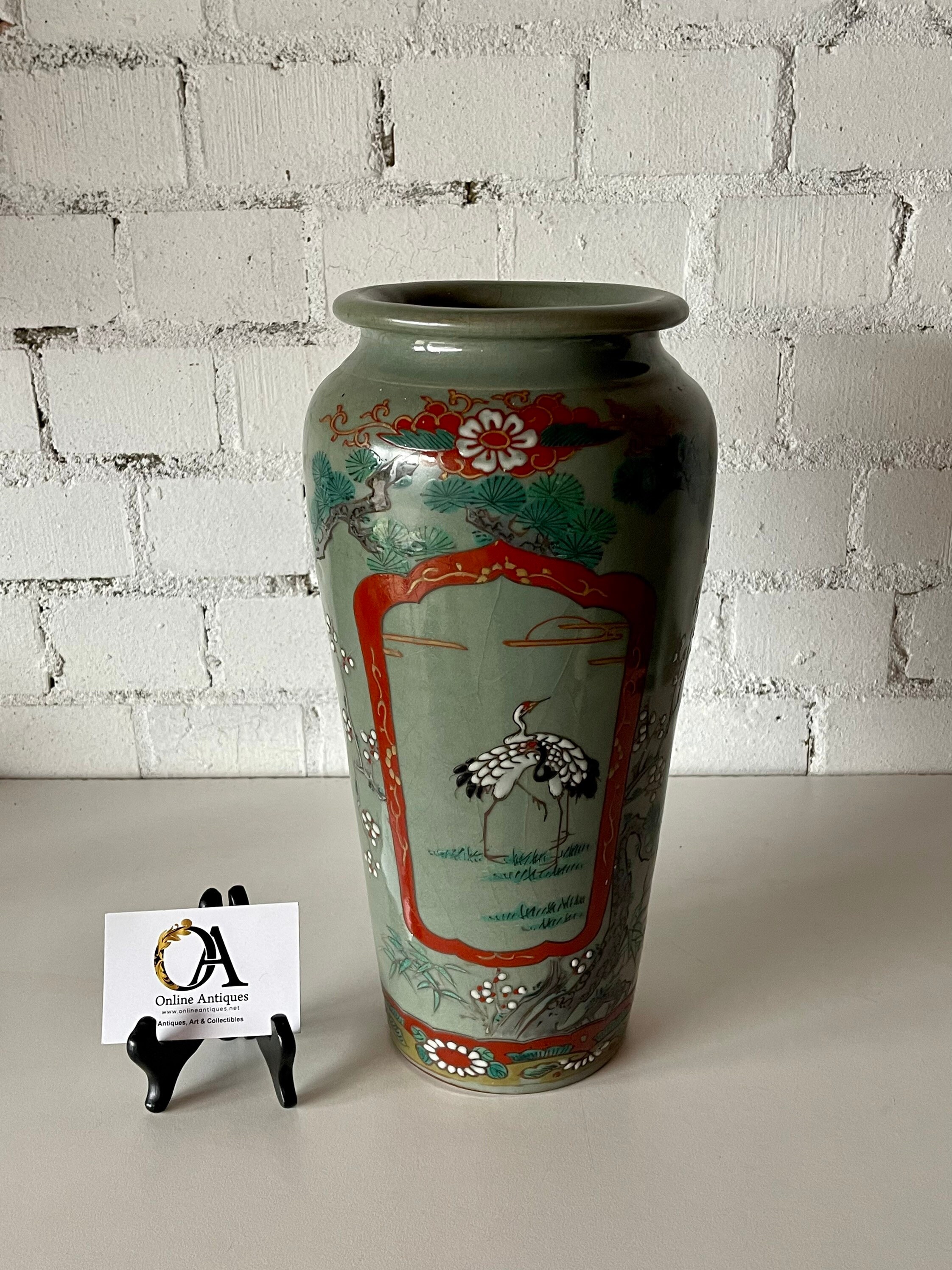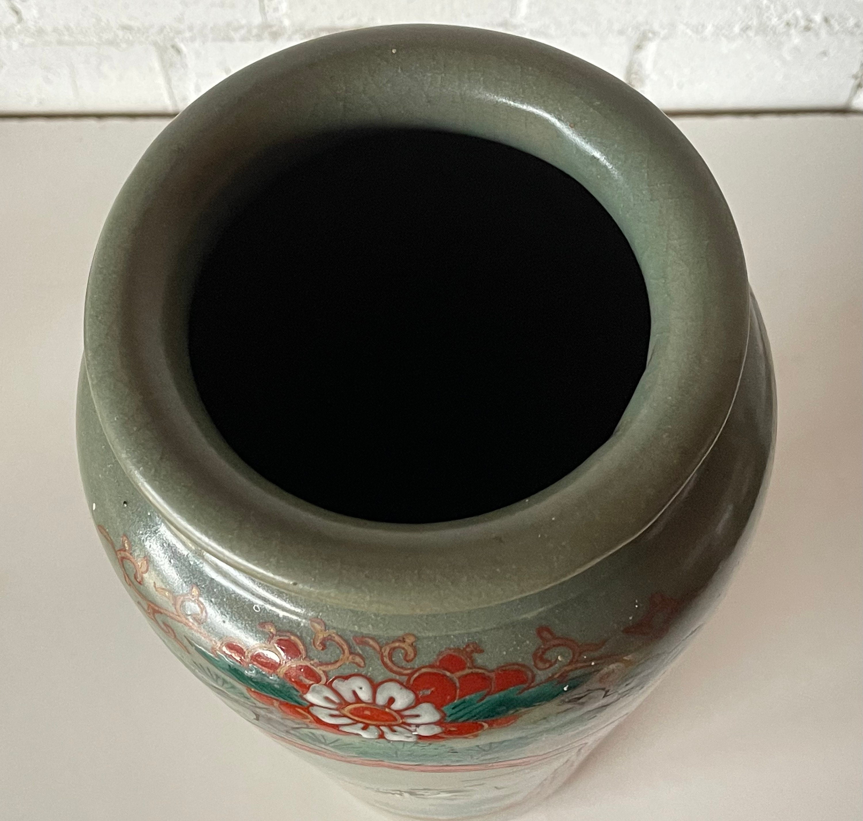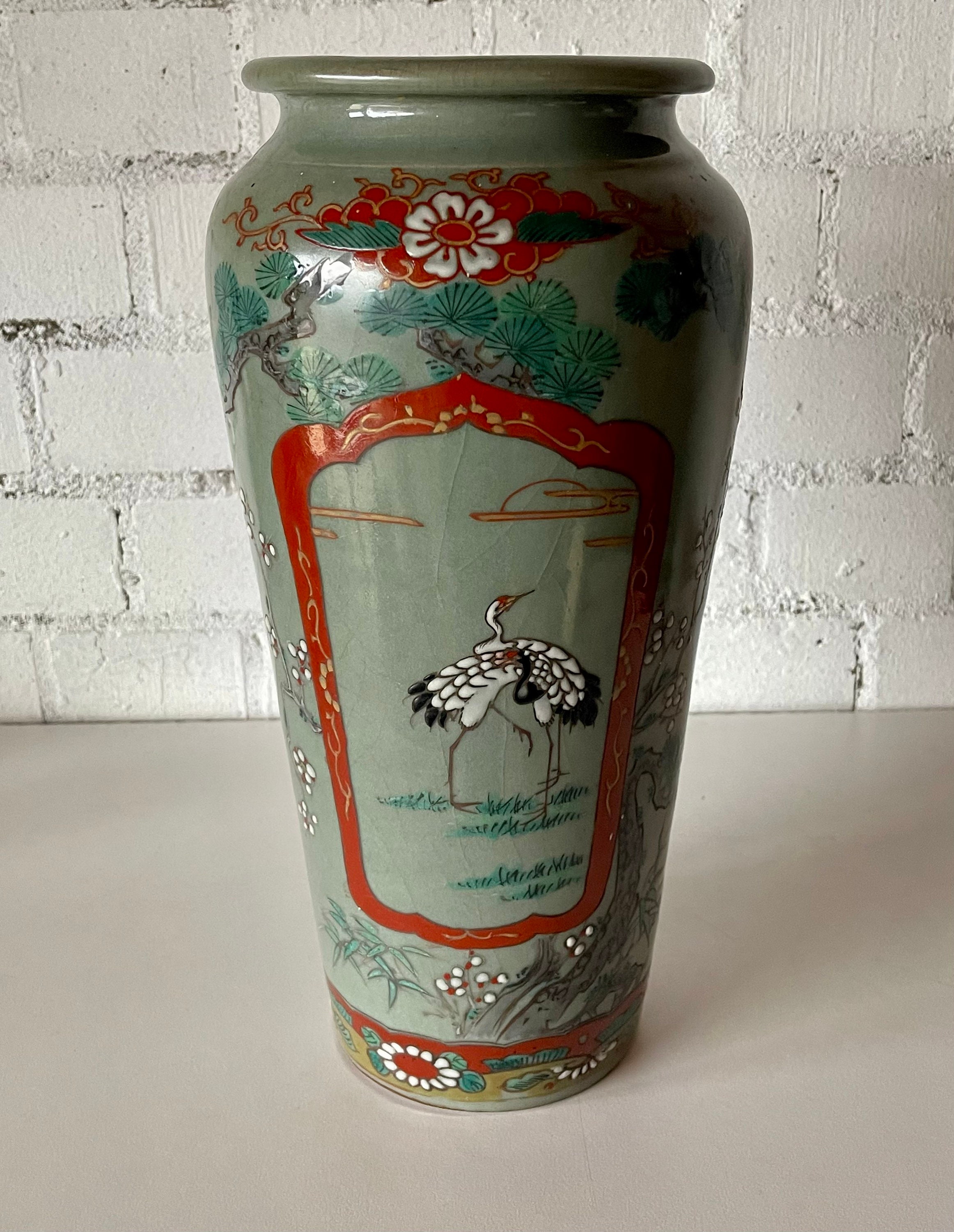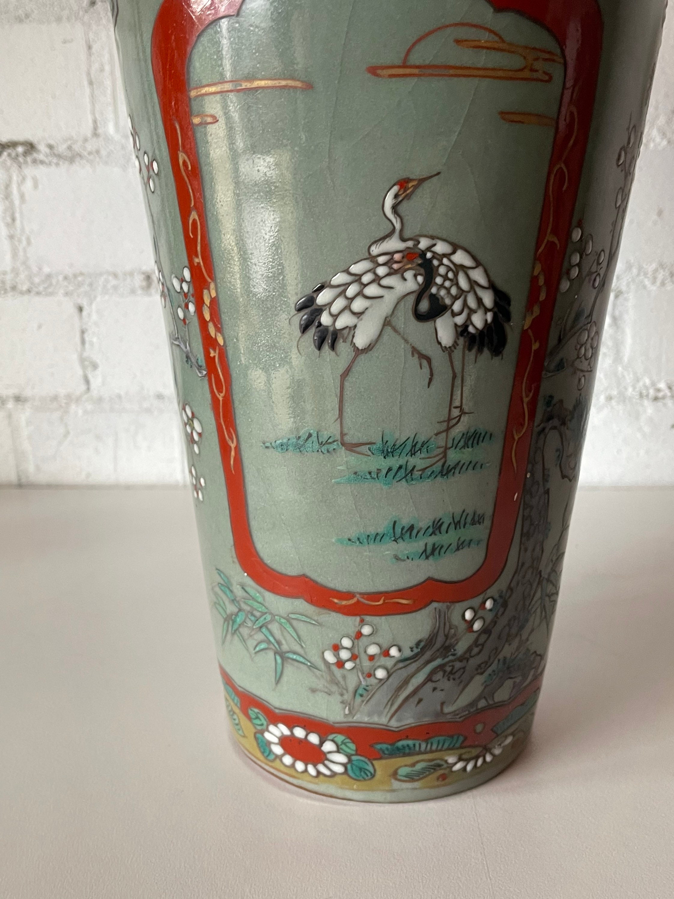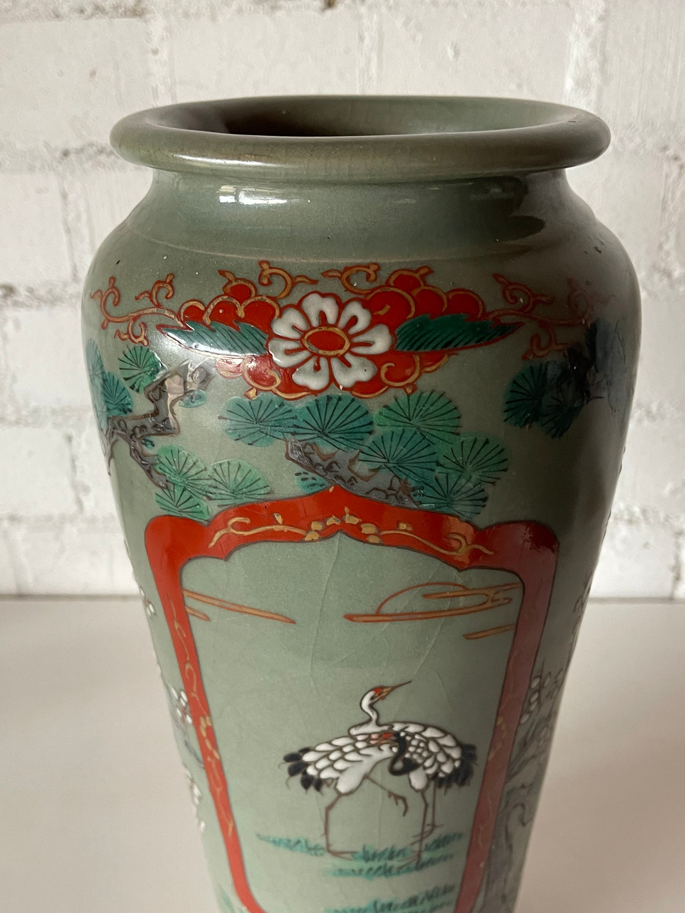 Beautiful Vintage Oriental Celadon Vase Hand Painted with Flowers & Cranes.