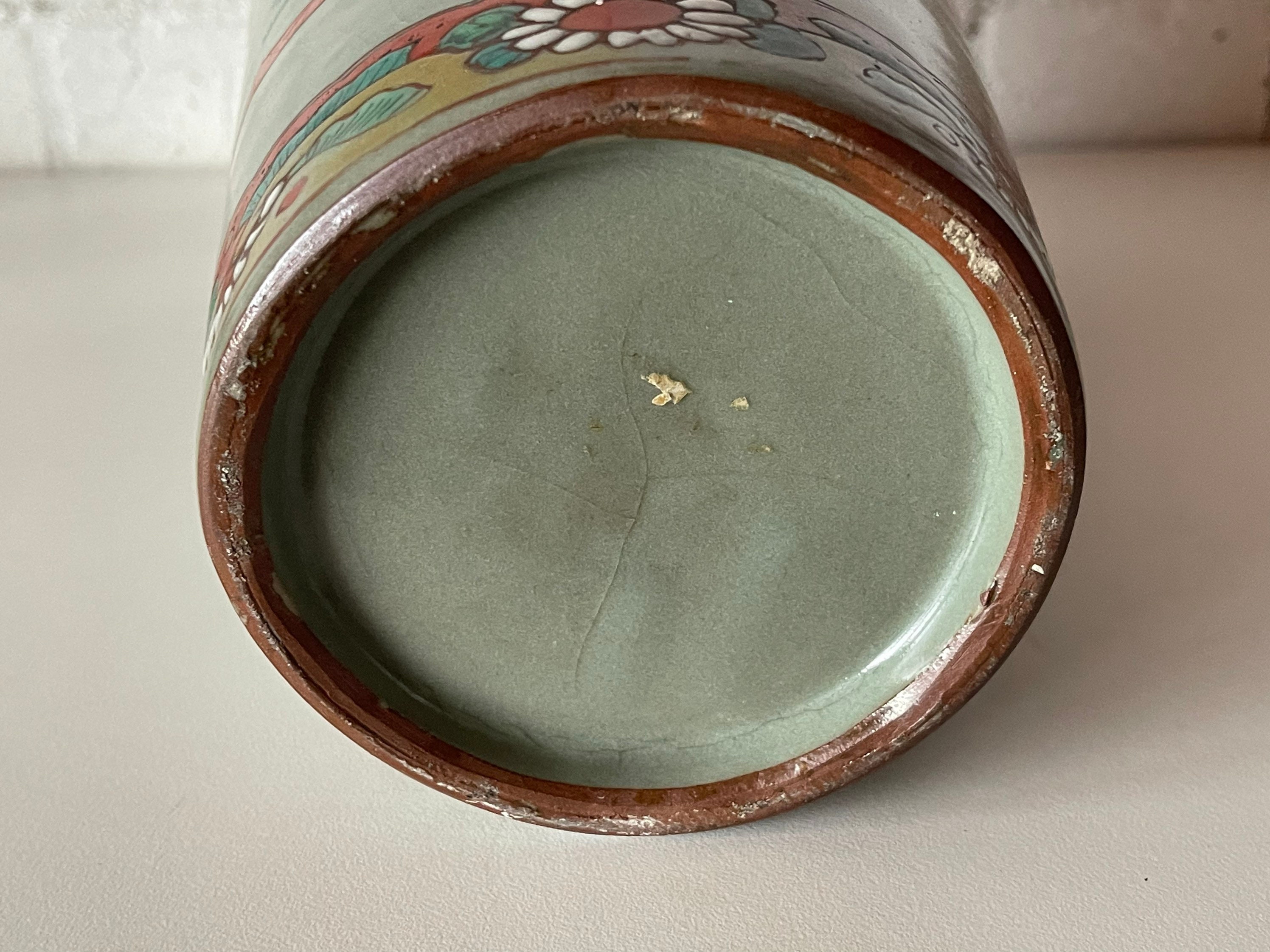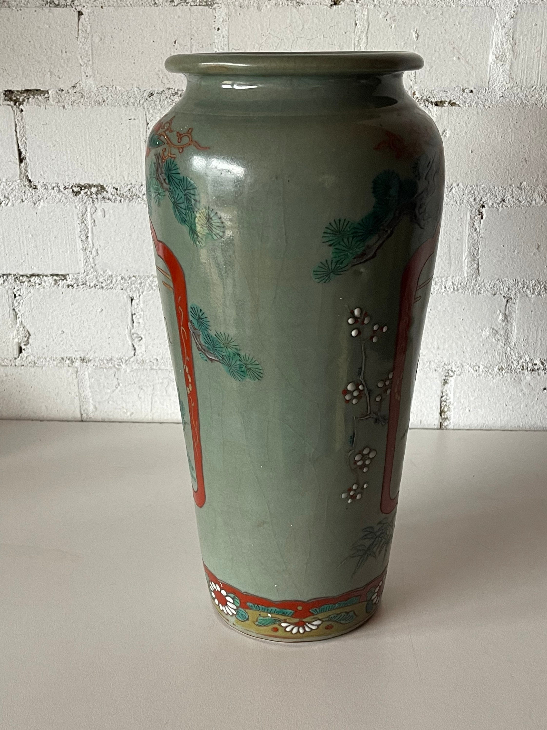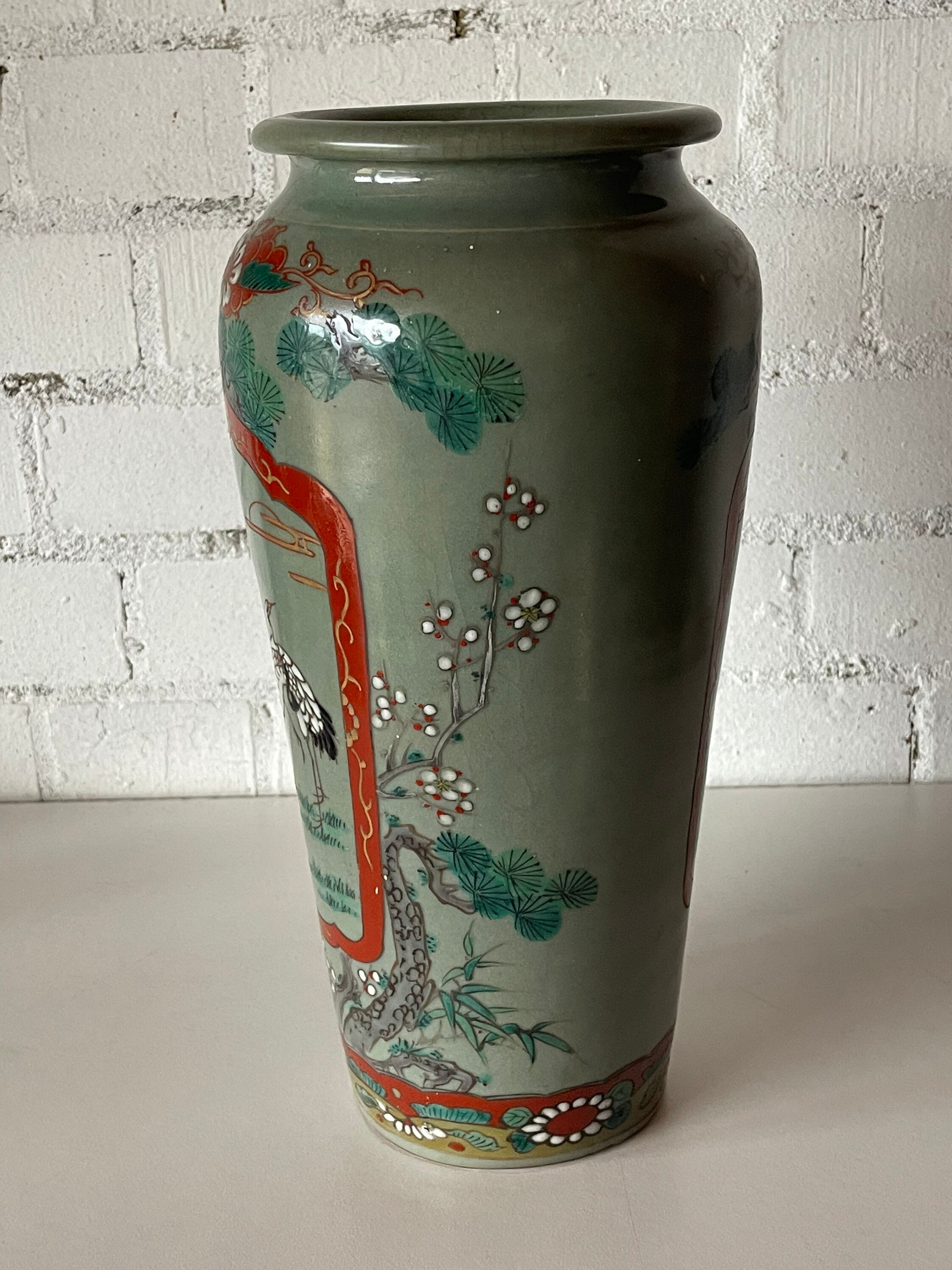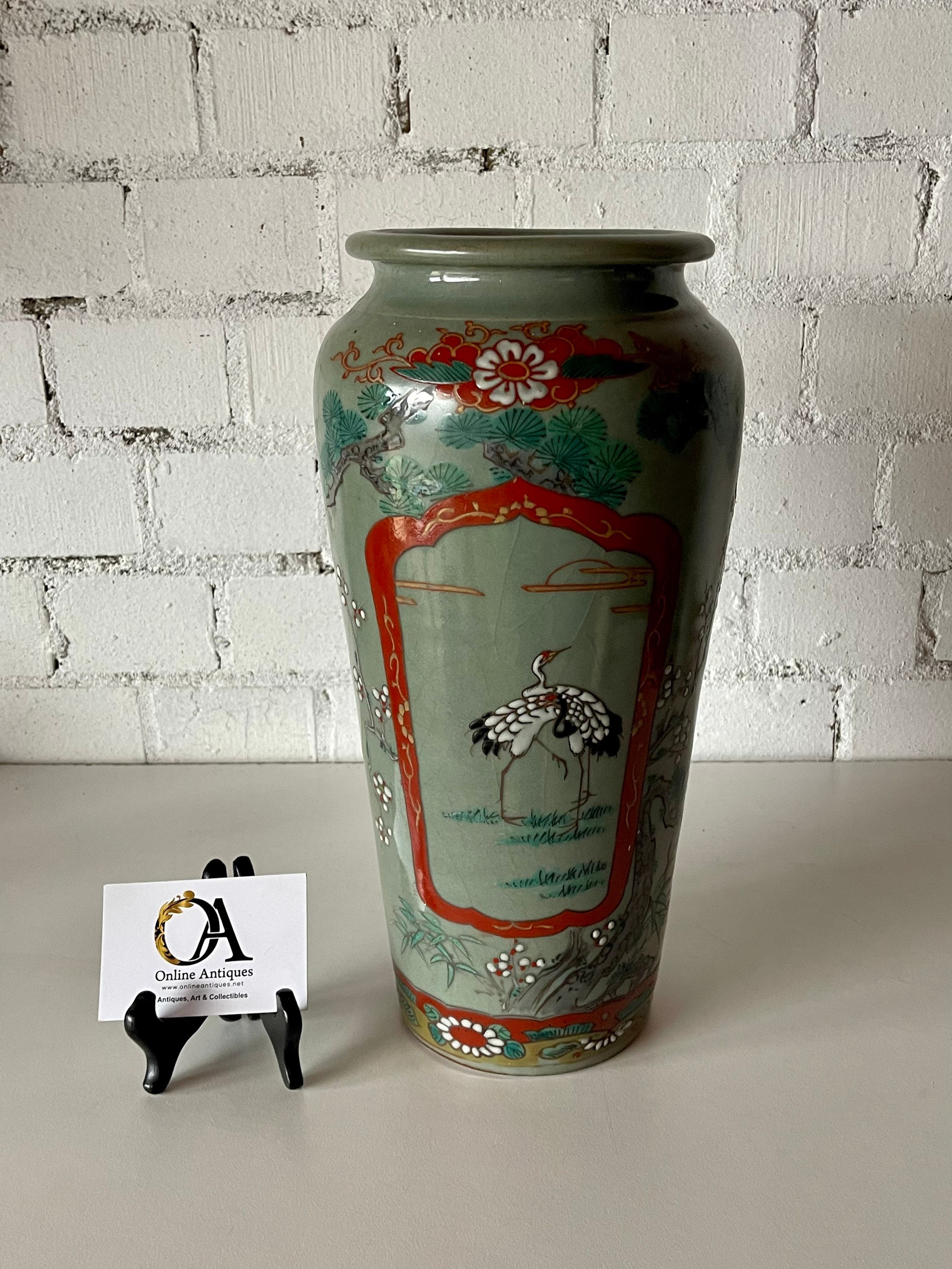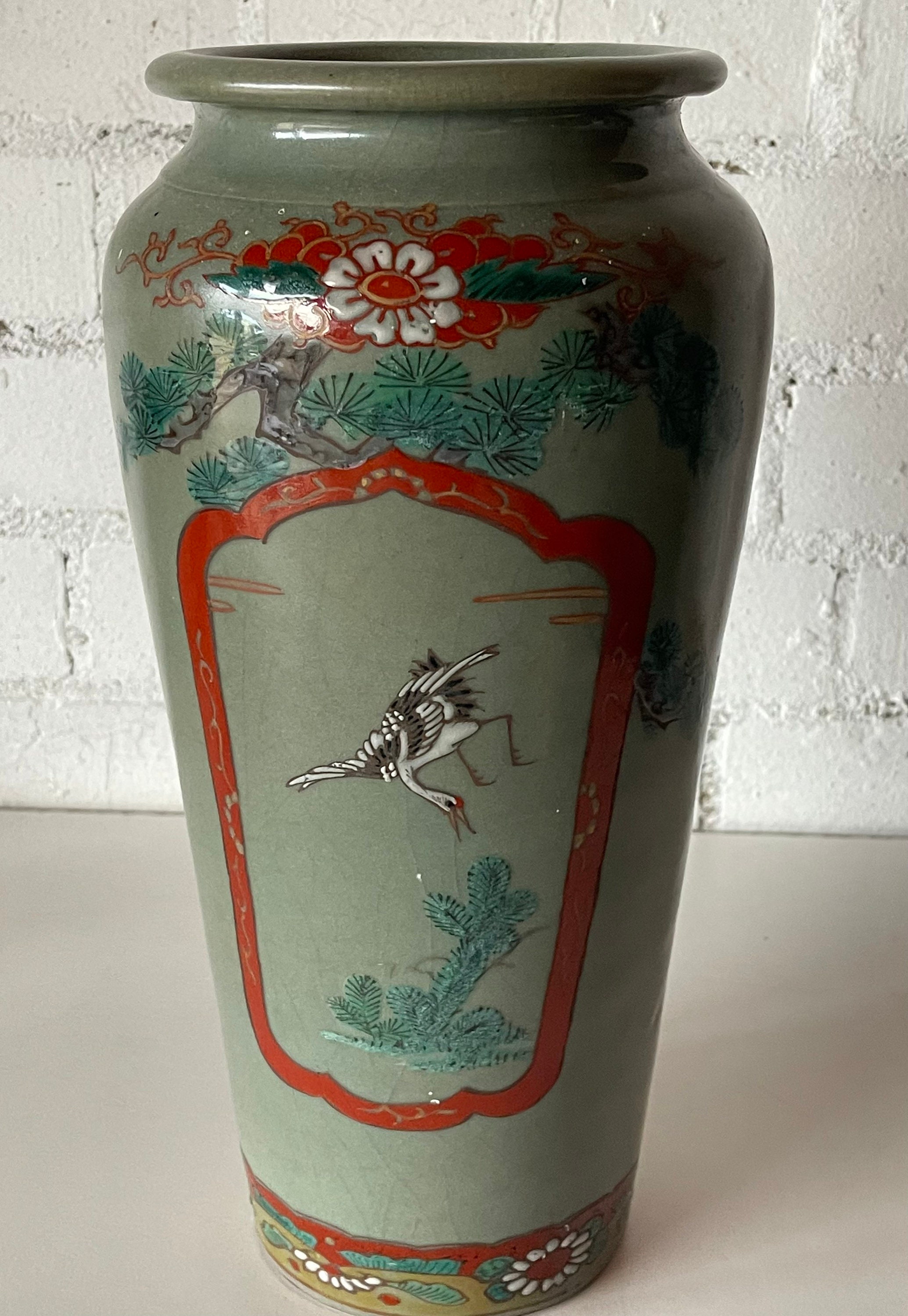 Beautiful Vintage Oriental Celadon Vase Hand Painted with Flowers & Cranes.