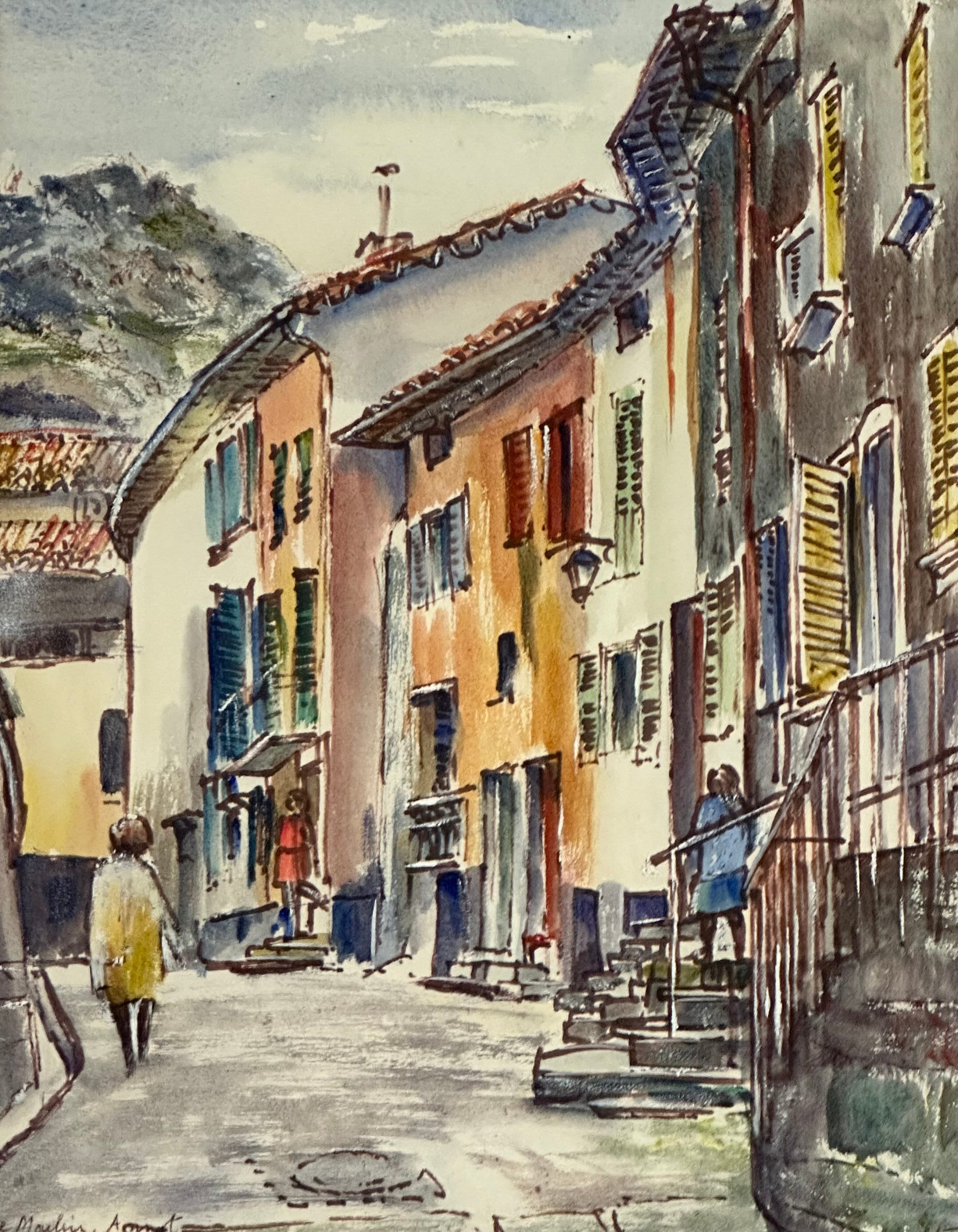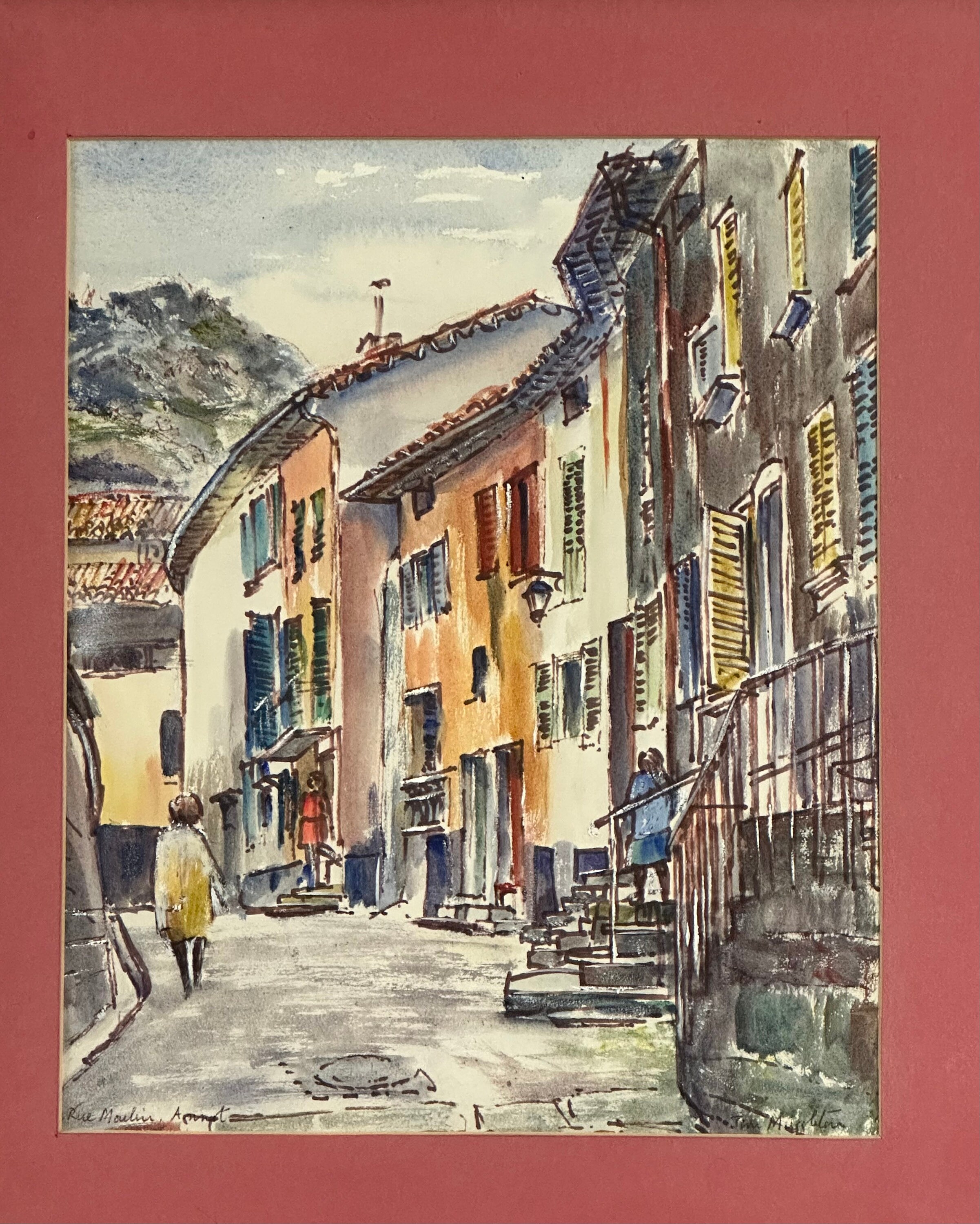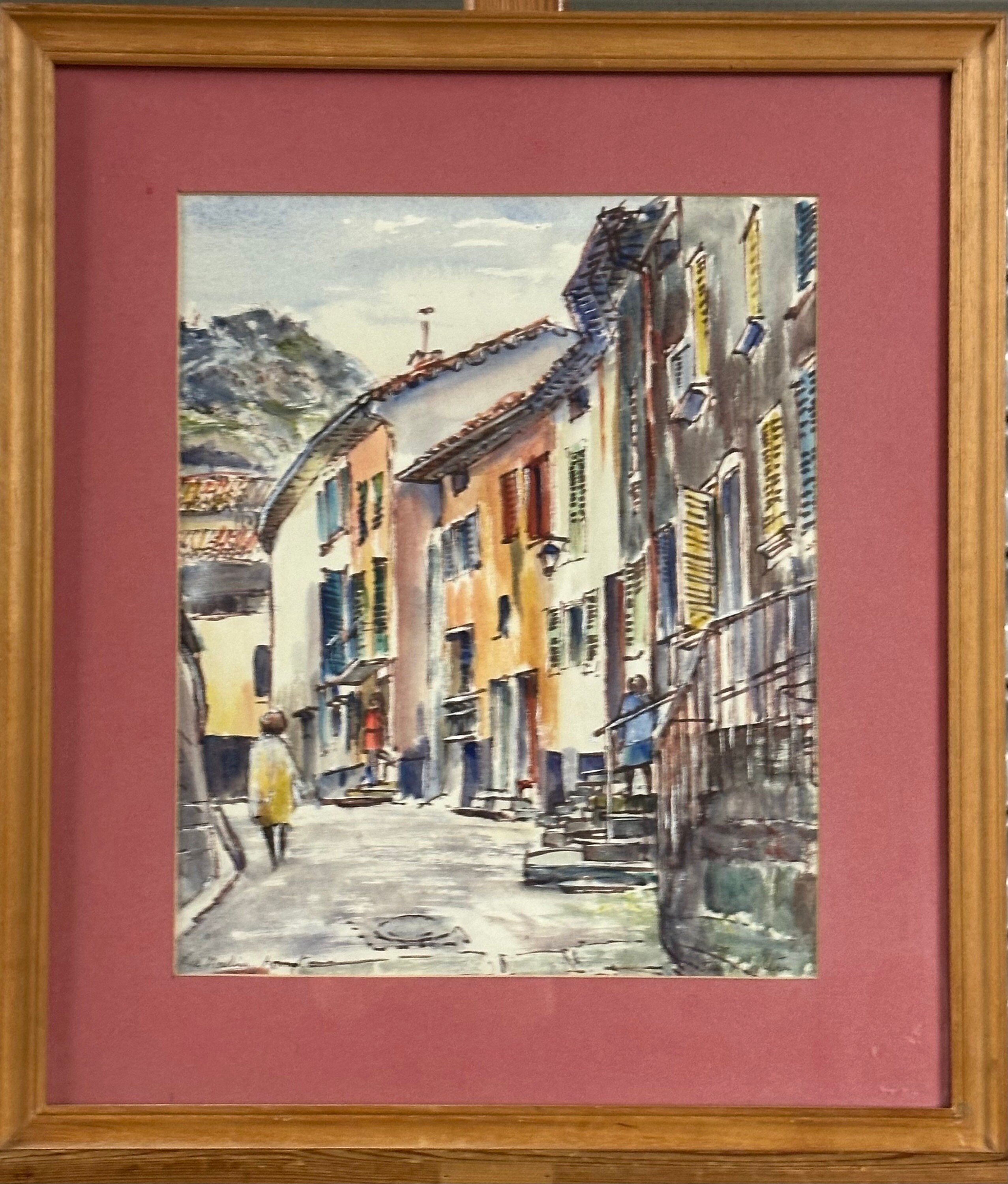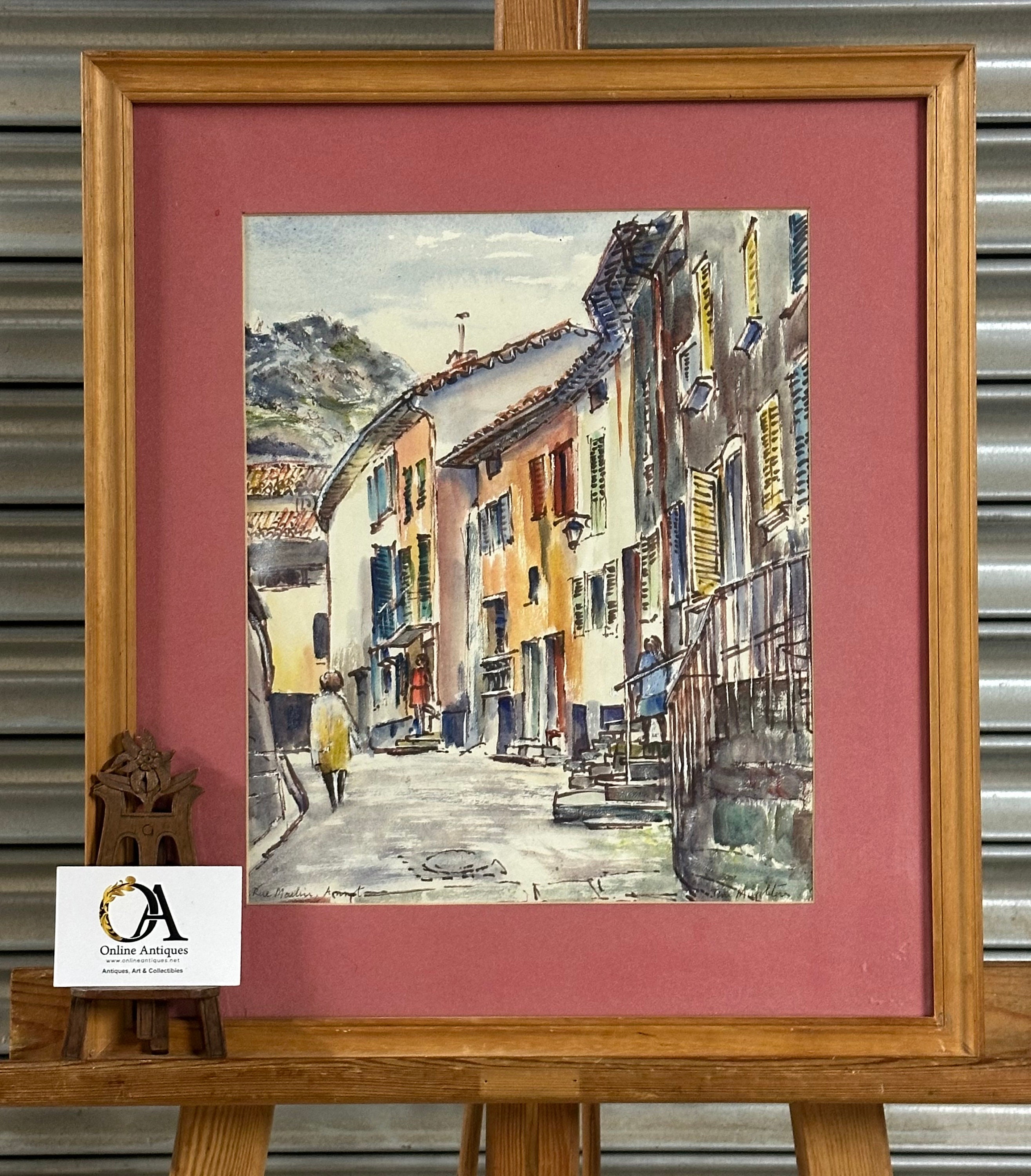 Lovely Circa 1970’s Watercolour Of Rue Moulin, Annot, Provence, France By Jim Muggleton