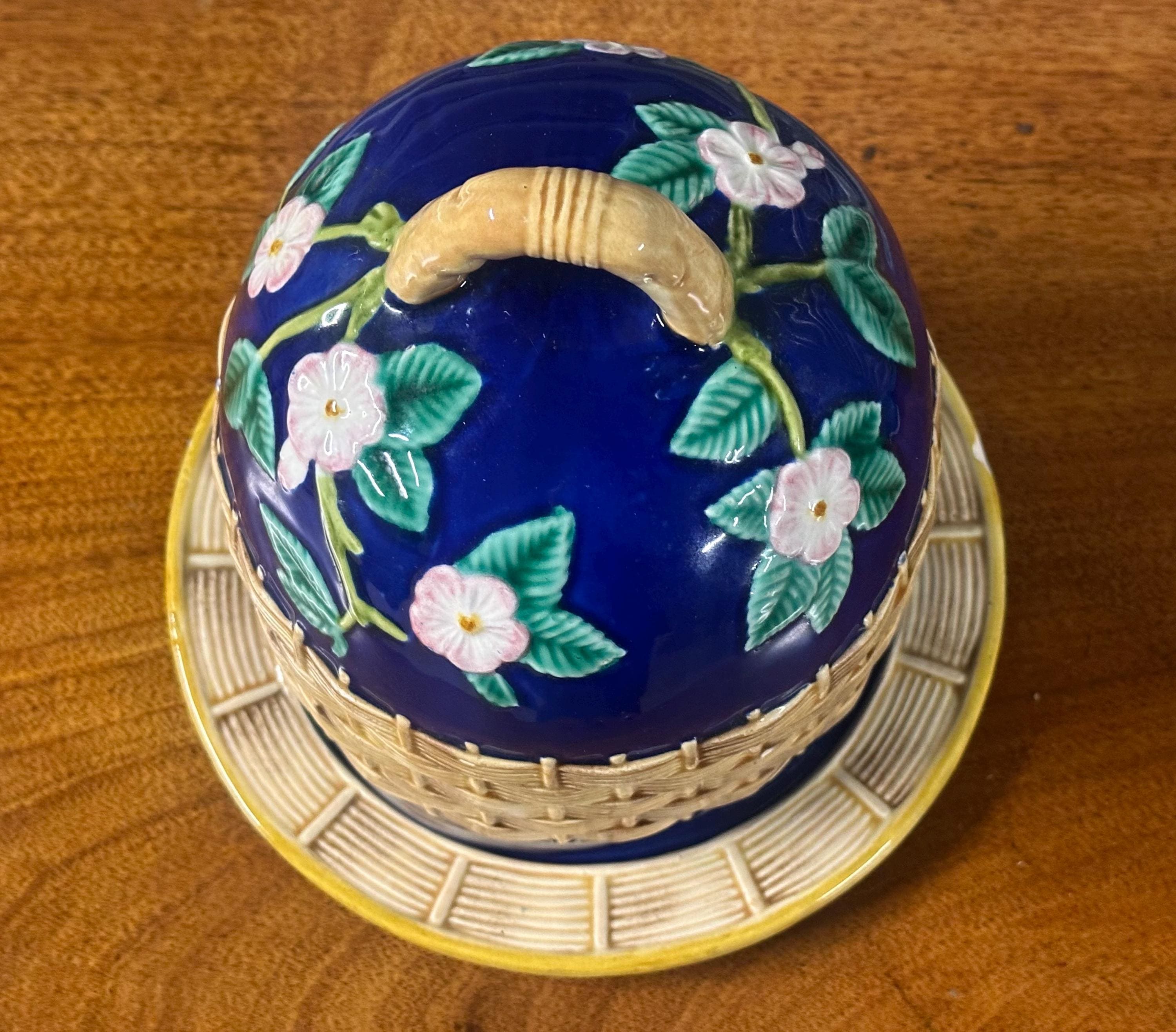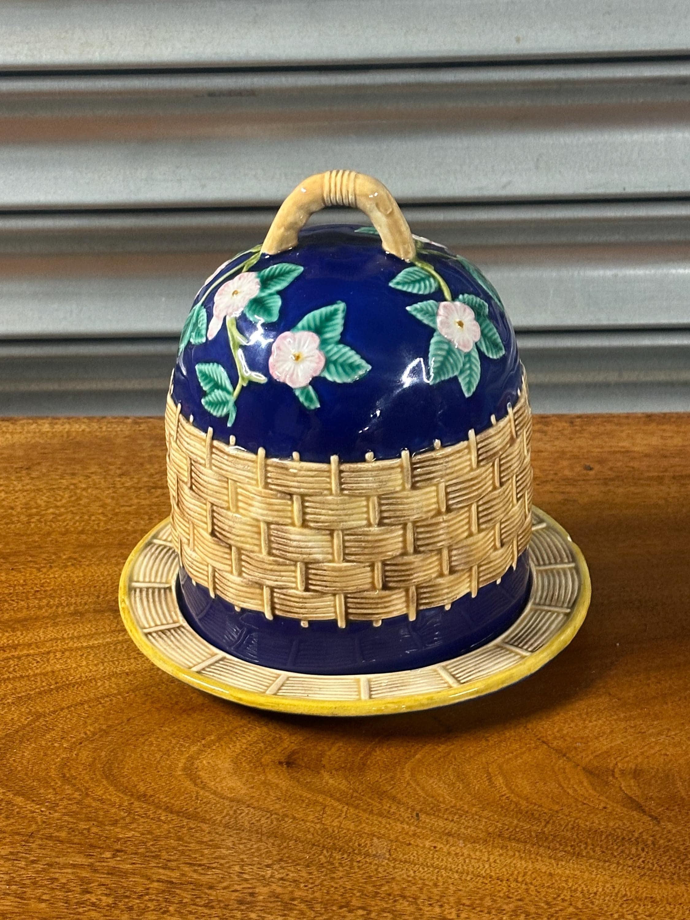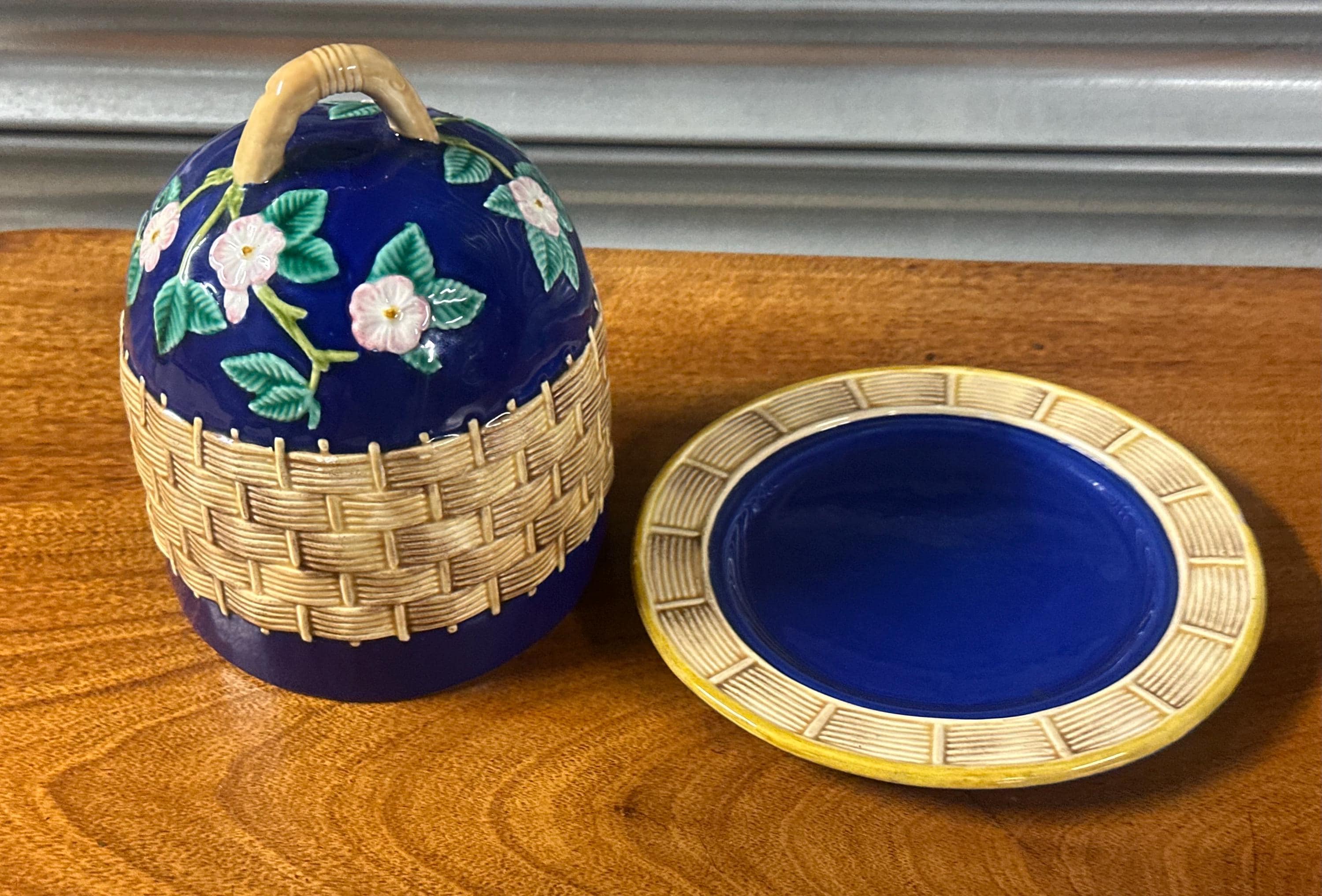 A charming and highly decorative vintage ceramic butter dish or cheese dome, featuring a striking deep cobalt blue glaze with applied basketweave relief and delicate hand-painted floral decoration.
