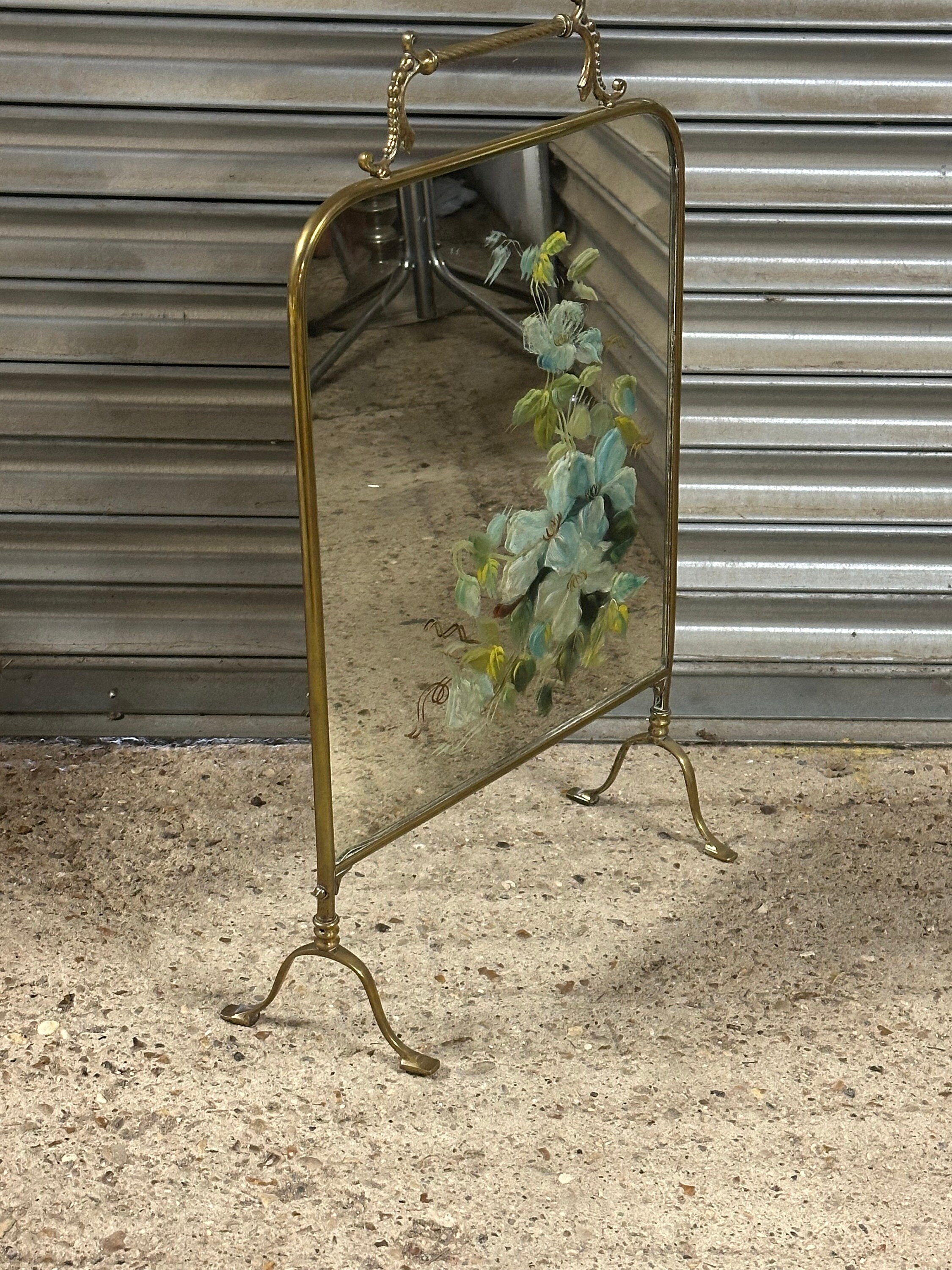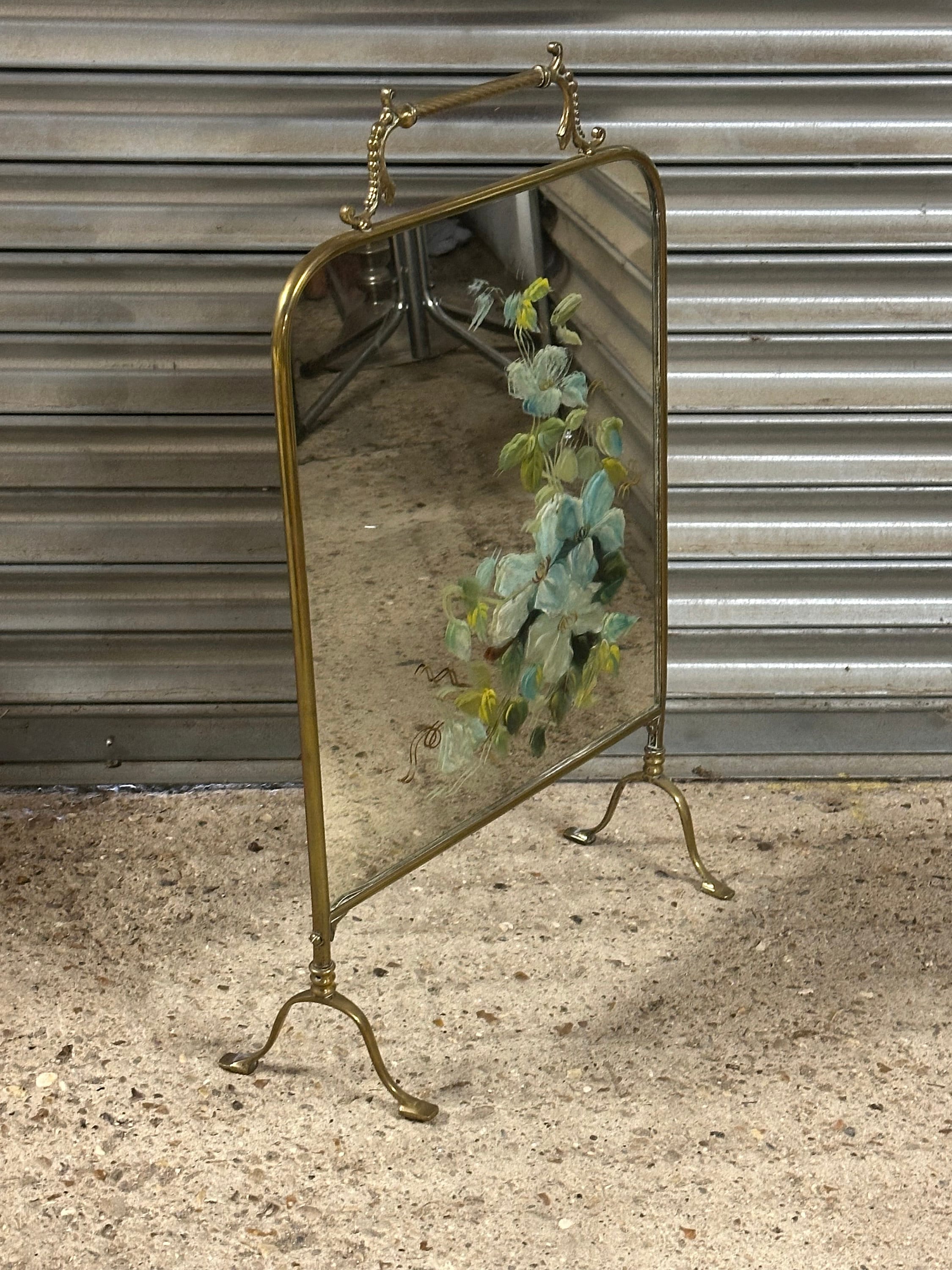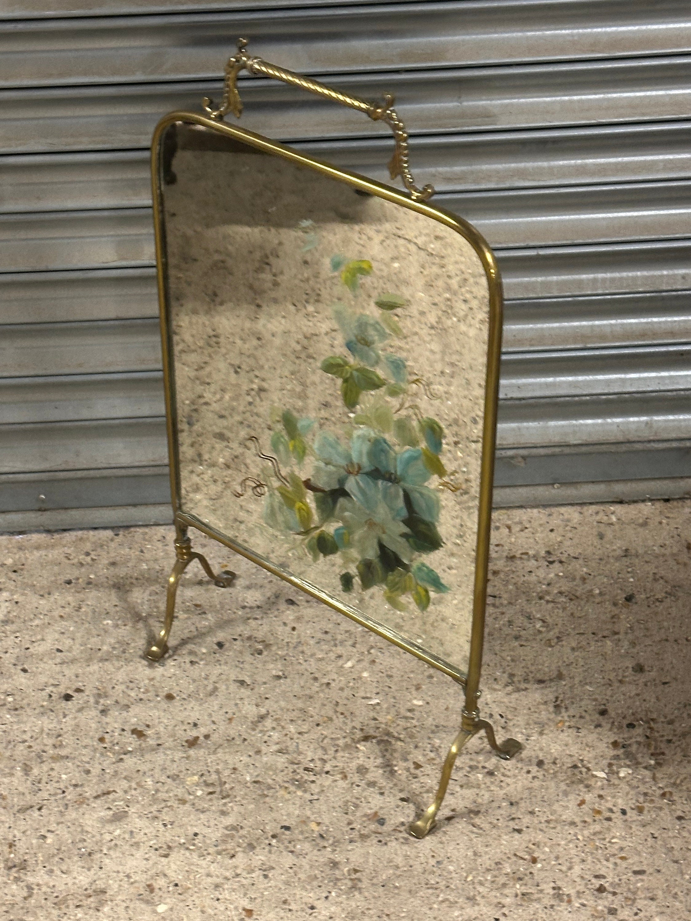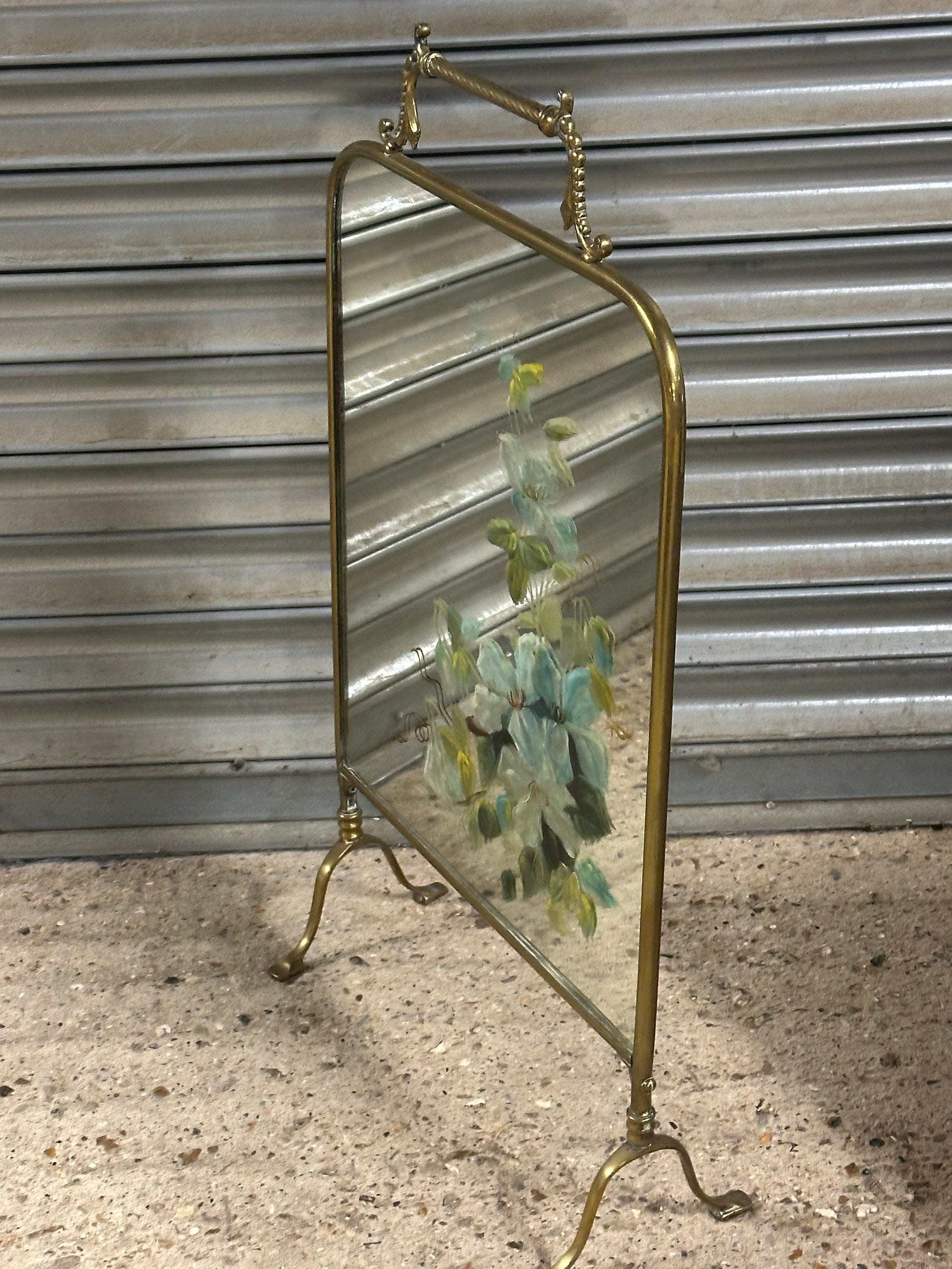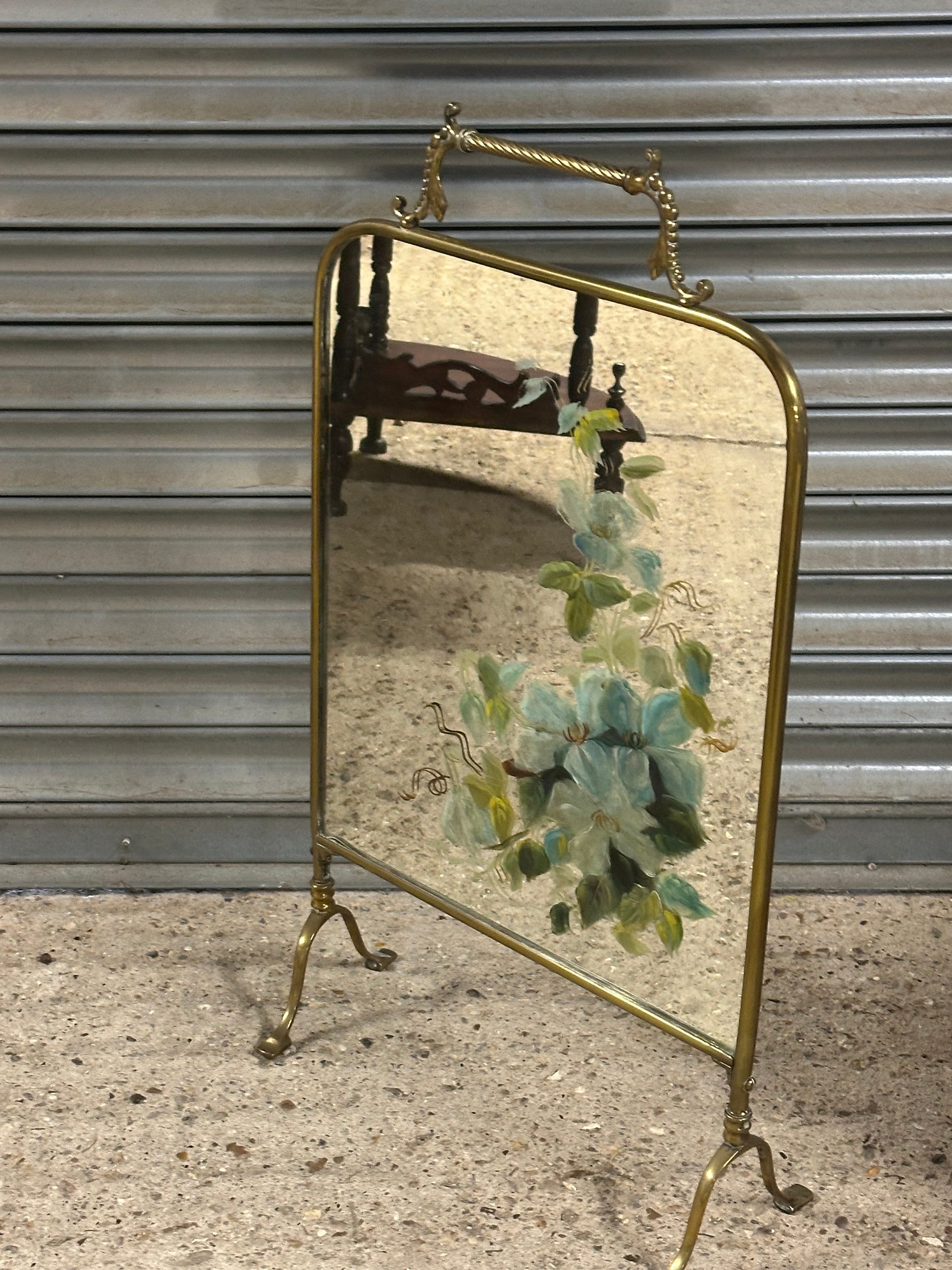 Antique Art Nouveau Brass Mirrored Fire Screen Guard with Hand Painted Flower Decoration to the Mirror