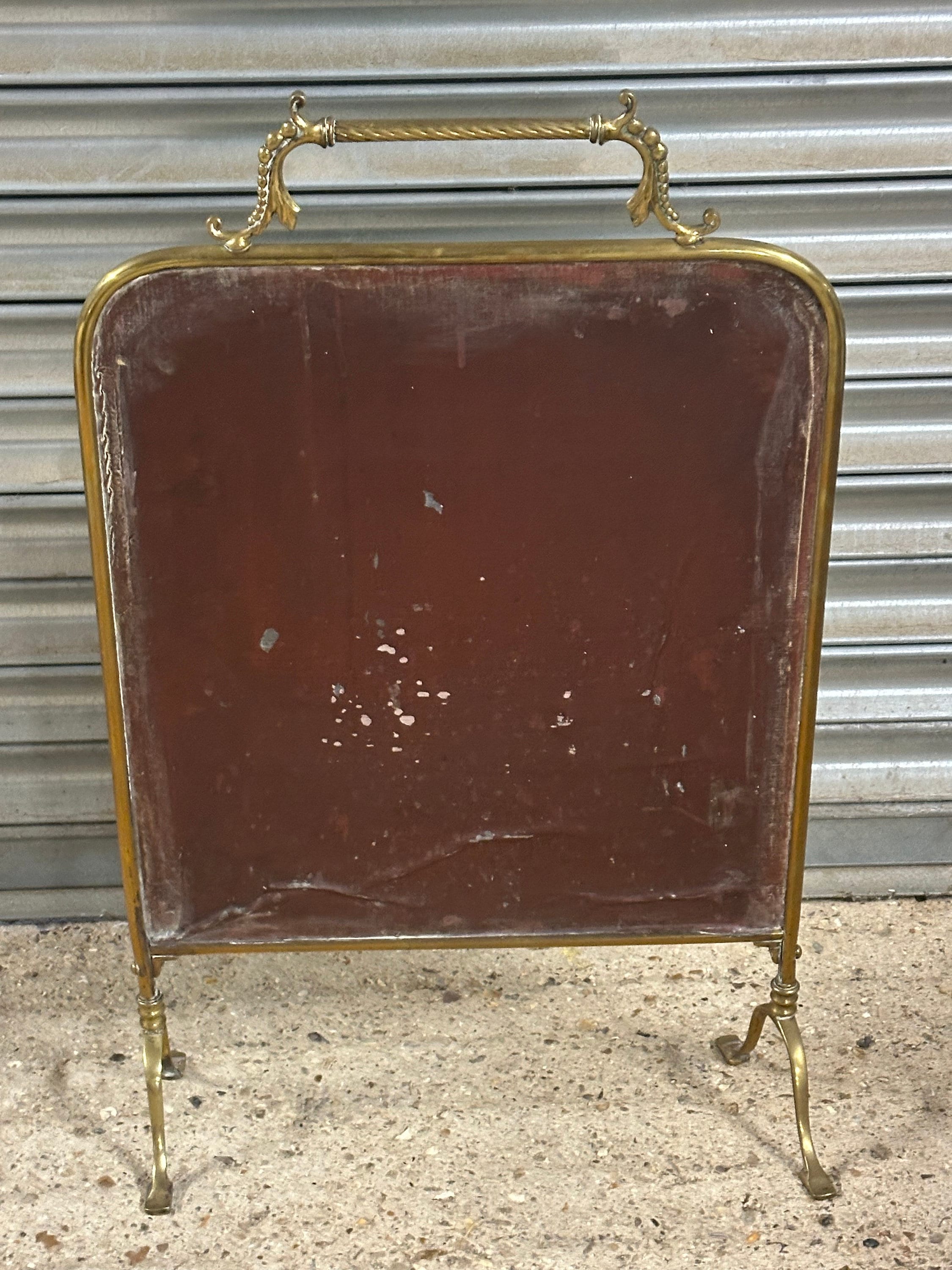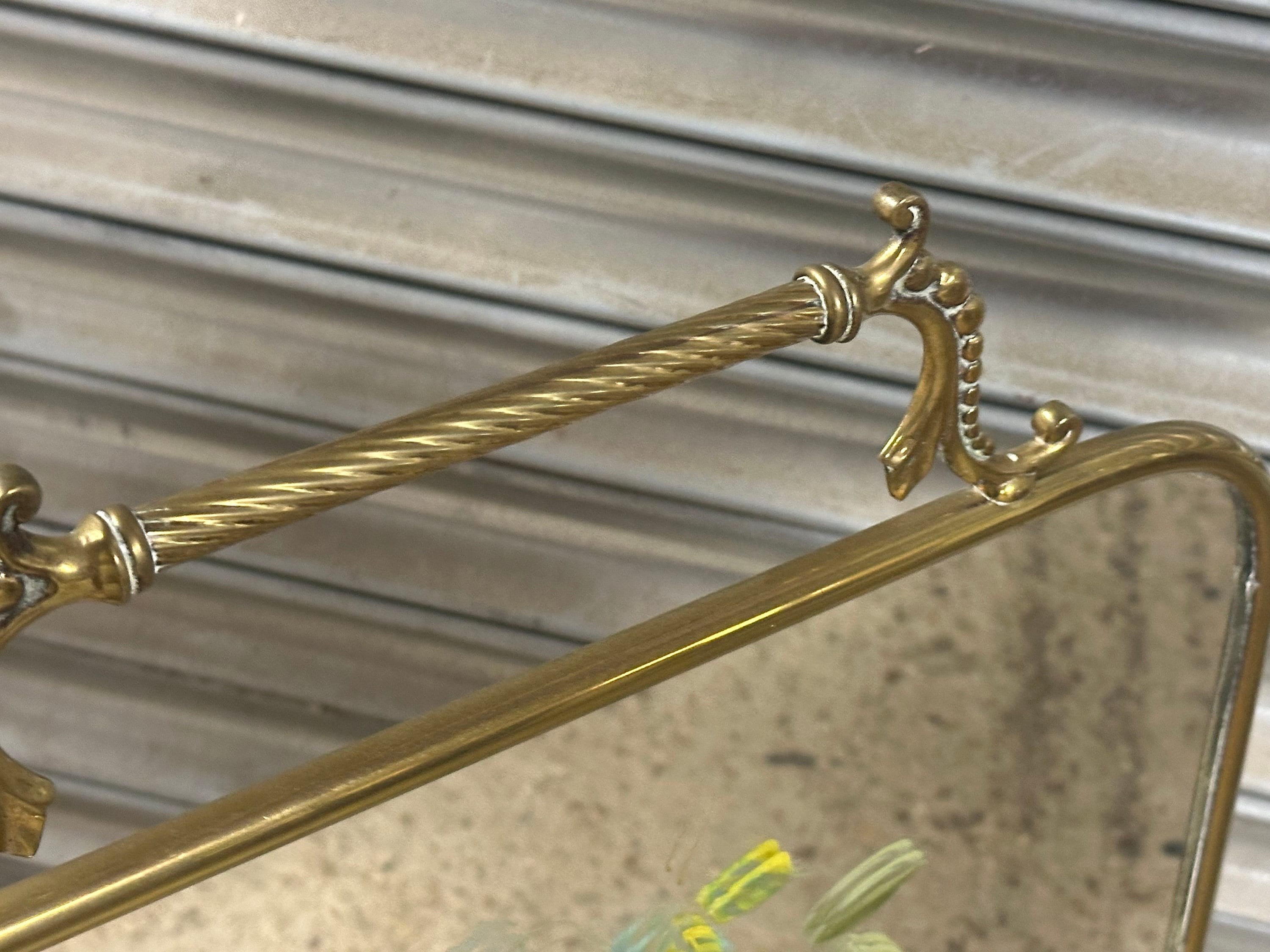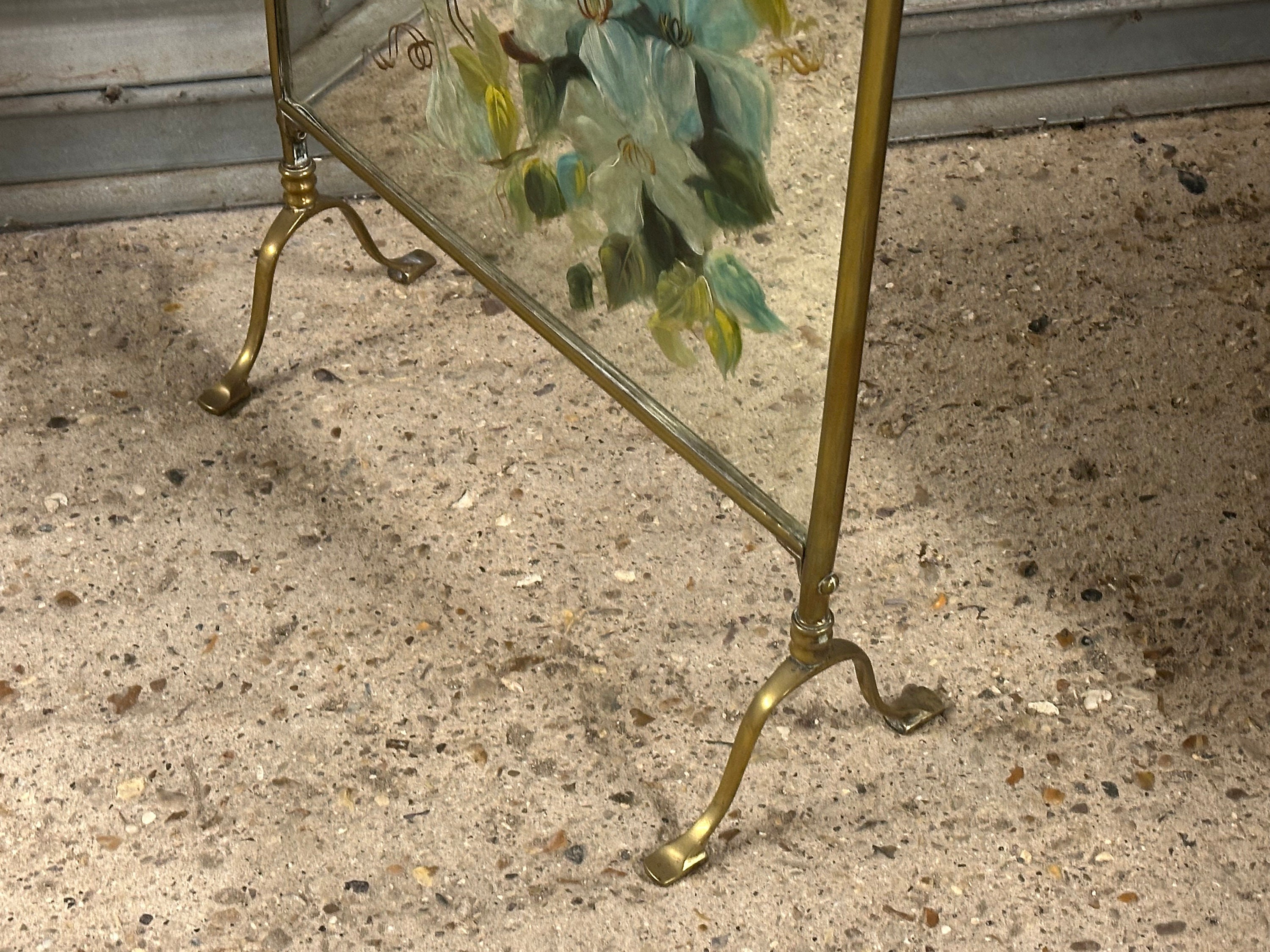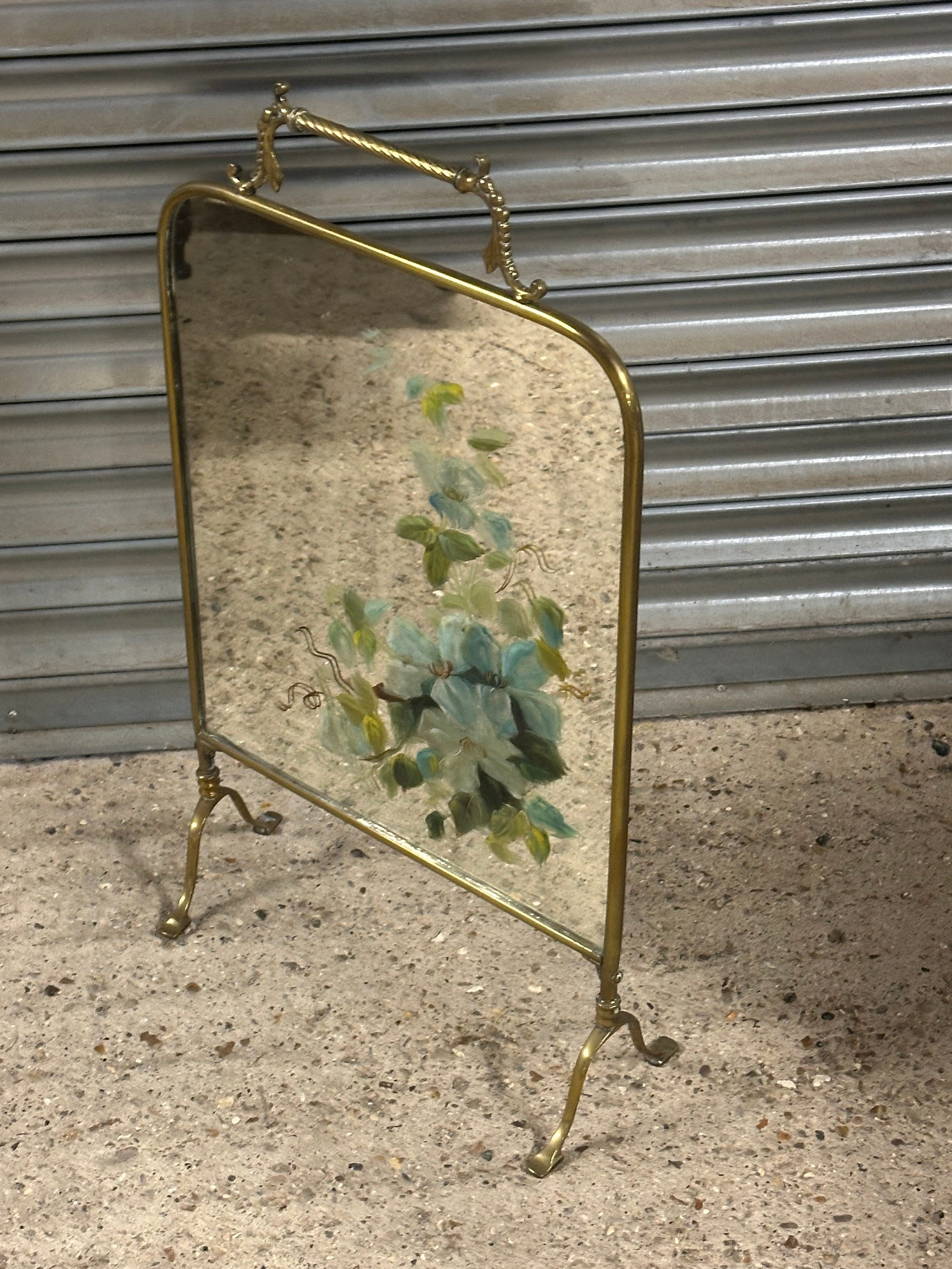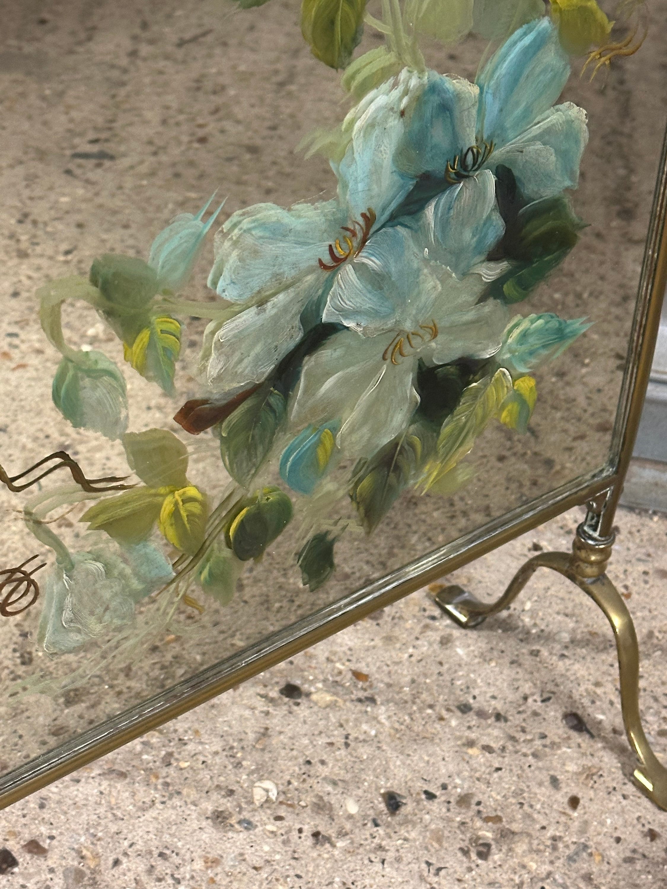 Antique Art Nouveau Brass Mirrored Fire Screen Guard with Hand Painted Flower Decoration to the Mirror