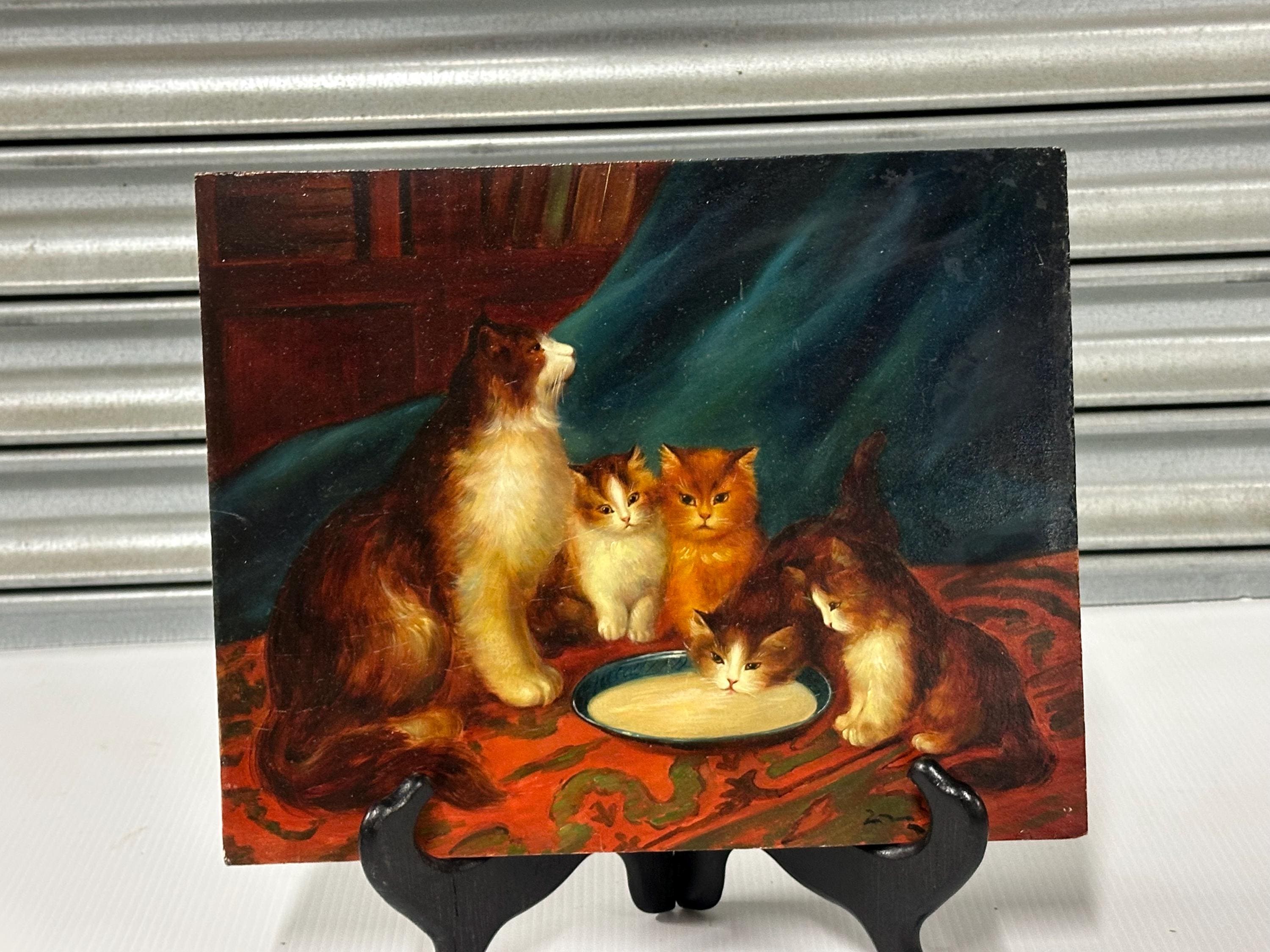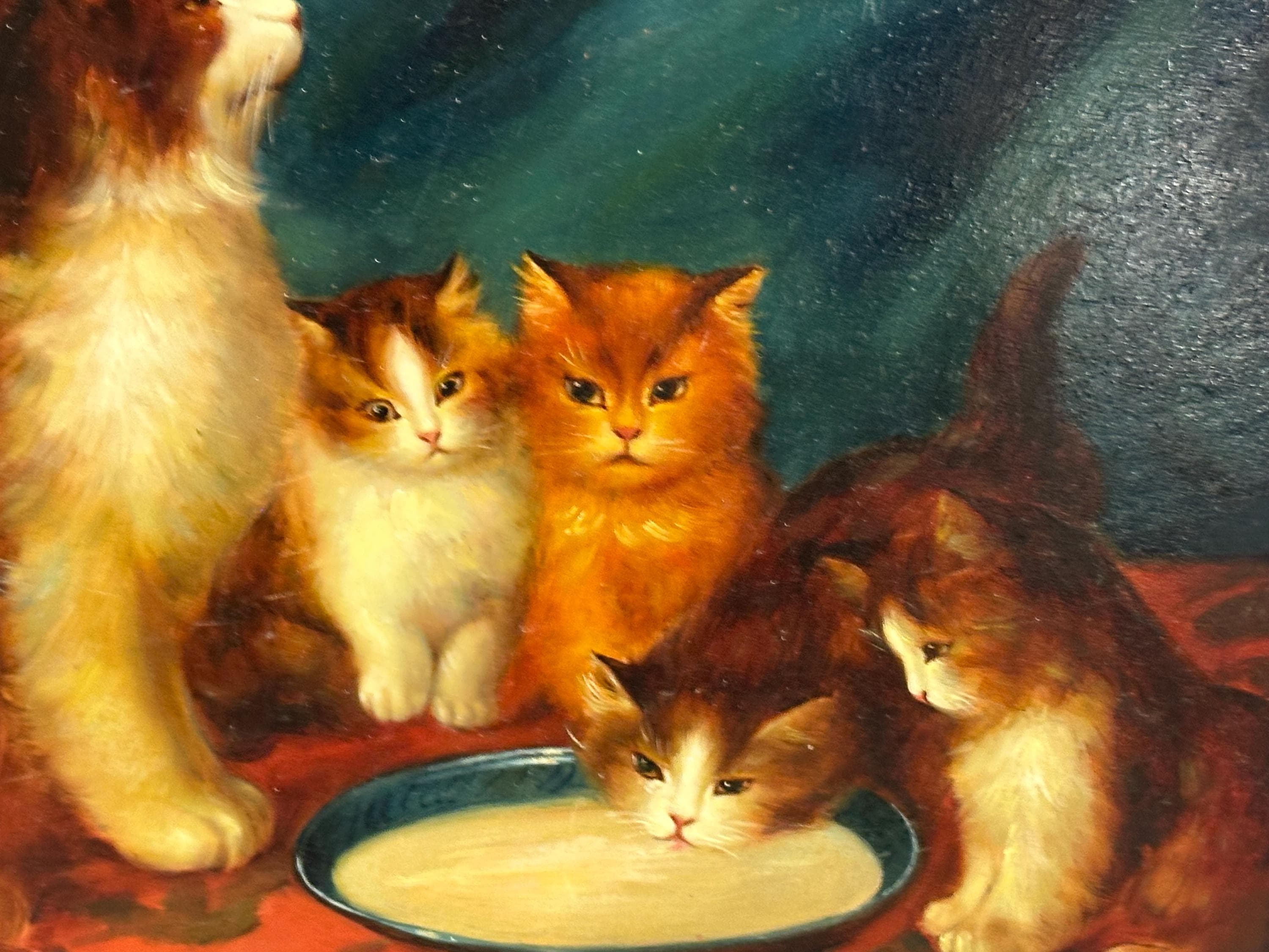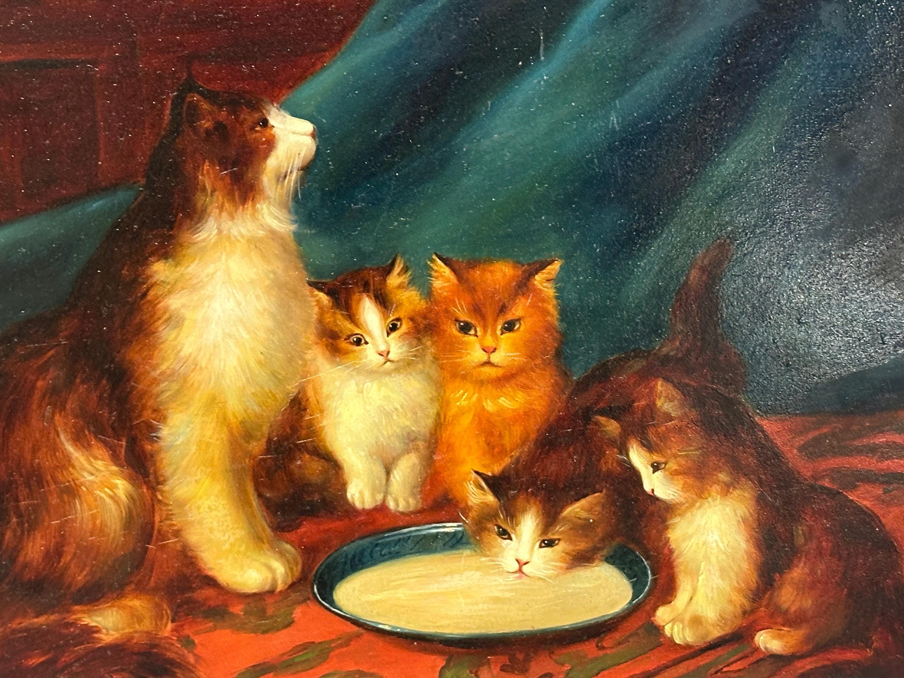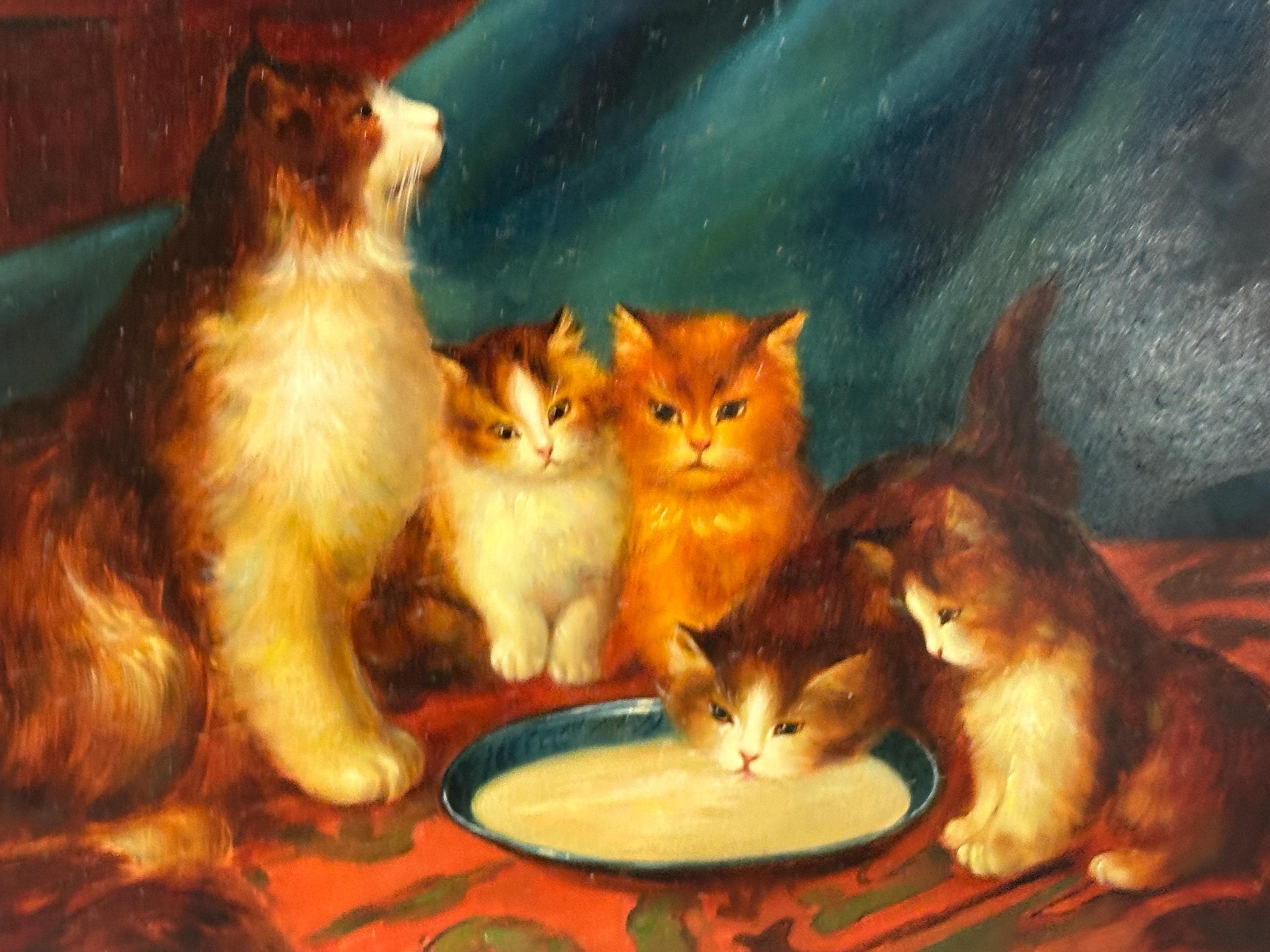Depicts a mother cat with her three kittens eagerly gathered around a shallow dish of milk. A classic Victorian-style subject with a warm, cosy feel.