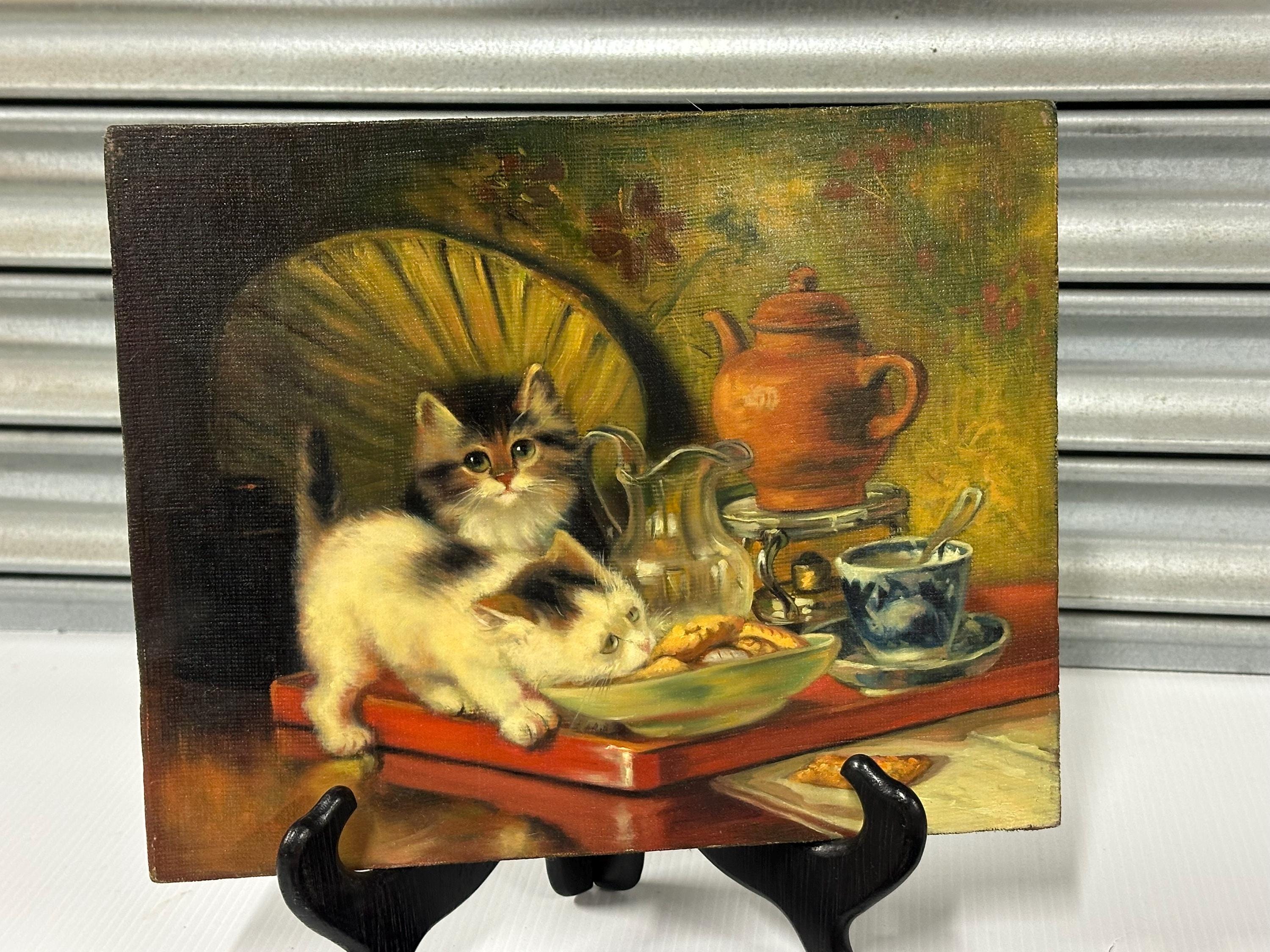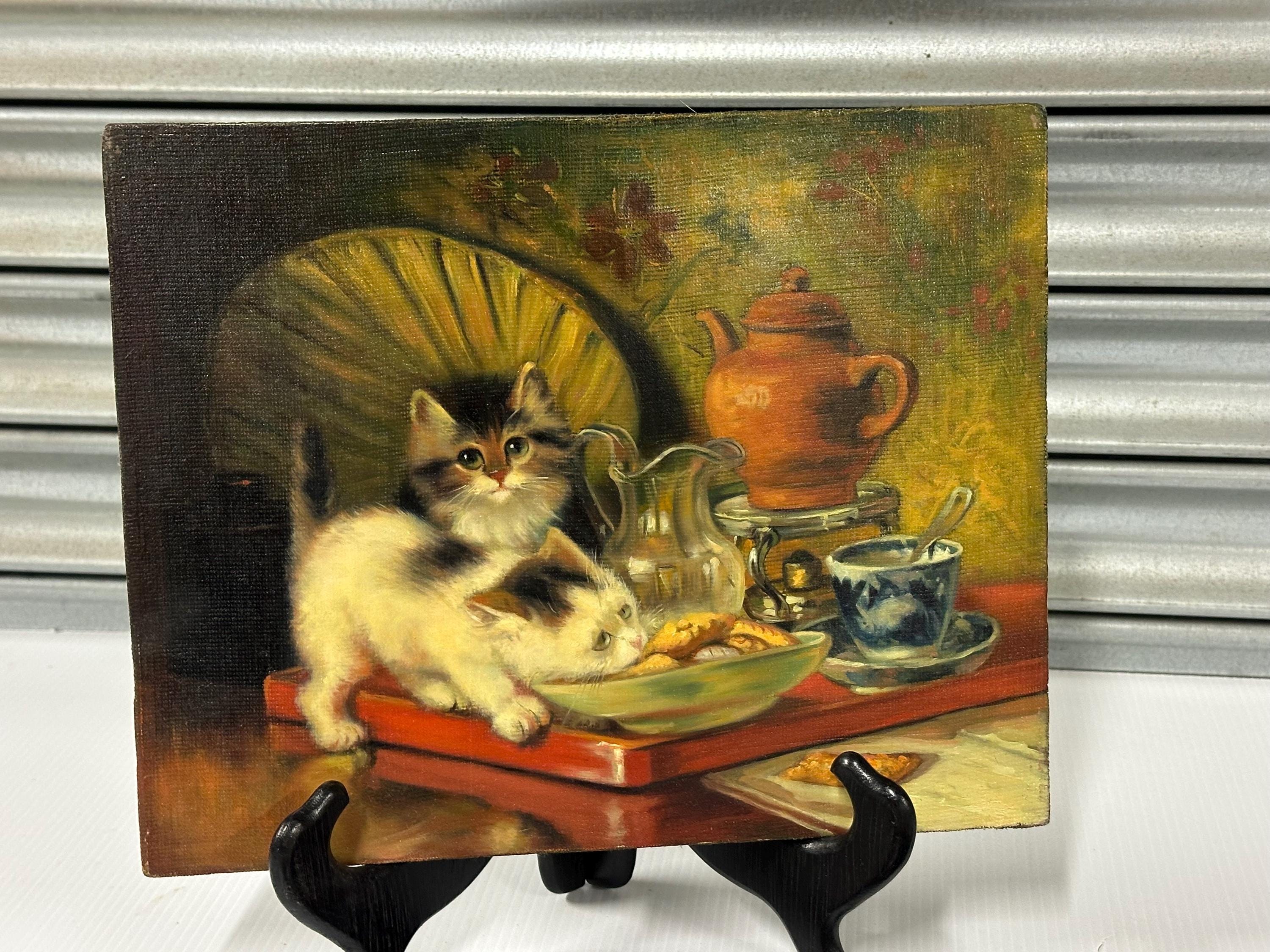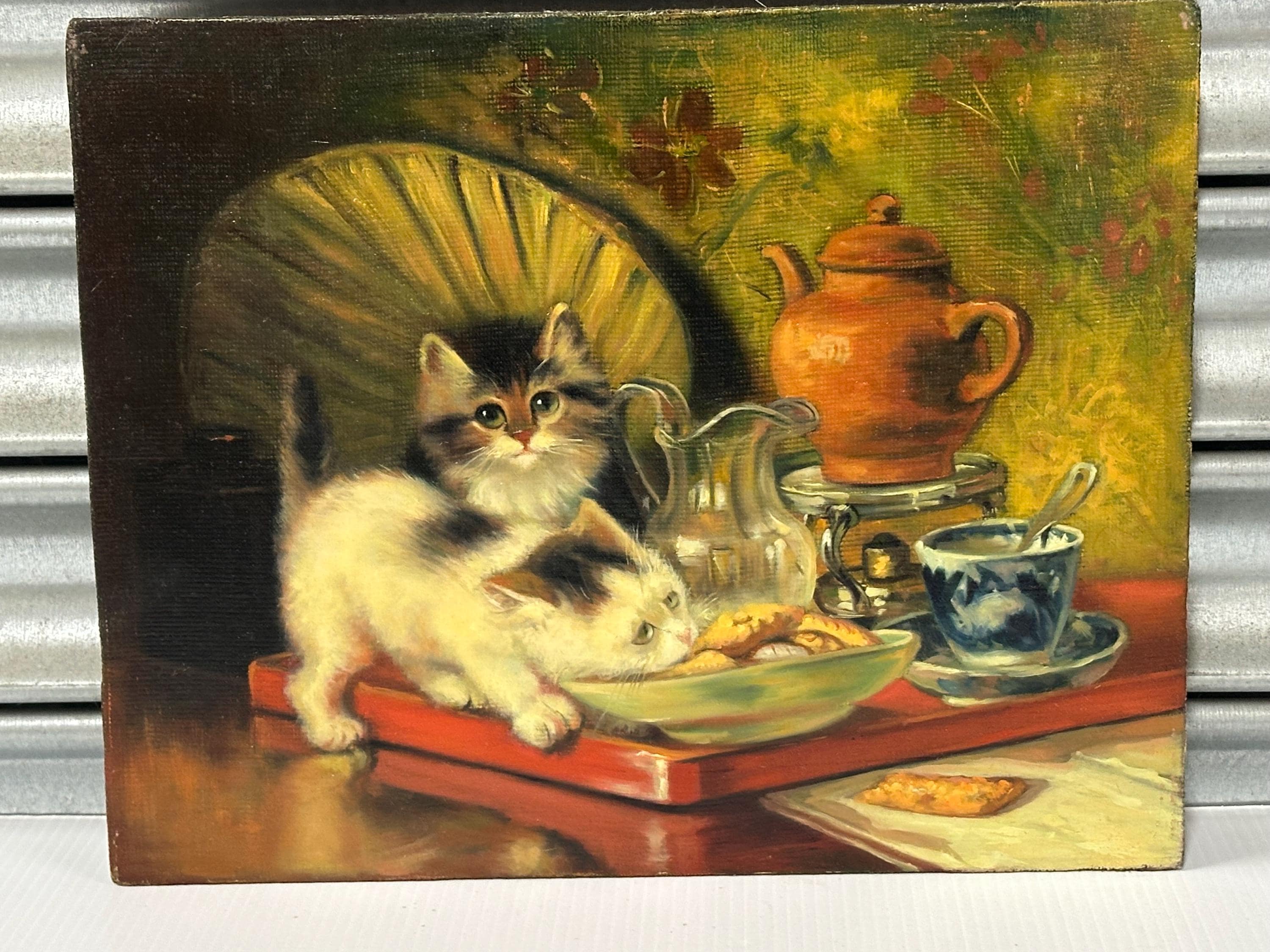 A delightful pair of original vintage oil paintings on board, each capturing a warm and nostalgic domestic scene with playful kittens. Beautifully painted with rich colour, soft brushwork and lovely attention to detail, these are perfect for collectors of animal art or lovers of traditional feline-themed pieces.