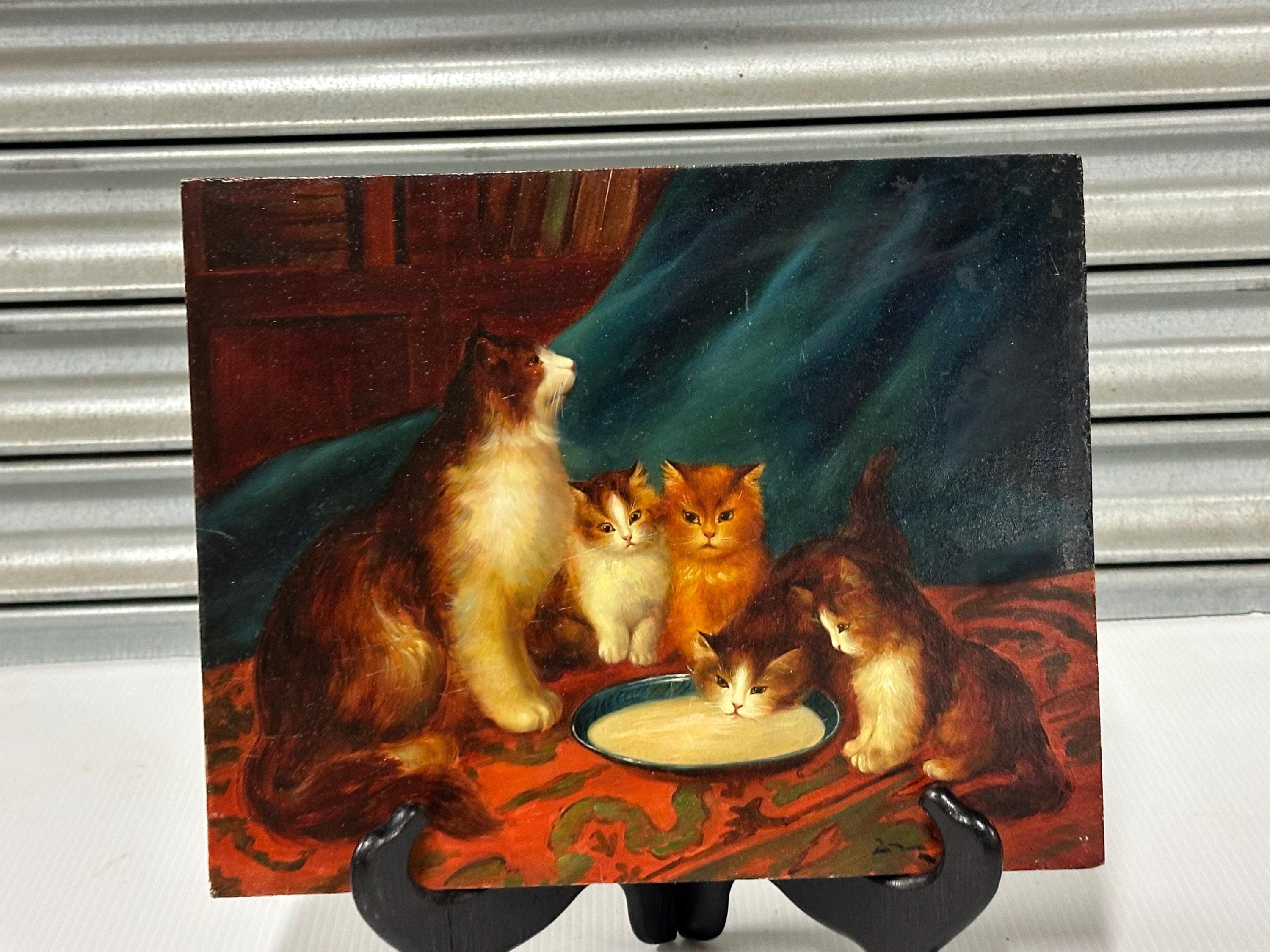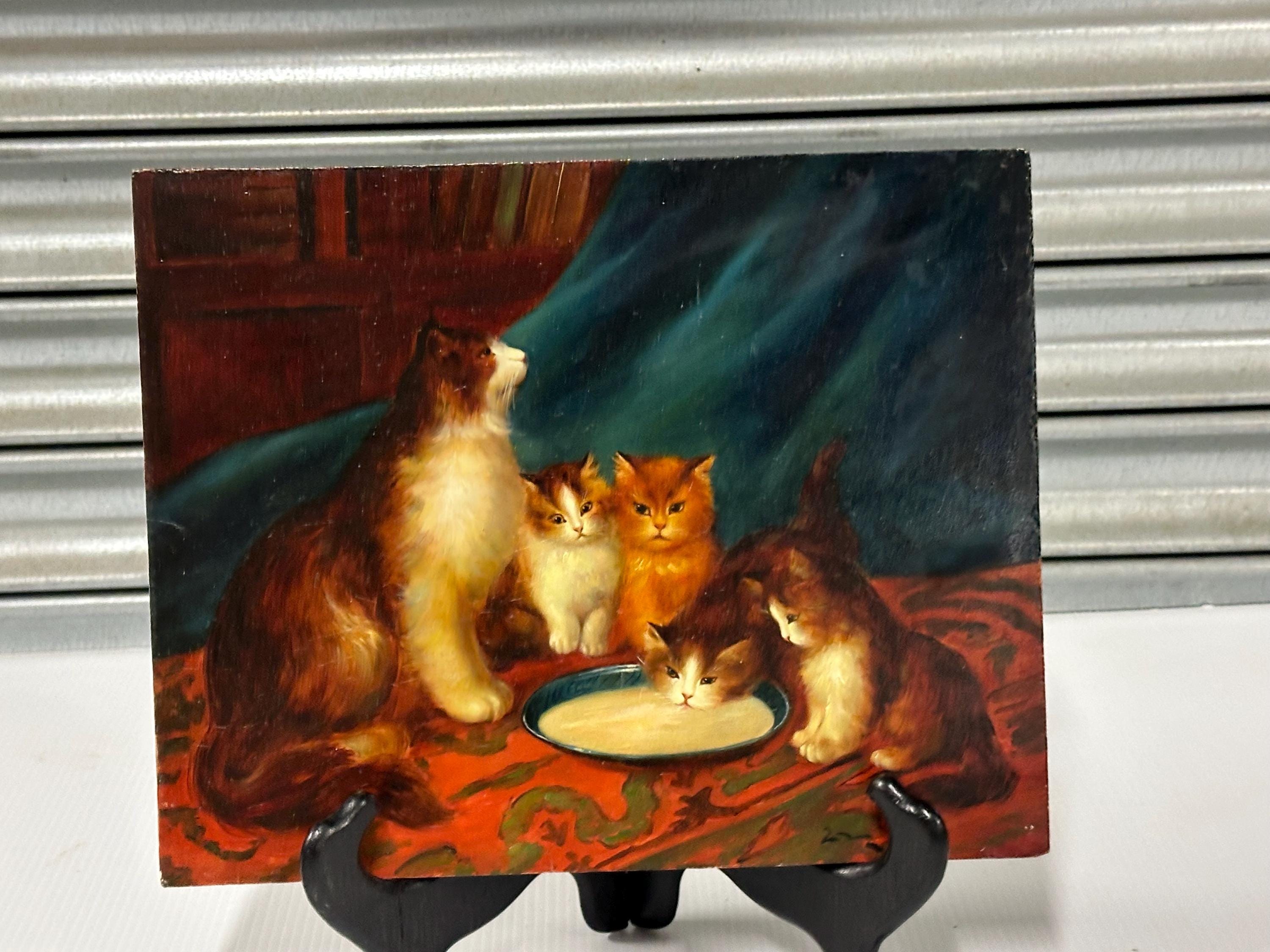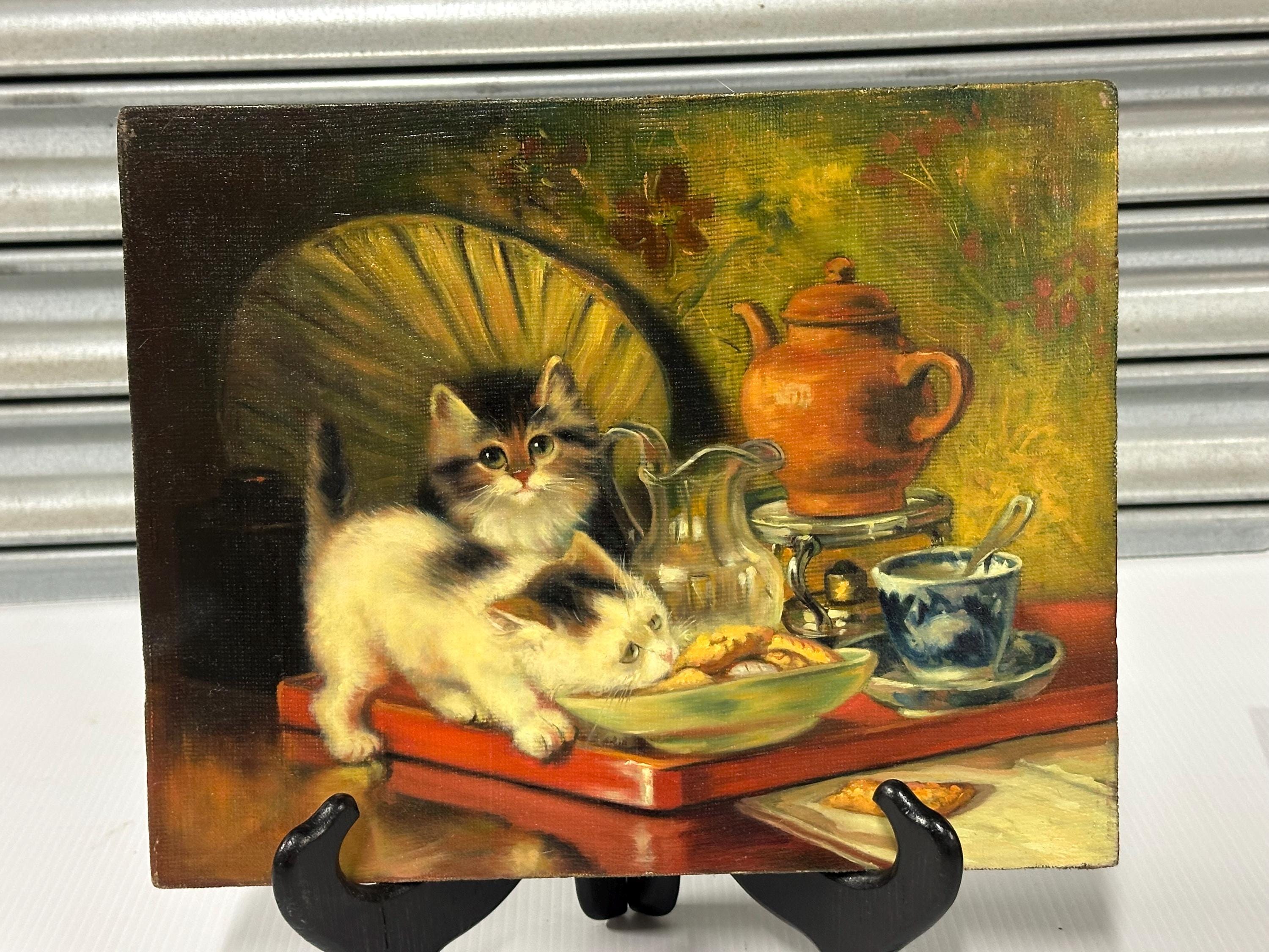 A delightful pair of original vintage oil paintings on board, each capturing a warm and nostalgic domestic scene with playful kittens. Beautifully painted with rich colour, soft brushwork and lovely attention to detail, these are perfect for collectors of animal art or lovers of traditional feline-themed pieces.