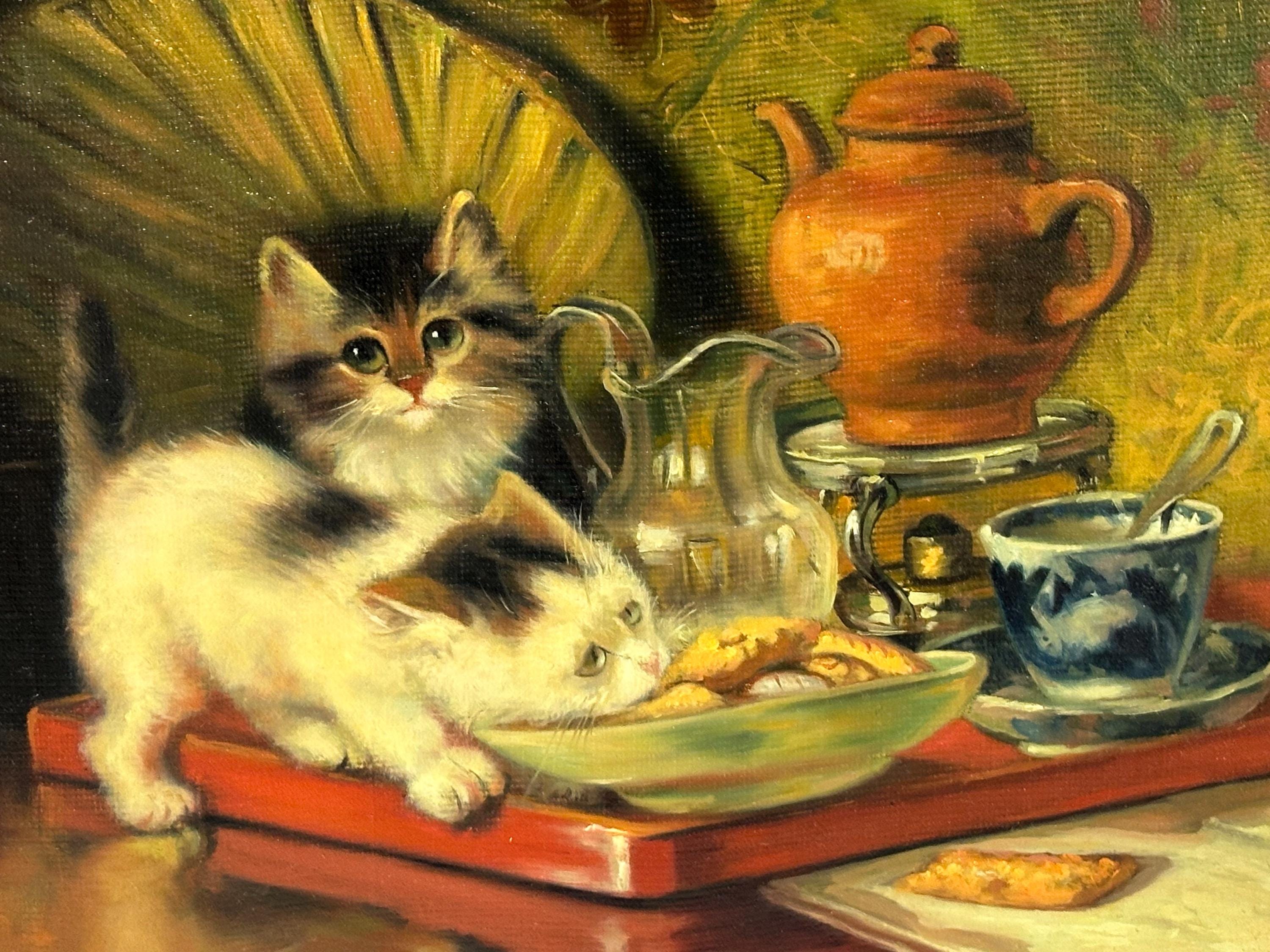 Features two curious kittens exploring a tea table set with a teapot, jug, cup and bowl. A wonderfully homely composition with great use of colour and texture.