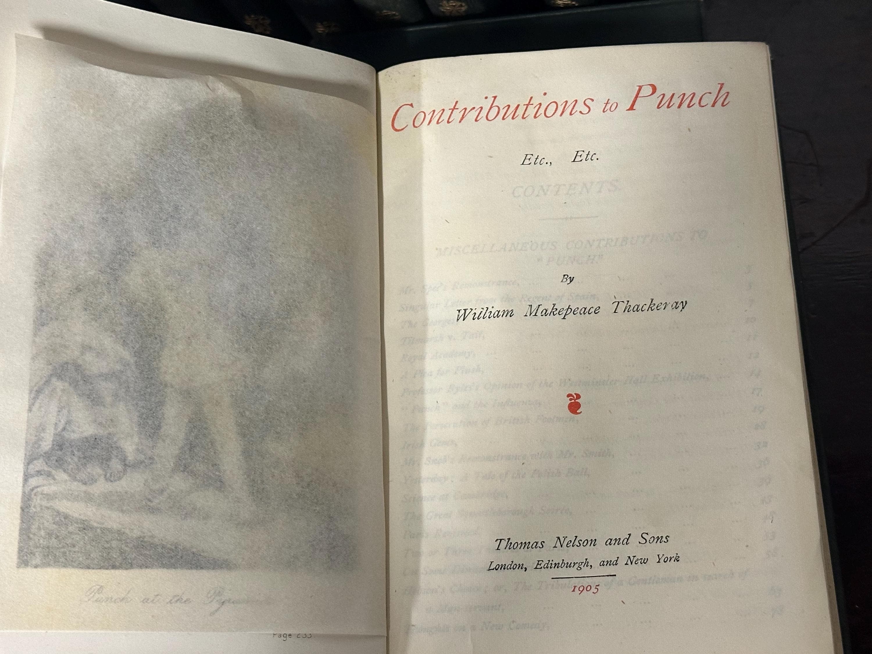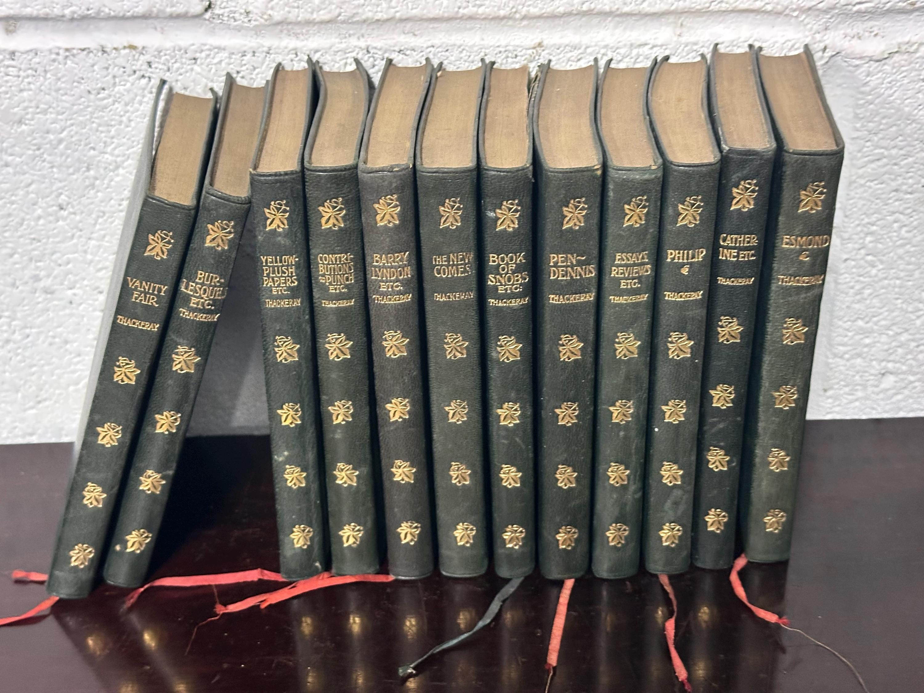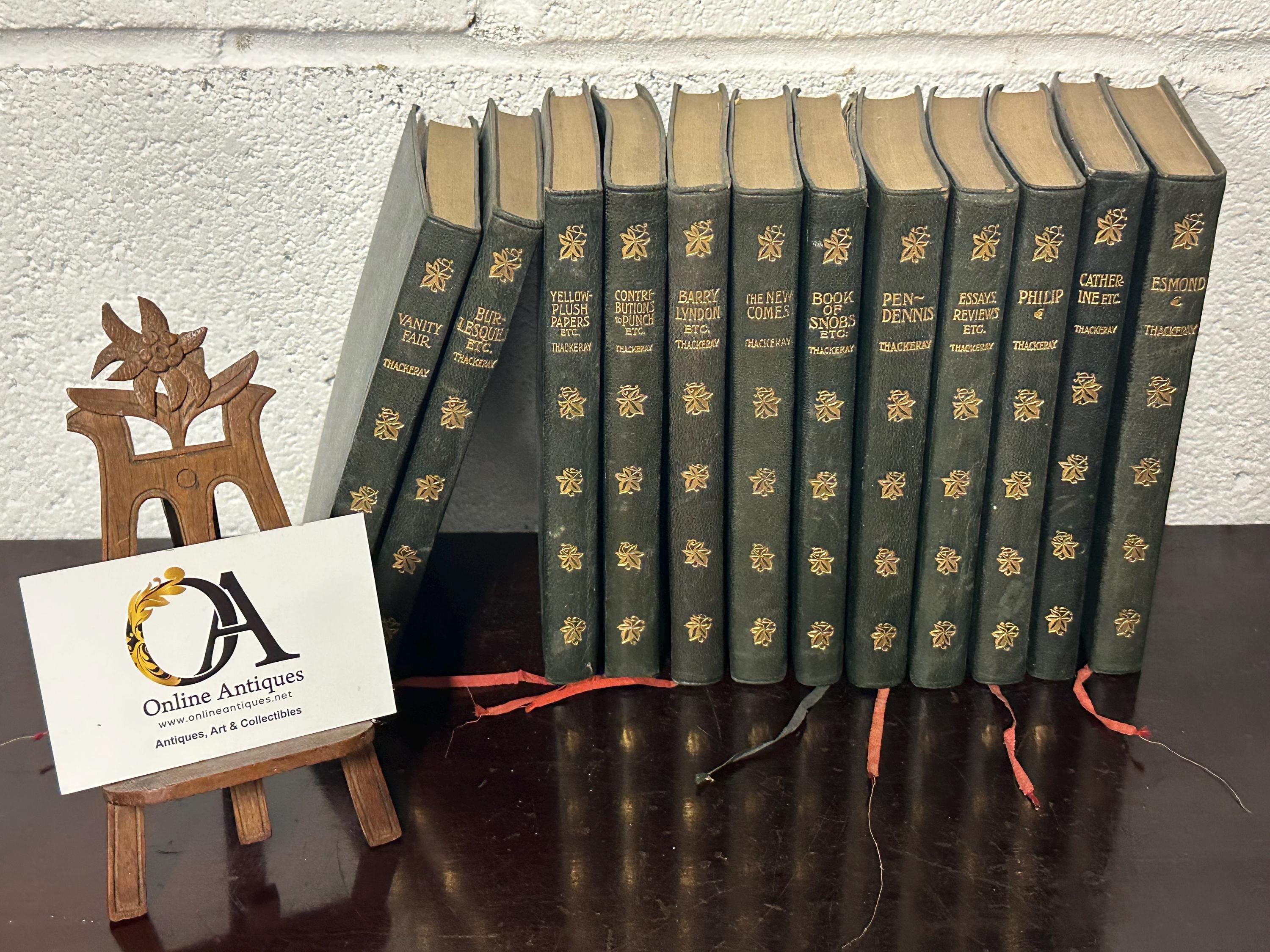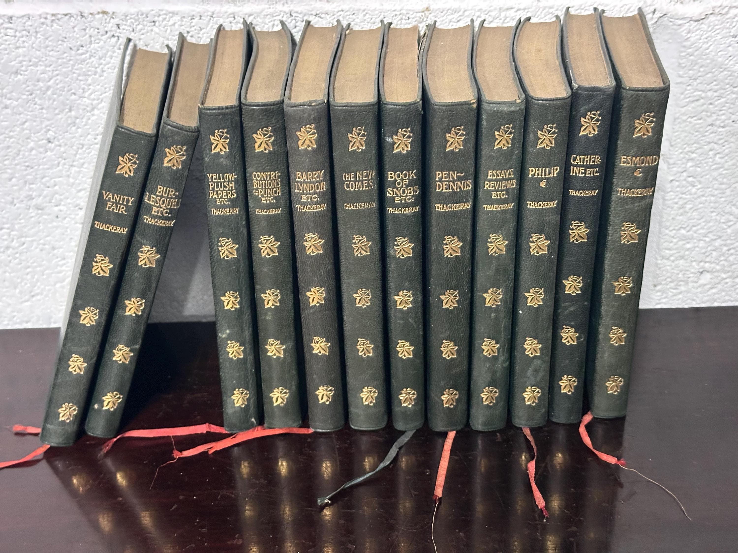 12 volumes By William Makepeace Thackeray Published By Thomas Nelson & Sons 1904-1909 Bound in matching full green leather. Covers are plain with gilt lettering and ornamentation on the spine