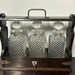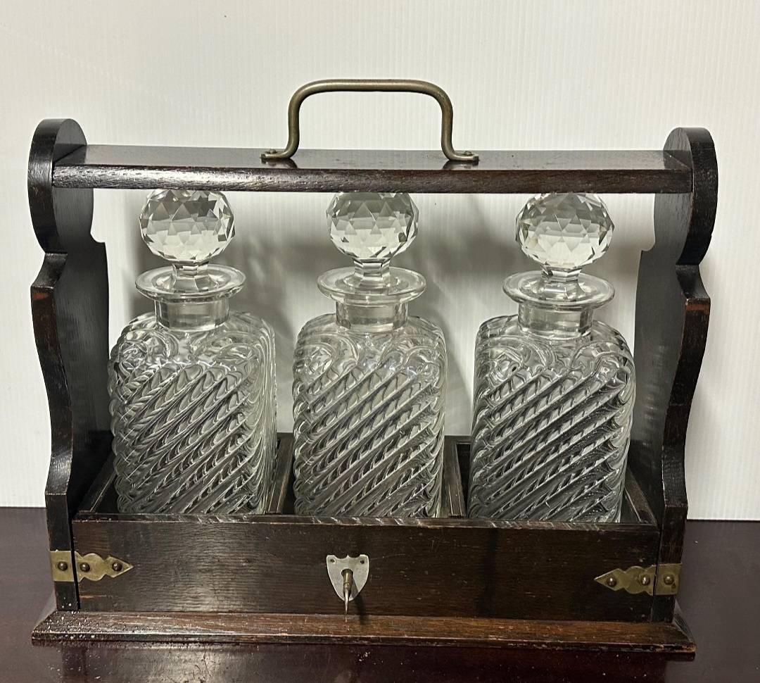 With brass hinges and brass shaped shield to each end of the tantalus