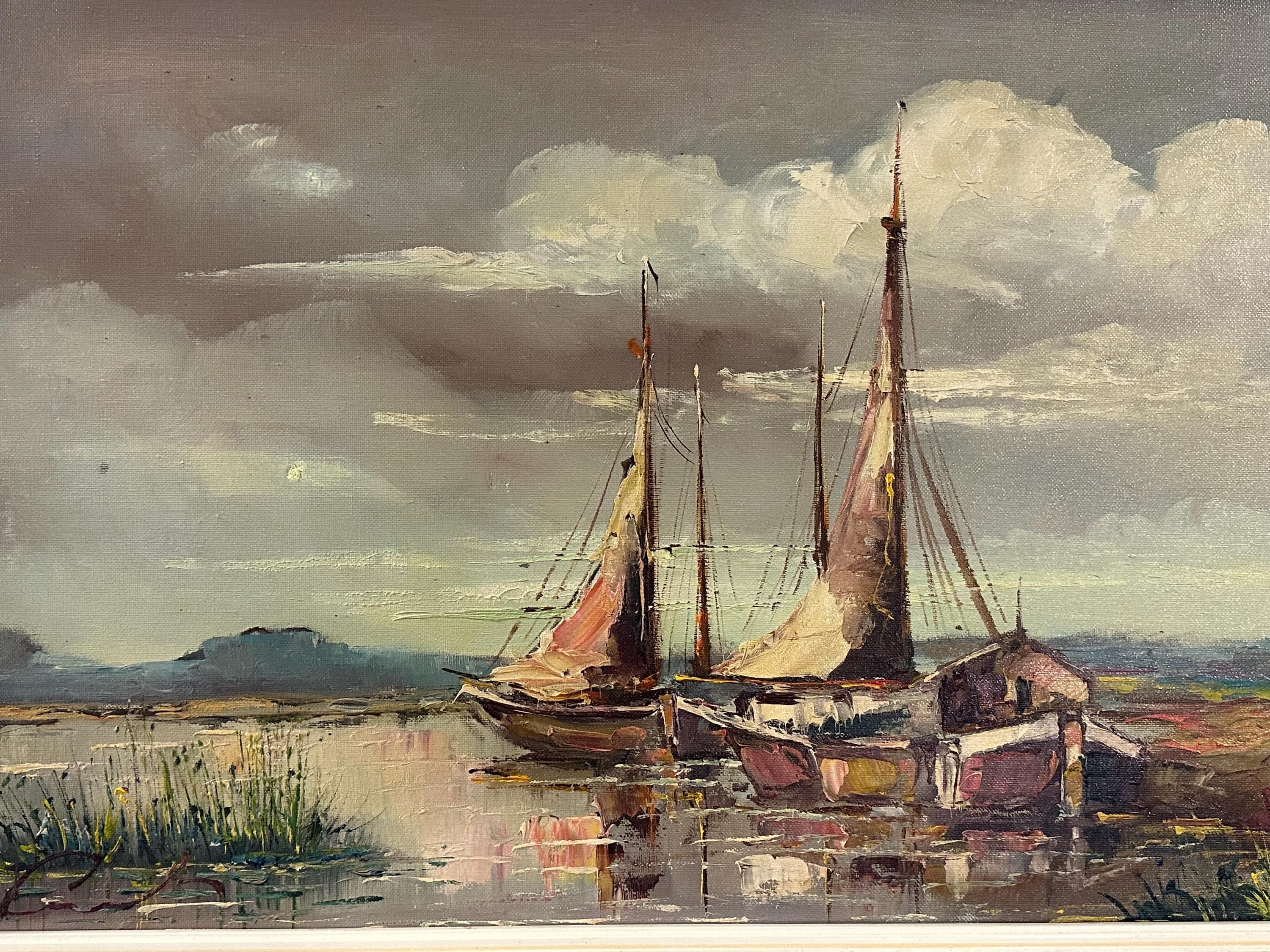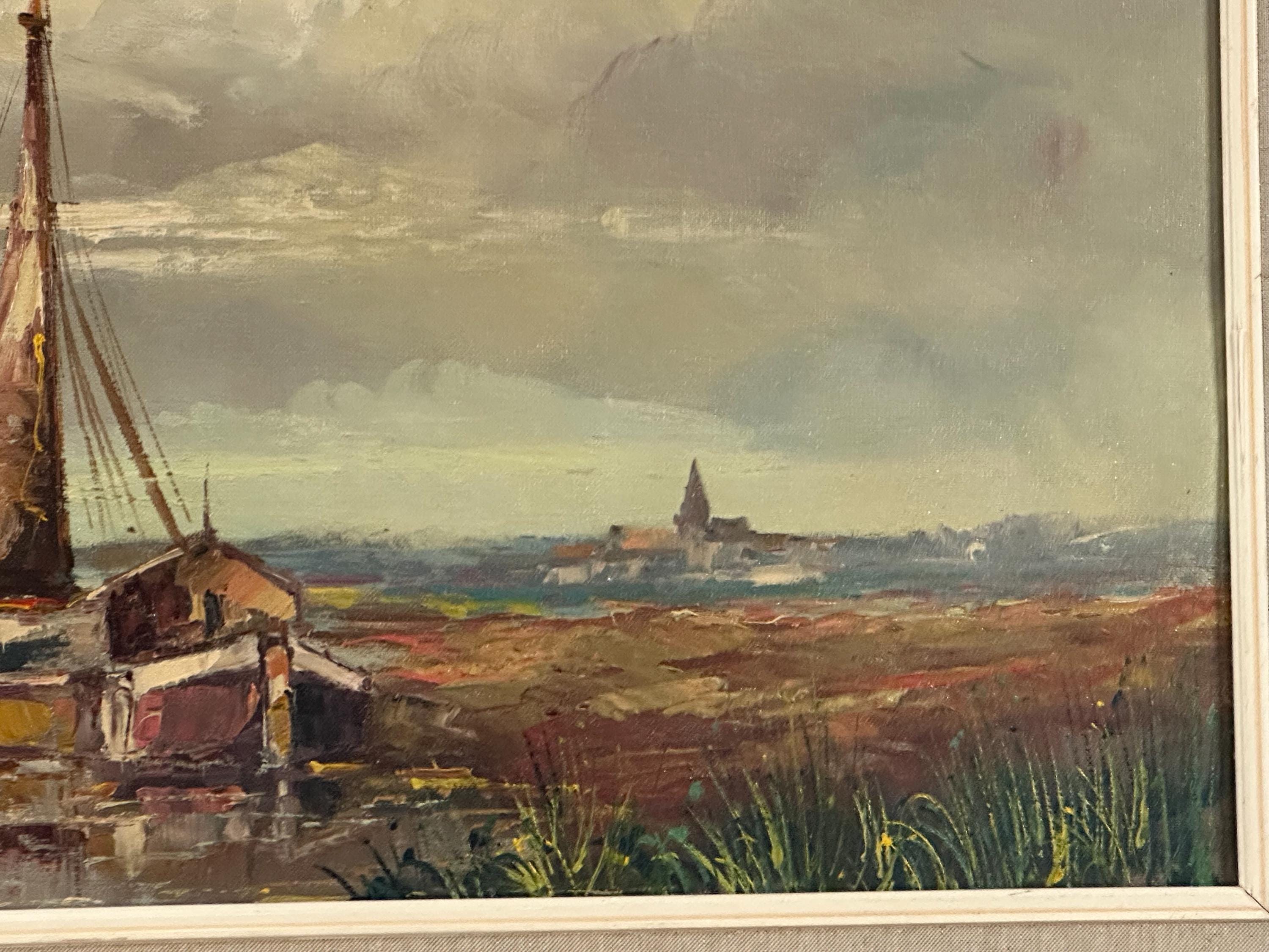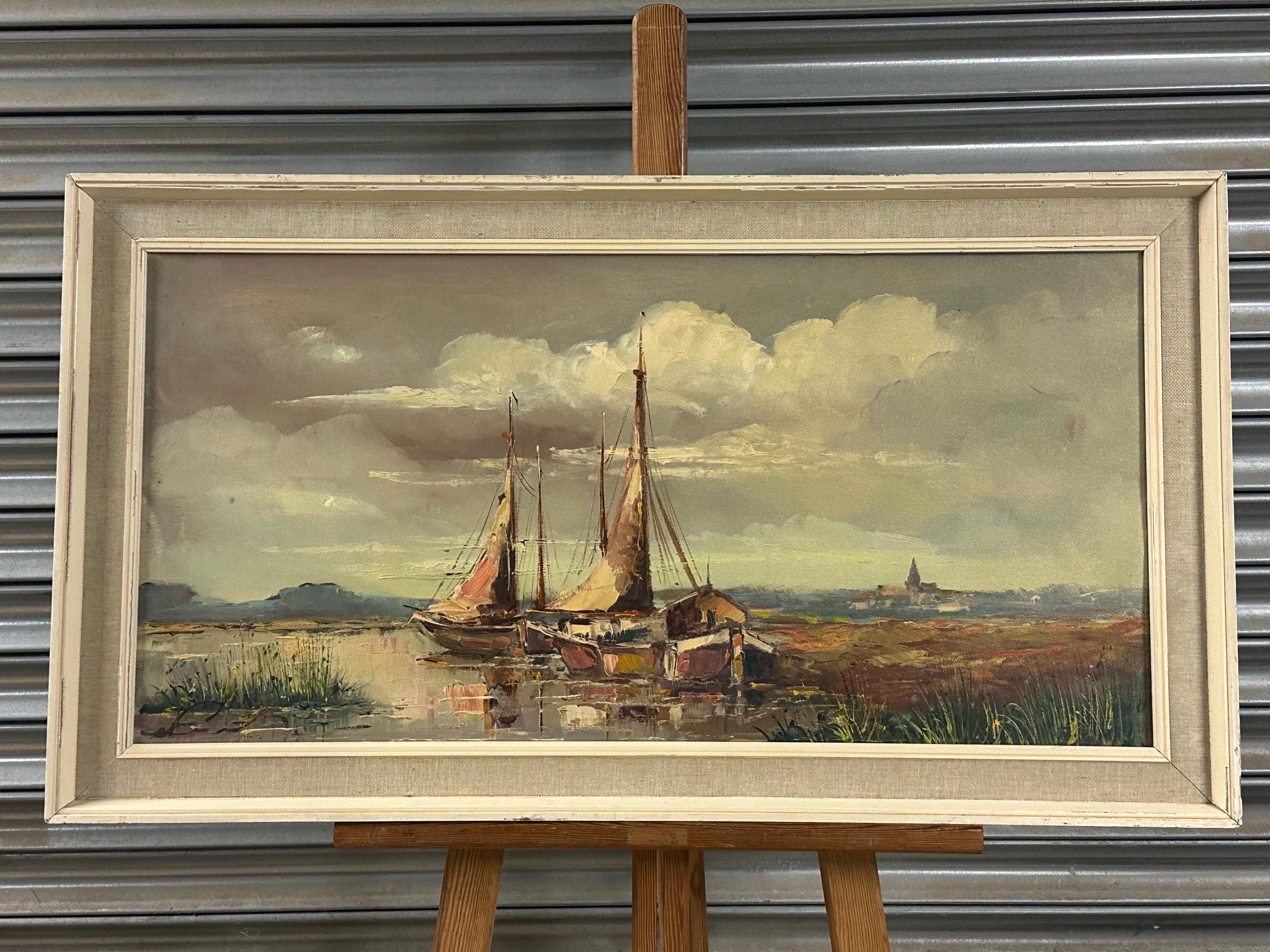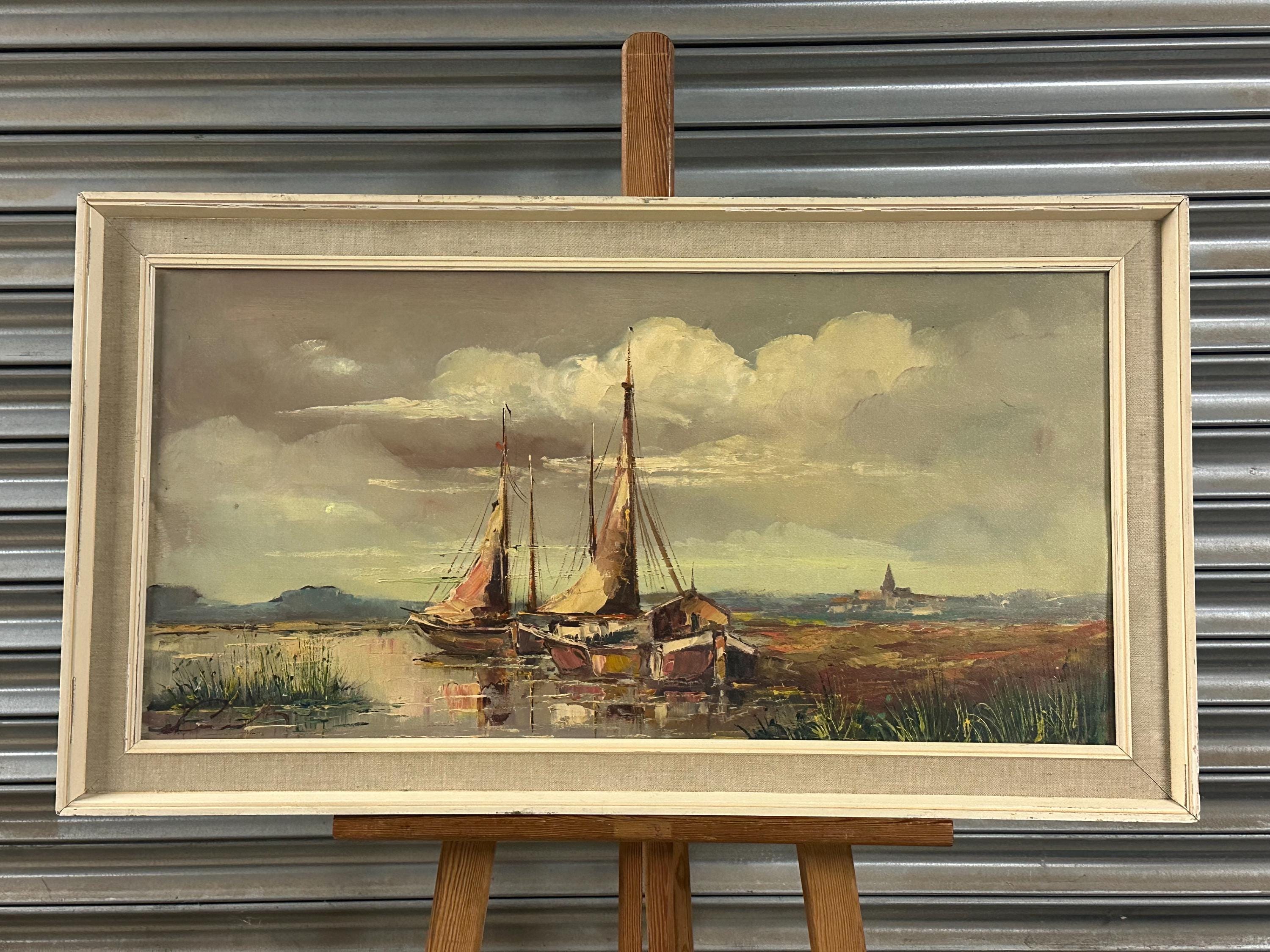 Beautiful original mid-century oil painting depicting a tranquil harbour / estuary scene with sailing boats moored beside waterside buildings, set beneath a dramatic sky. Executed in rich, expressive brushstrokes typical of the 1960s–70s, with lovely muted coastal tones and strong atmospheric depth.