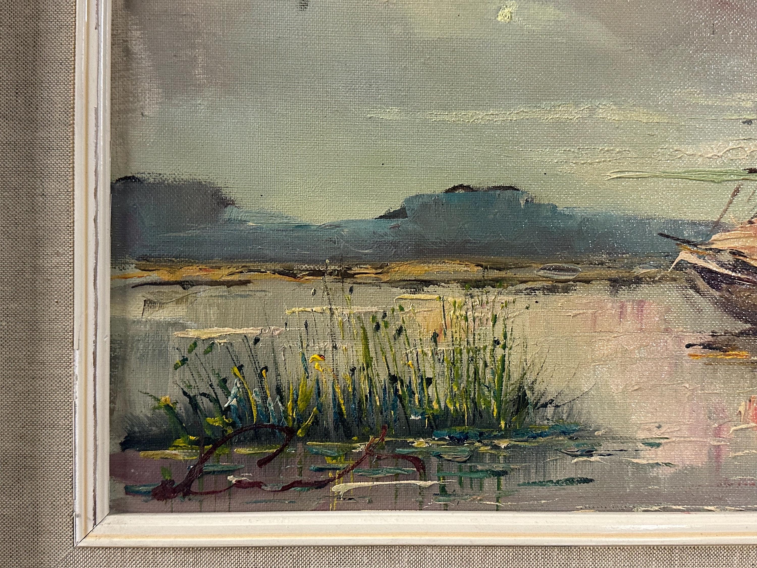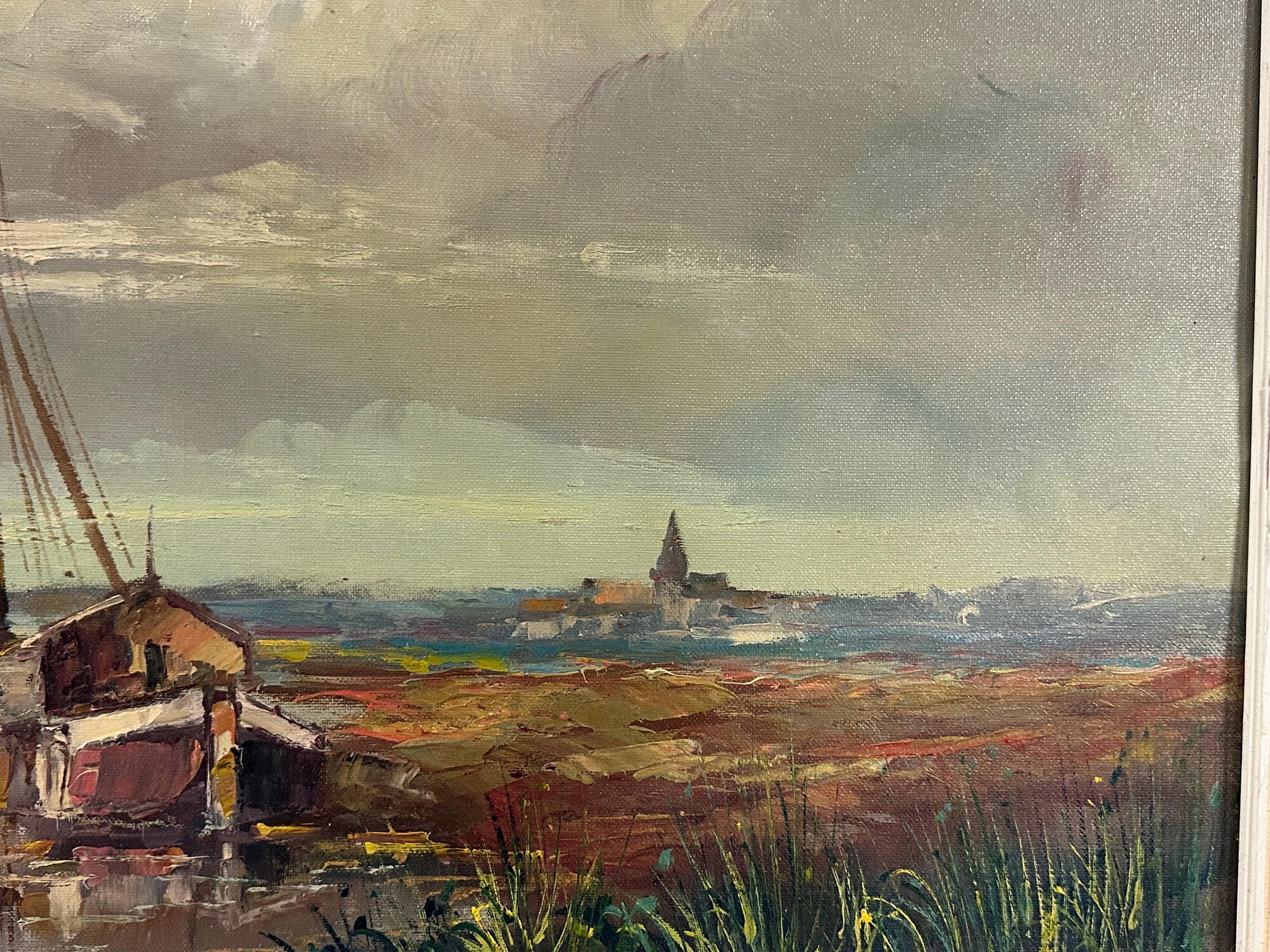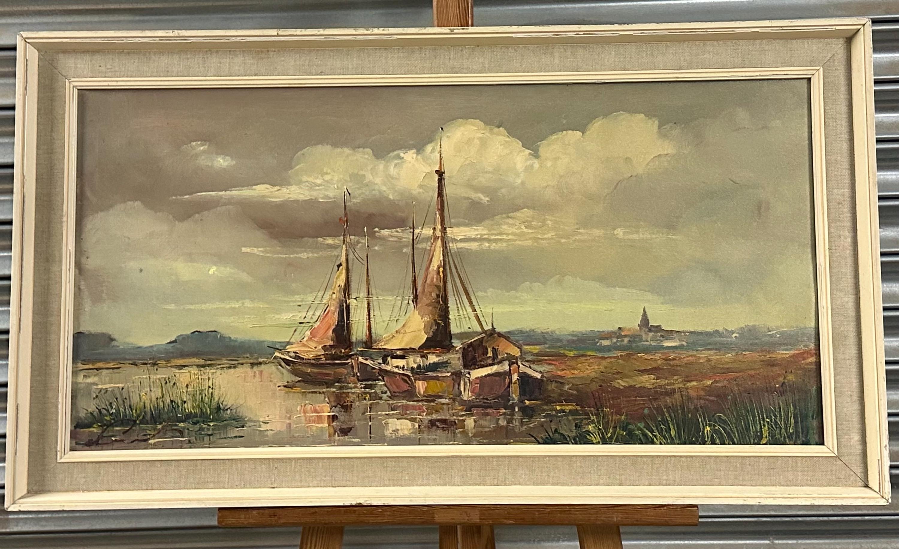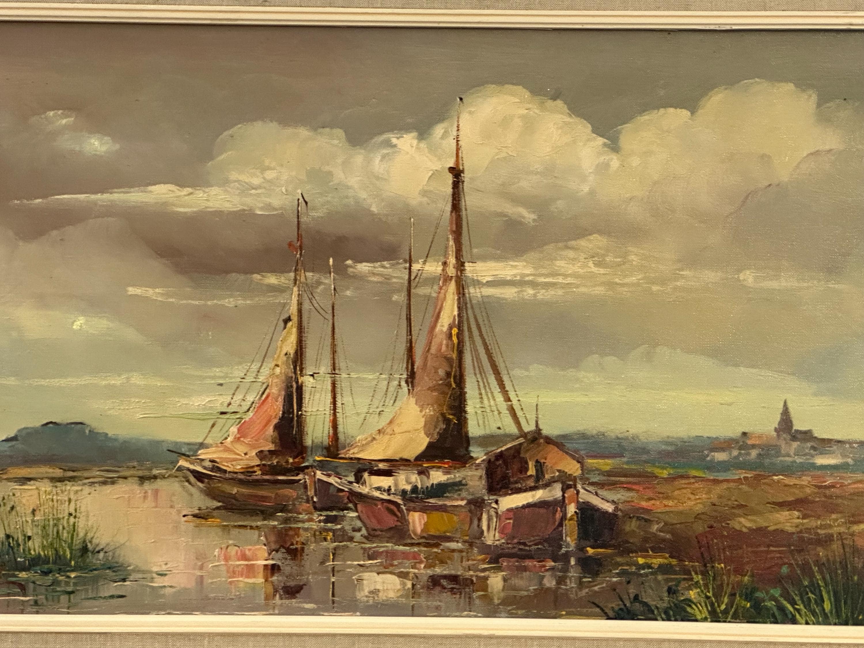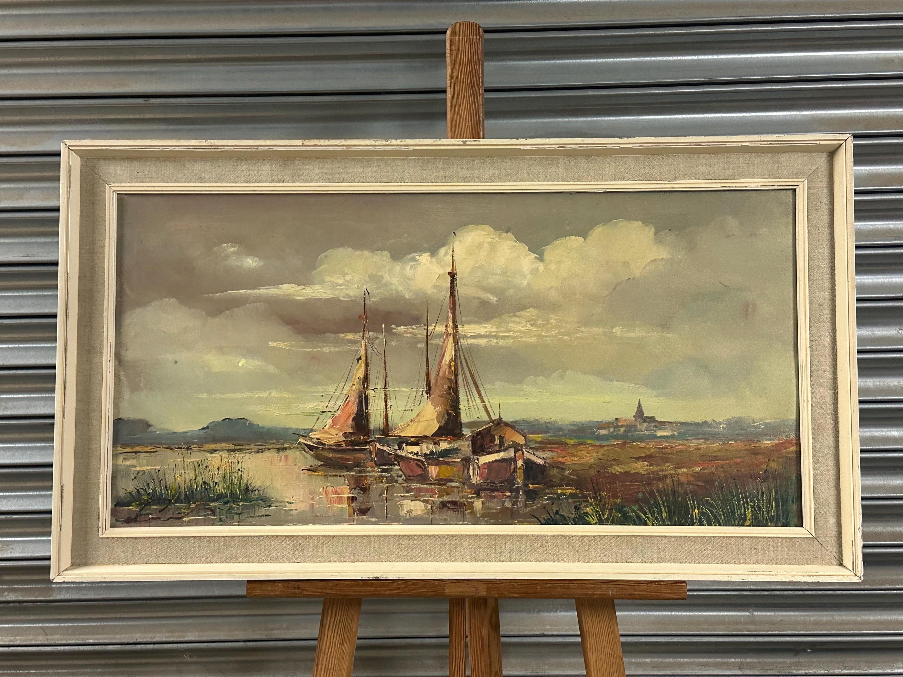 Beautiful original mid-century oil painting depicting a tranquil harbour / estuary scene with sailing boats moored beside waterside buildings, set beneath a dramatic sky. Executed in rich, expressive brushstrokes typical of the 1960s–70s, with lovely muted coastal tones and strong atmospheric depth.