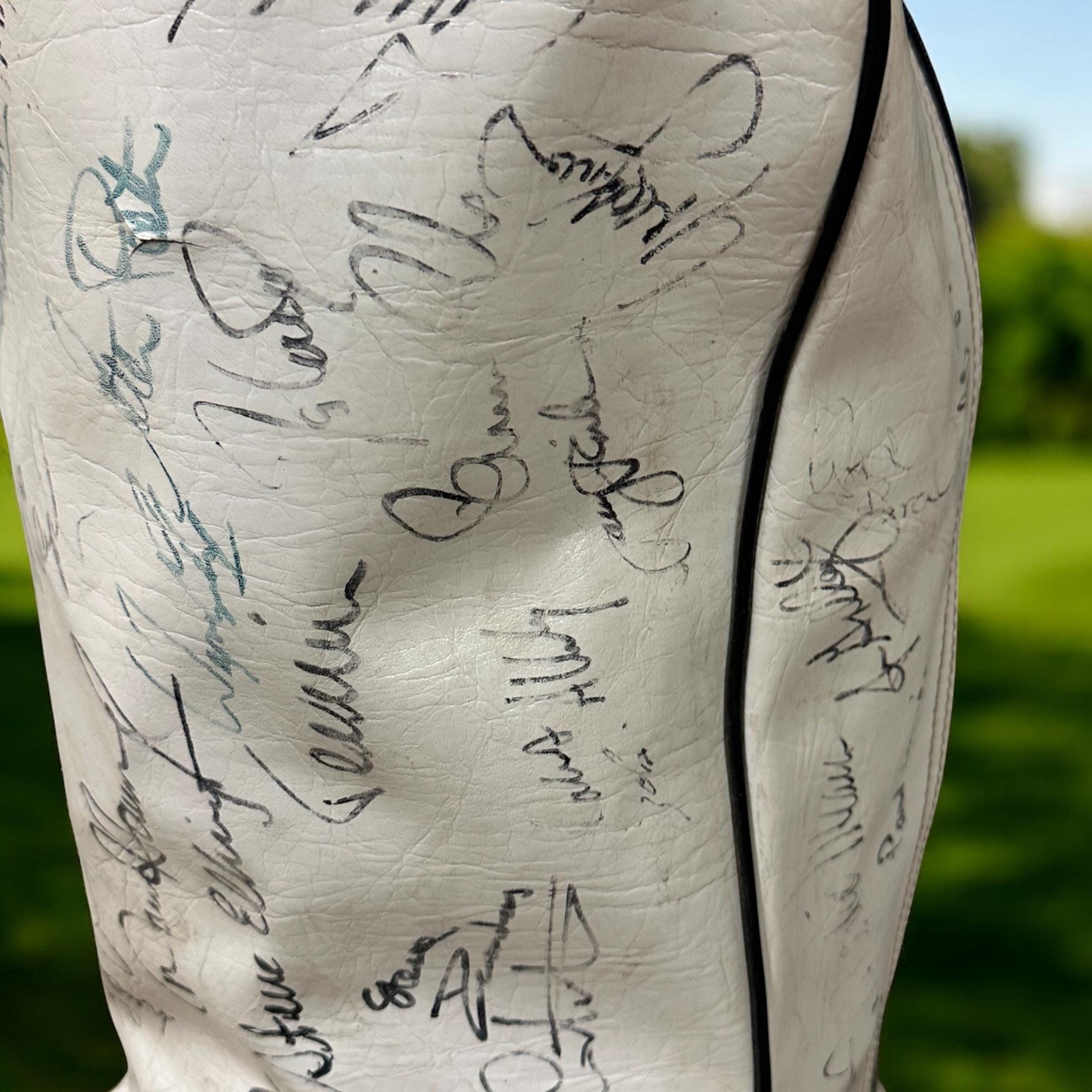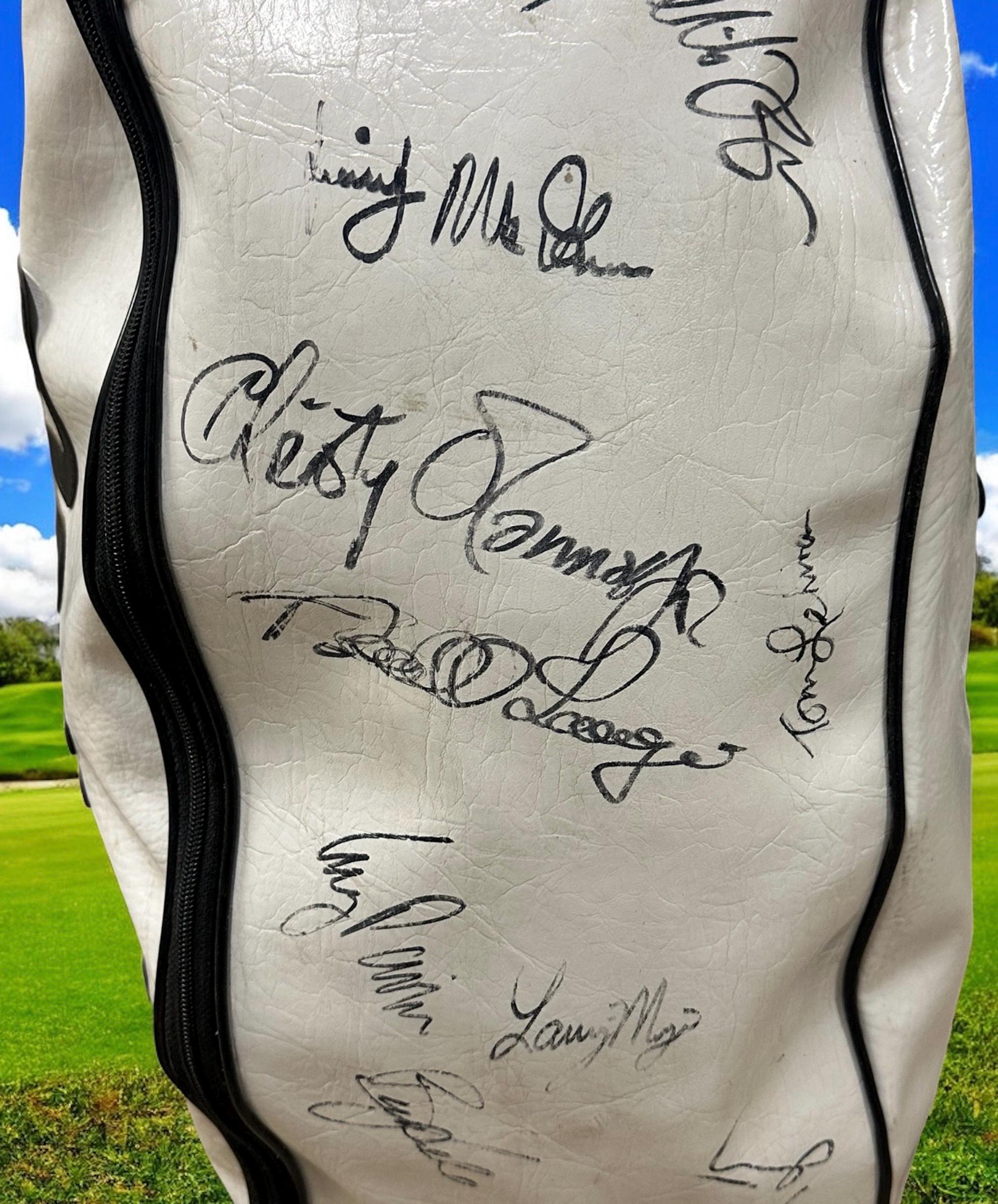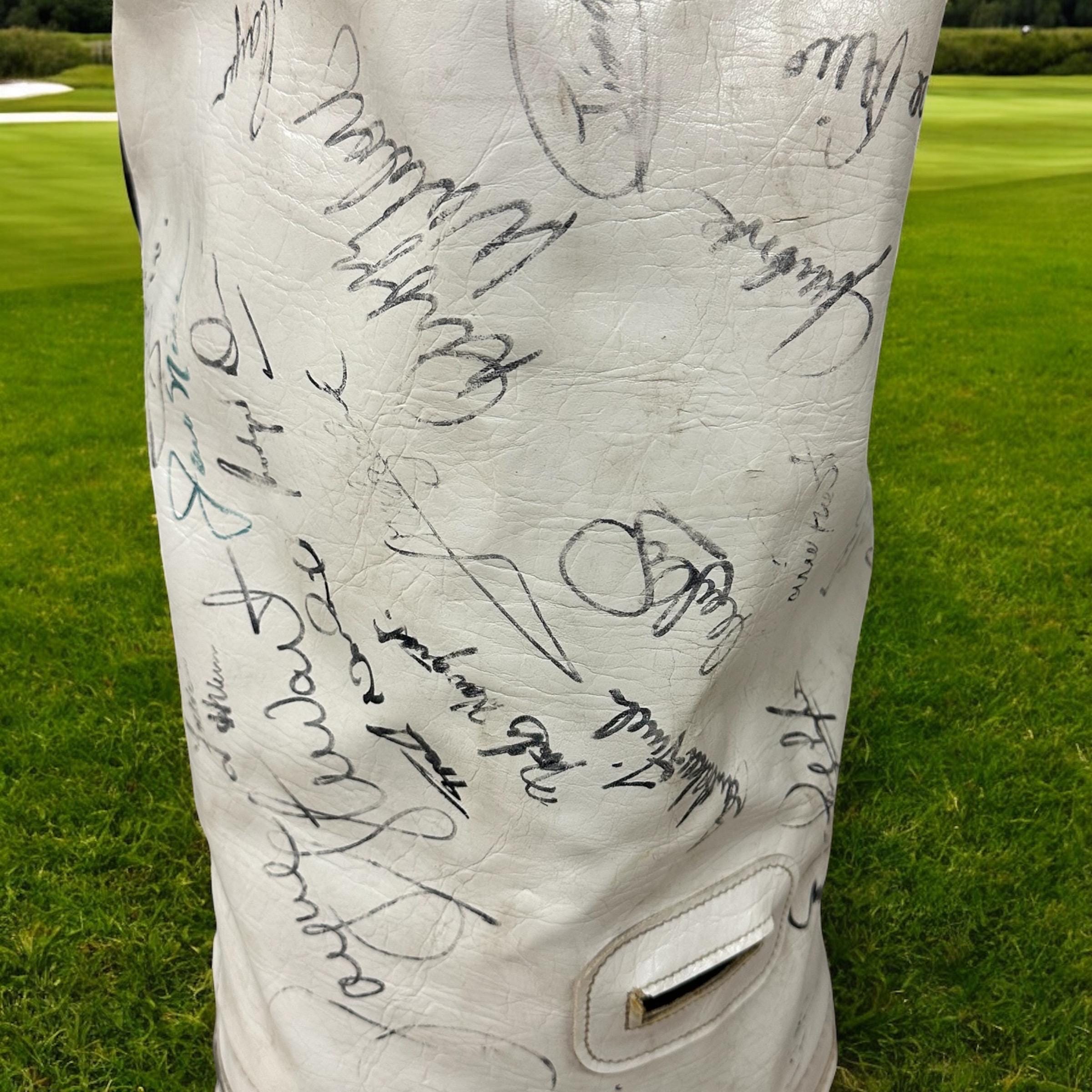 Autographs cover much of the bag, 70 or more and some have worn but Seve’s is clear and shown in one of the photos