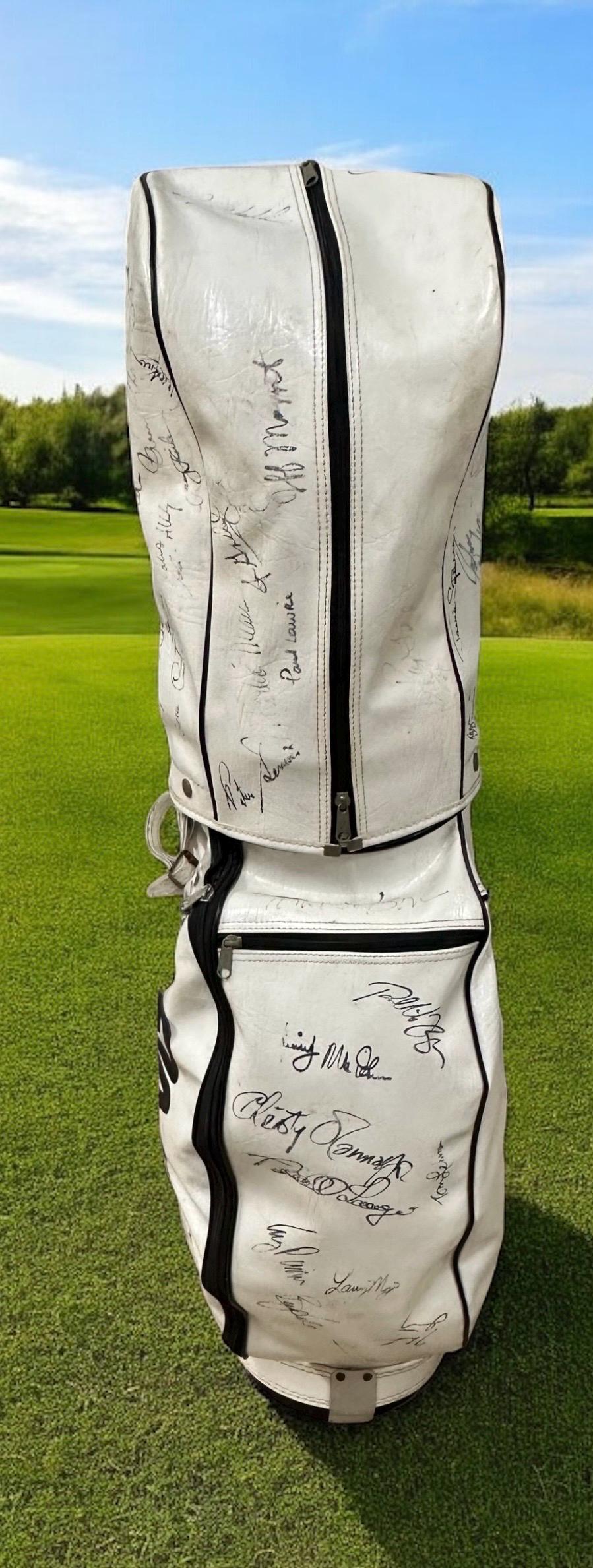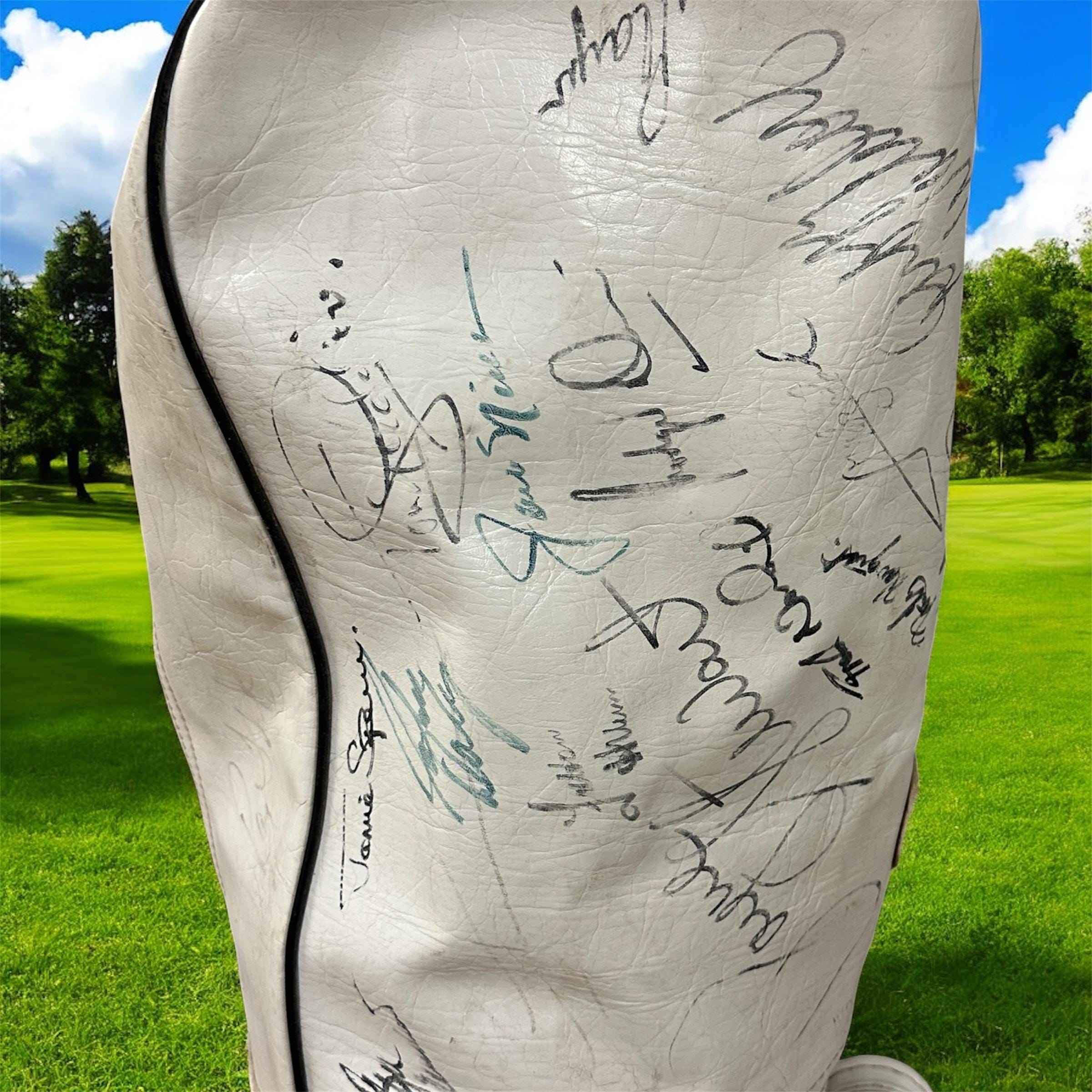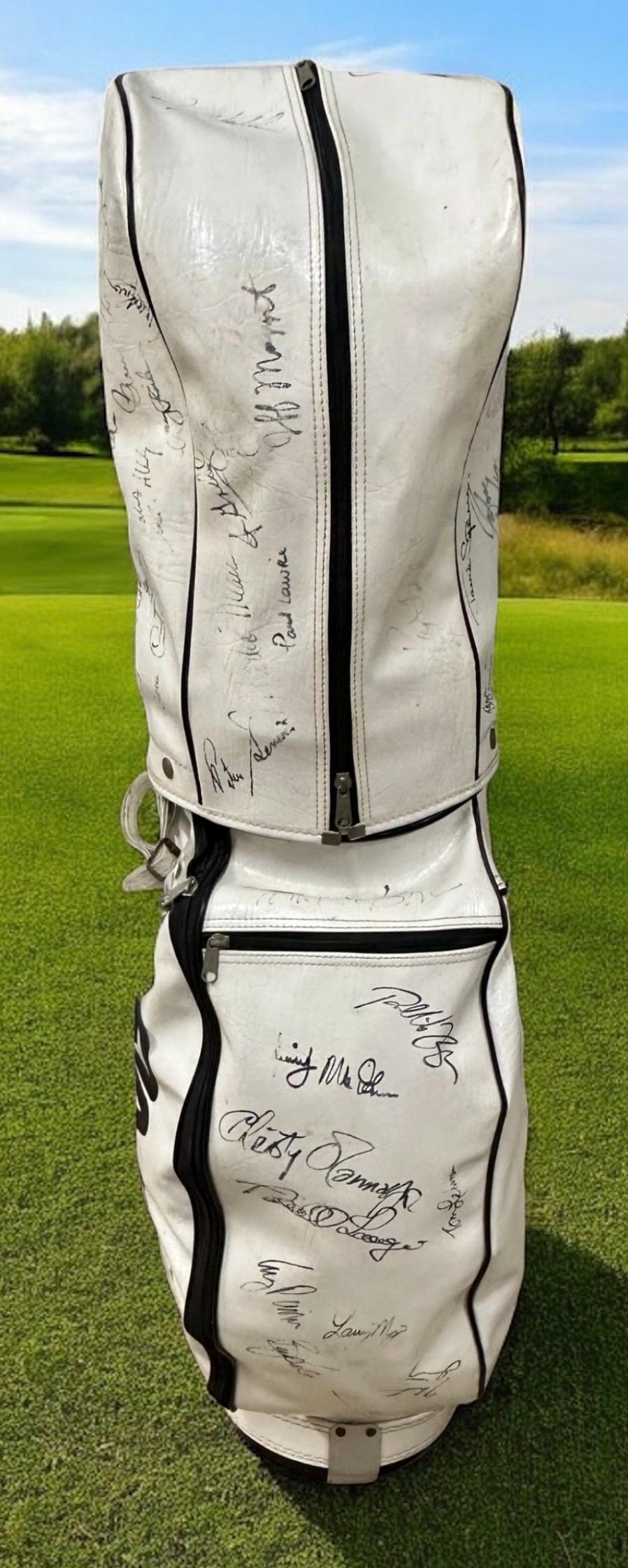 Autographs cover much of the bag, 70 or more and some have worn but Seve’s is clear and shown in one of the photos