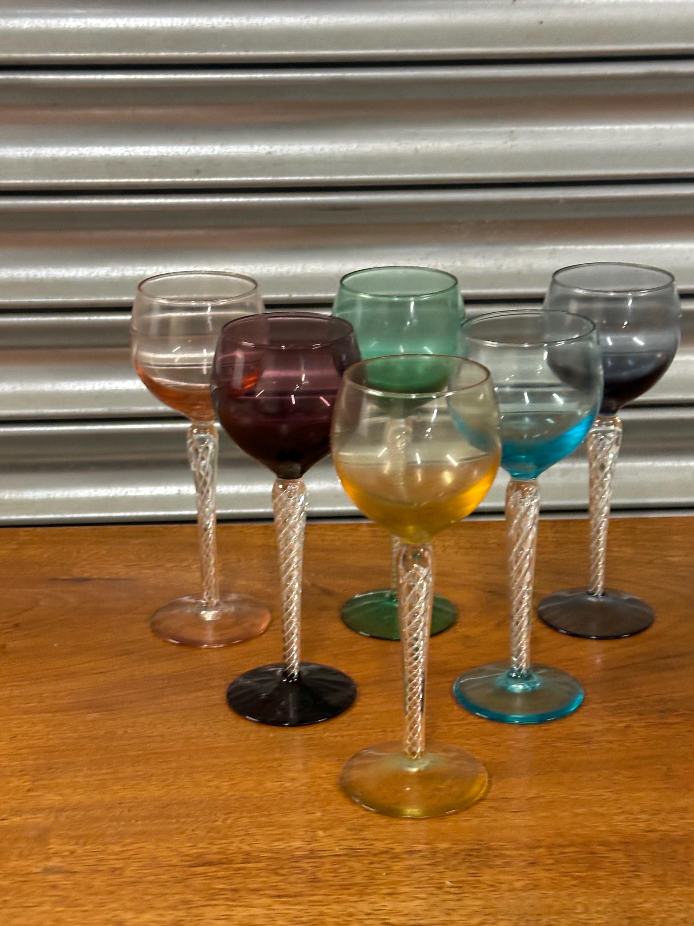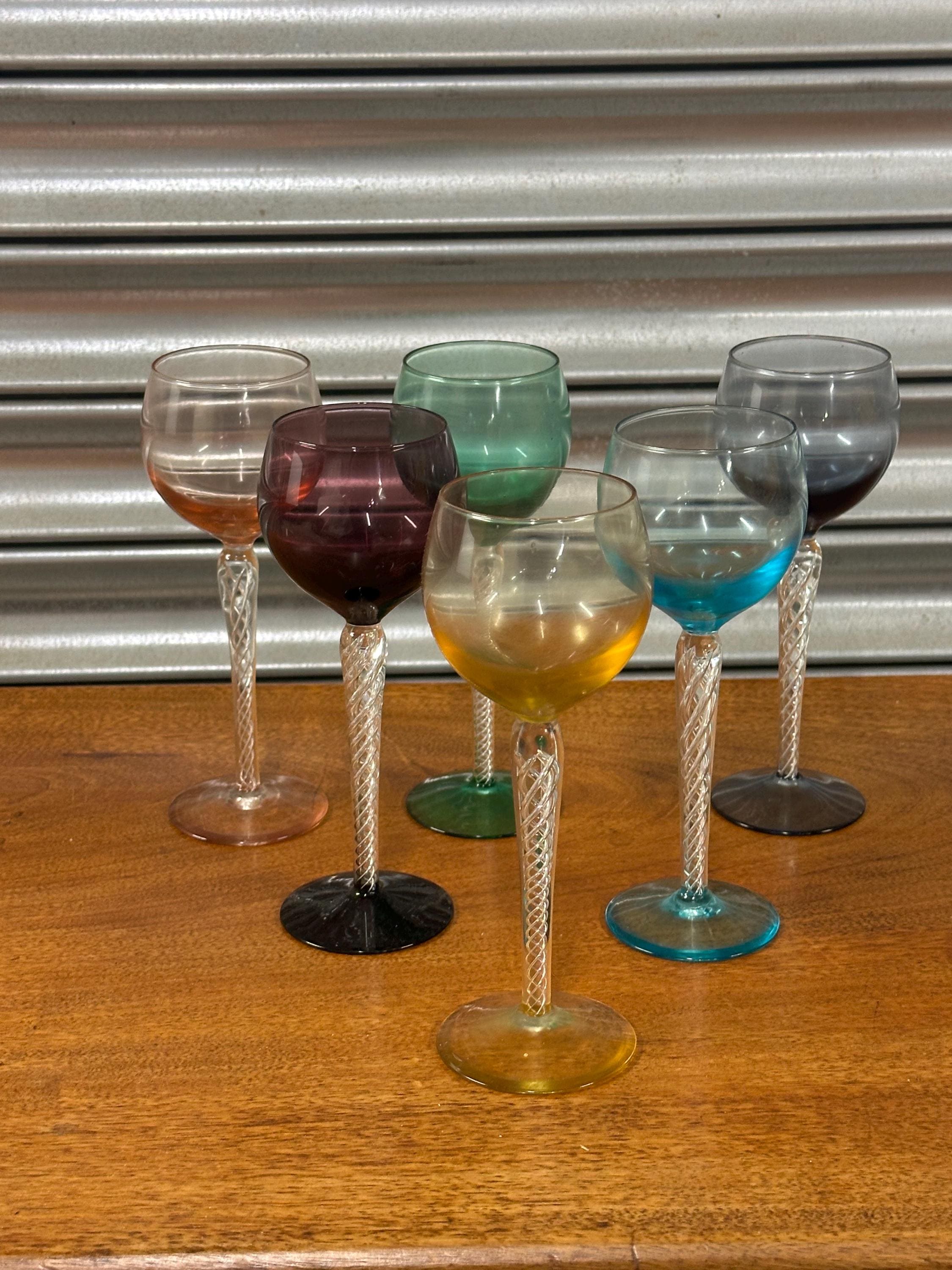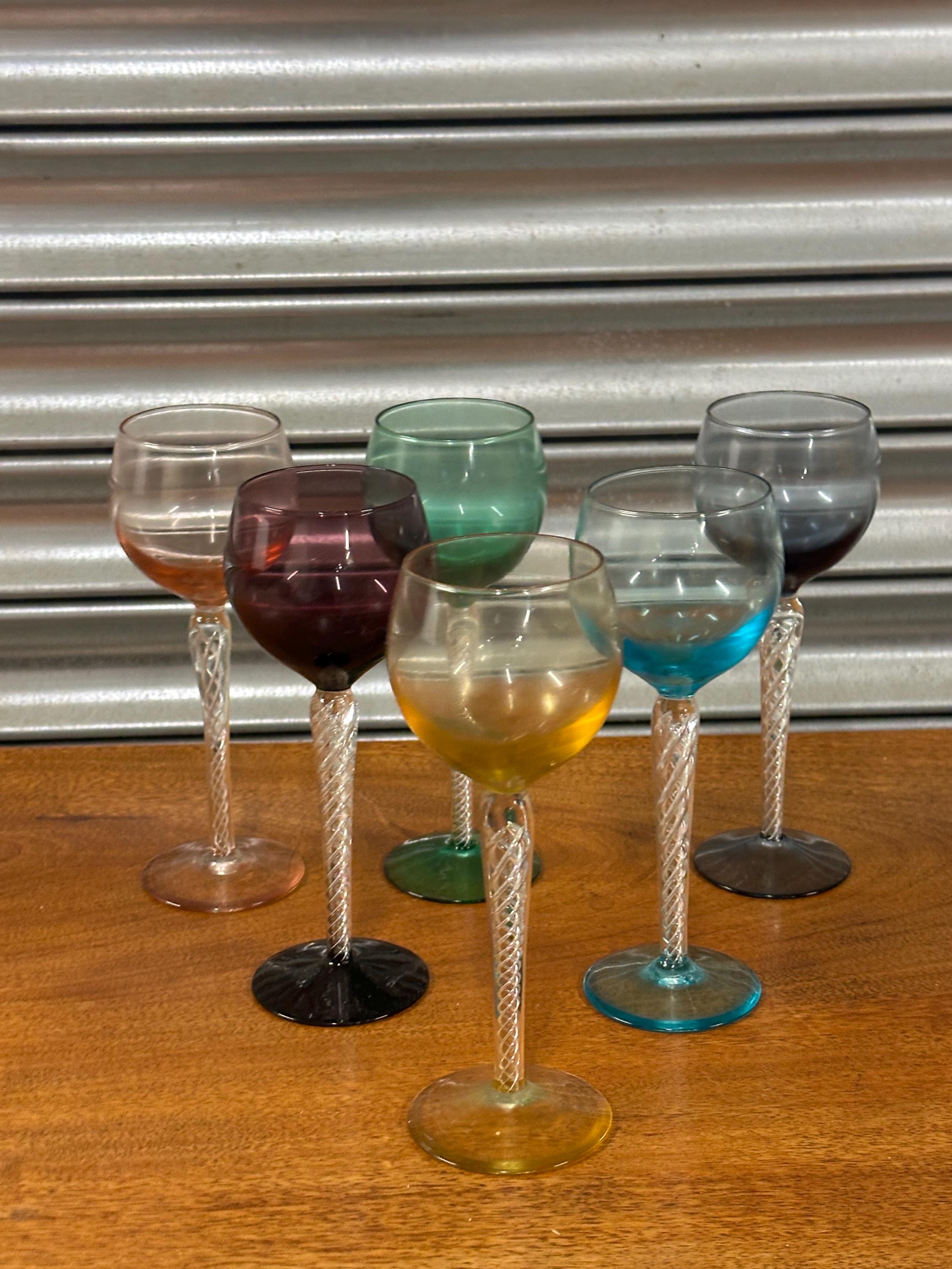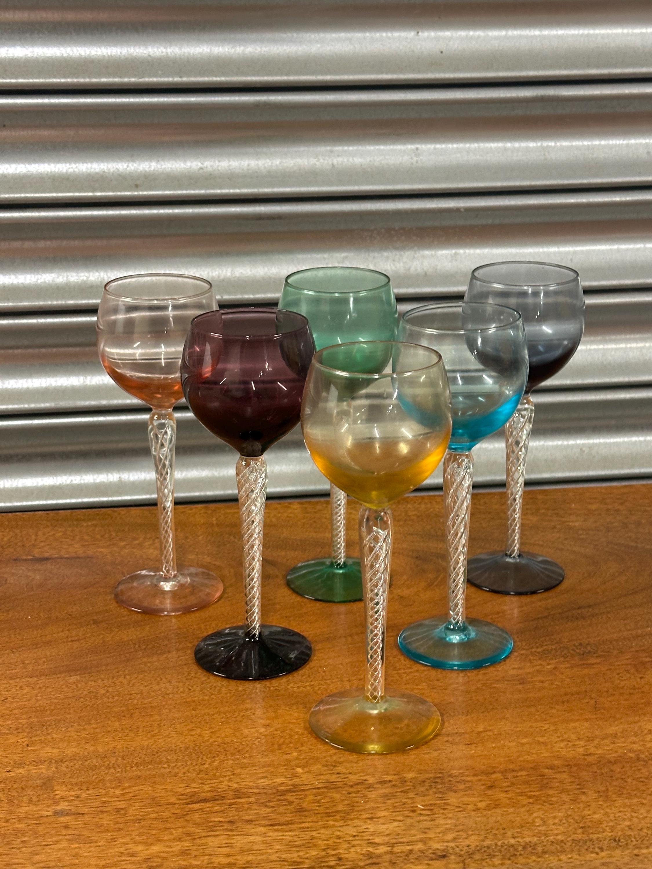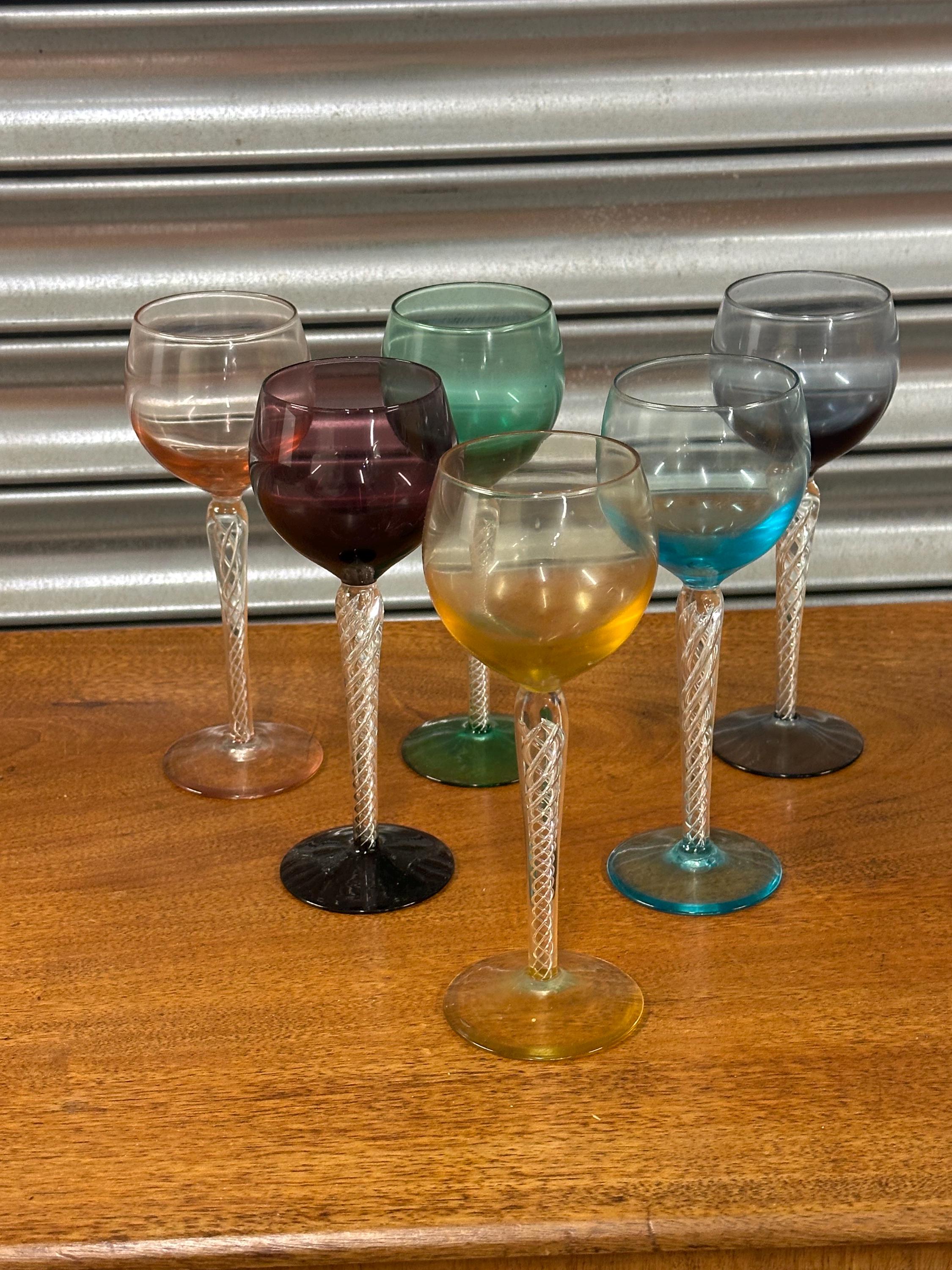 Six Vintage Coloured Air Twist Stem Coloured Crystal Hock Glasses