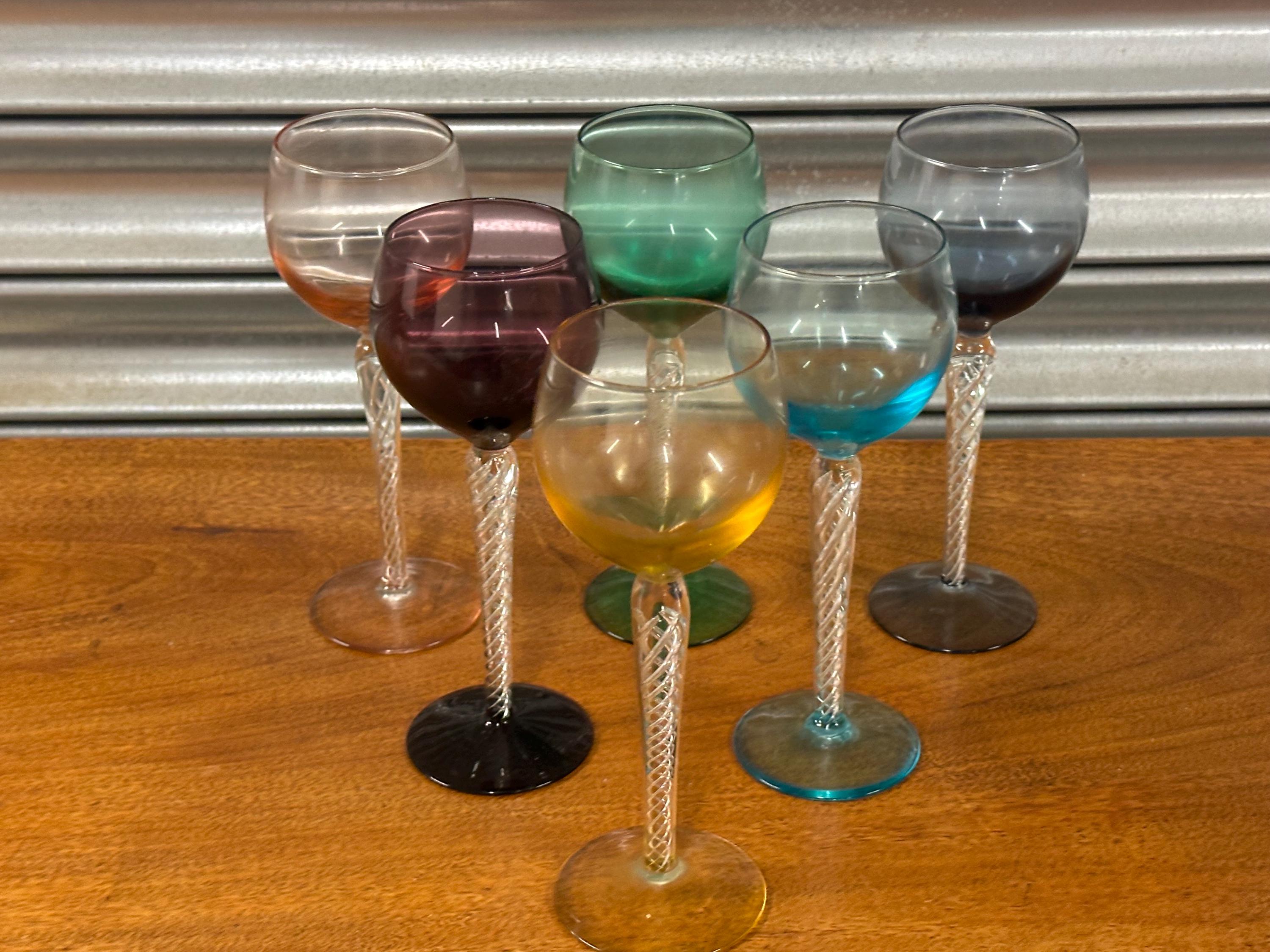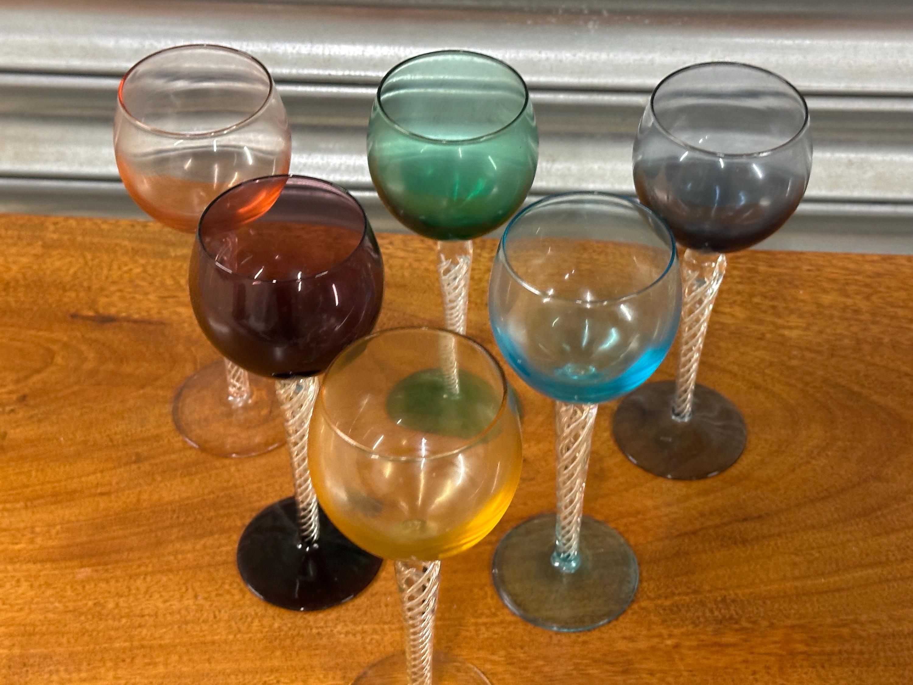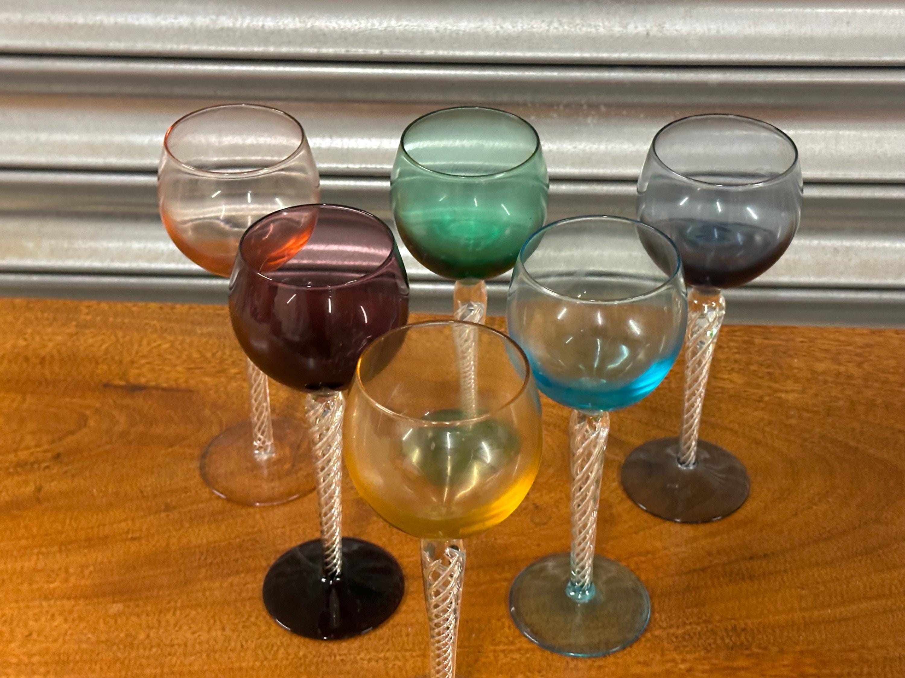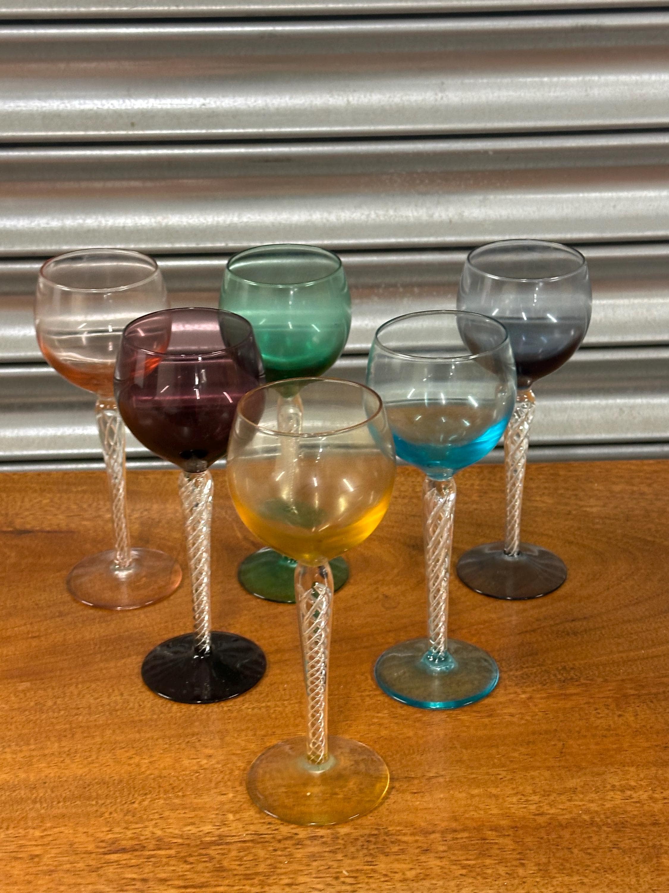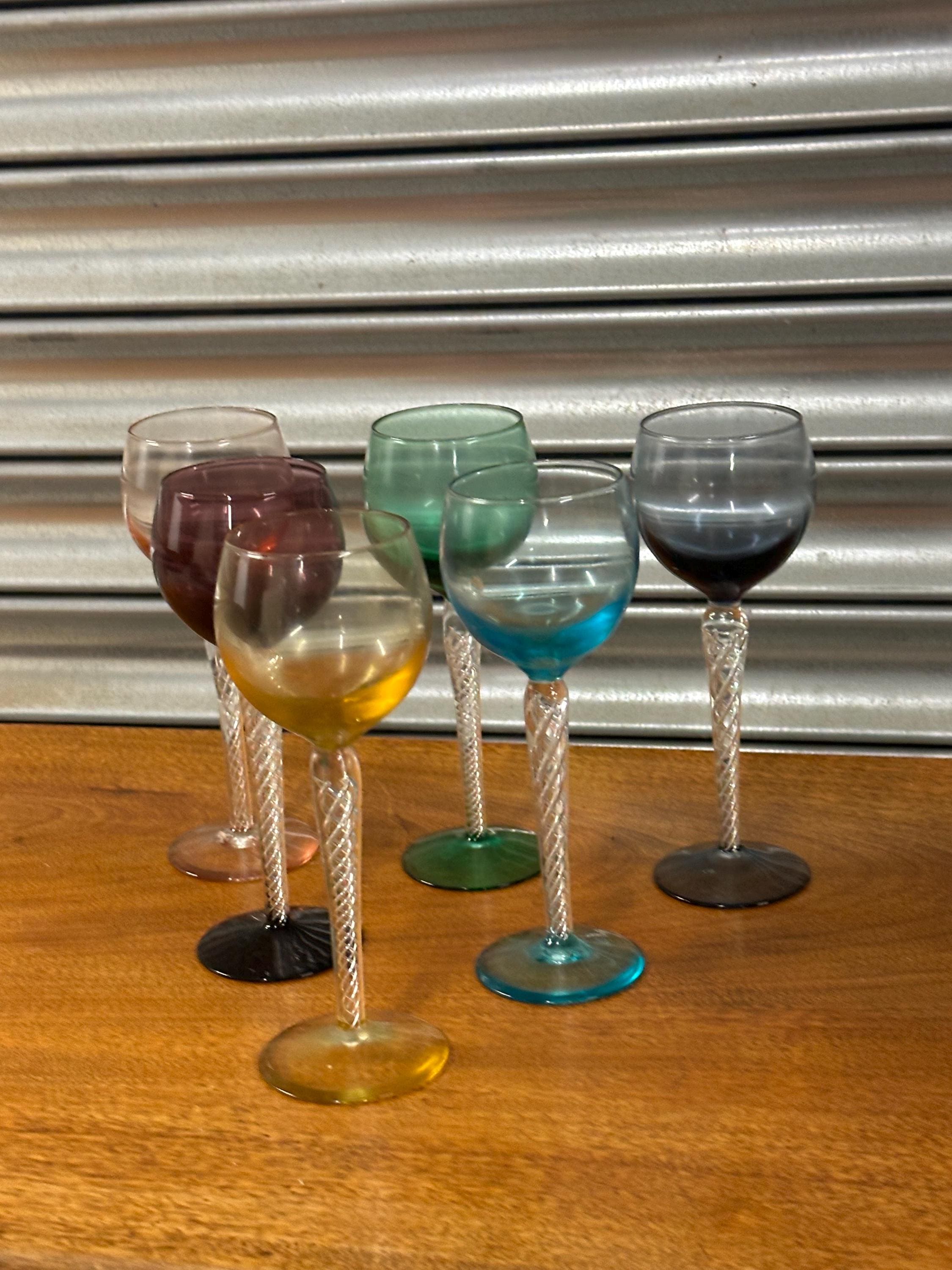 Six Vintage Coloured Air Twist Stem Coloured Crystal Hock Glasses