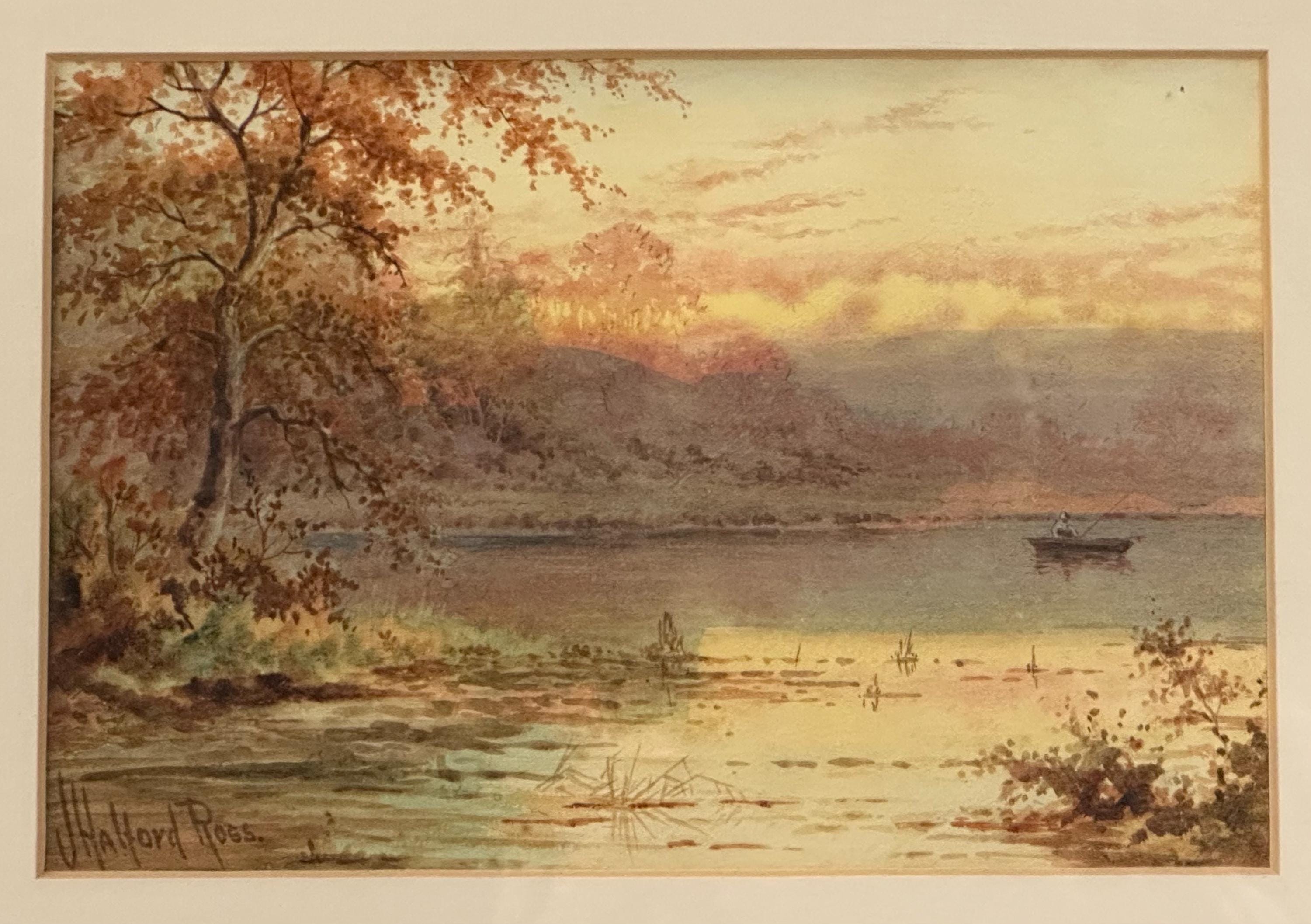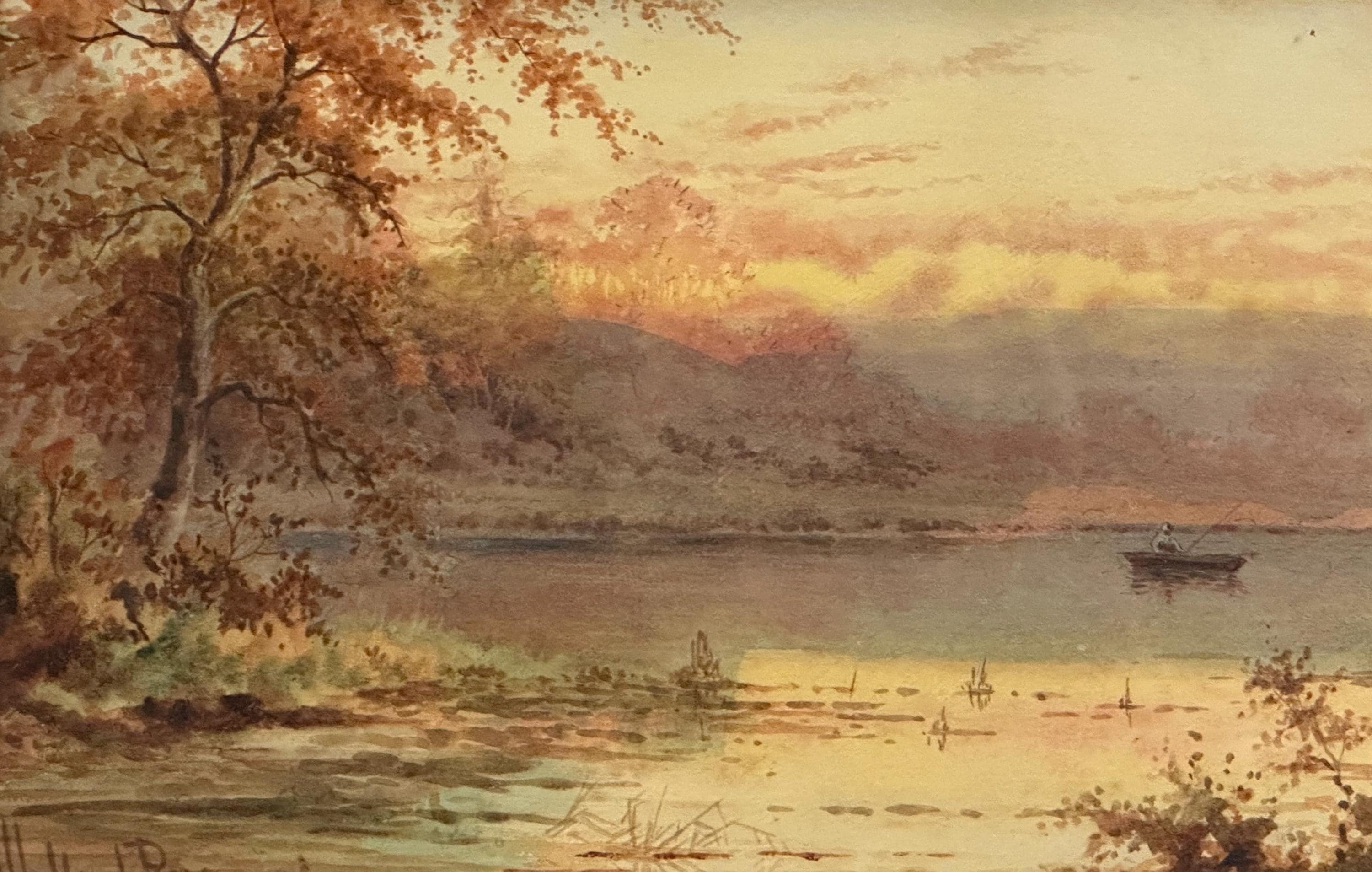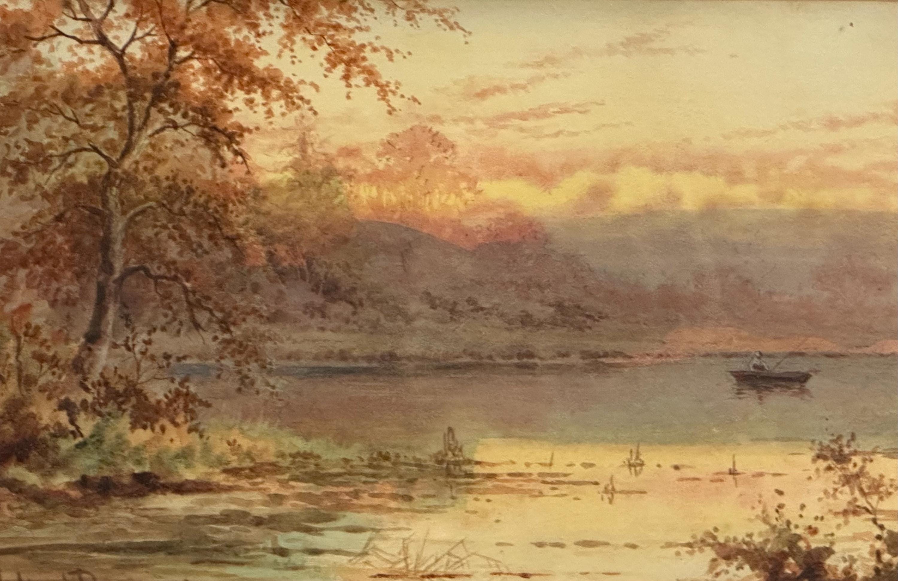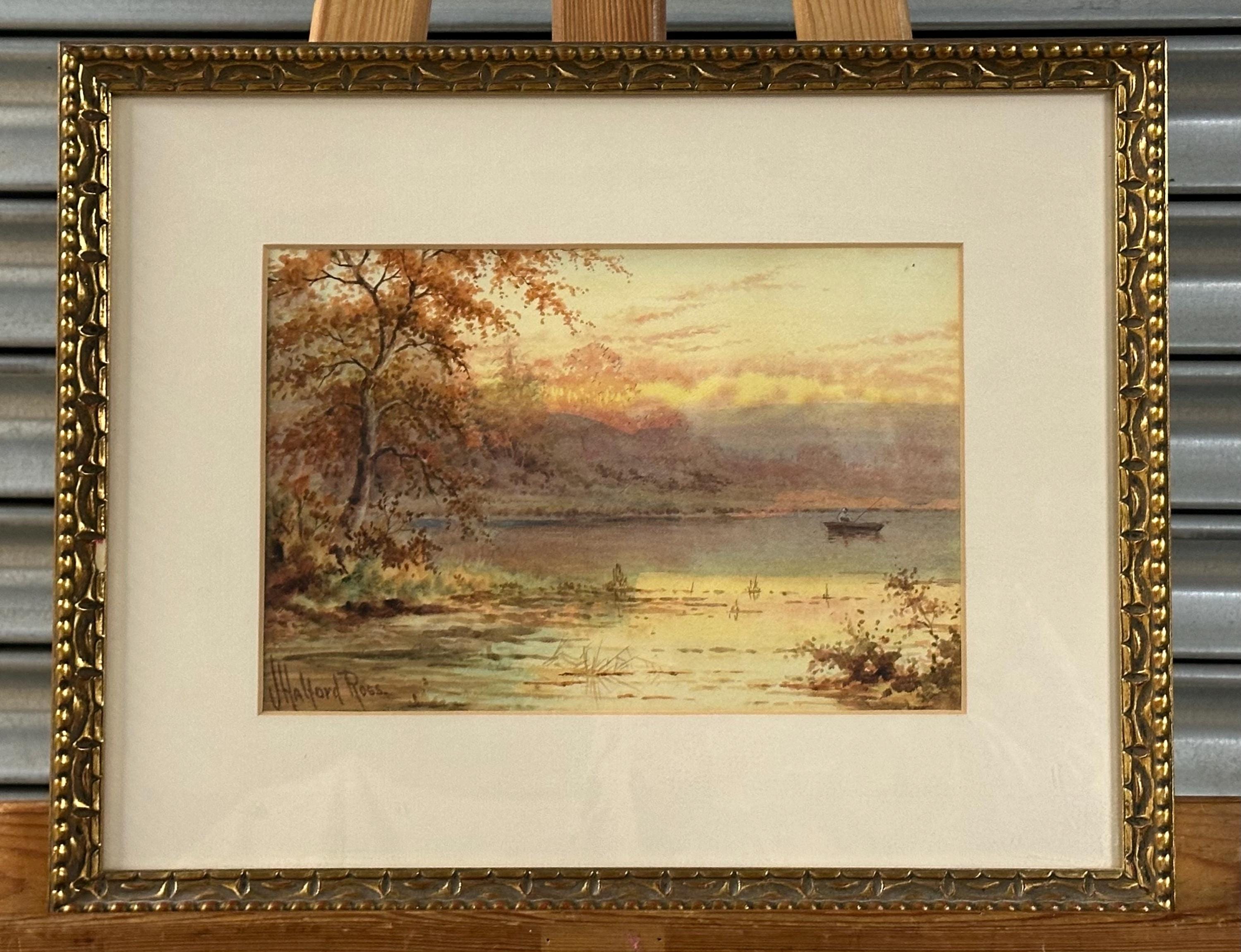 A charming original 19th century watercolour by the listed British artist Joseph Halford Ross (1827–1883). The painting captures a tranquil lakeside scene at sunset, with a soft golden sky reflecting across the water, a man fishing in a boat in the distance, and rich autumnal trees in the foreground. Ross was well known for his detailed landscapes and romantic views of the English and Welsh countryside, and this is a fine example of his work.