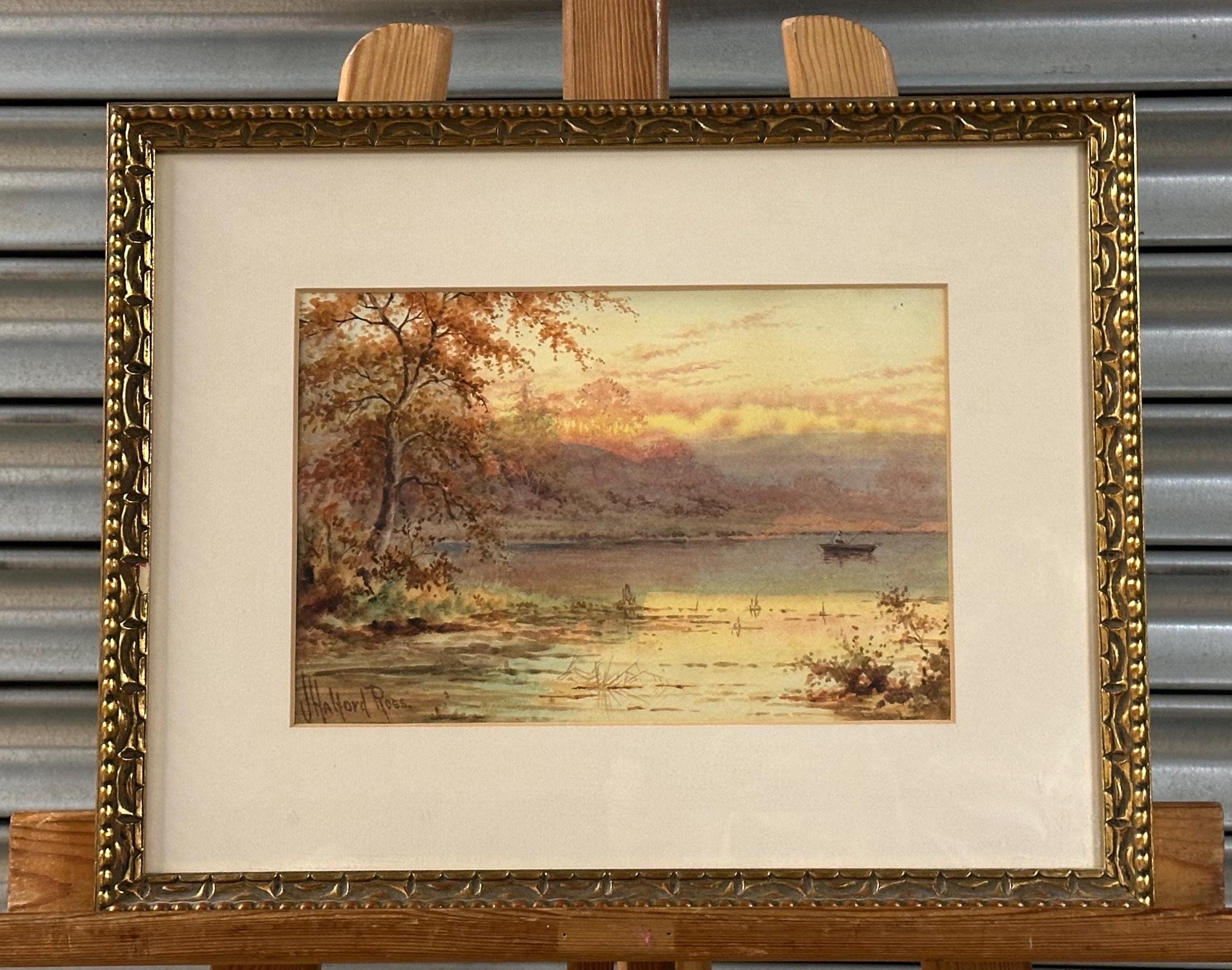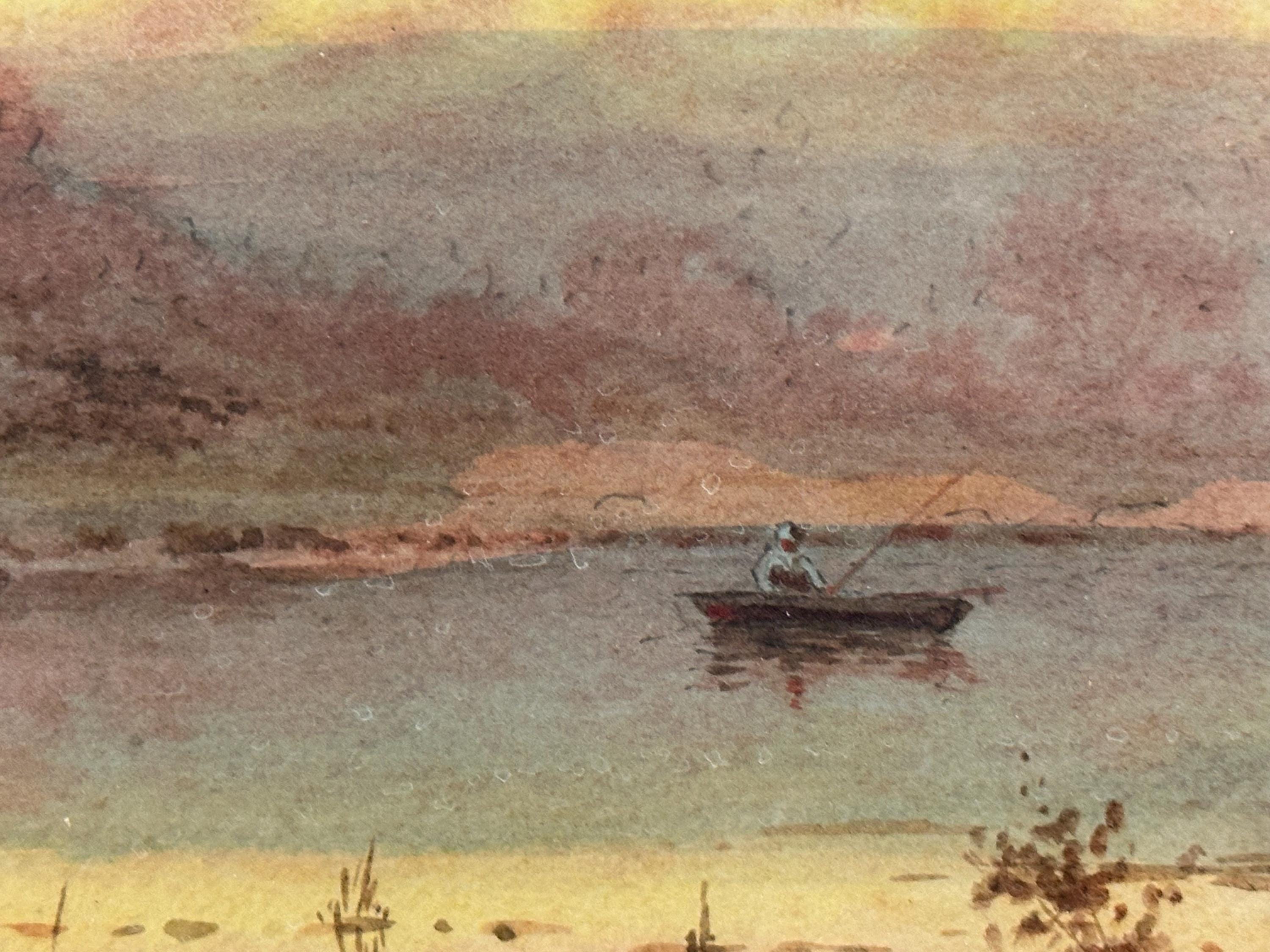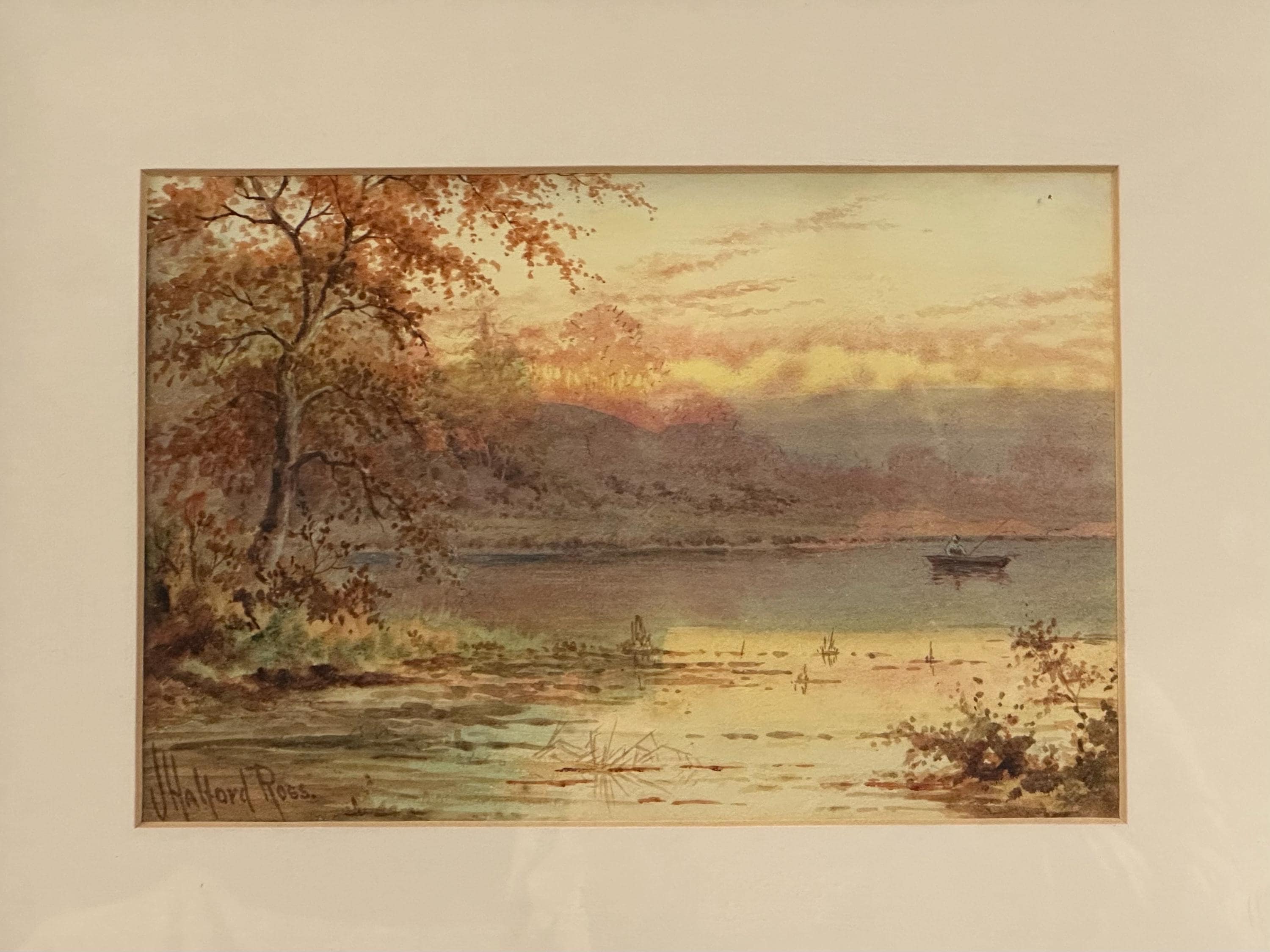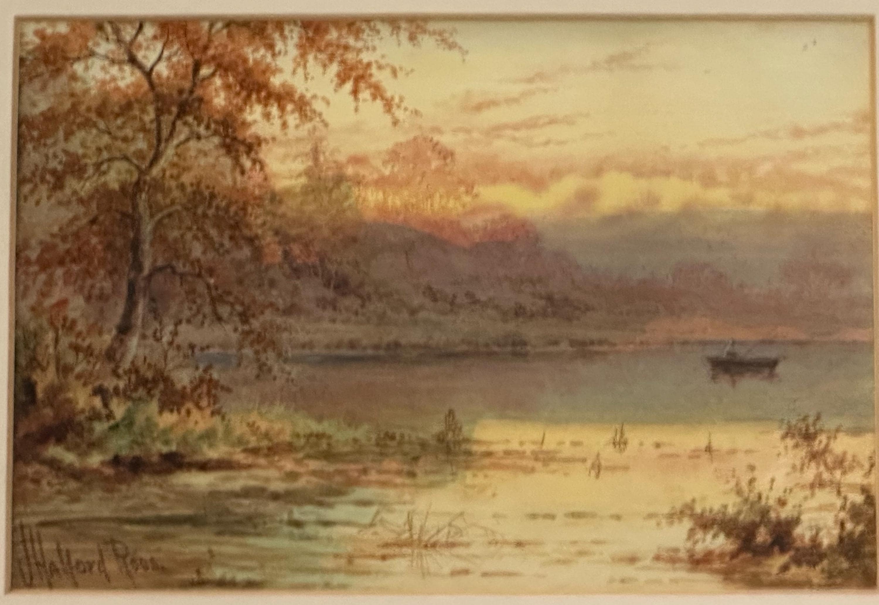 A charming original 19th century watercolour by the listed British artist Joseph Halford Ross (1827–1883). The painting captures a tranquil lakeside scene at sunset, with a soft golden sky reflecting across the water, a man fishing in a boat in the distance, and rich autumnal trees in the foreground. Ross was well known for his detailed landscapes and romantic views of the English and Welsh countryside, and this is a fine example of his work.