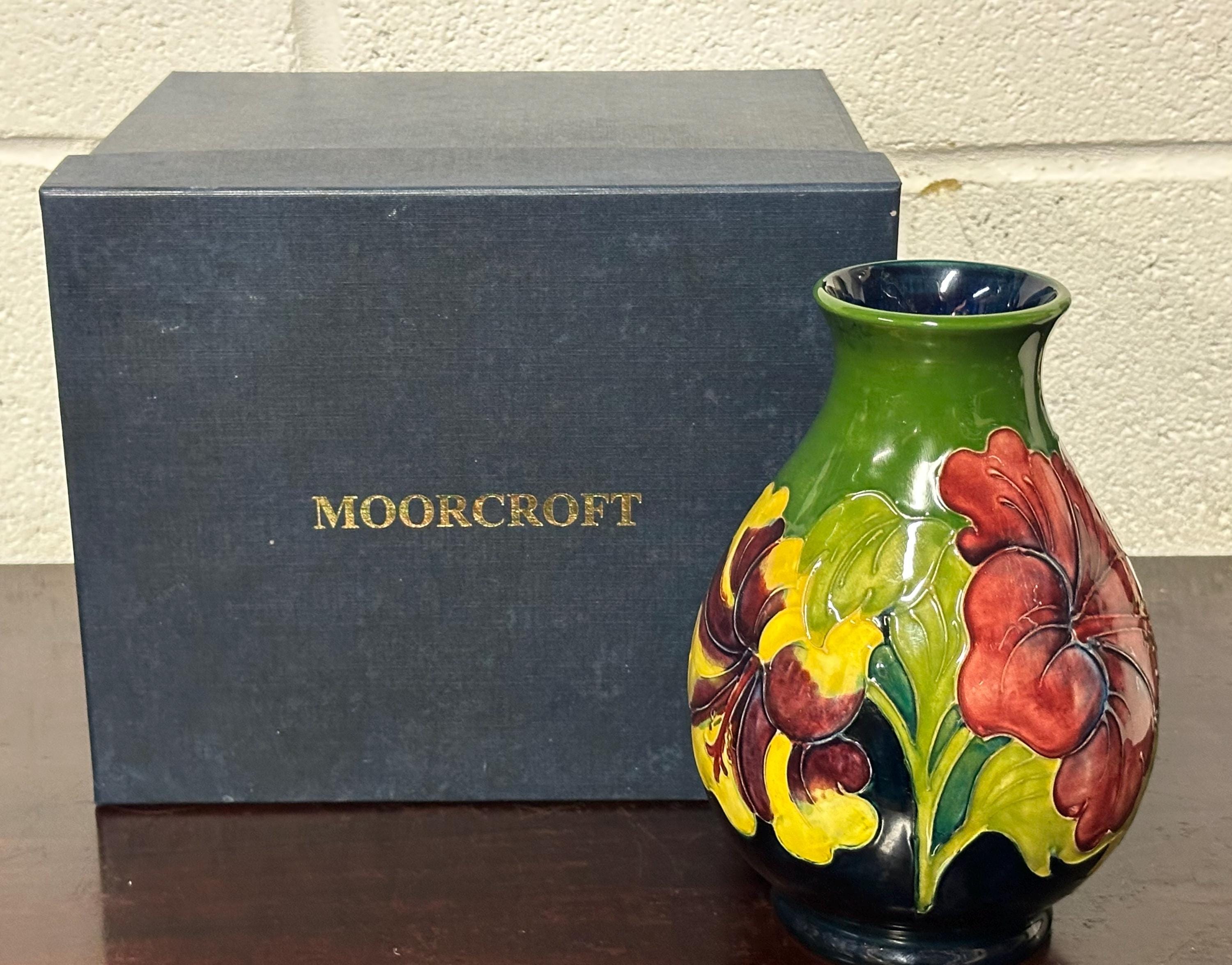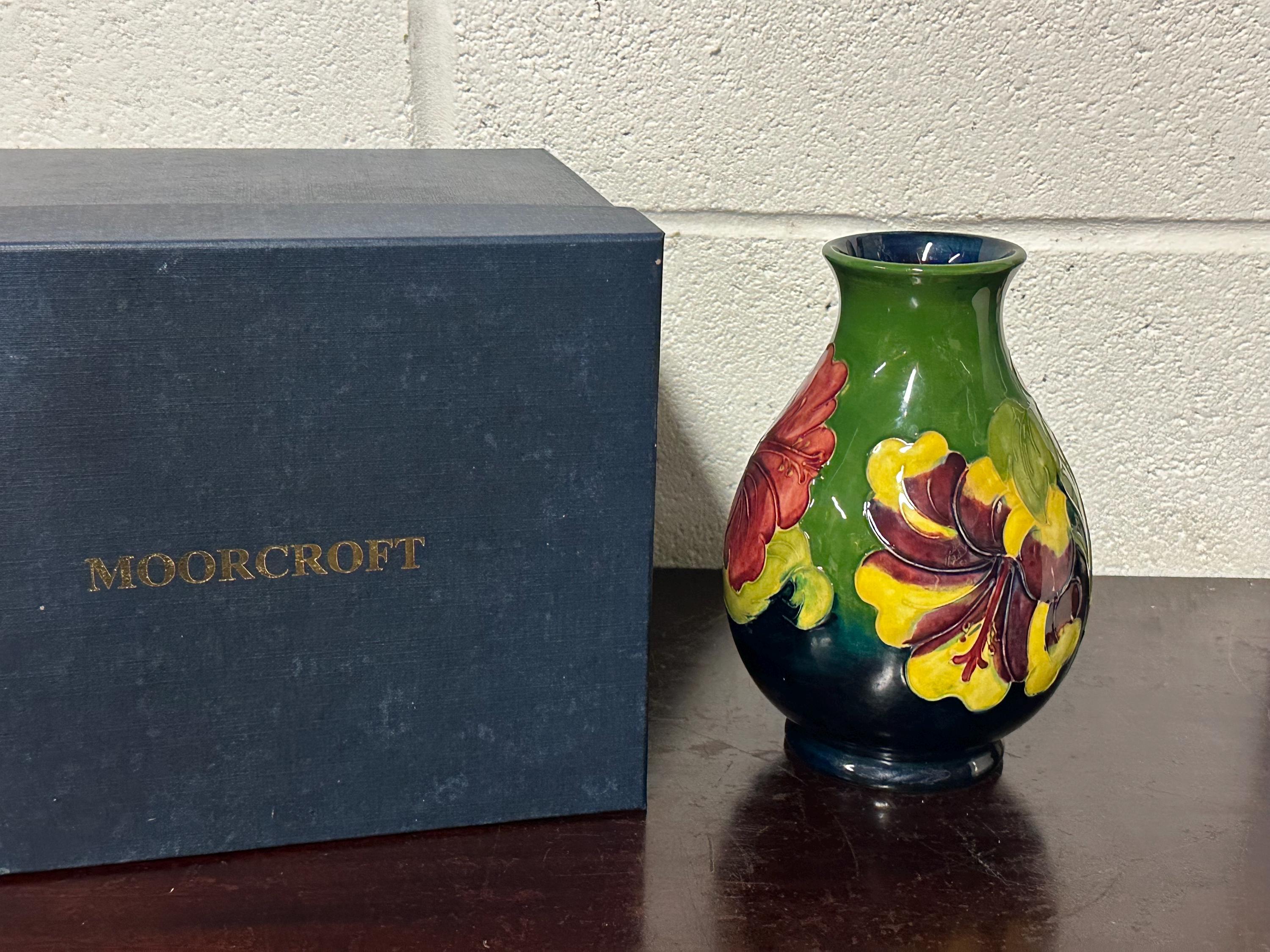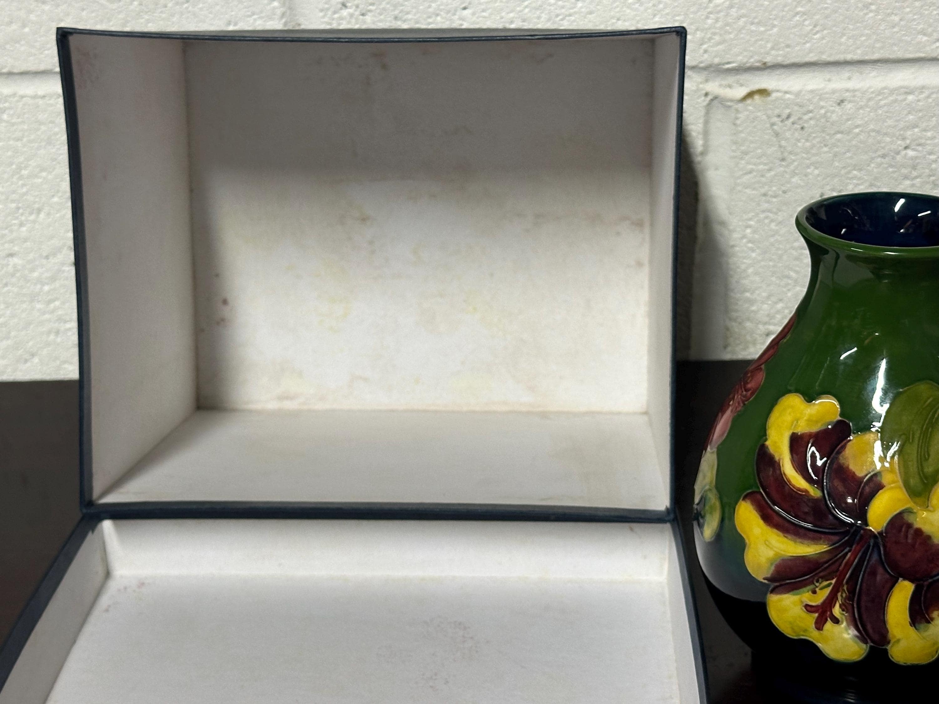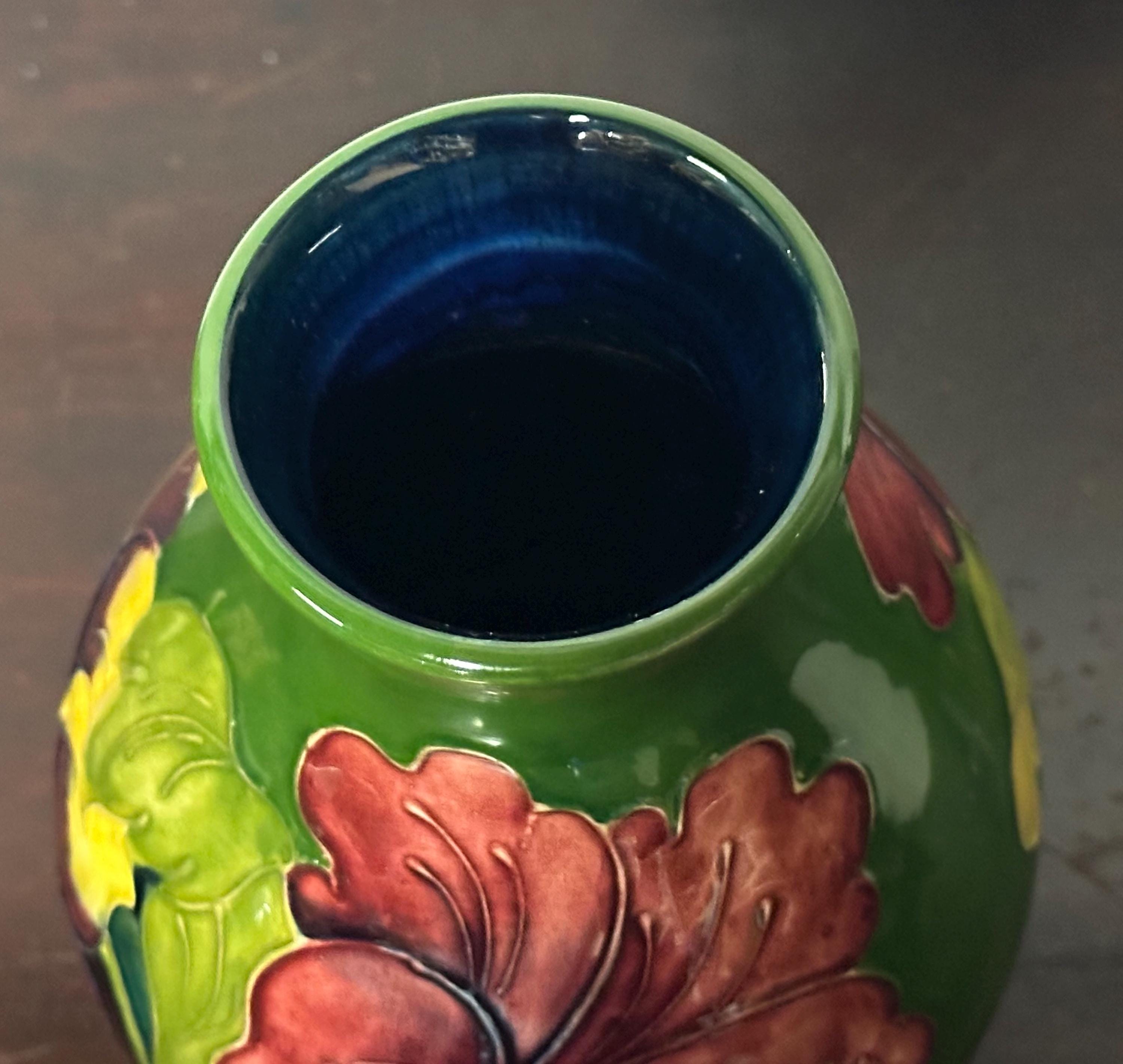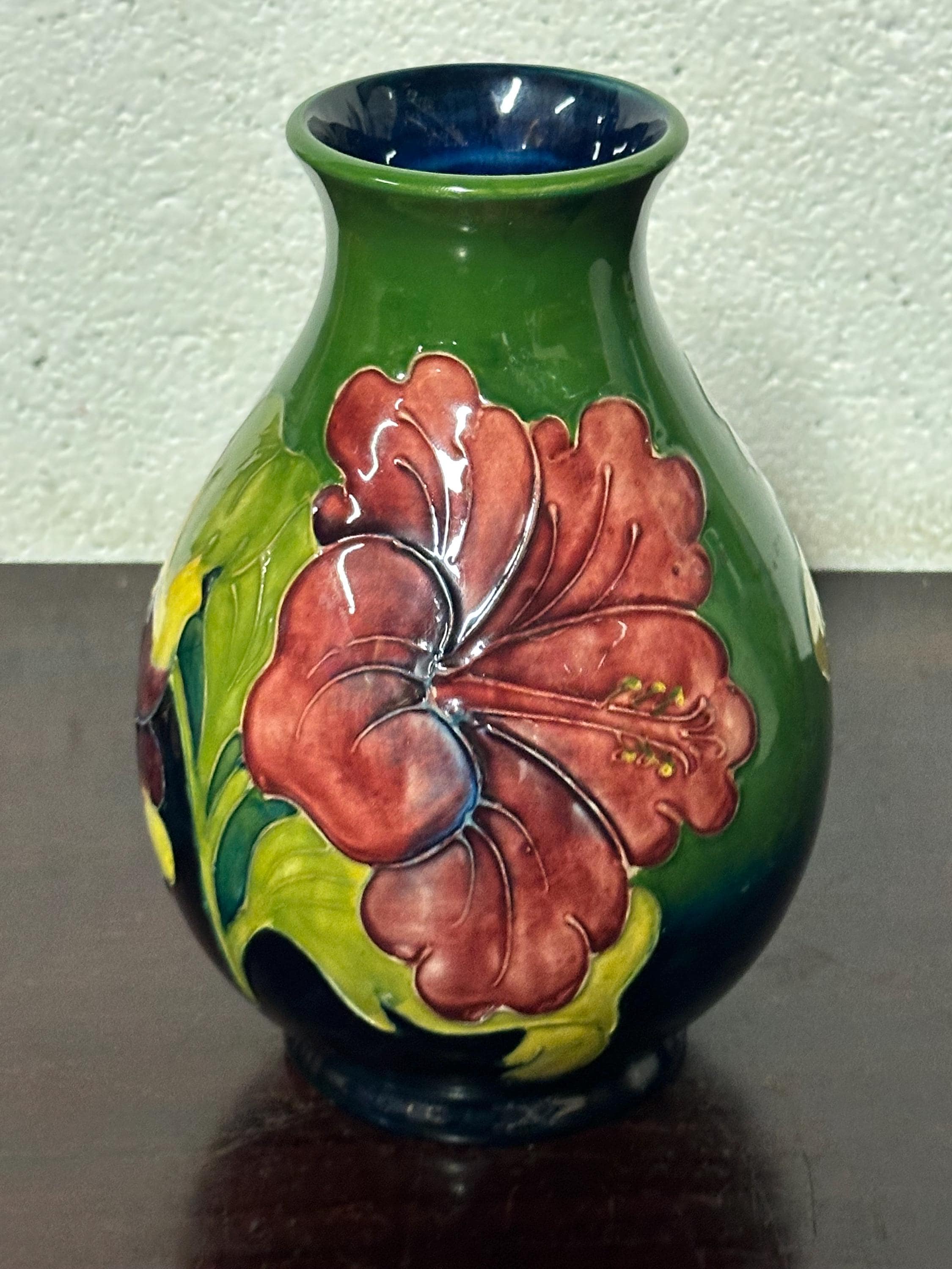 Moorcroft Coral Hibiscus Pattern Vase With Green Background, Signed To Base with Moorcroft Presentation Box