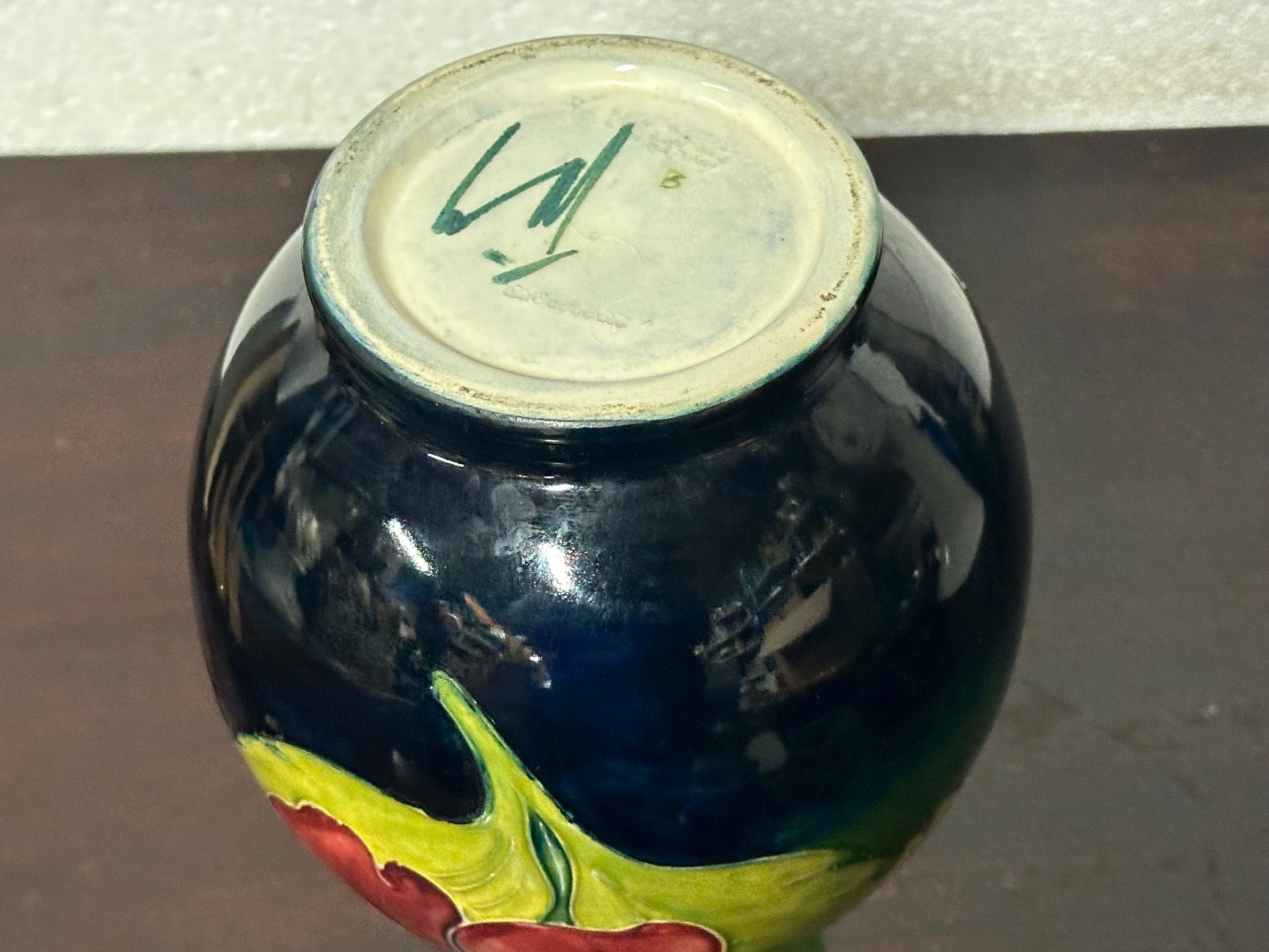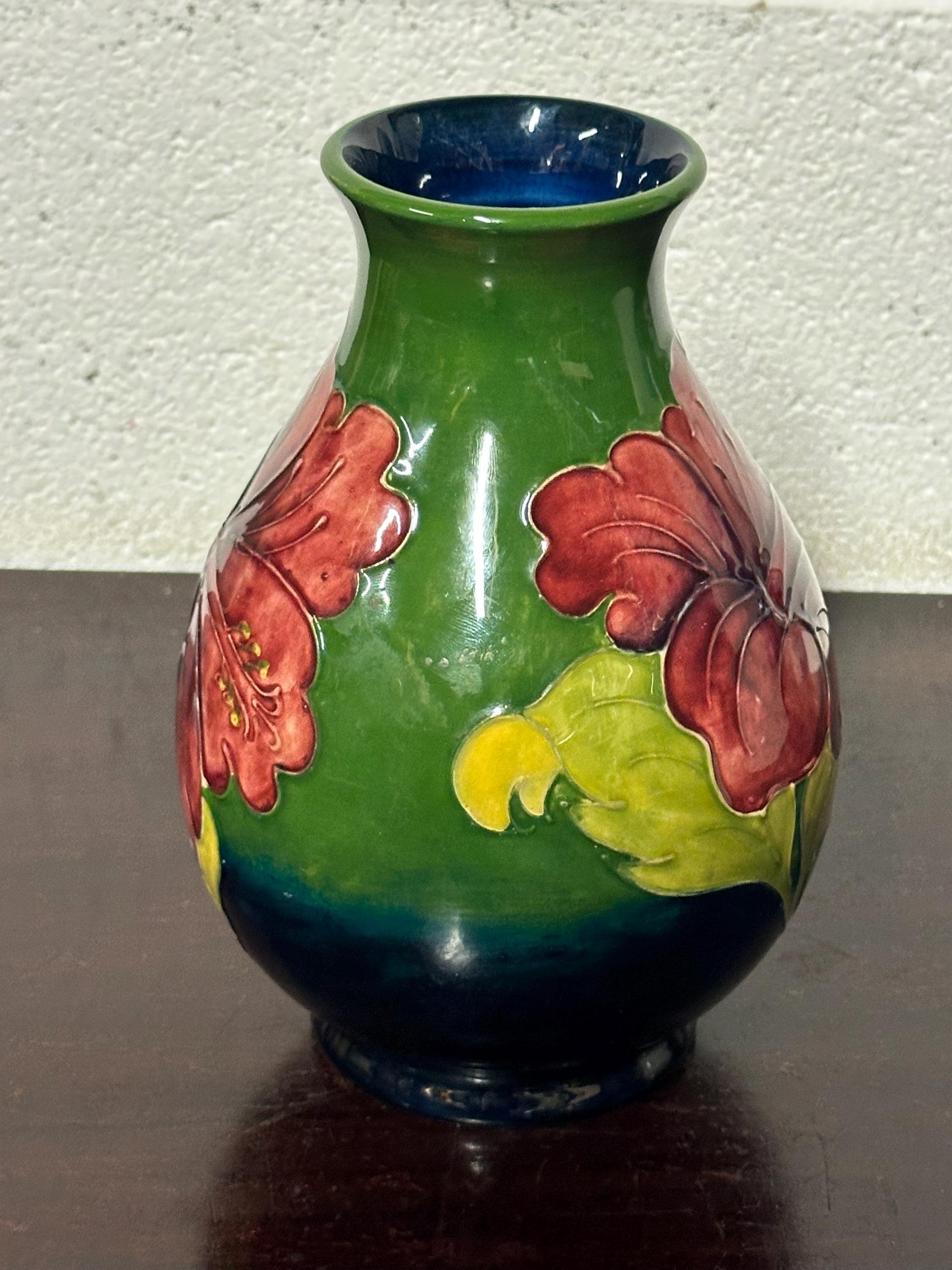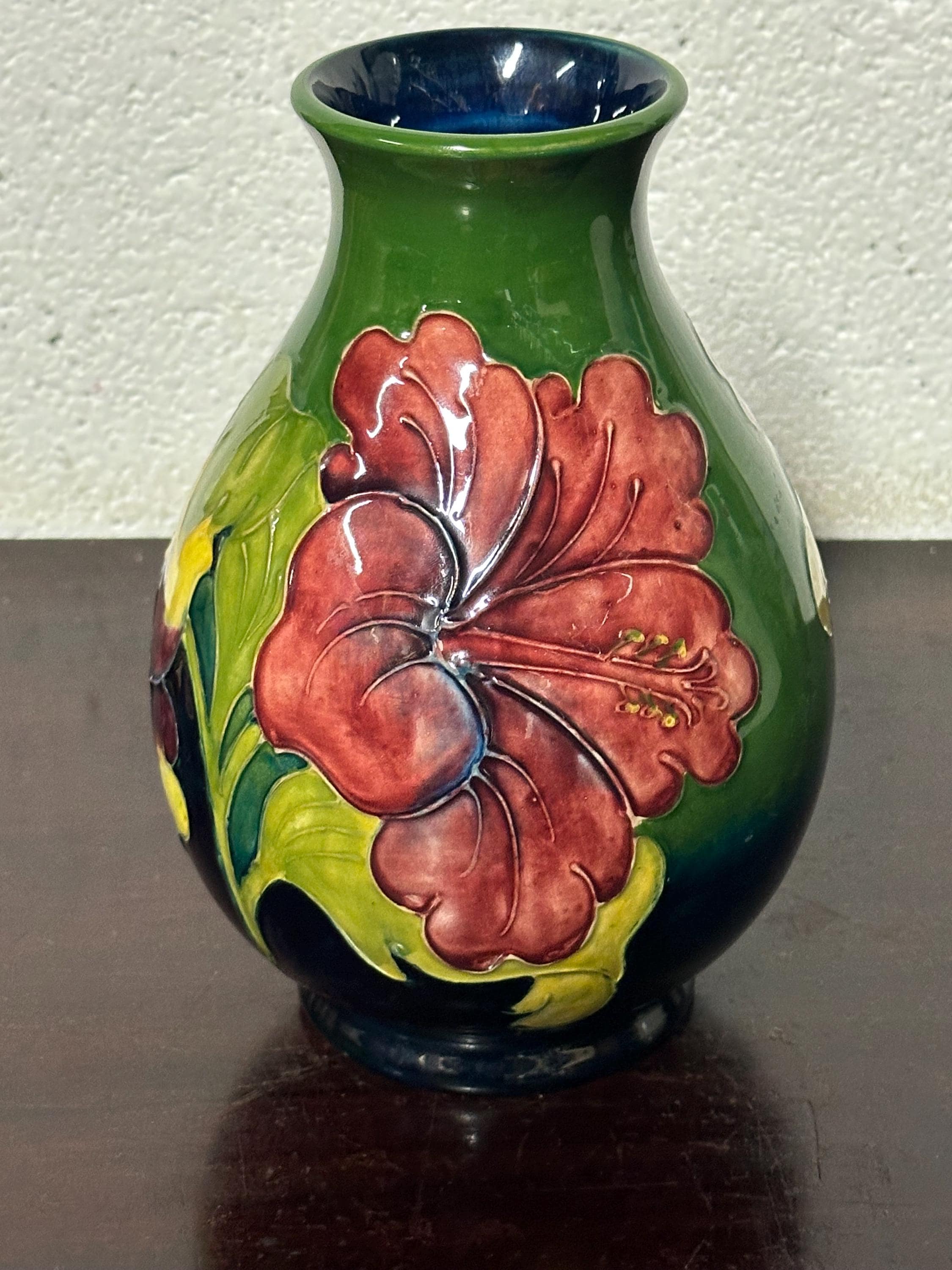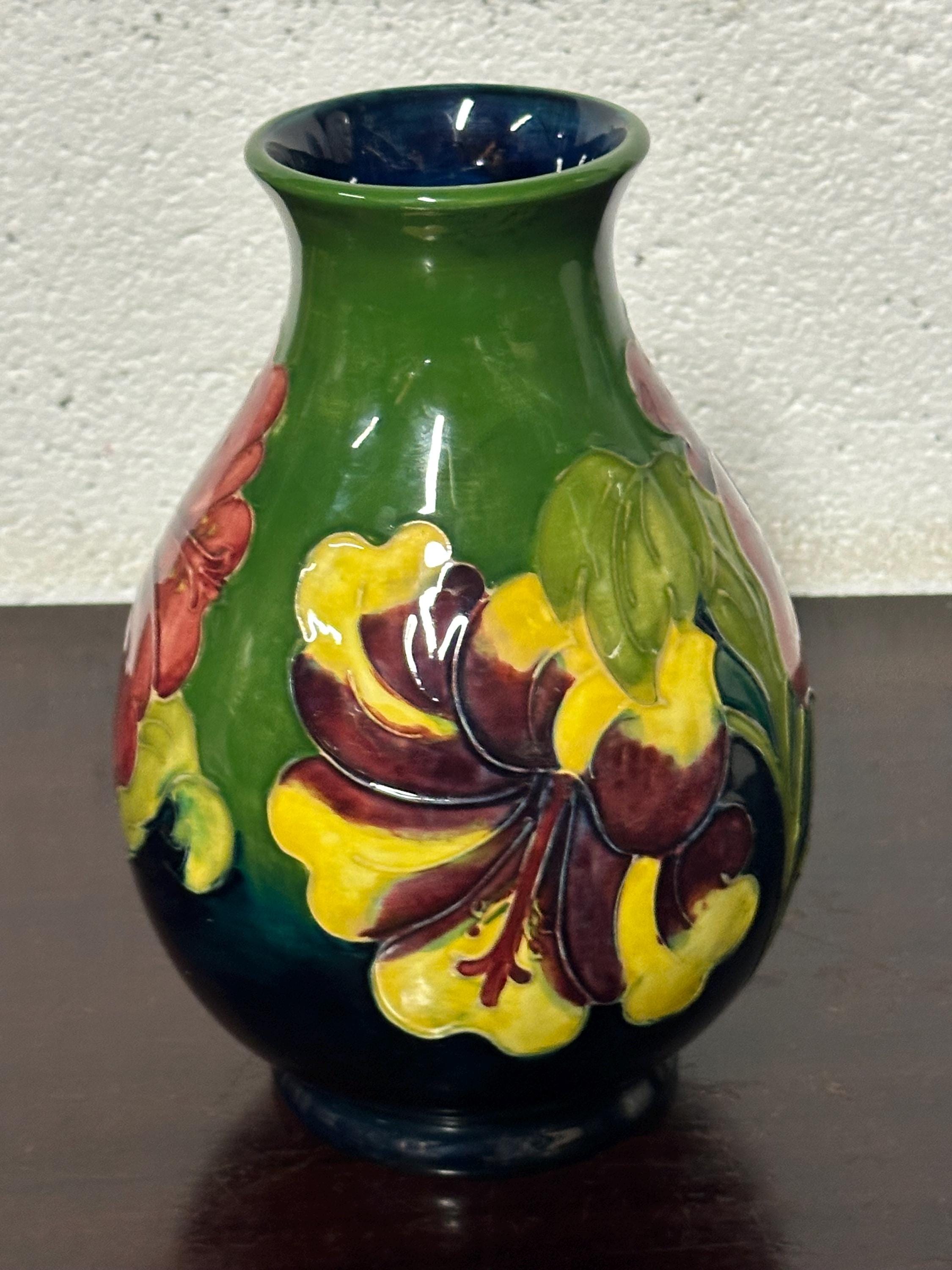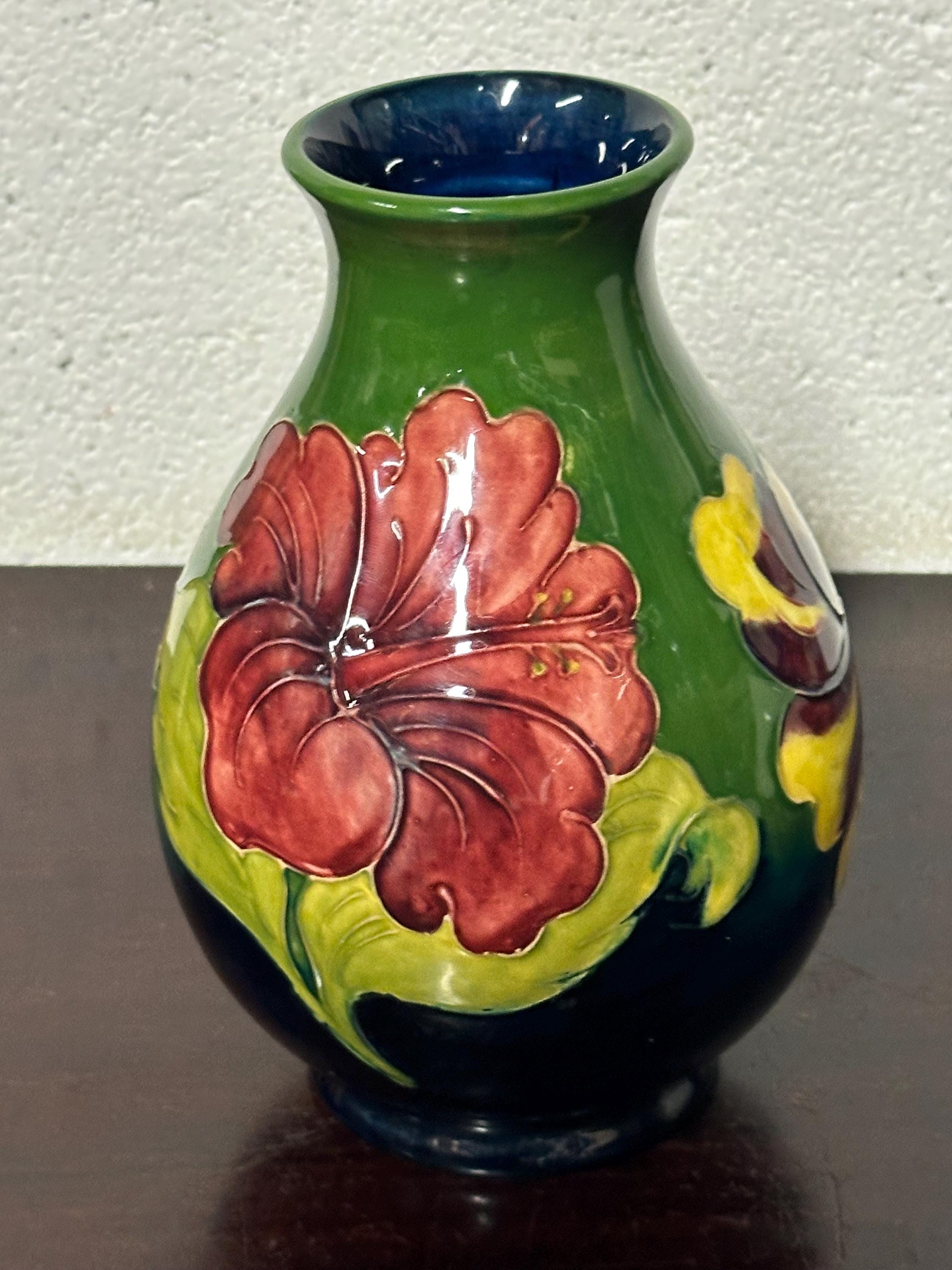 Moorcroft Coral Hibiscus Pattern Vase With Green Background, Signed To Base with Moorcroft Presentation Box