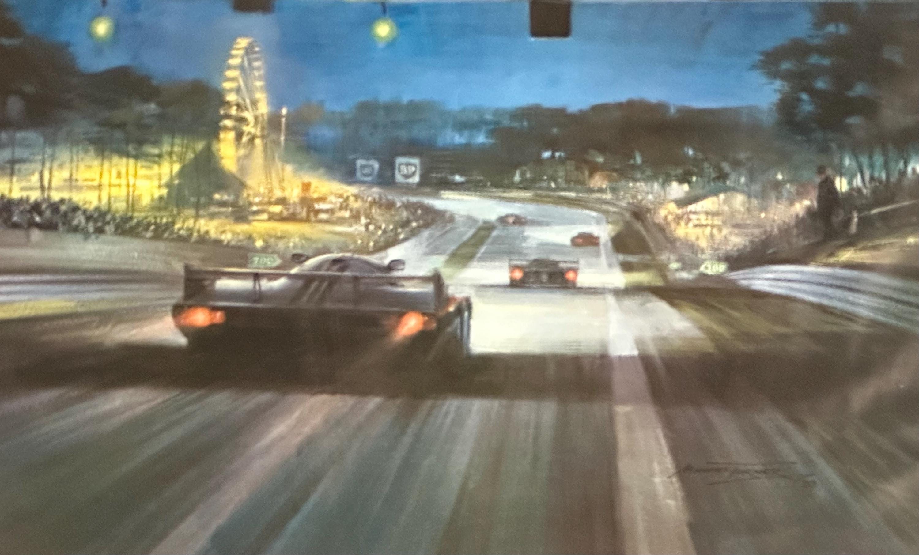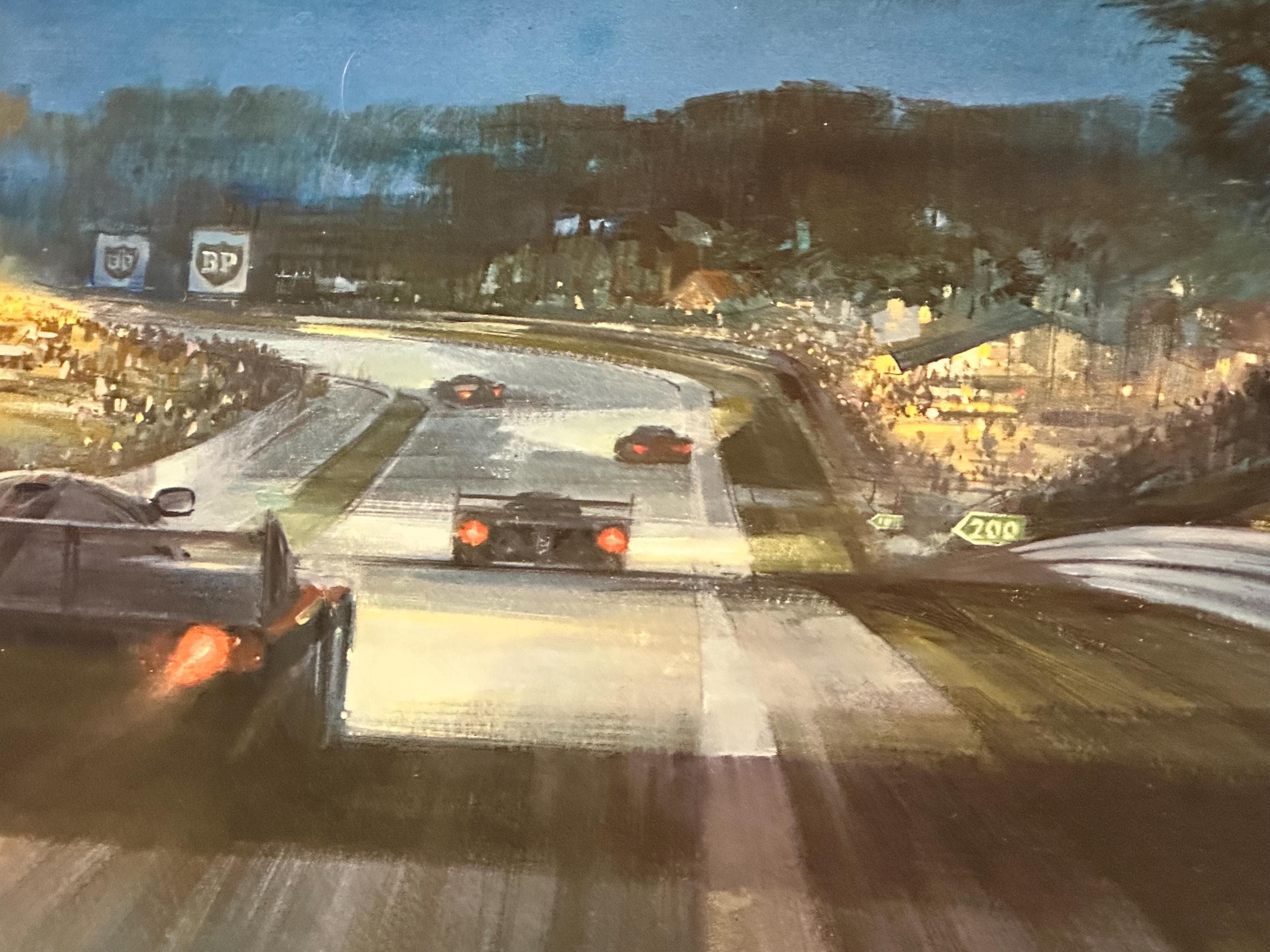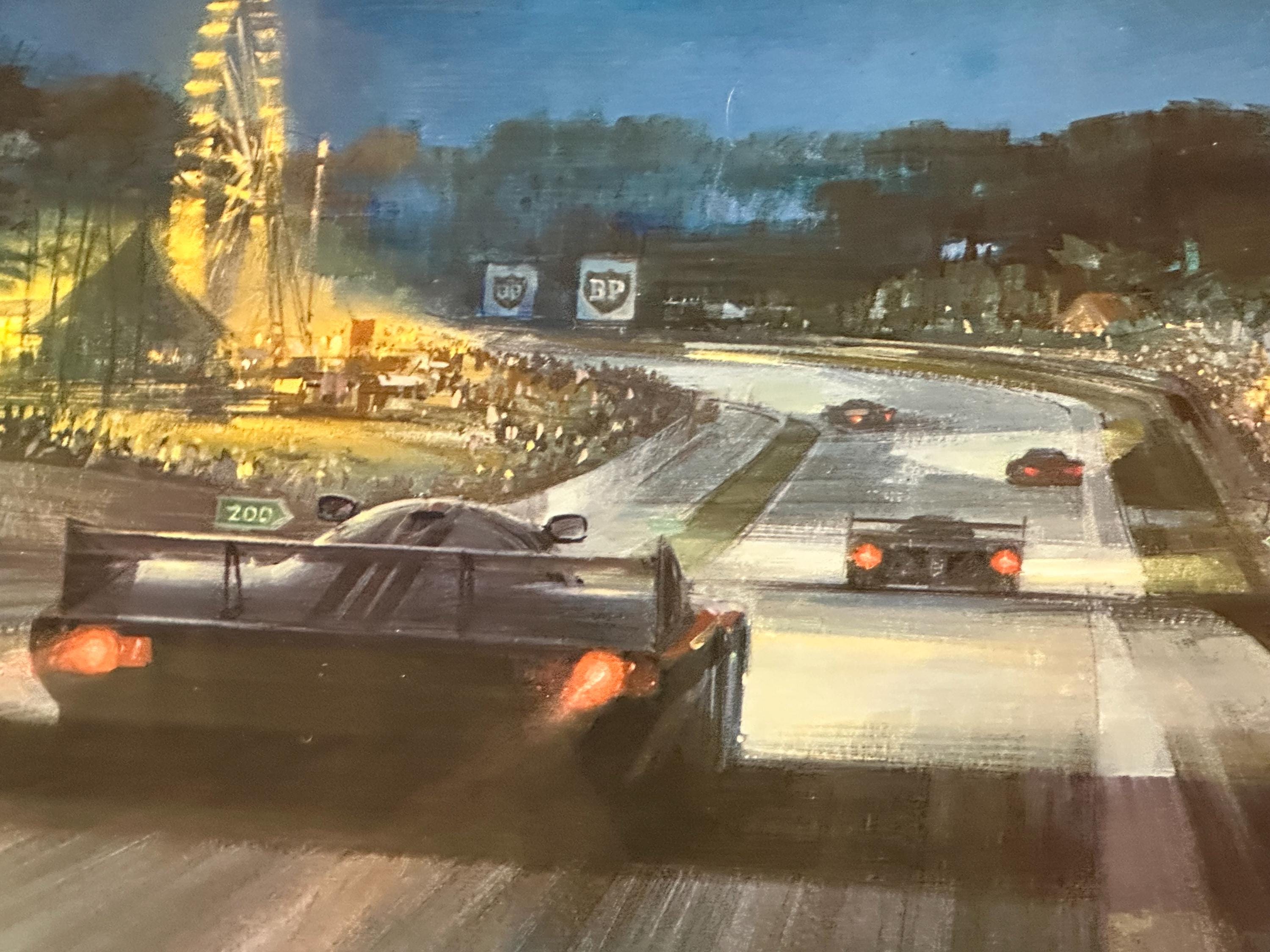 This night scene at LeMans captures the atmosphere of one of the world's great sporting events. A Rothmans Porsche 956 crests the hill under the Dunlop bridge.