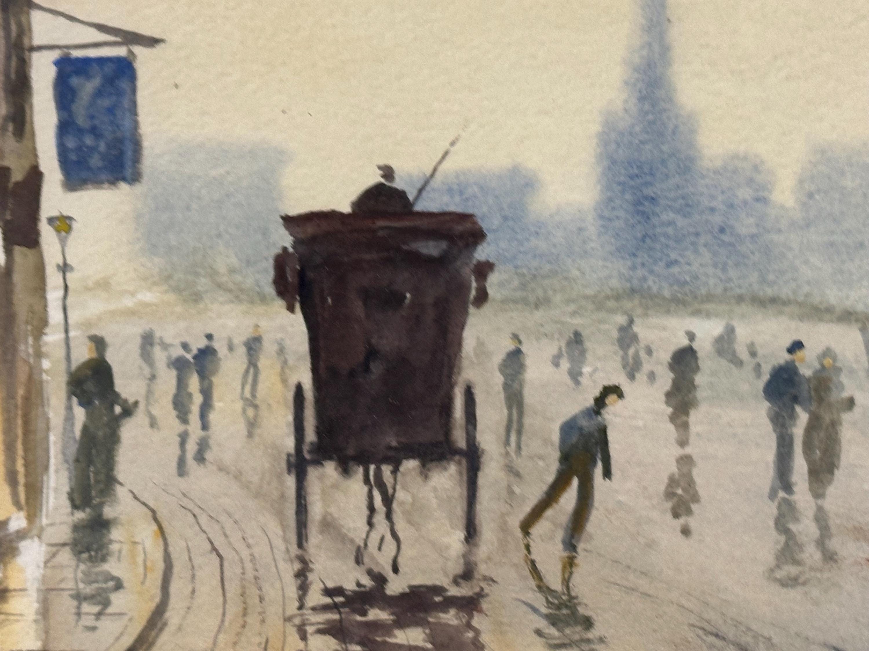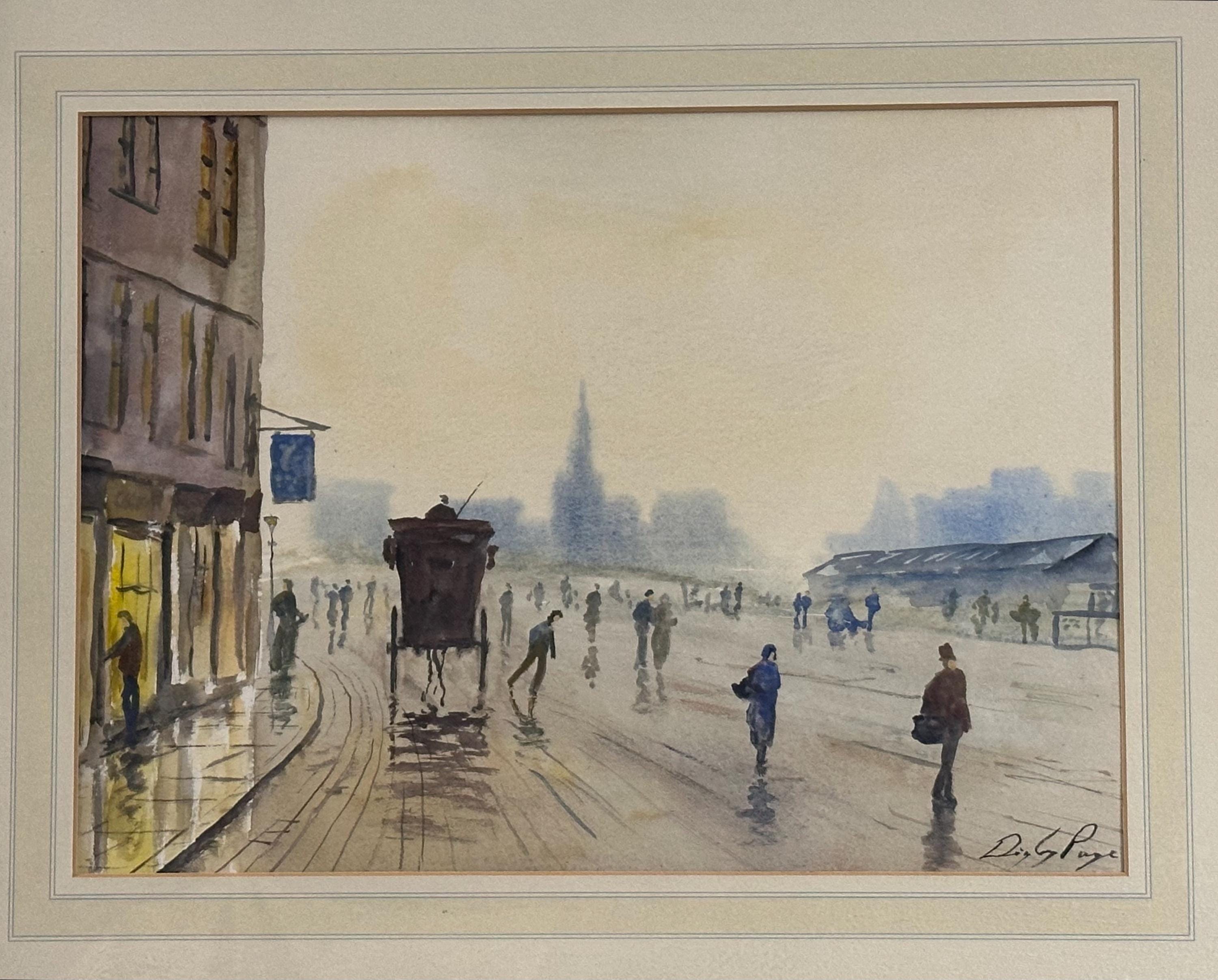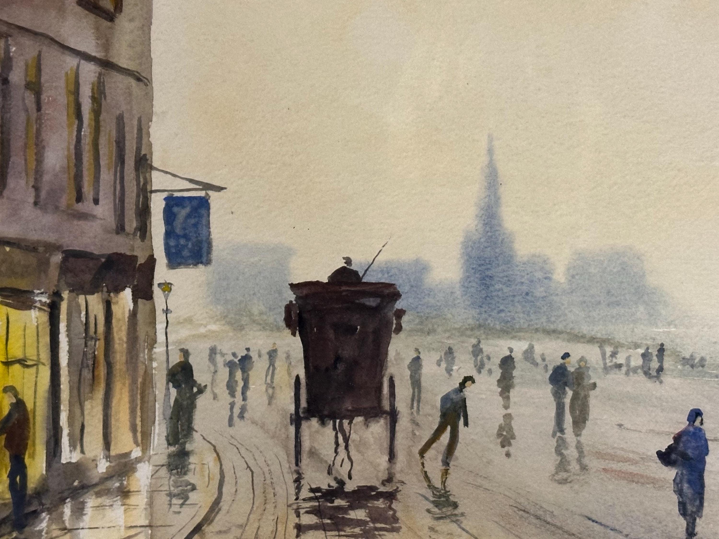 This is a lovely atmospheric street scene watercolor — it depicts a misty urban view with figures walking along a wet street, a horse-drawn carriage, and buildings fading into the distance. Unfortunately, there aren’t any distinct landmarks that clearly identify the exact location, but the setting and style suggest it could be an early 20th-century European city scene — possibly somewhere in Britain, given the architecture and subject matter.
