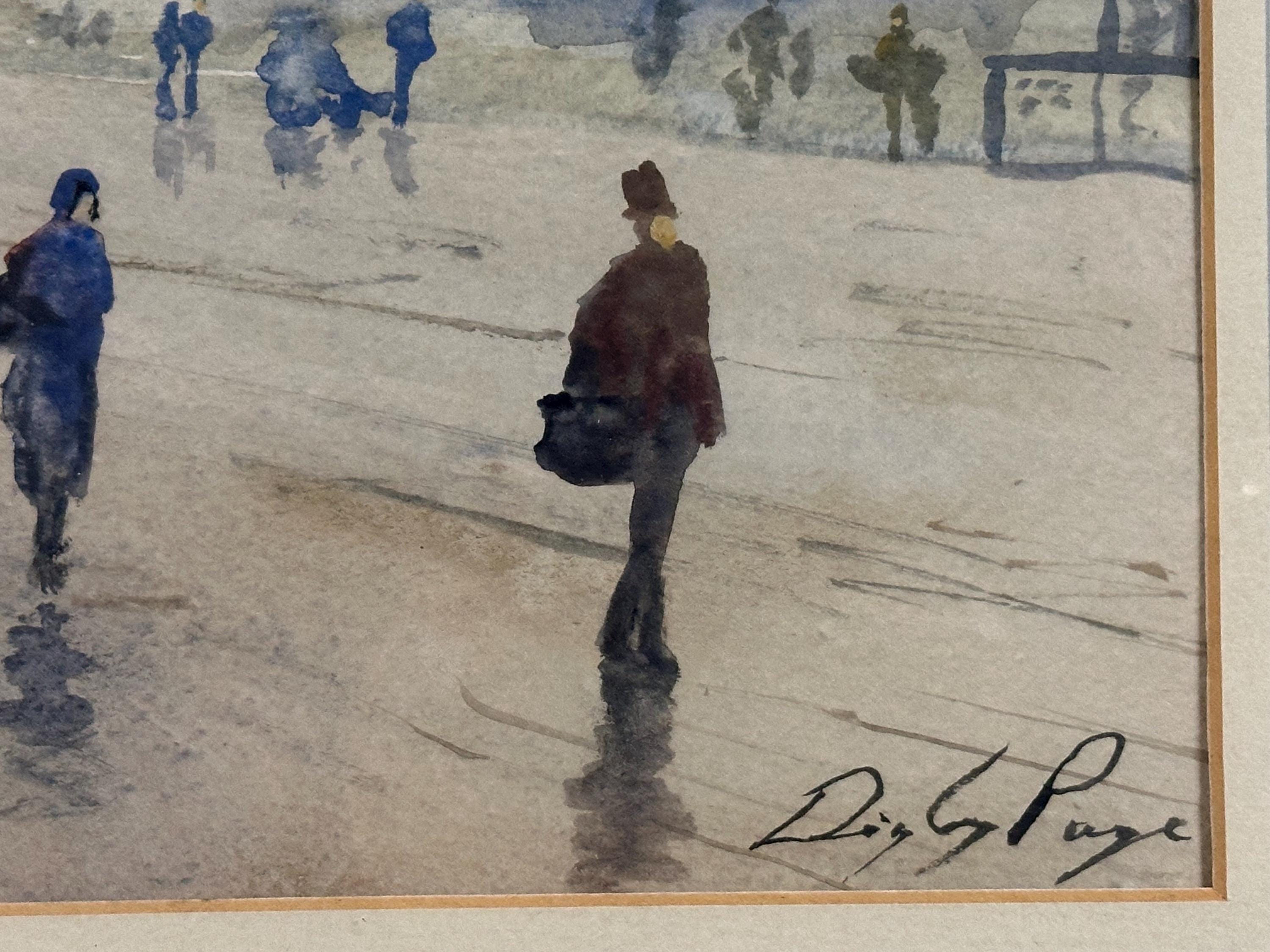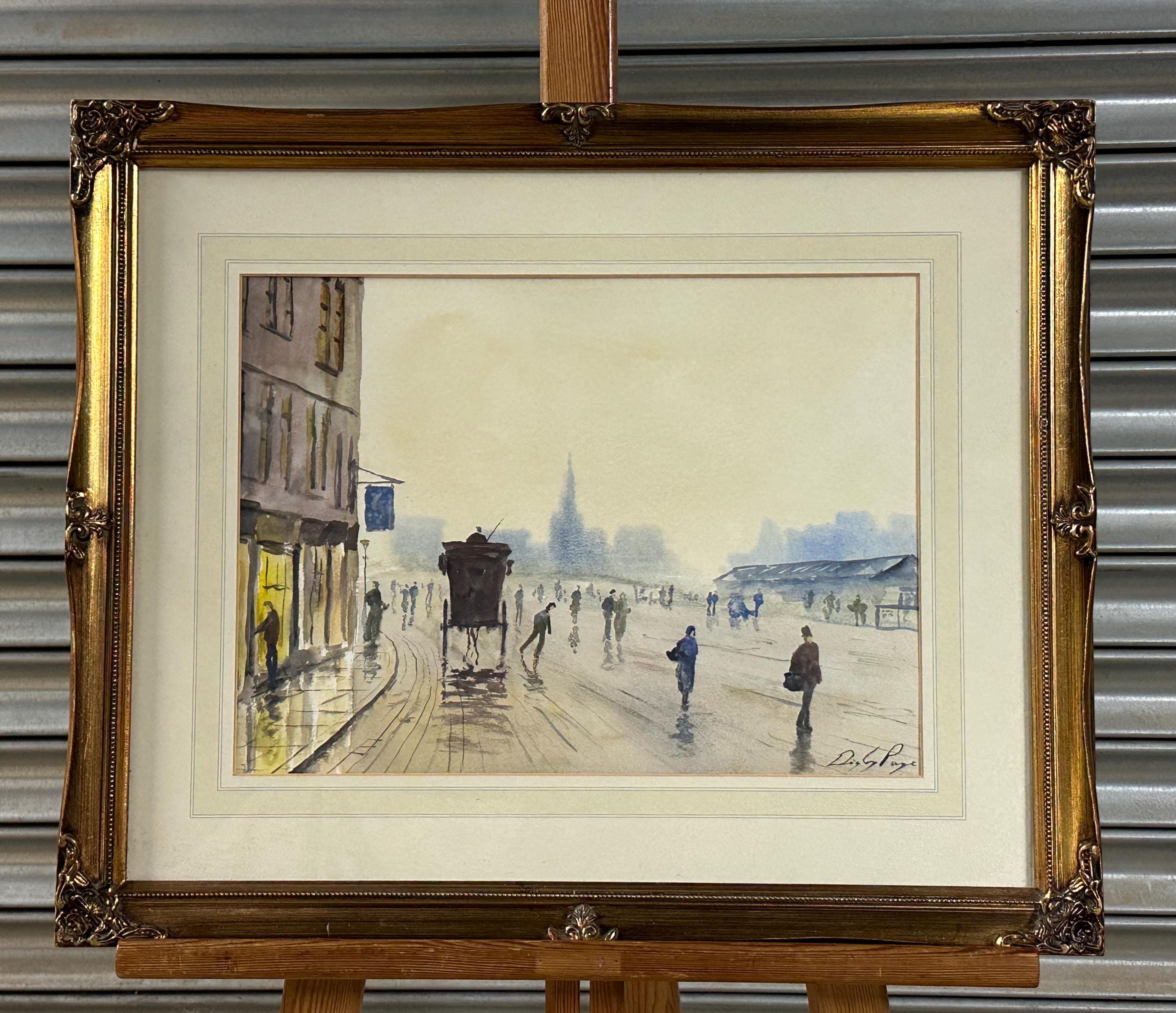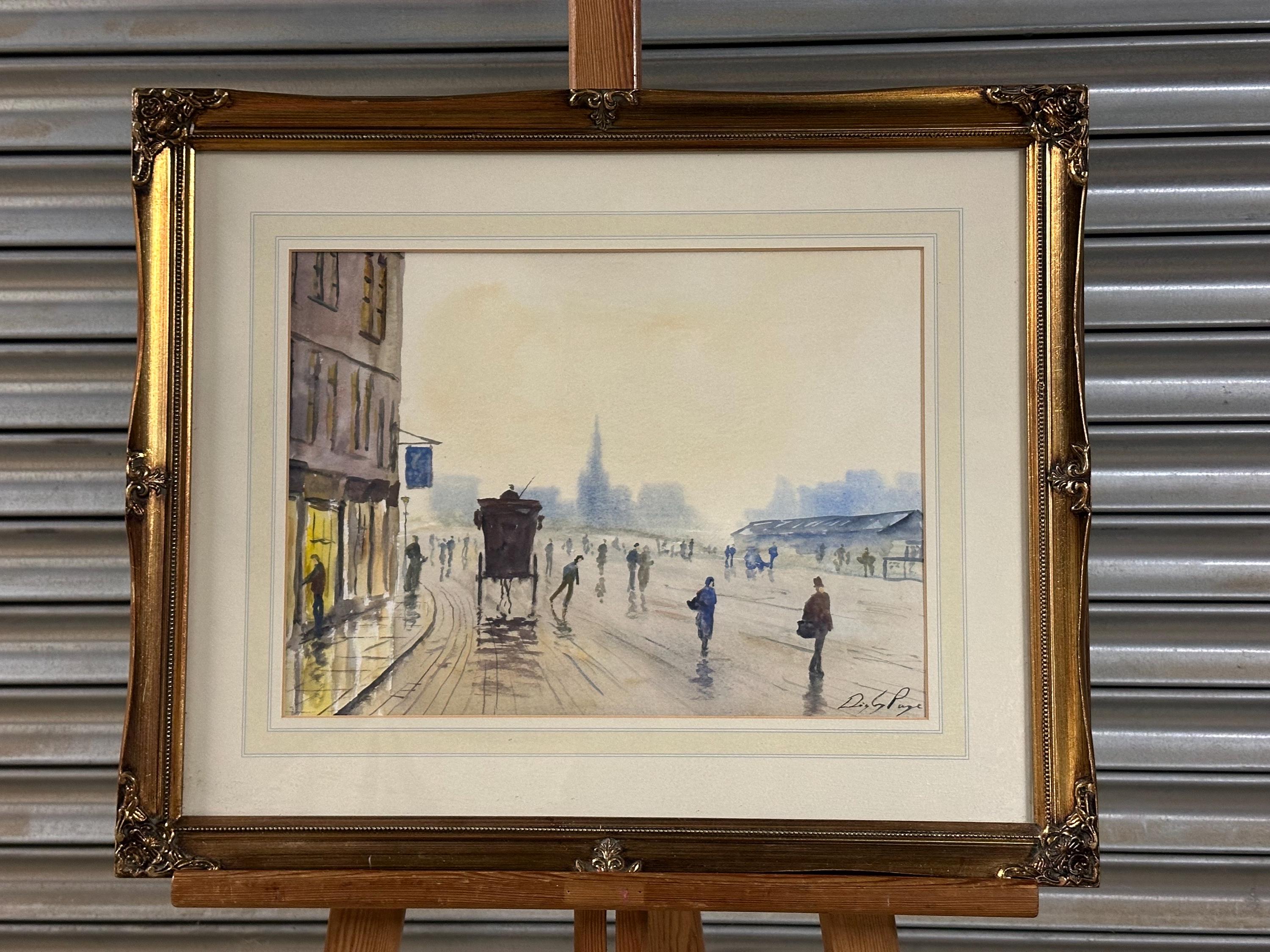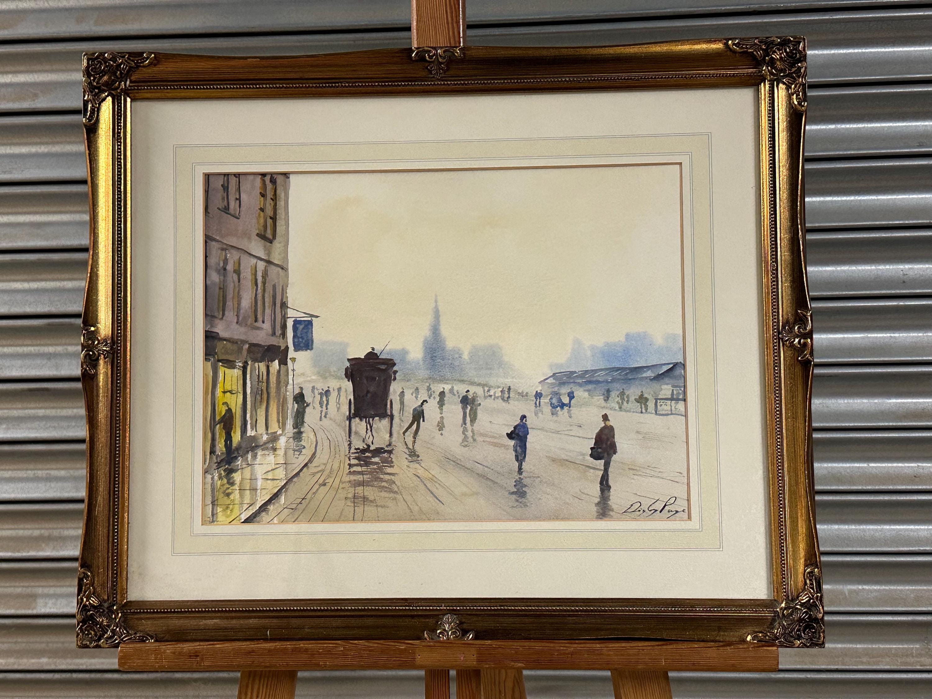 This is a lovely atmospheric street scene watercolor — it depicts a misty urban view with figures walking along a wet street, a horse-drawn carriage, and buildings fading into the distance. Unfortunately, there aren’t any distinct landmarks that clearly identify the exact location, but the setting and style suggest it could be an early 20th-century European city scene — possibly somewhere in Britain, given the architecture and subject matter.