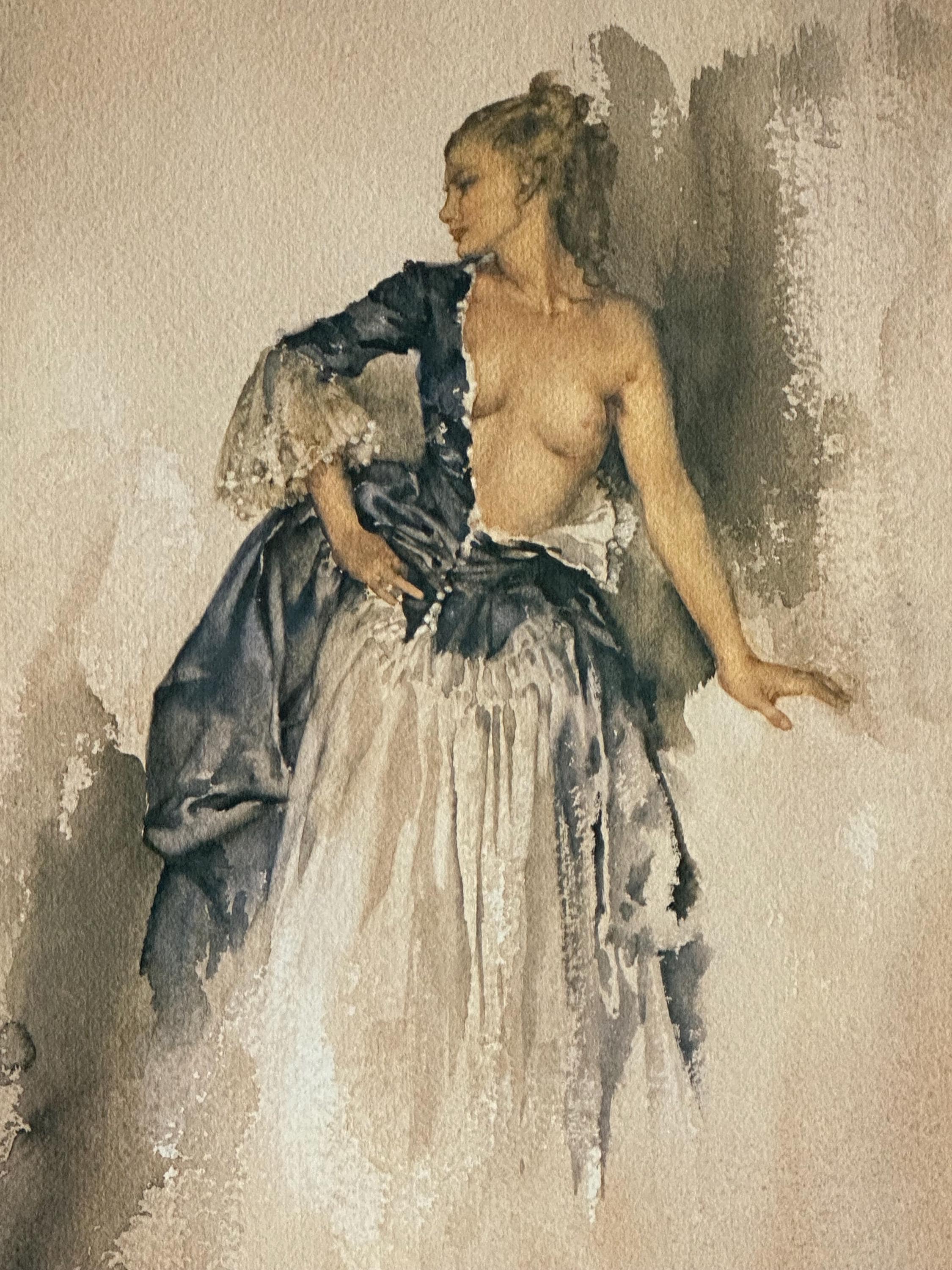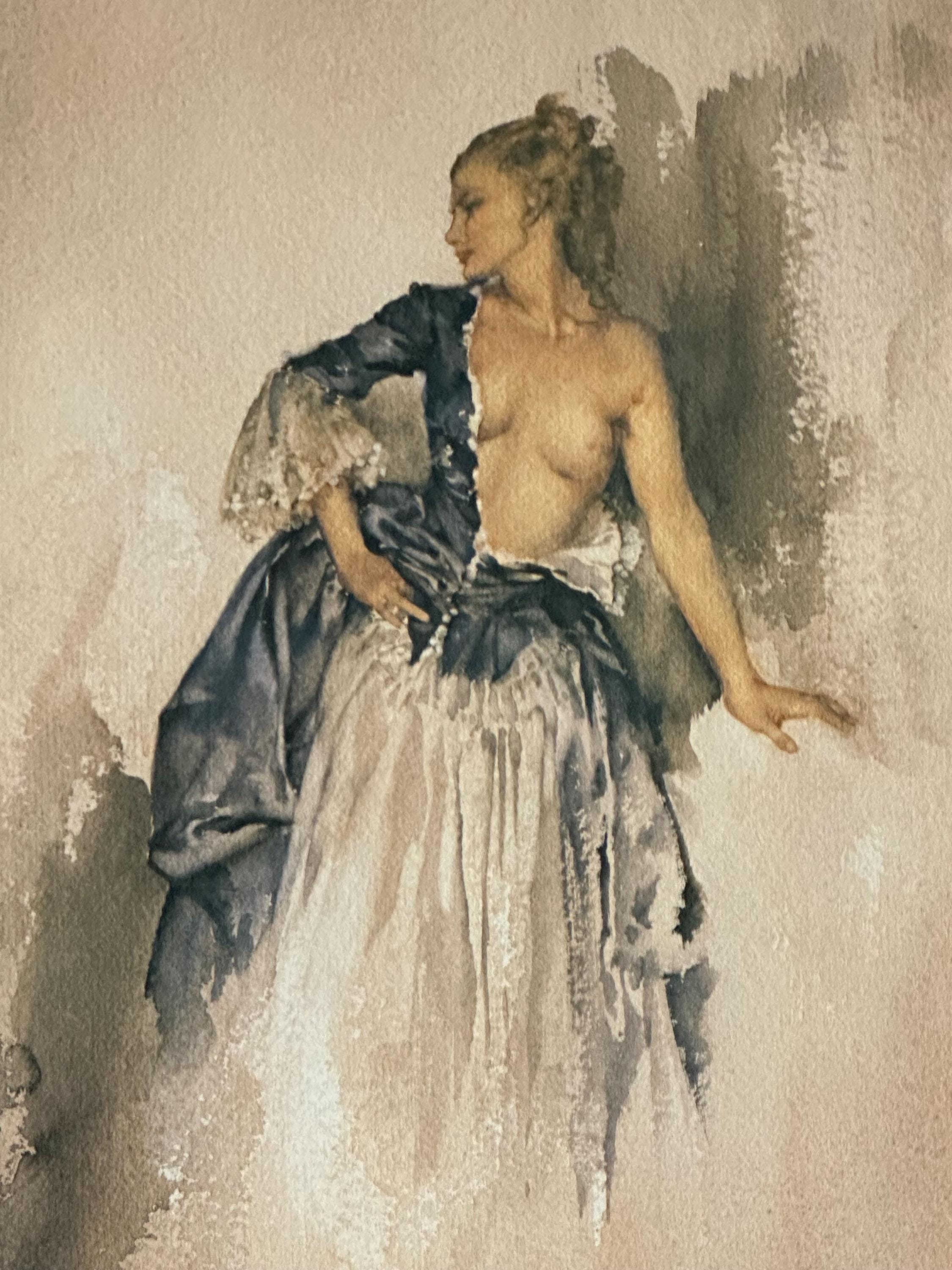 The artwork depicts a seated woman in an elegant, flowing gown, rendered in soft washes of muted tones with Flint’s signature balance of realism and atmosphere. The gentle contrast of shadow and light gives the piece a captivating depth and romantic quality.