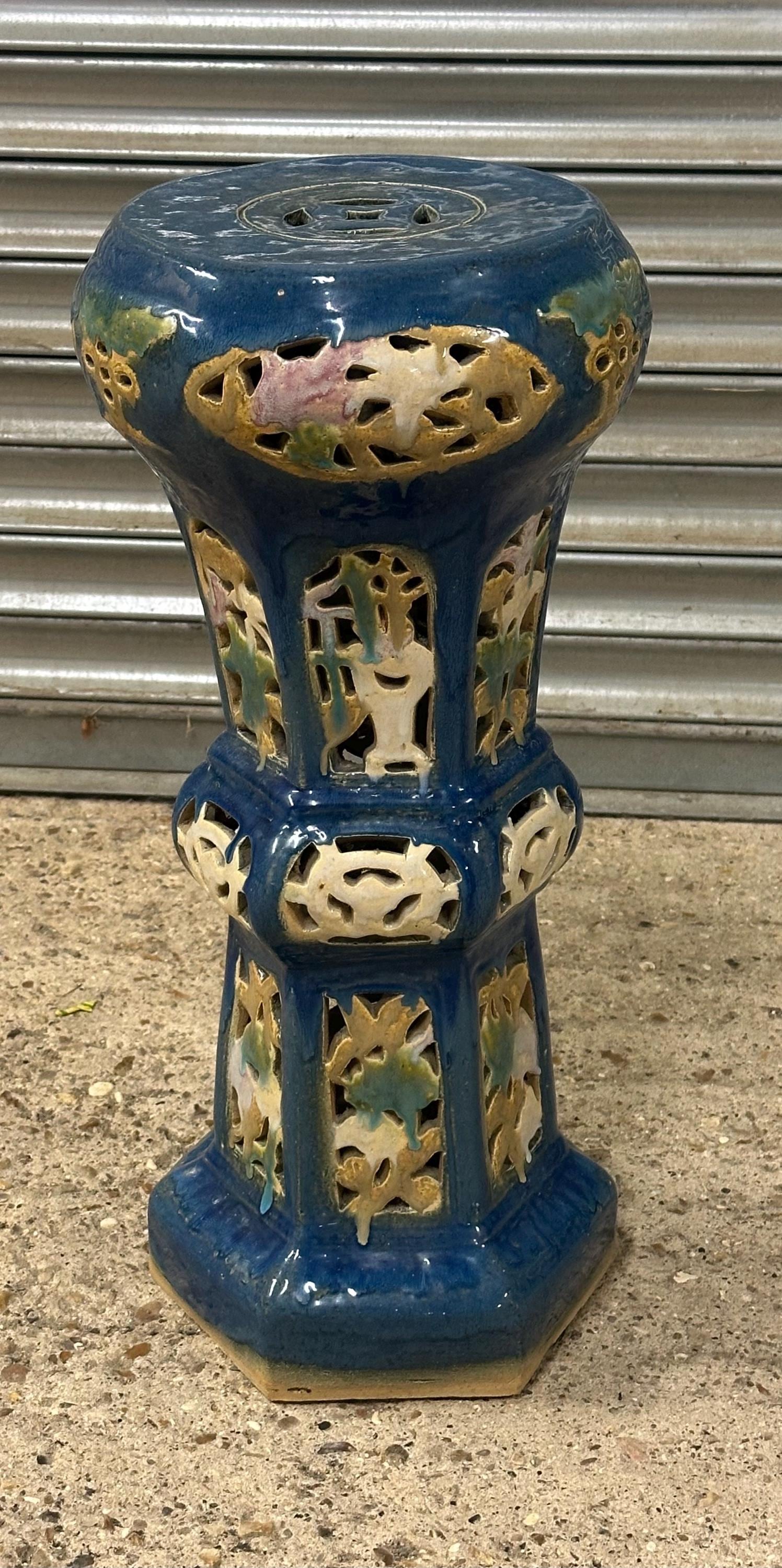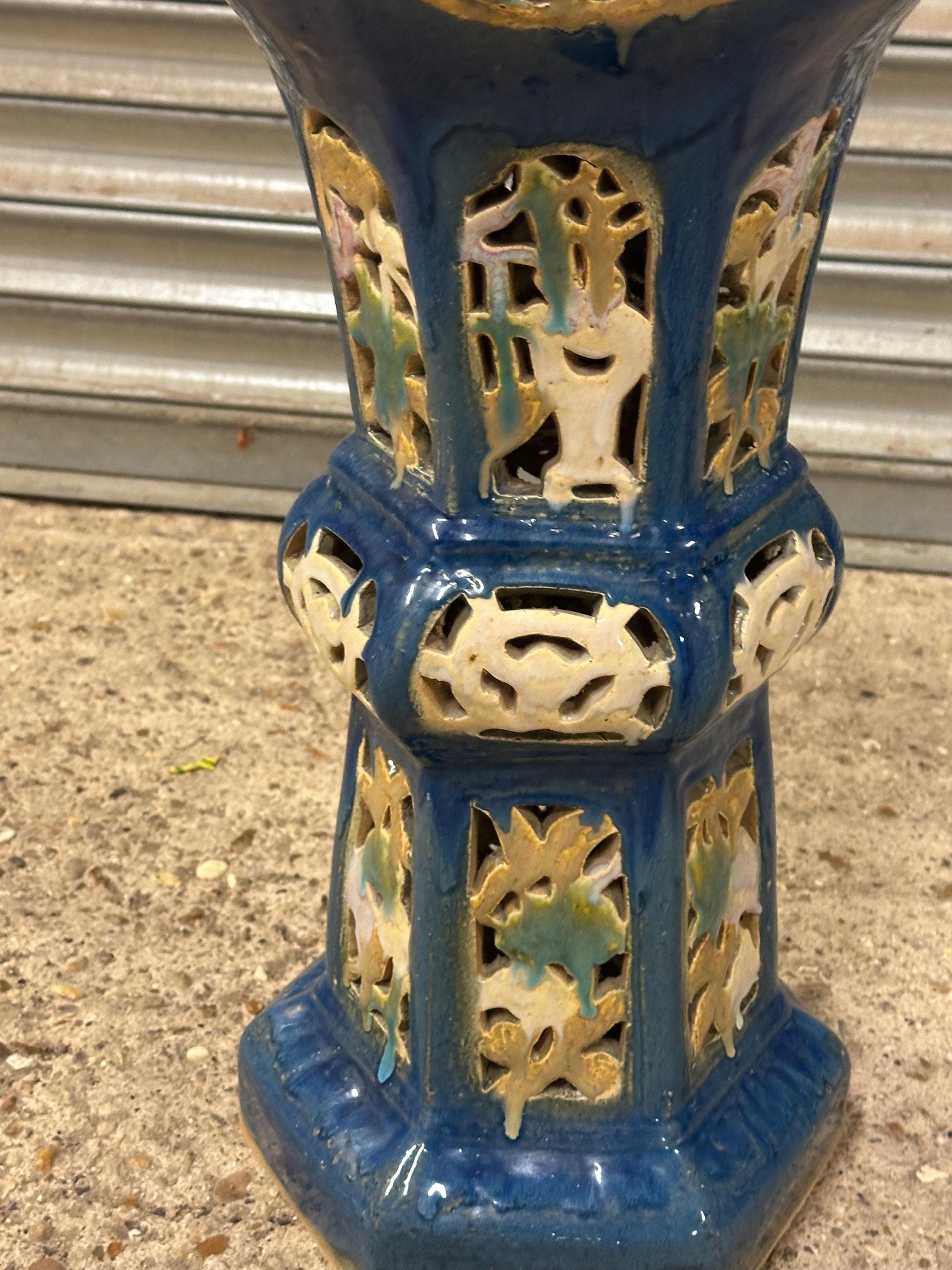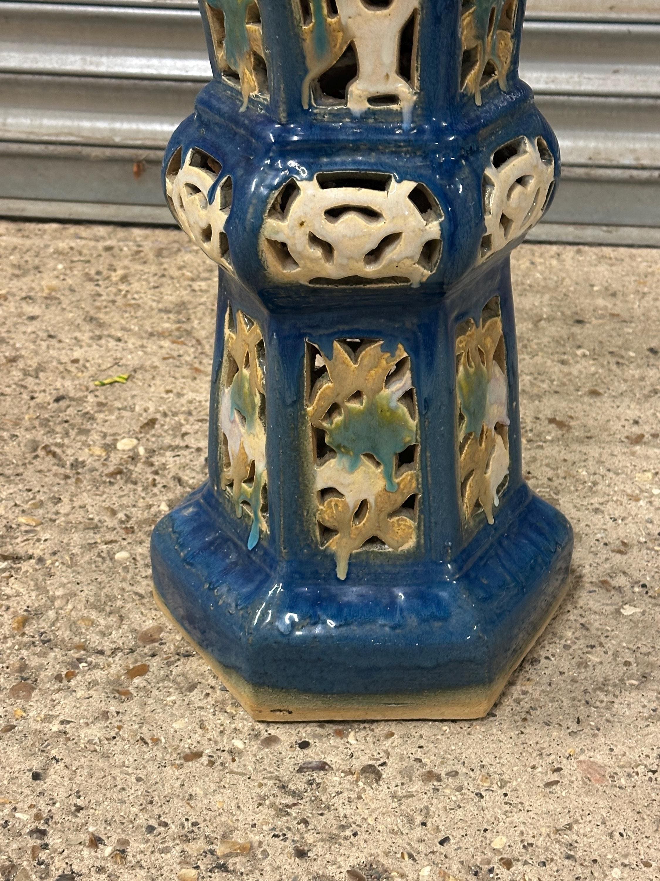 A Chinese Shiwan column, openwork ceramic. Hexagonal in shape with openwork panels decorated with vases, flowers and foliage in vibrant turquoise, yellow, green and eggplant glazes on a deep cobalt blue ground. Embossed ruyi and cloud motifs. The vase symbolizes peace and harmony, while the floral elements, possibly lotus, chrysanthemum or peony, represent purity, long life and prosperity. Probably used as a stand for an incense vessel or statue, this piece combines decorative elegance with prosperous symbolism. Height: 64cm. Diameter: 24cm. Excellent condition: only slight signs of age. Craquelé (original to the glaze) and some minor firing flaws, such as small cracks.
