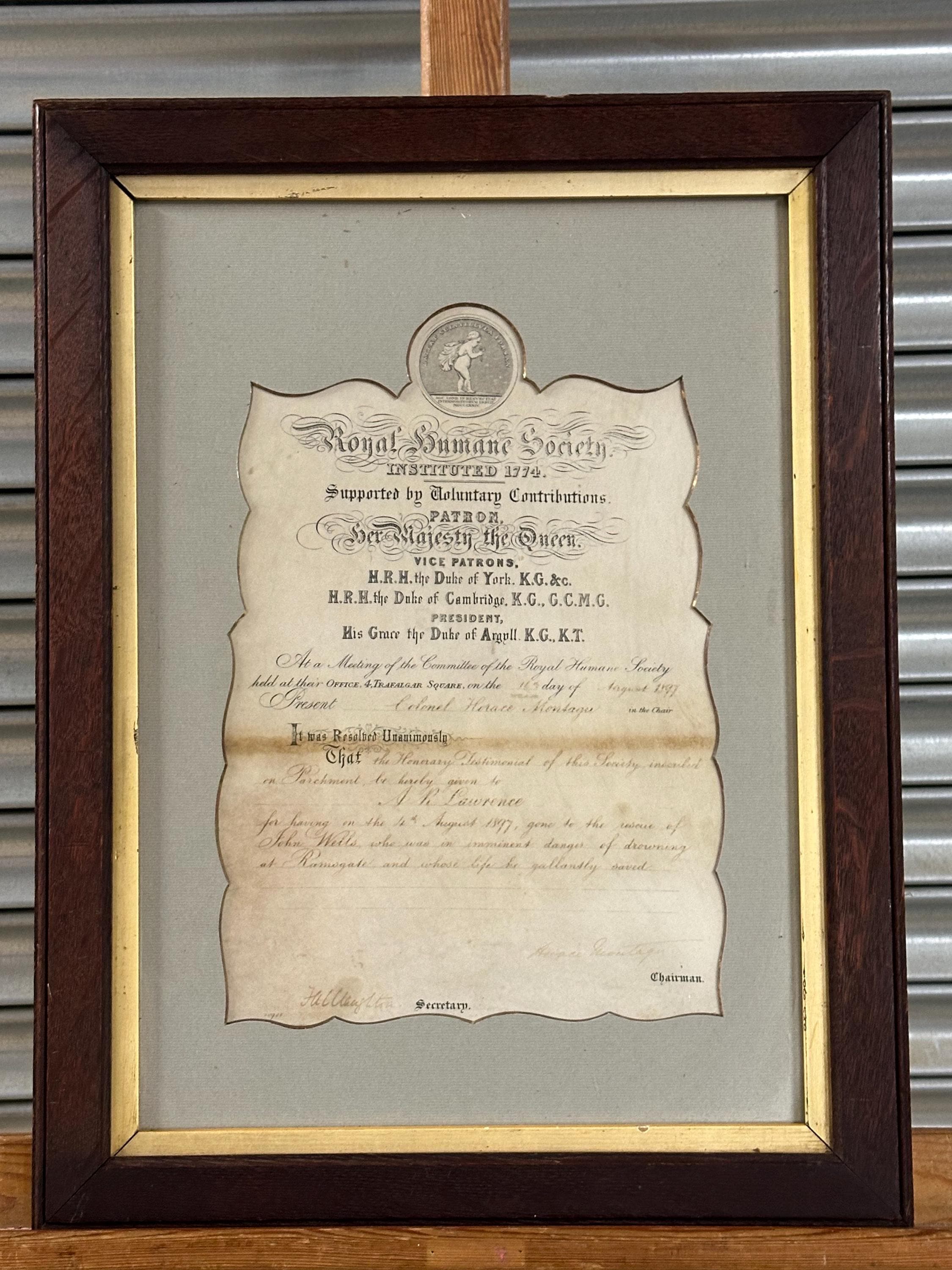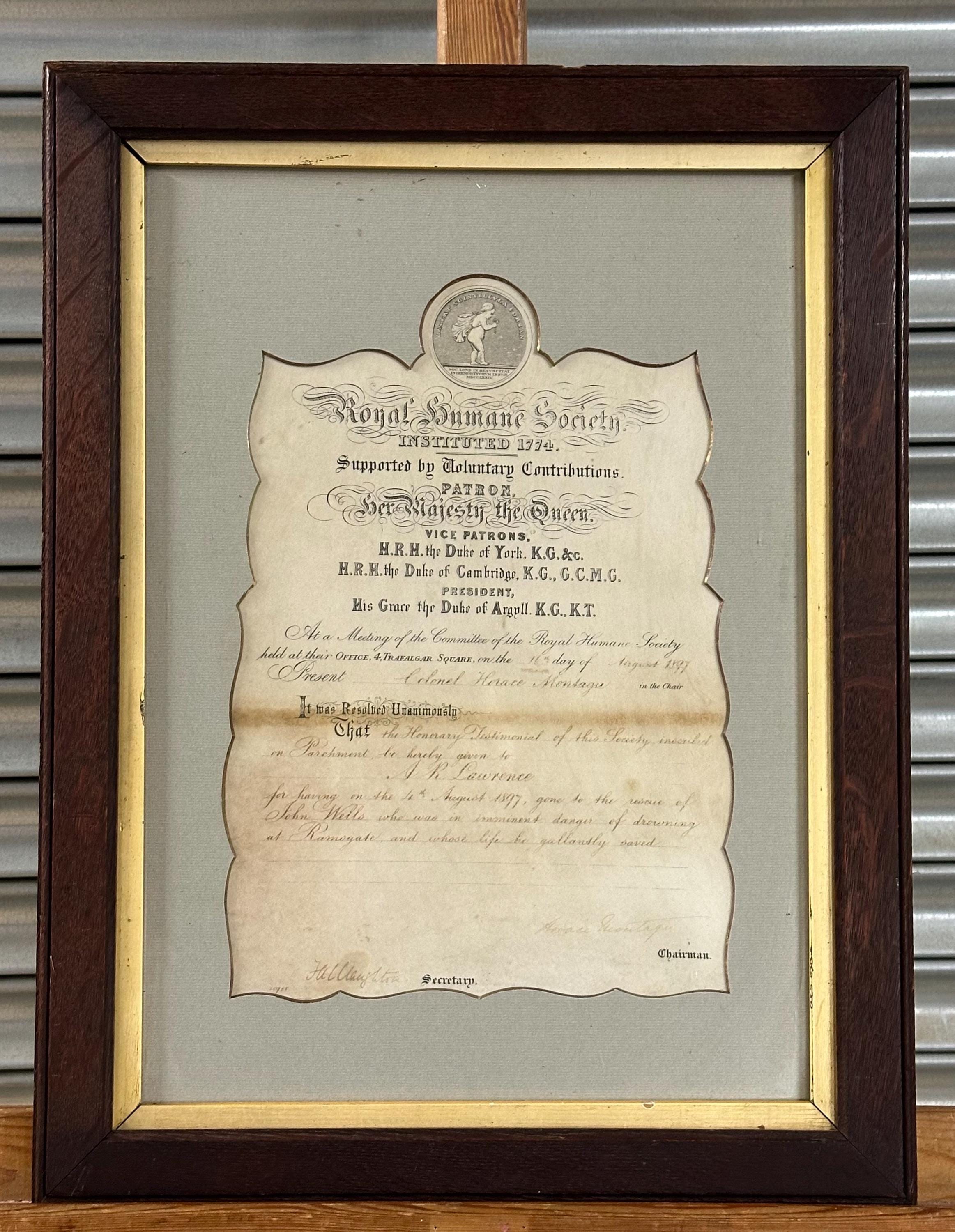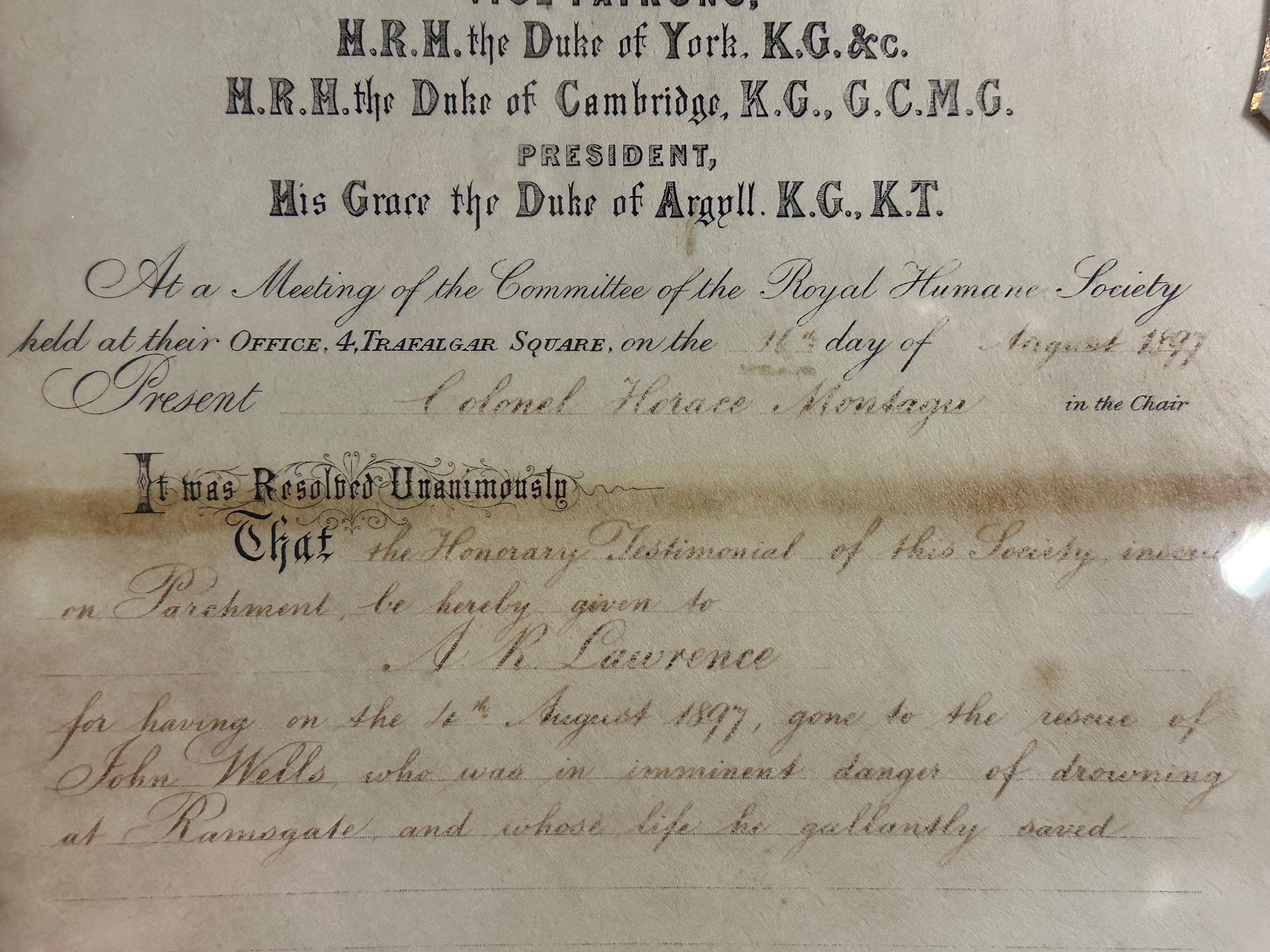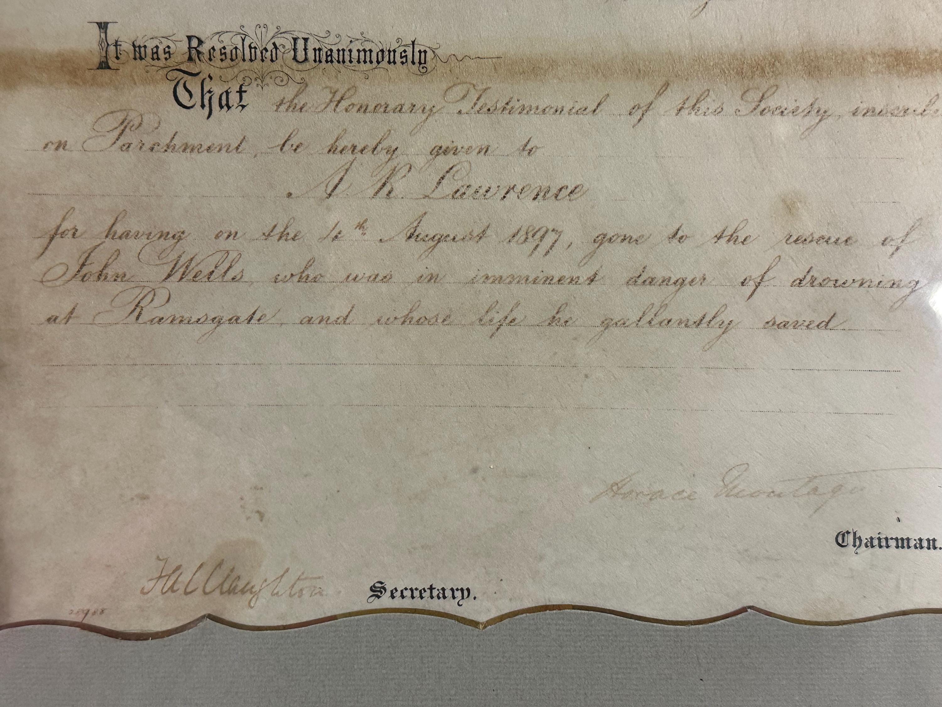 Framed and Glazed Royal Humane Society Vellum Awarded To A R Lawrence in 1897 For Rescuing John Wells who was drowning.