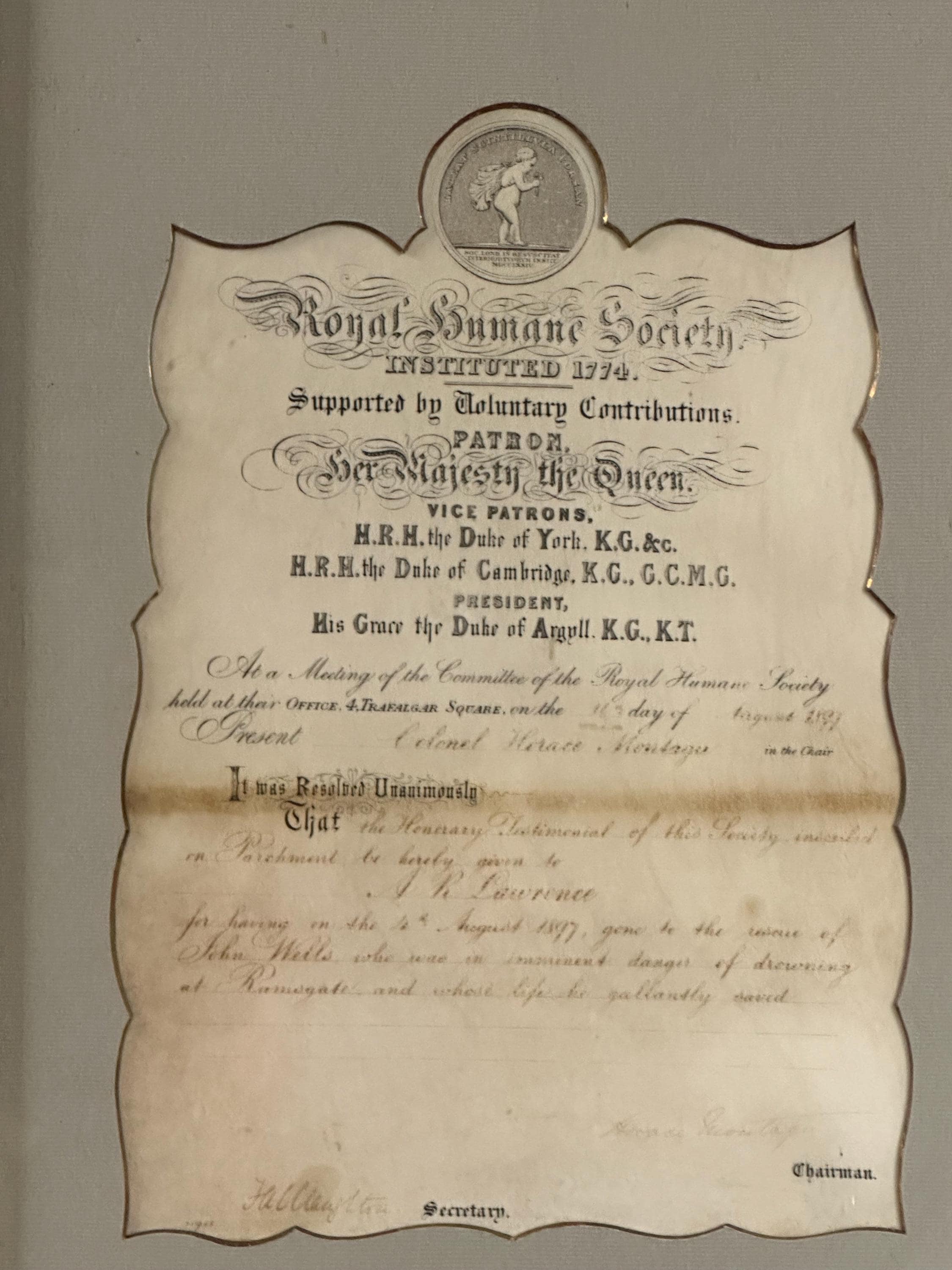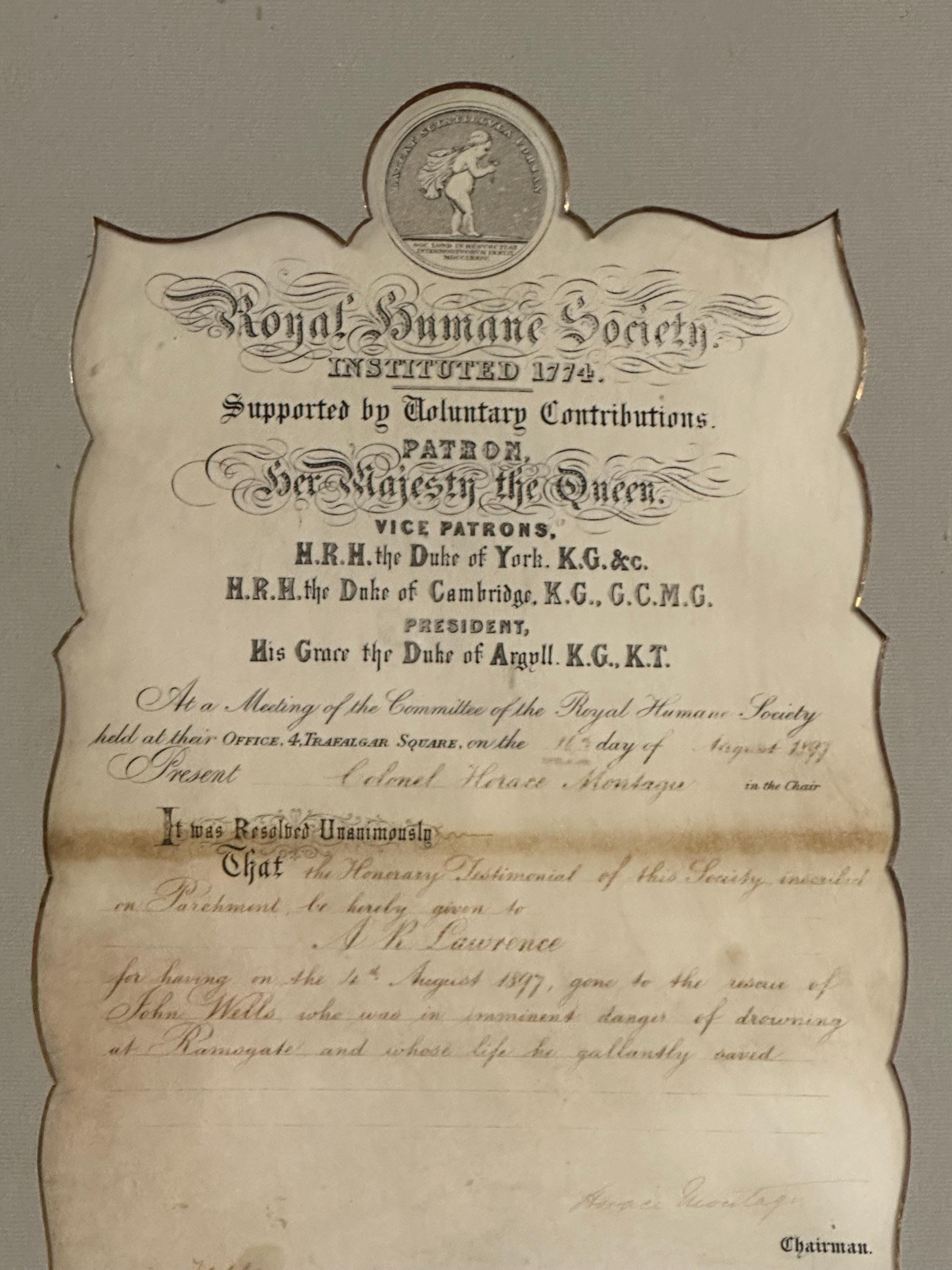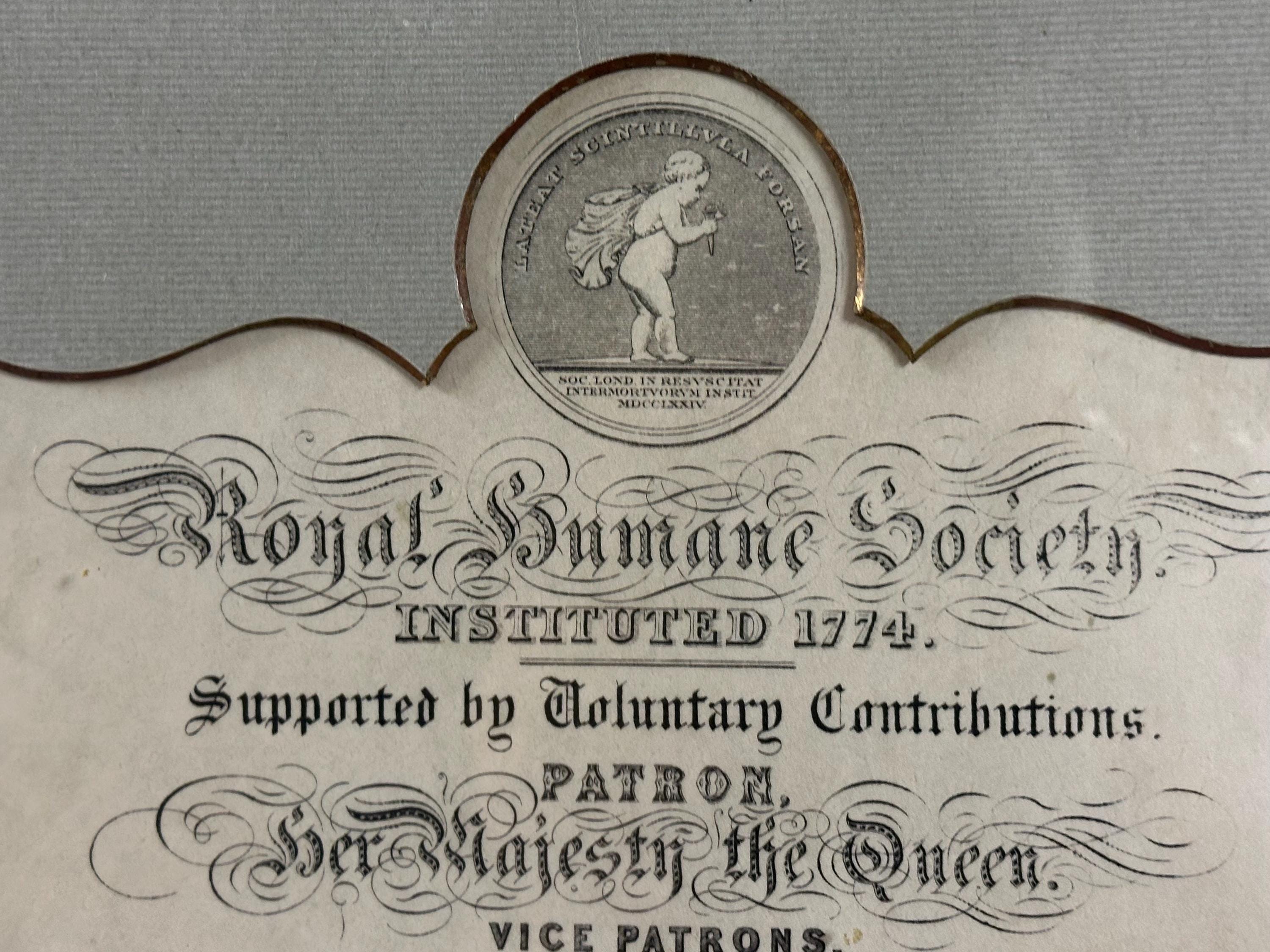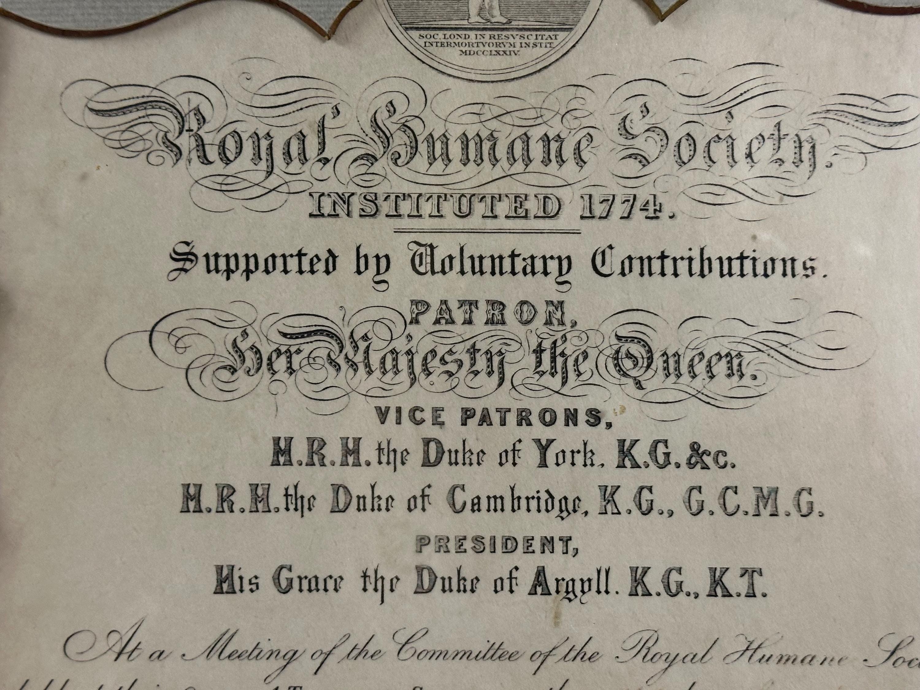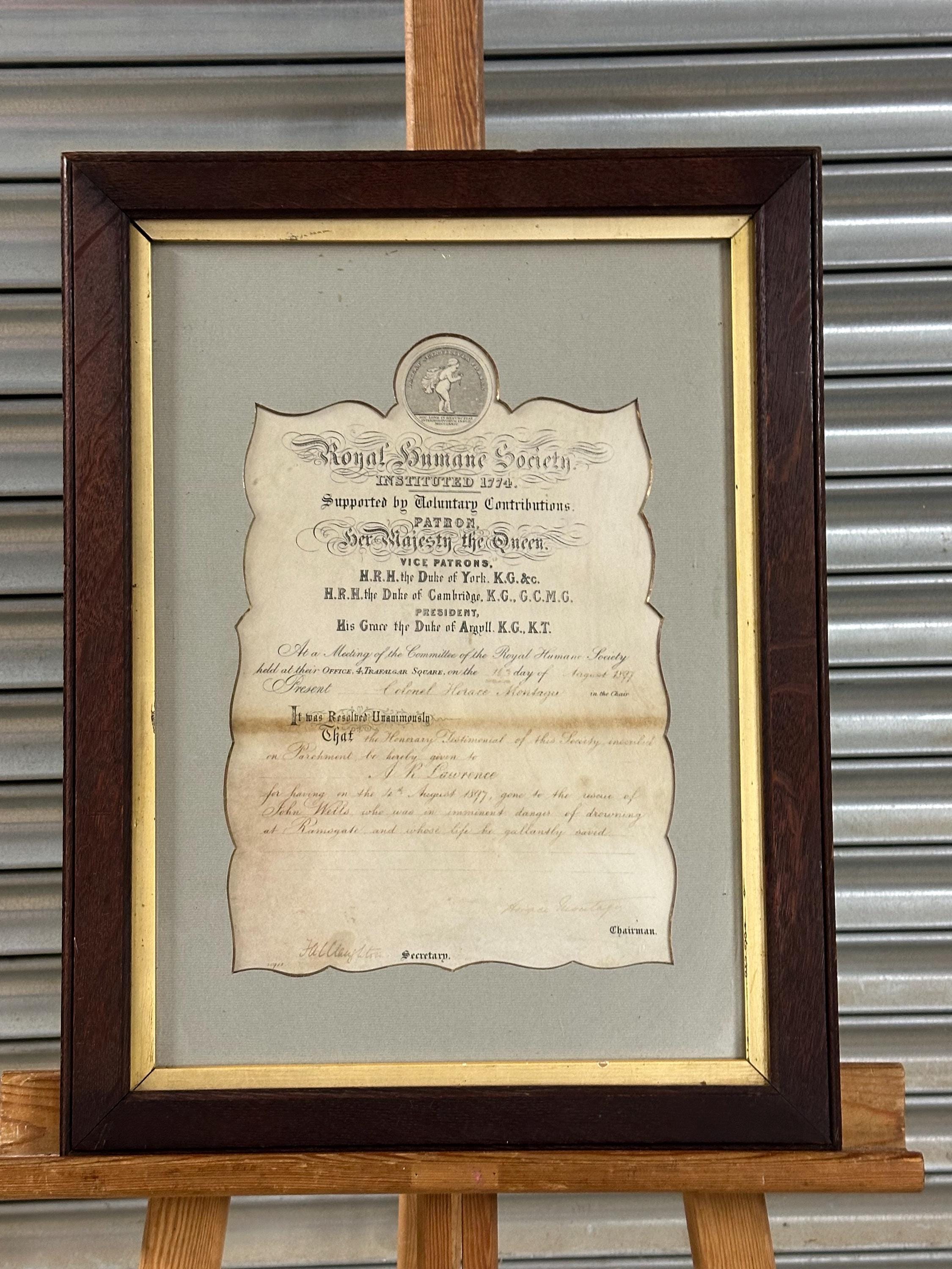Framed and Glazed Royal Humane Society Vellum Awarded To A R Lawrence in 1897 For Rescuing John Wells who was drowning.