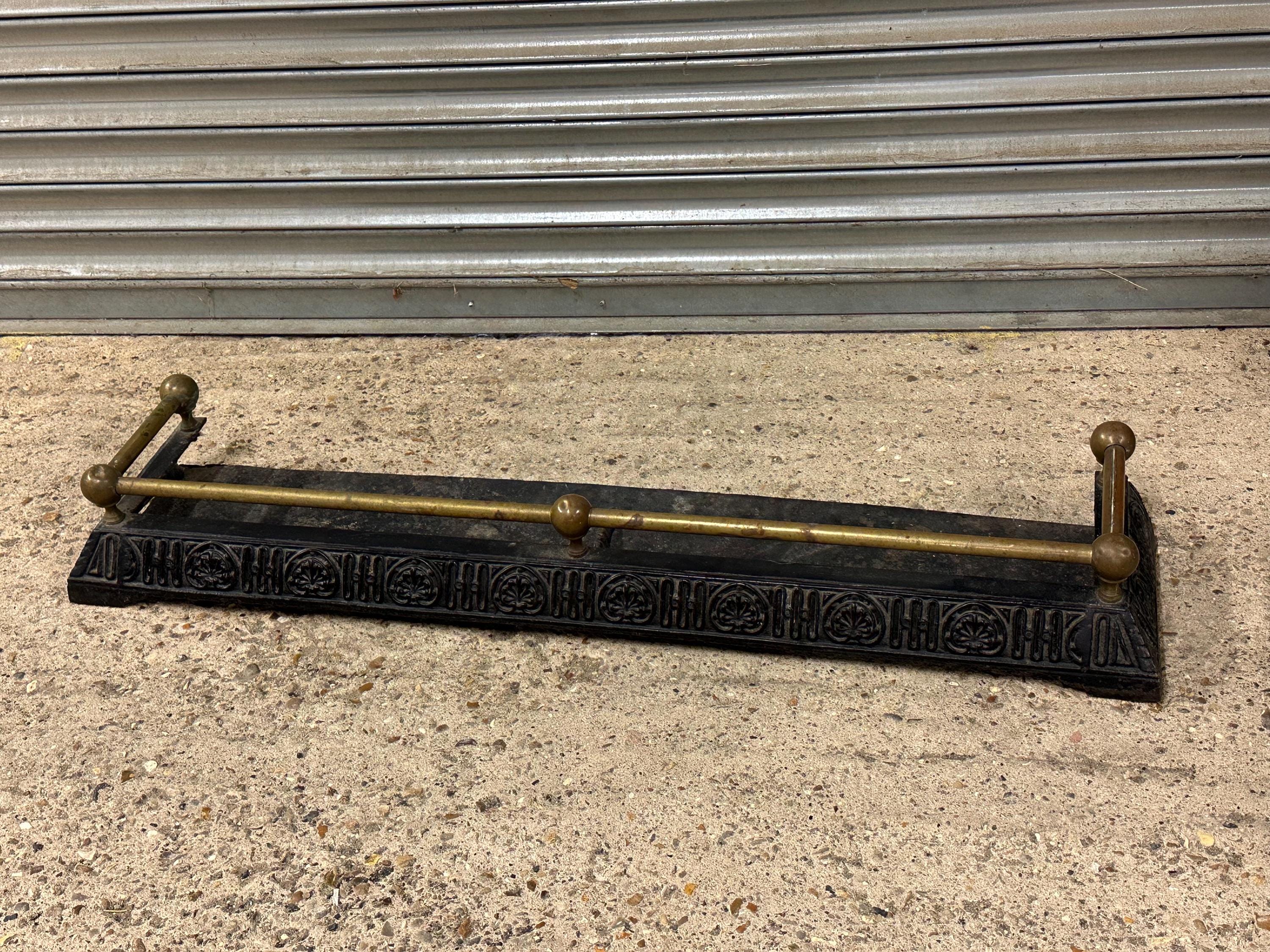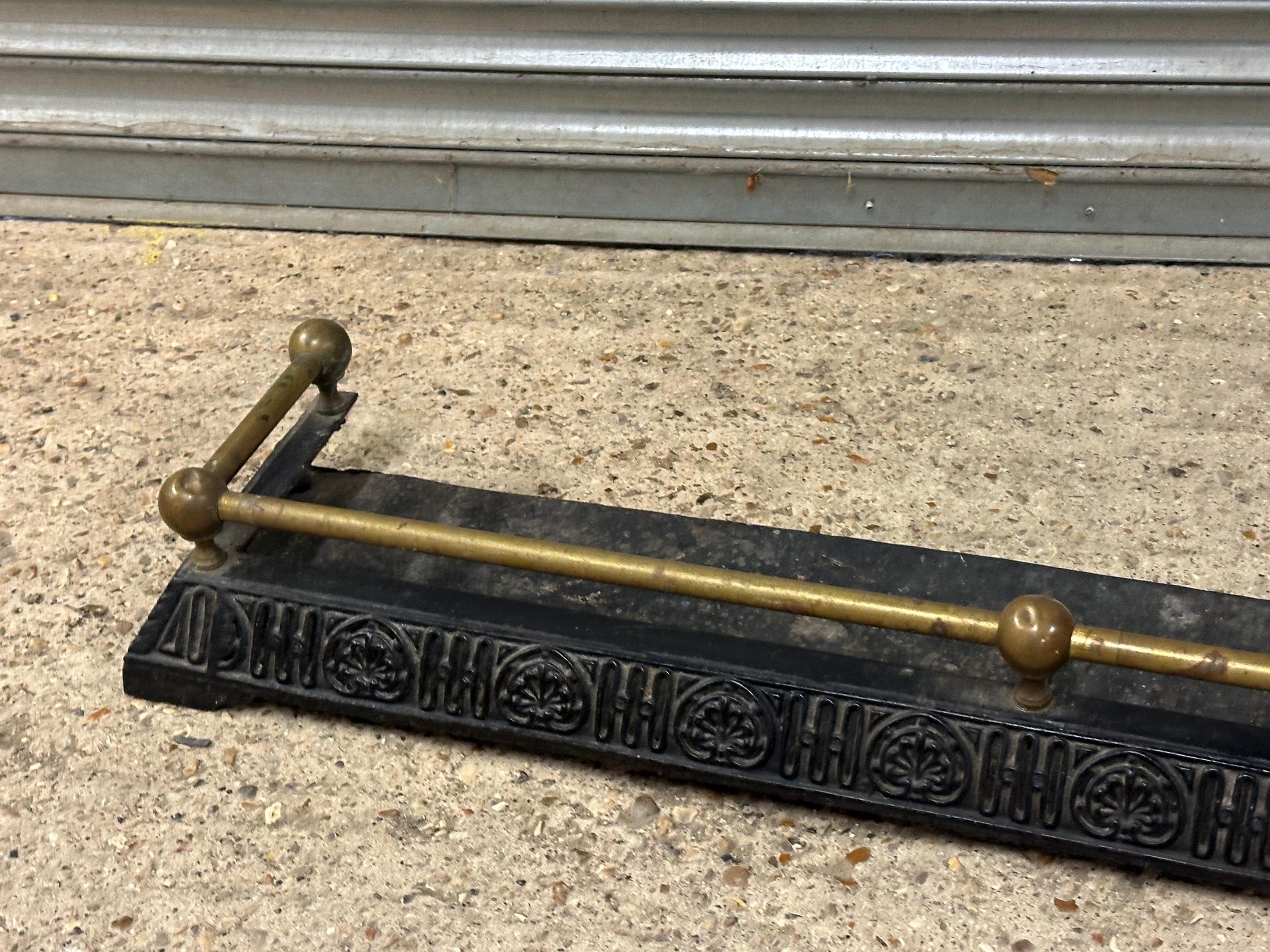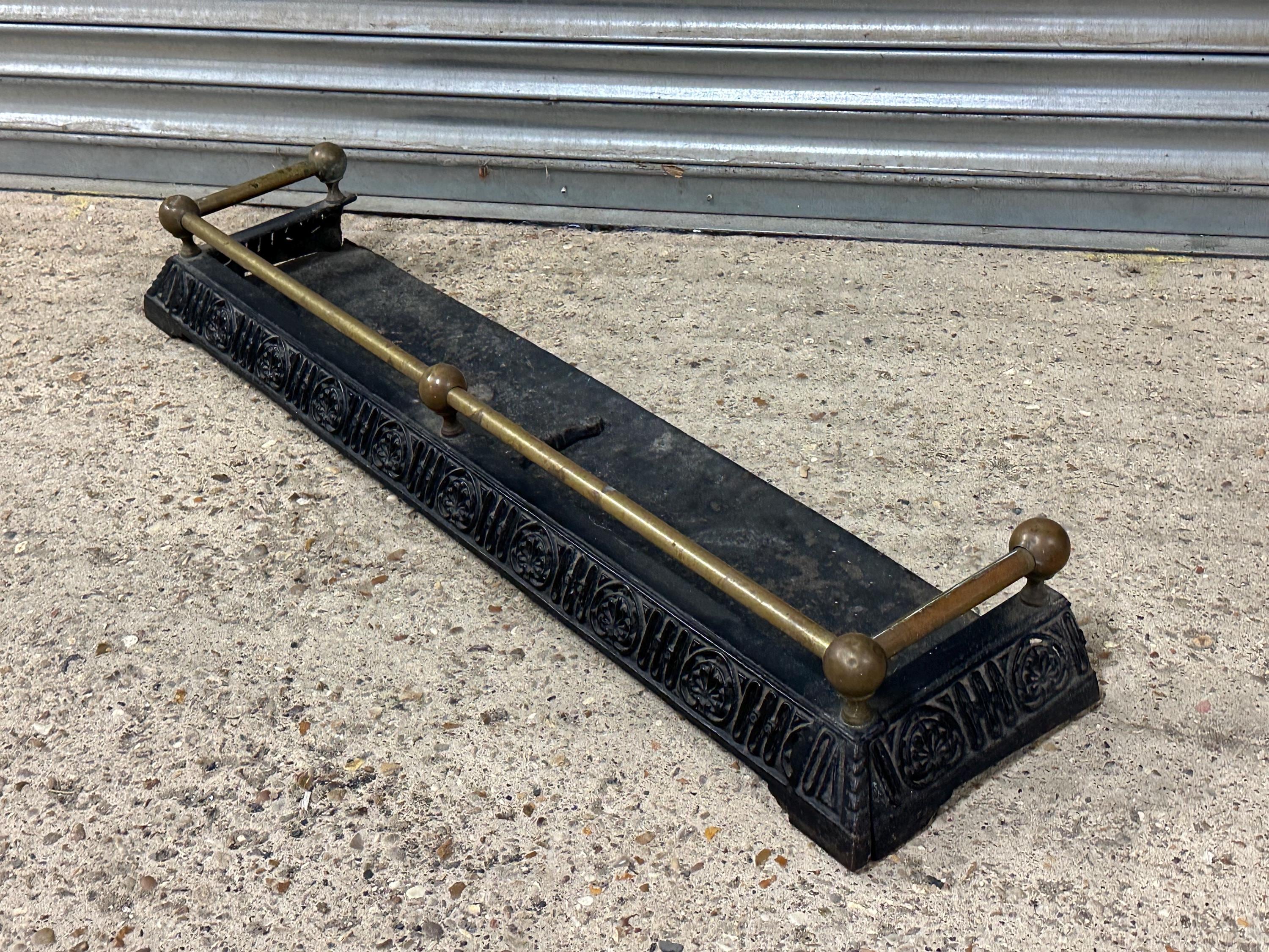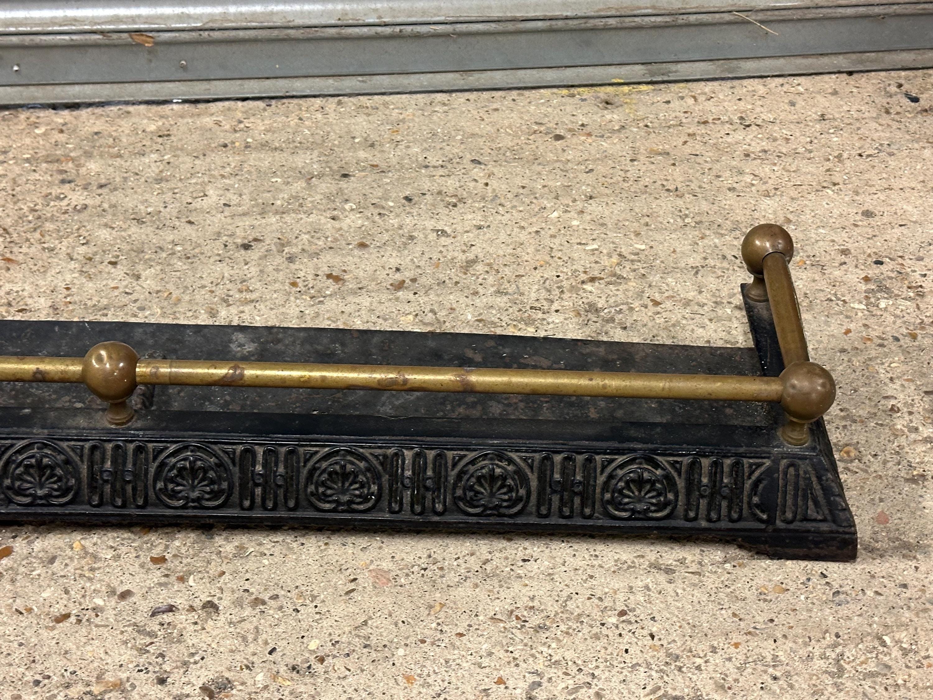 A fine example of an early 20th-century fire fender, crafted from heavy cast iron with decorative moulded detailing and fitted with elegant brass rails and ball finials.