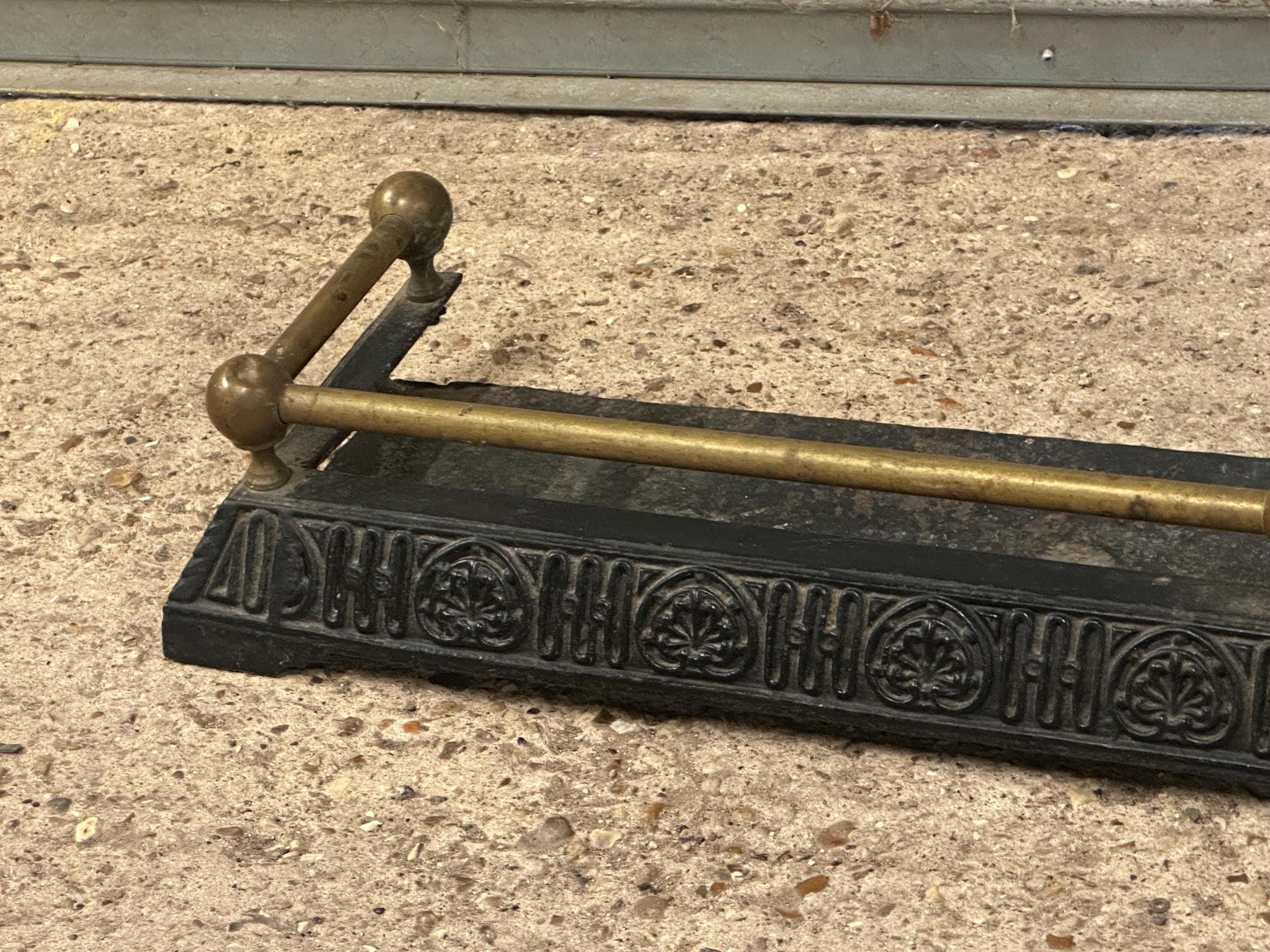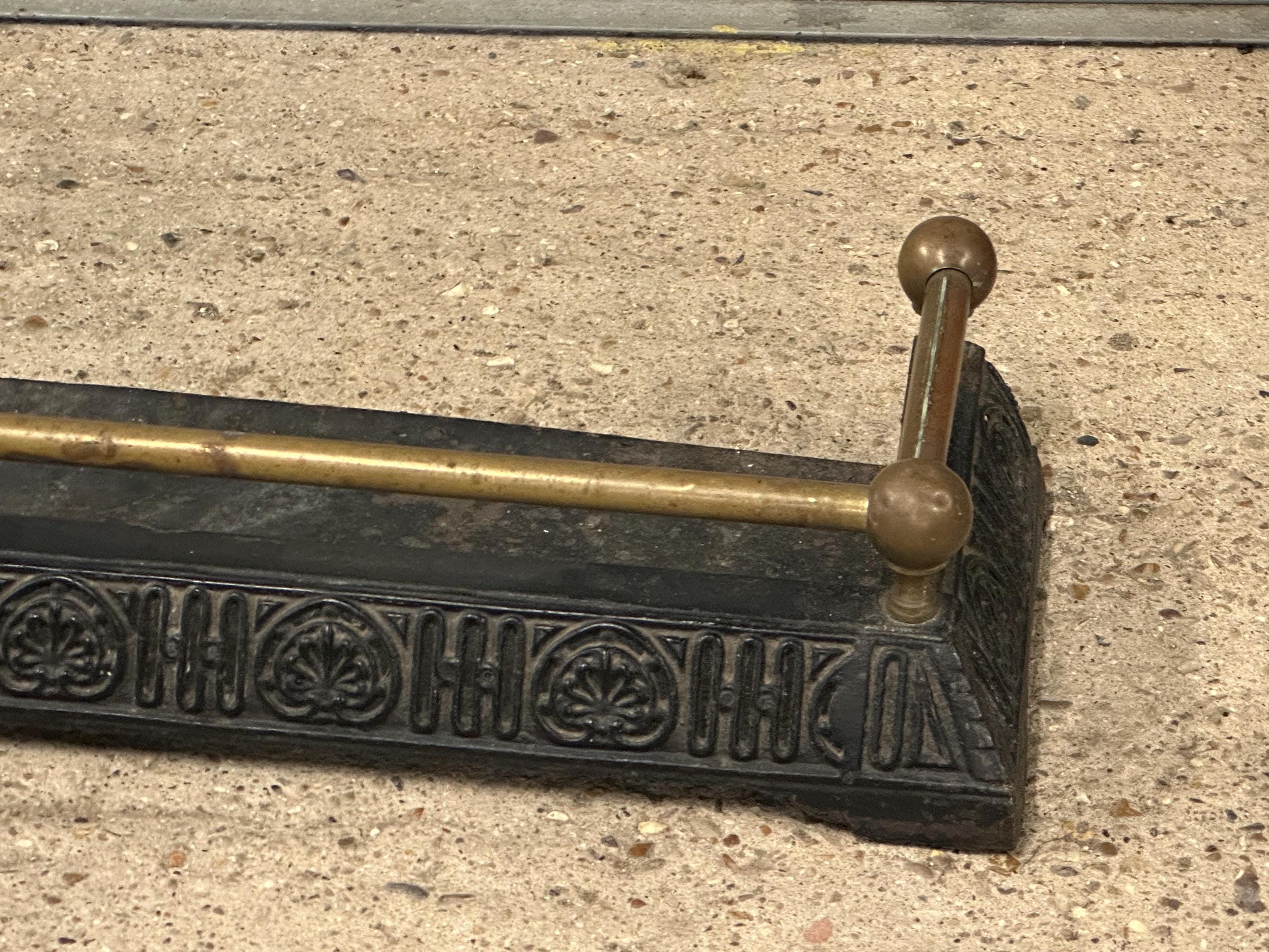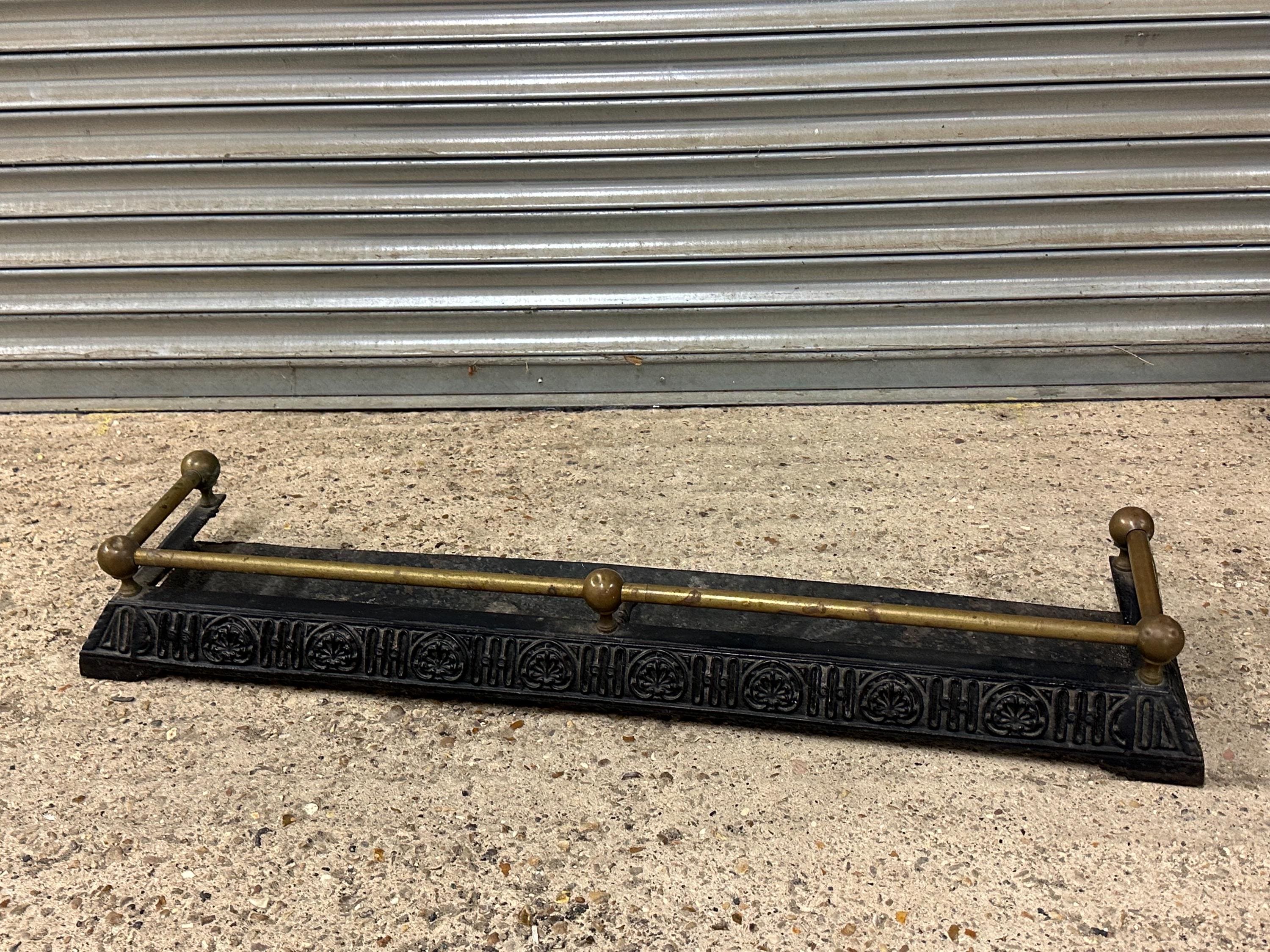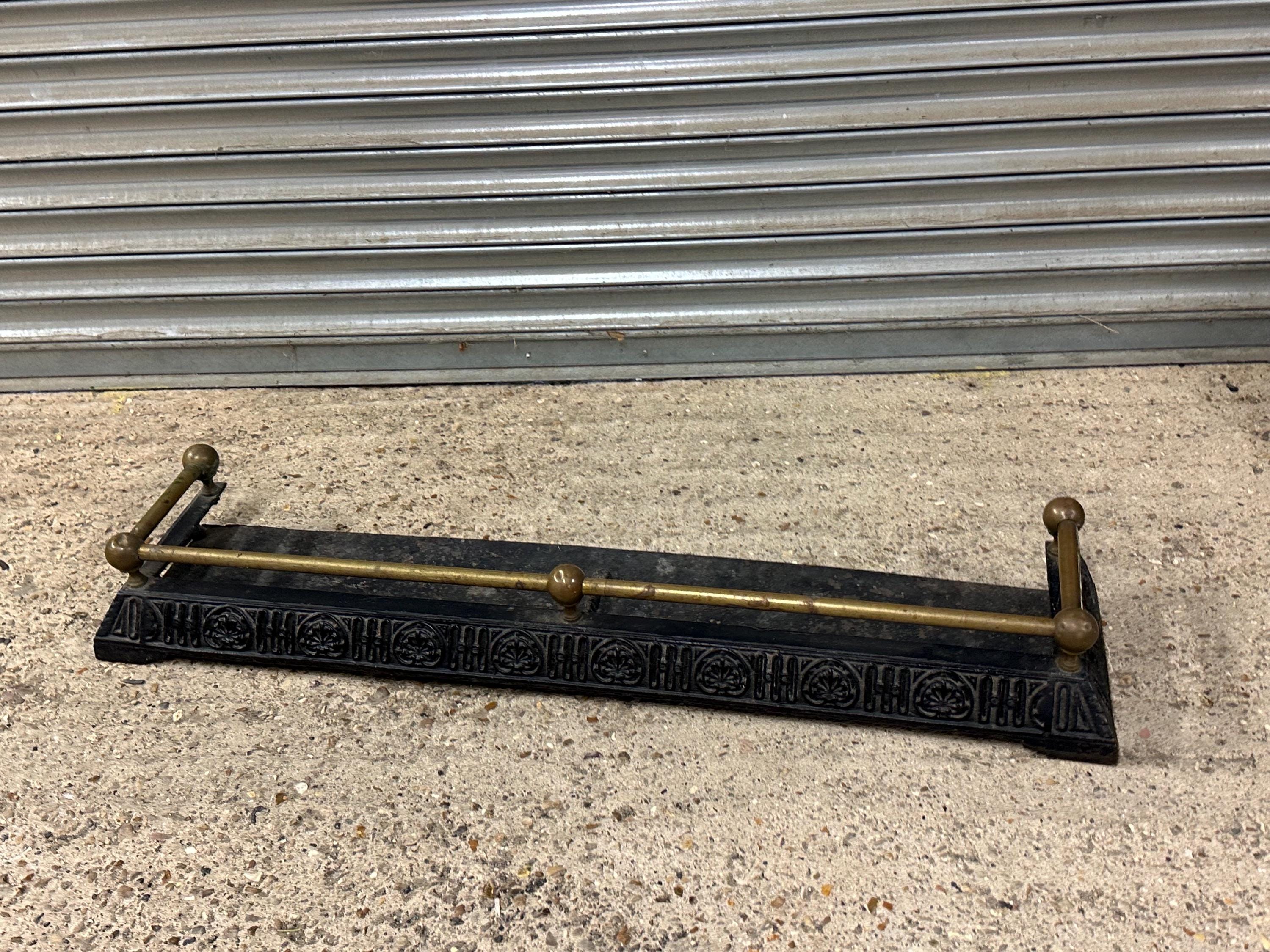 A fine example of an early 20th-century fire fender, crafted from heavy cast iron with decorative moulded detailing and fitted with elegant brass rails and ball finials.