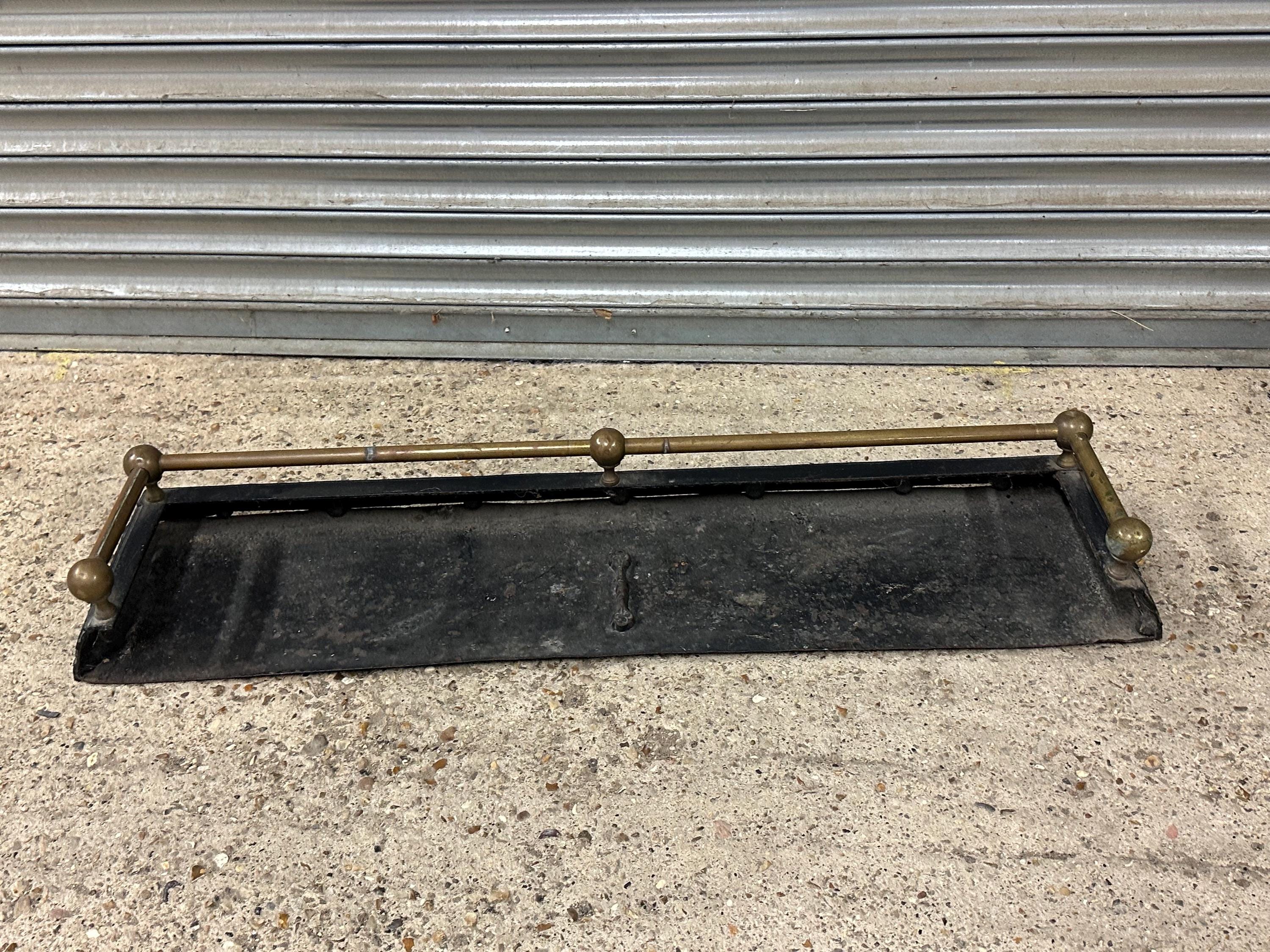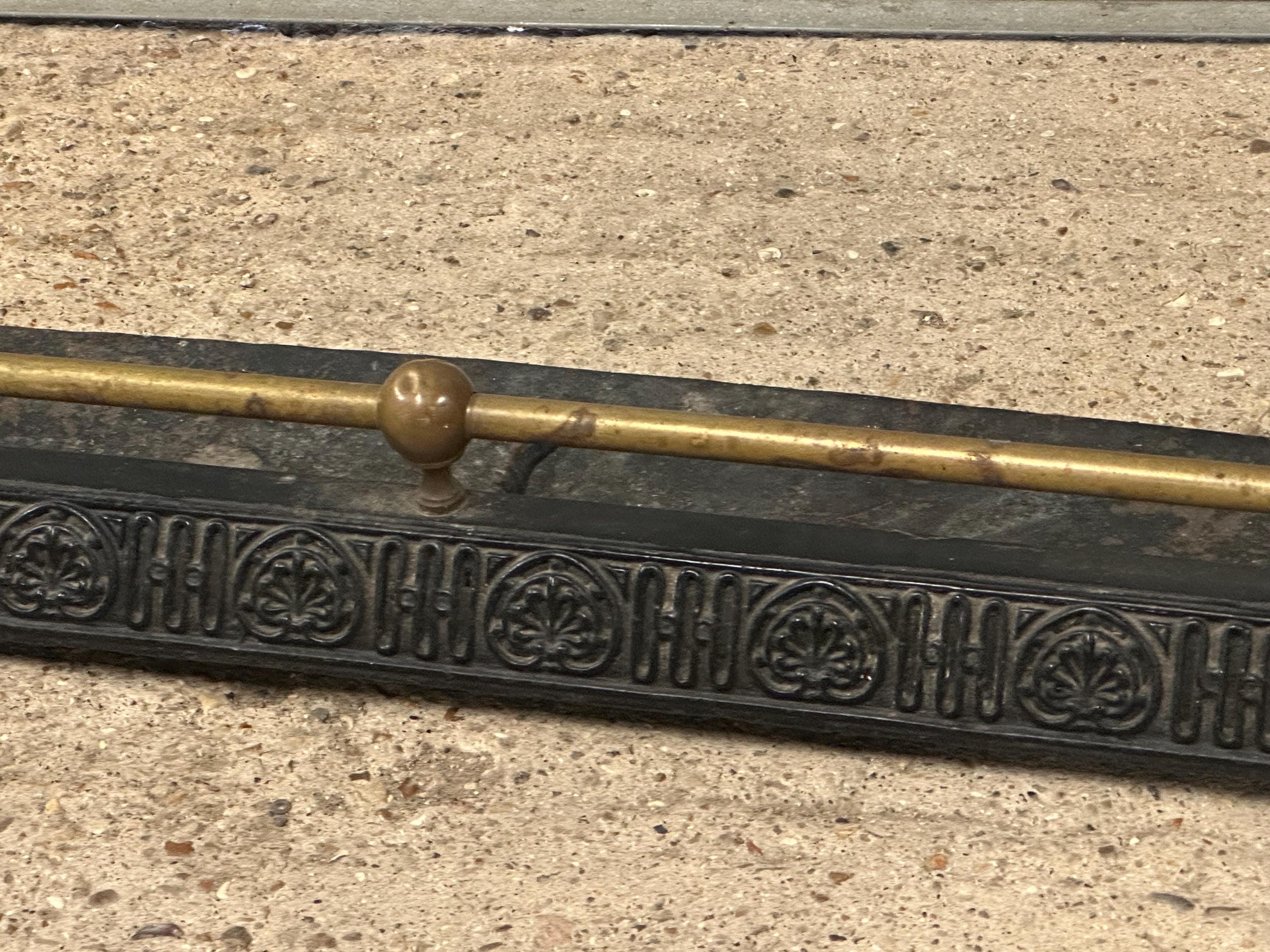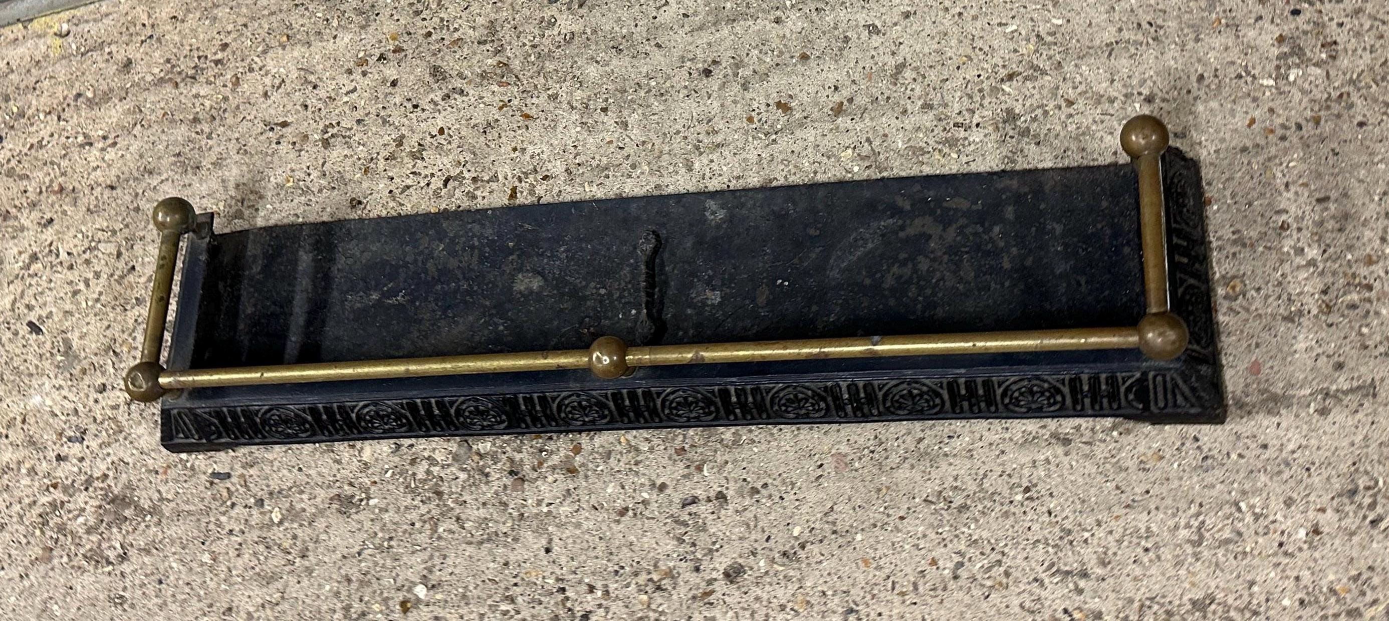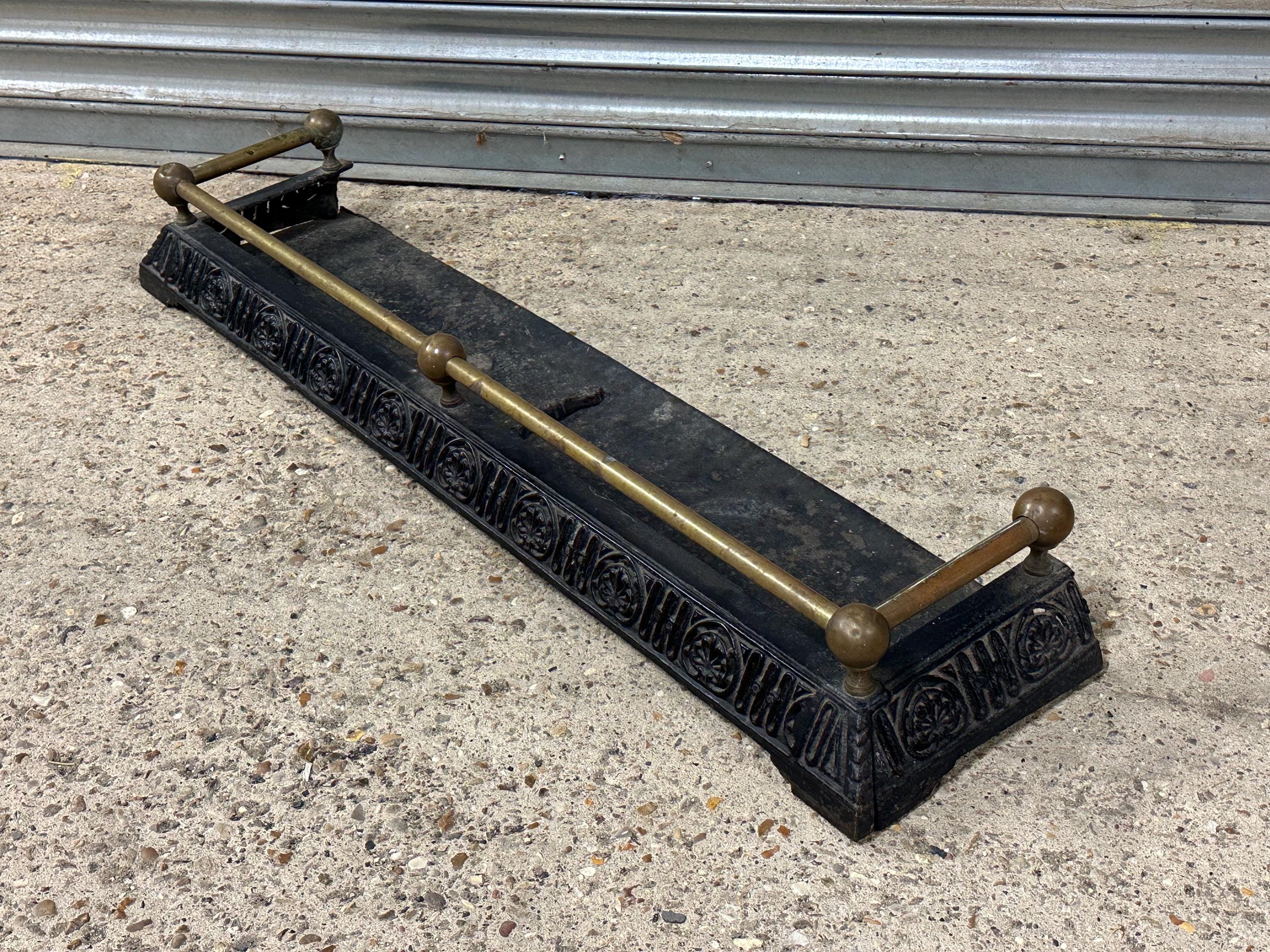 A fine example of an early 20th-century fire fender, crafted from heavy cast iron with decorative moulded detailing and fitted with elegant brass rails and ball finials.