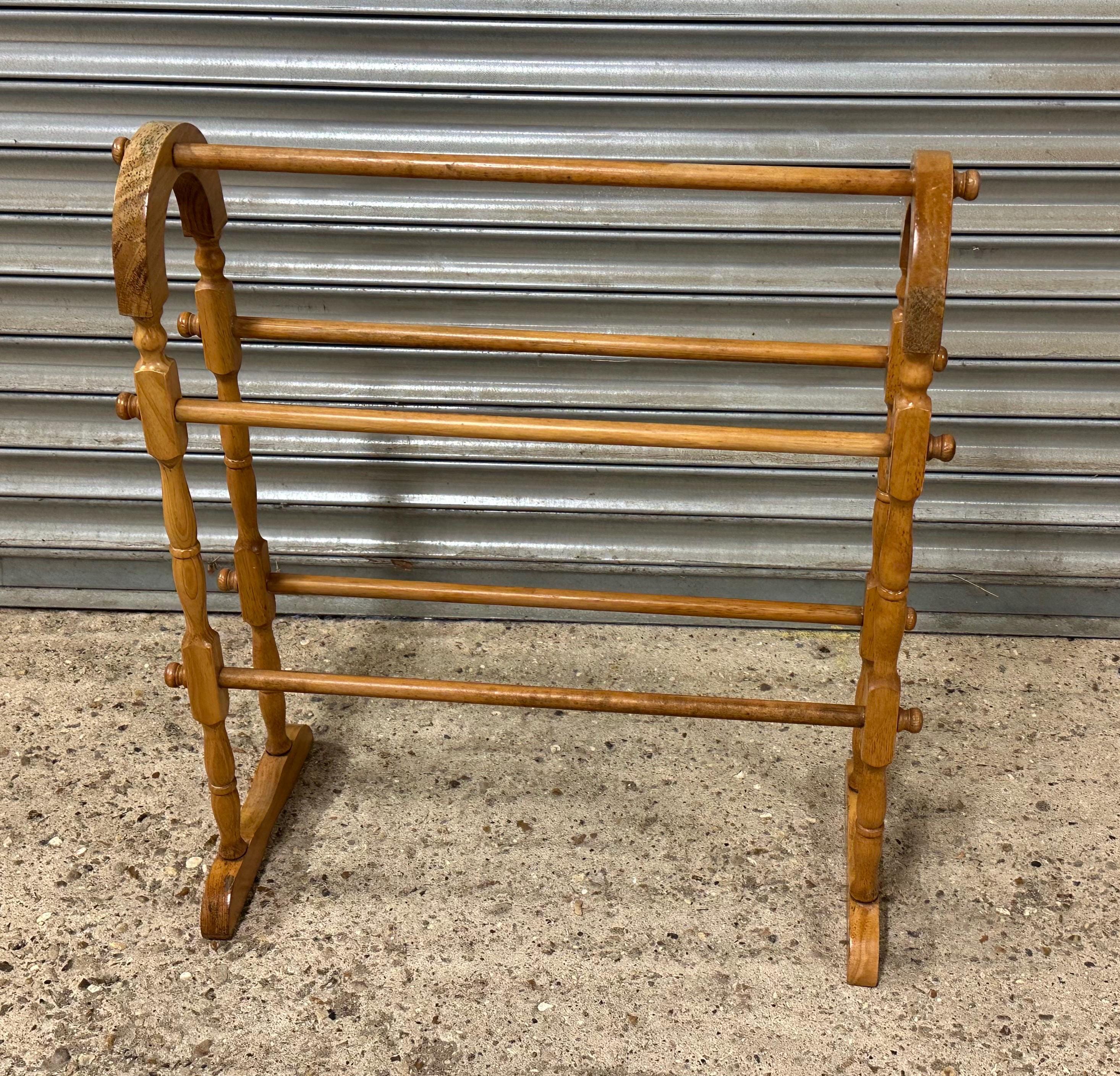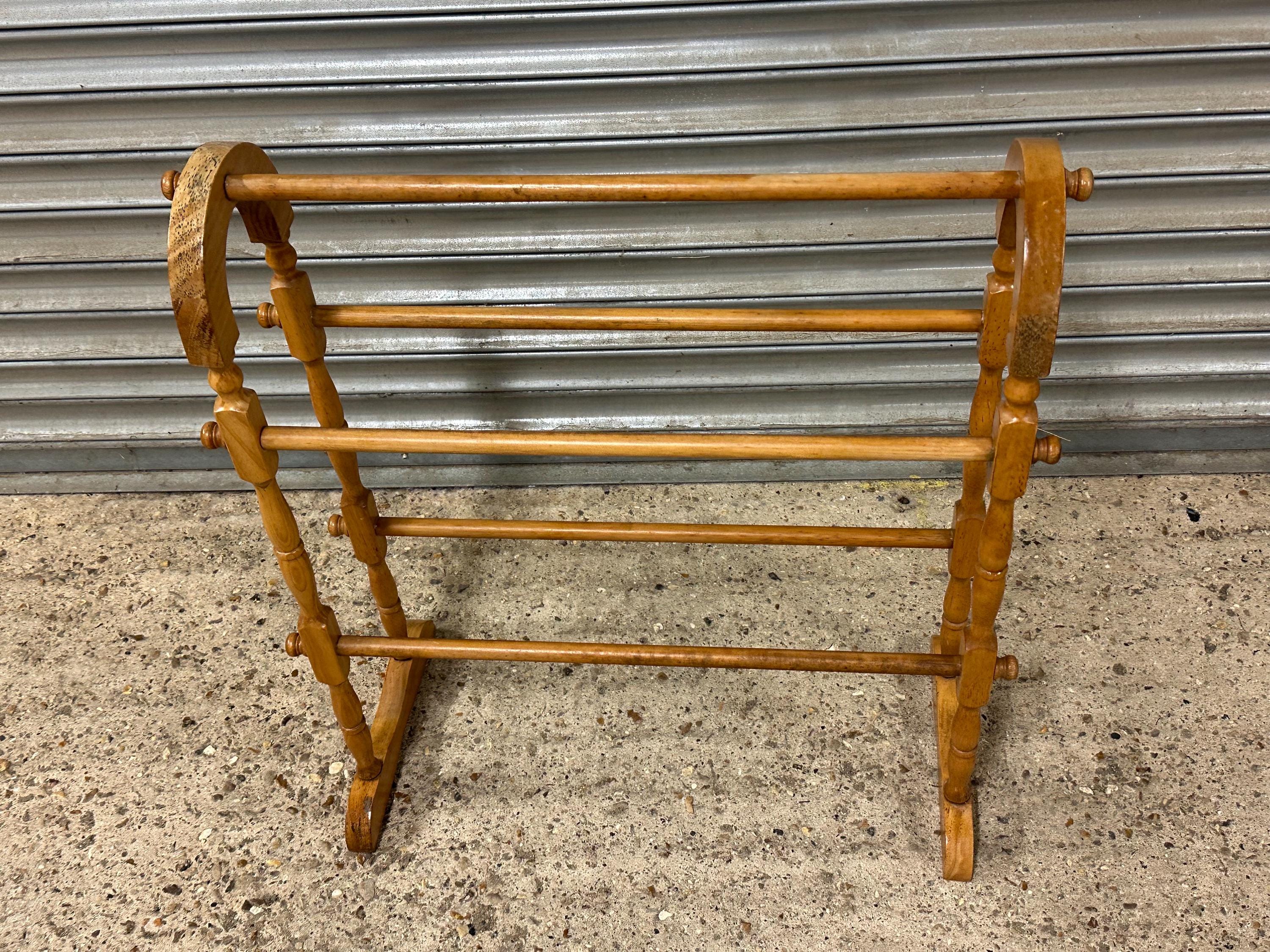 A lovely vintage wooden towel rail featuring three horizontal bars and decorative turned uprights. The piece has an attractive warm wood tone with arched ends and turned detailing, giving it a charming traditional look.