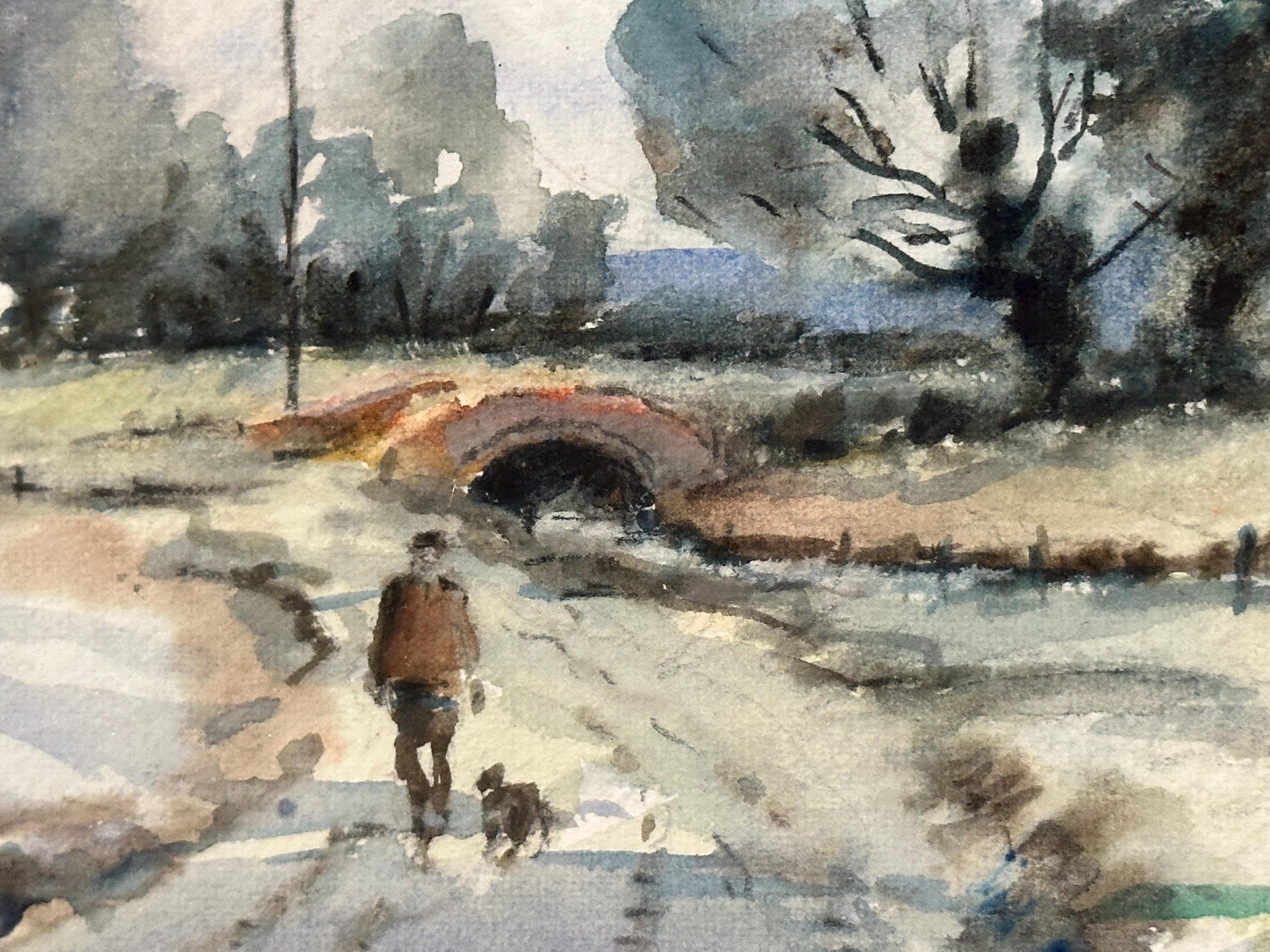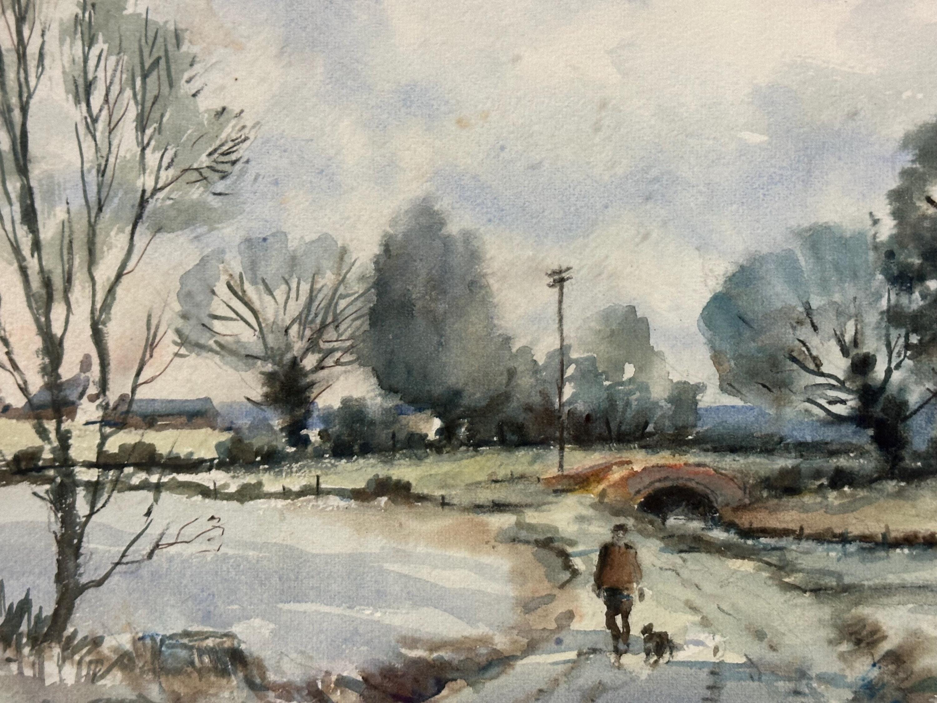 The upper painting, “Snow Along the Riseley Road”, shows a winter landscape with leafless trees and figures walking along a snow-covered lane beneath a soft grey sky. The lower piece, “The Road to Little Staughton”, depicts a country lane leading towards a small bridge and distant trees beneath a bright, cloud-filled sky.