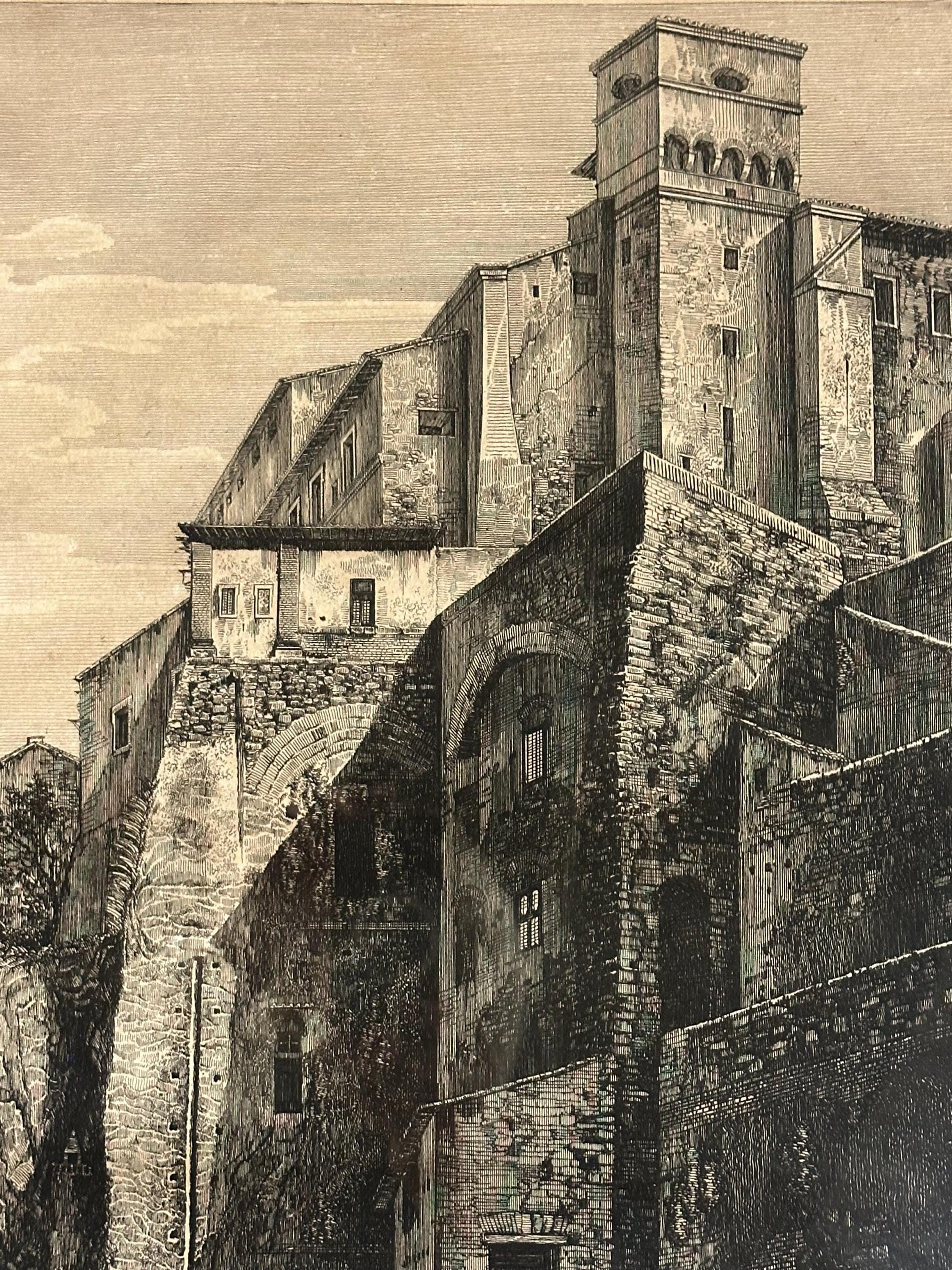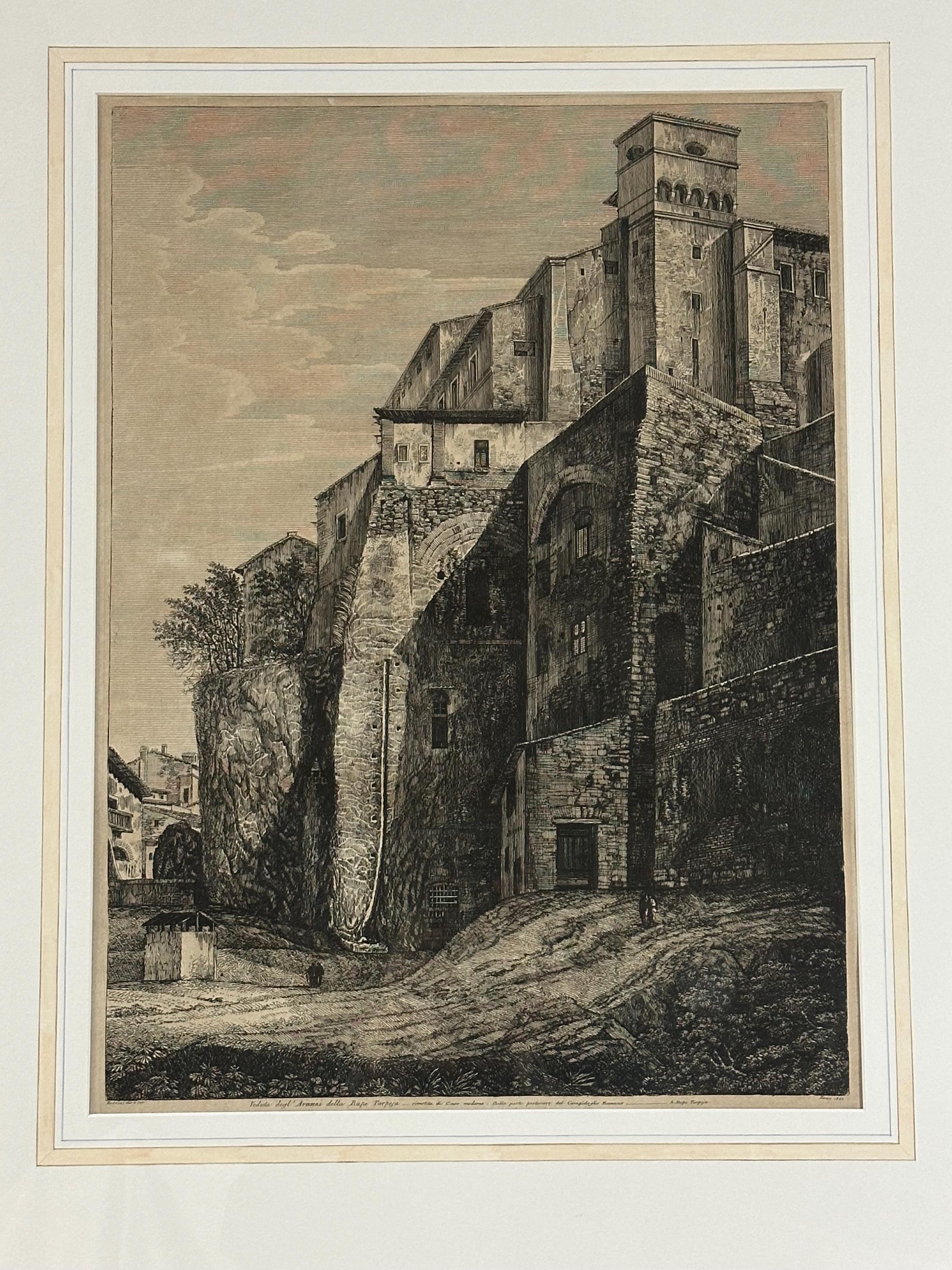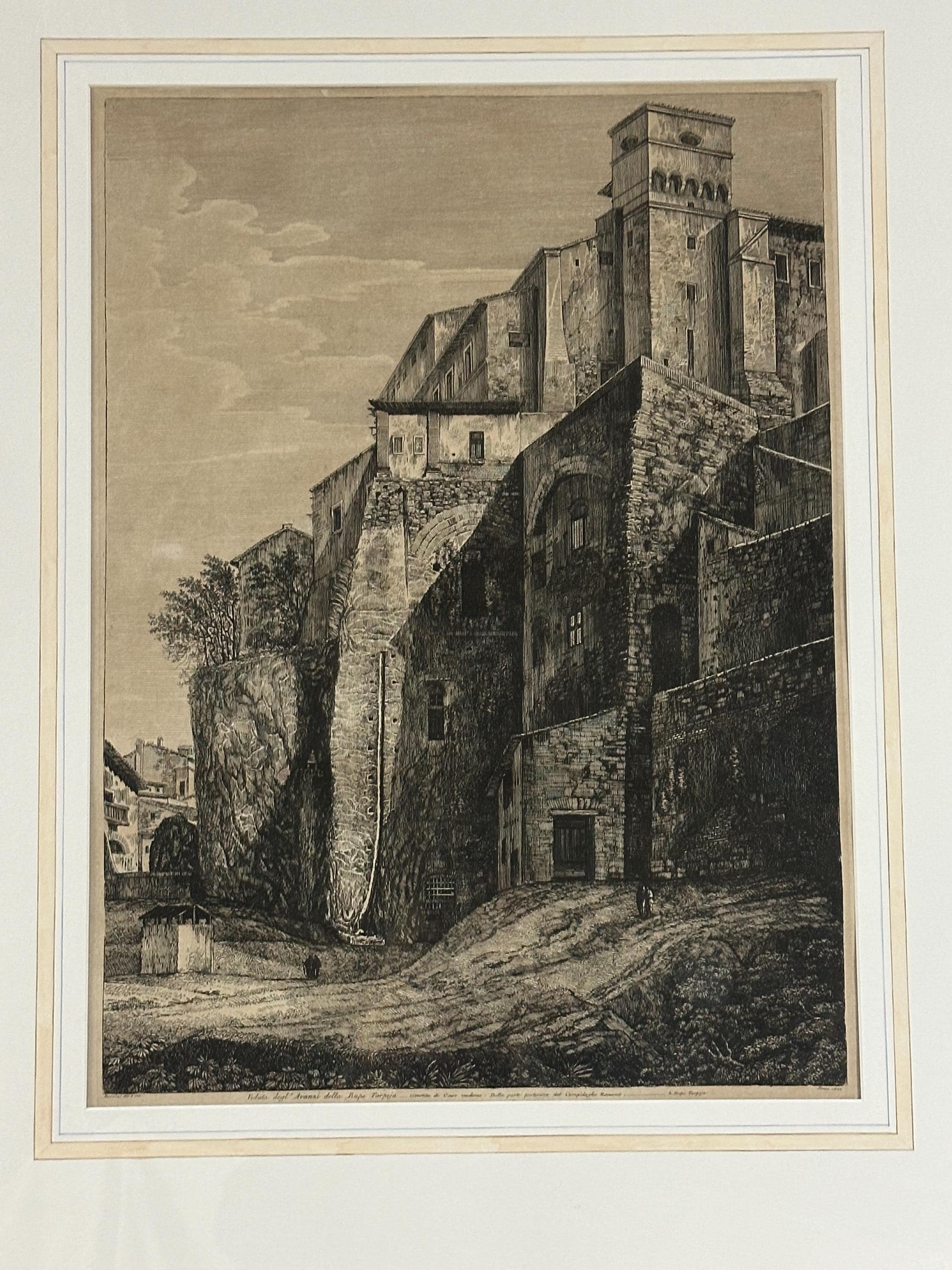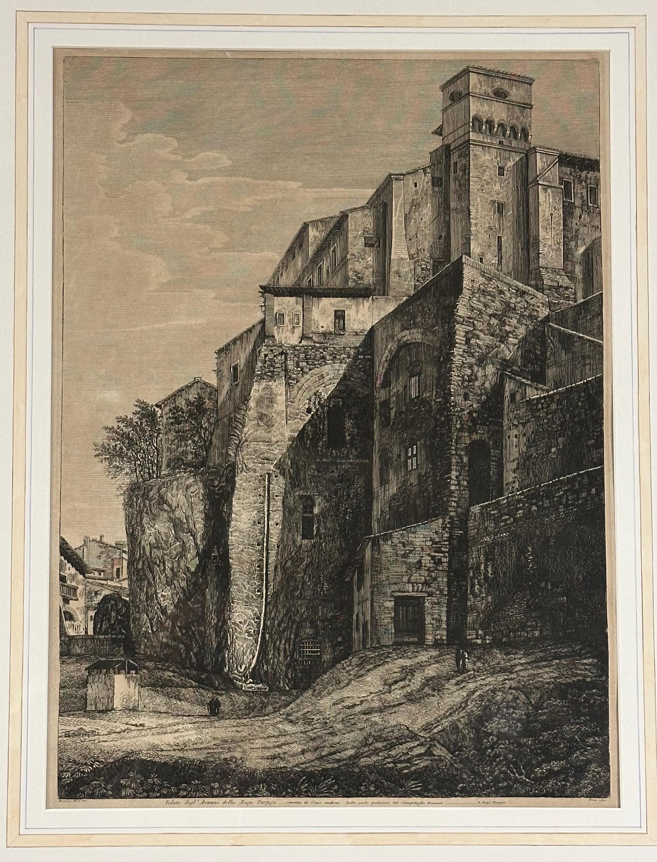 Luigi Rossini (1790-1857) was an architect, painter and watercolorist. Born in Ravenna, as a young man he went to Bologna where he studied art and architecture at the academy and won the prize of the Regno Italico for Architecture. He arrived in Rome around the end of 1813 and beginning of 1814, but after meeting with repeated failures in his attempts to gain architectural commissions decided to follow in the footsteps of Piranesi and began work on a series of views of Rome. He published over 1,000 plates in various collections:
