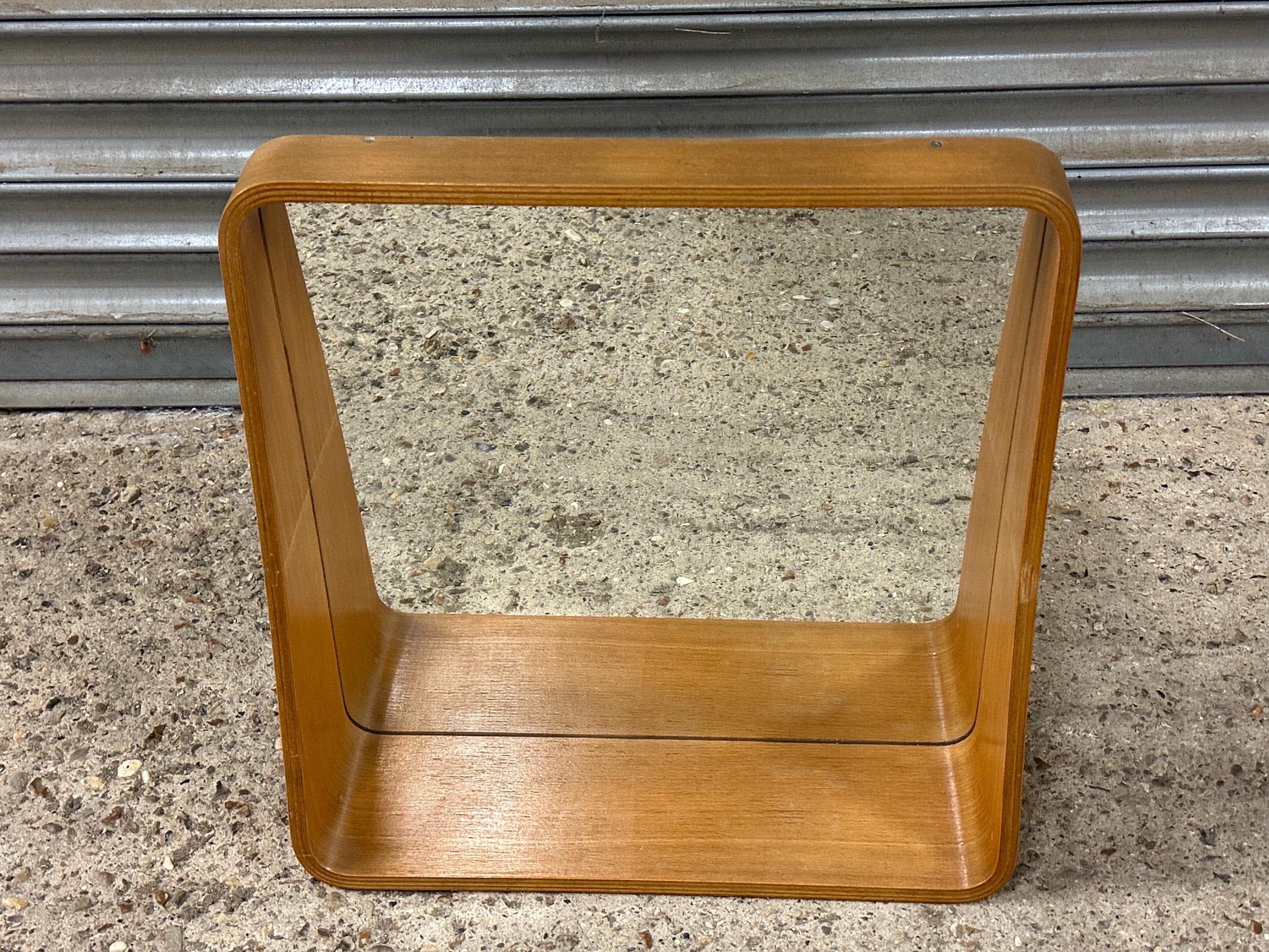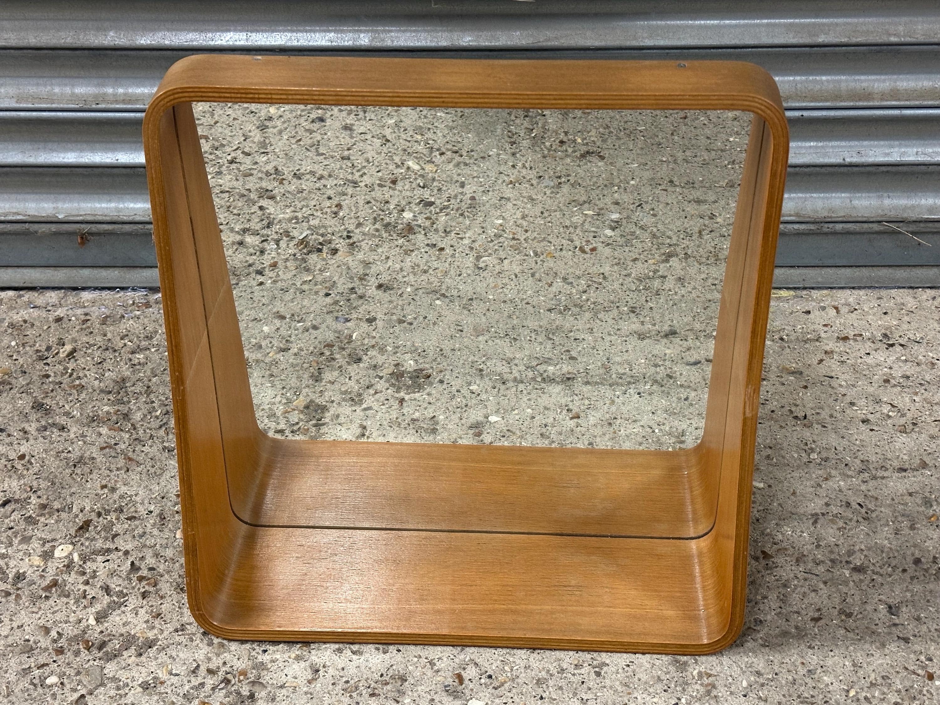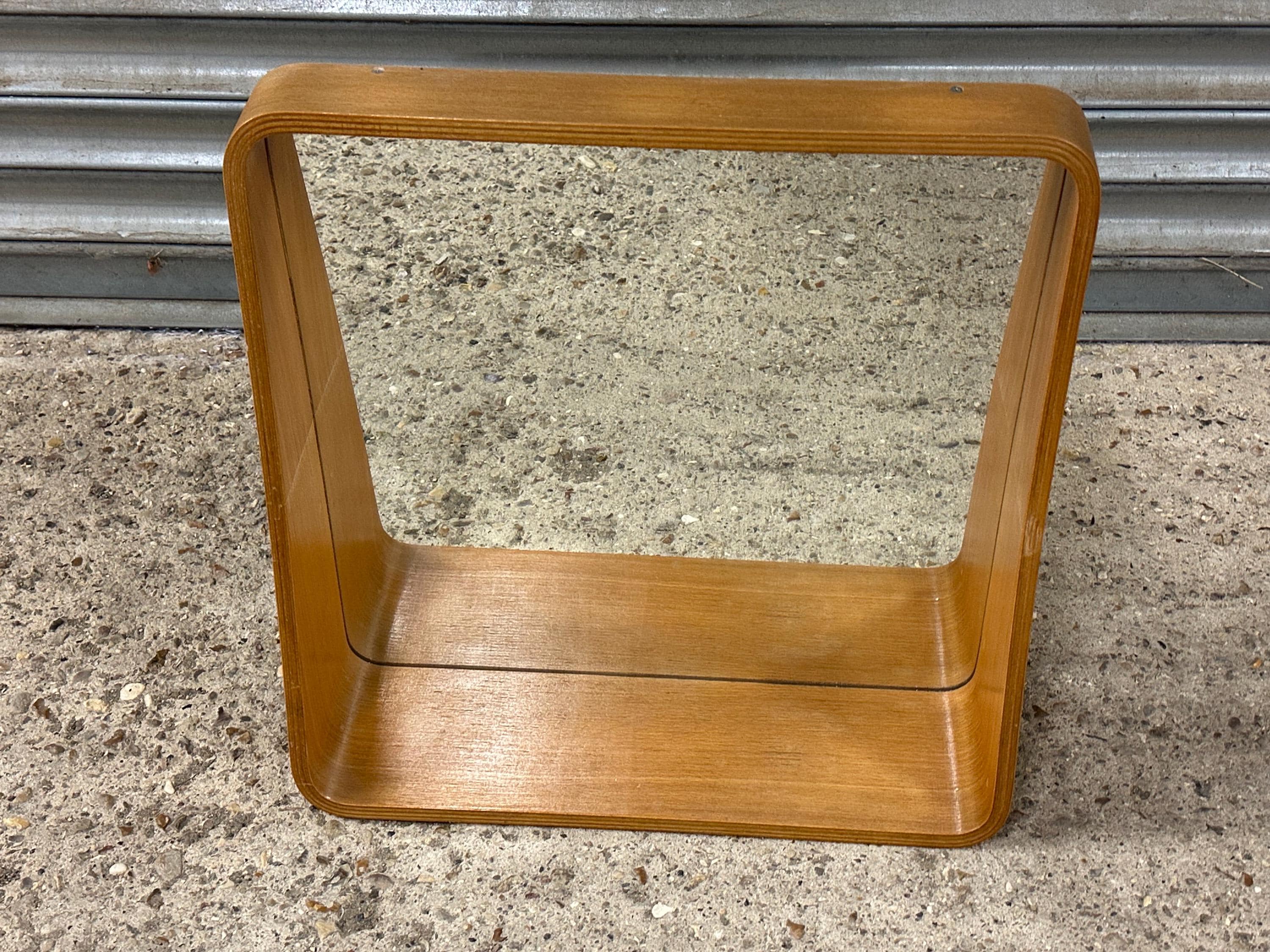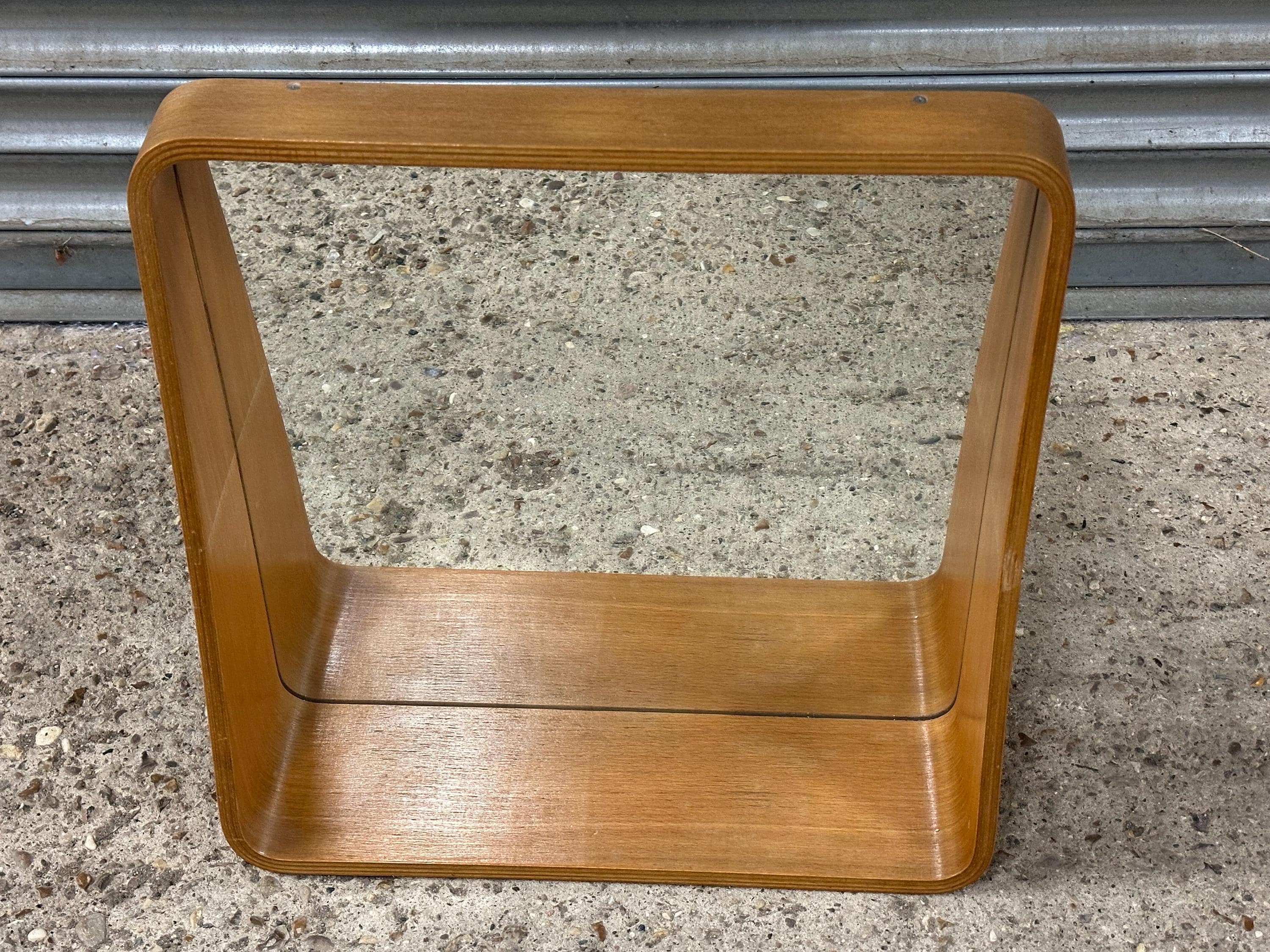 Stylish mid-century modern teak mirror featuring a distinctive curved frame design with an integrated shelf. The warm teak veneer and sleek, minimalist shape reflect the iconic Scandinavian aesthetic of the 1960s–70s.