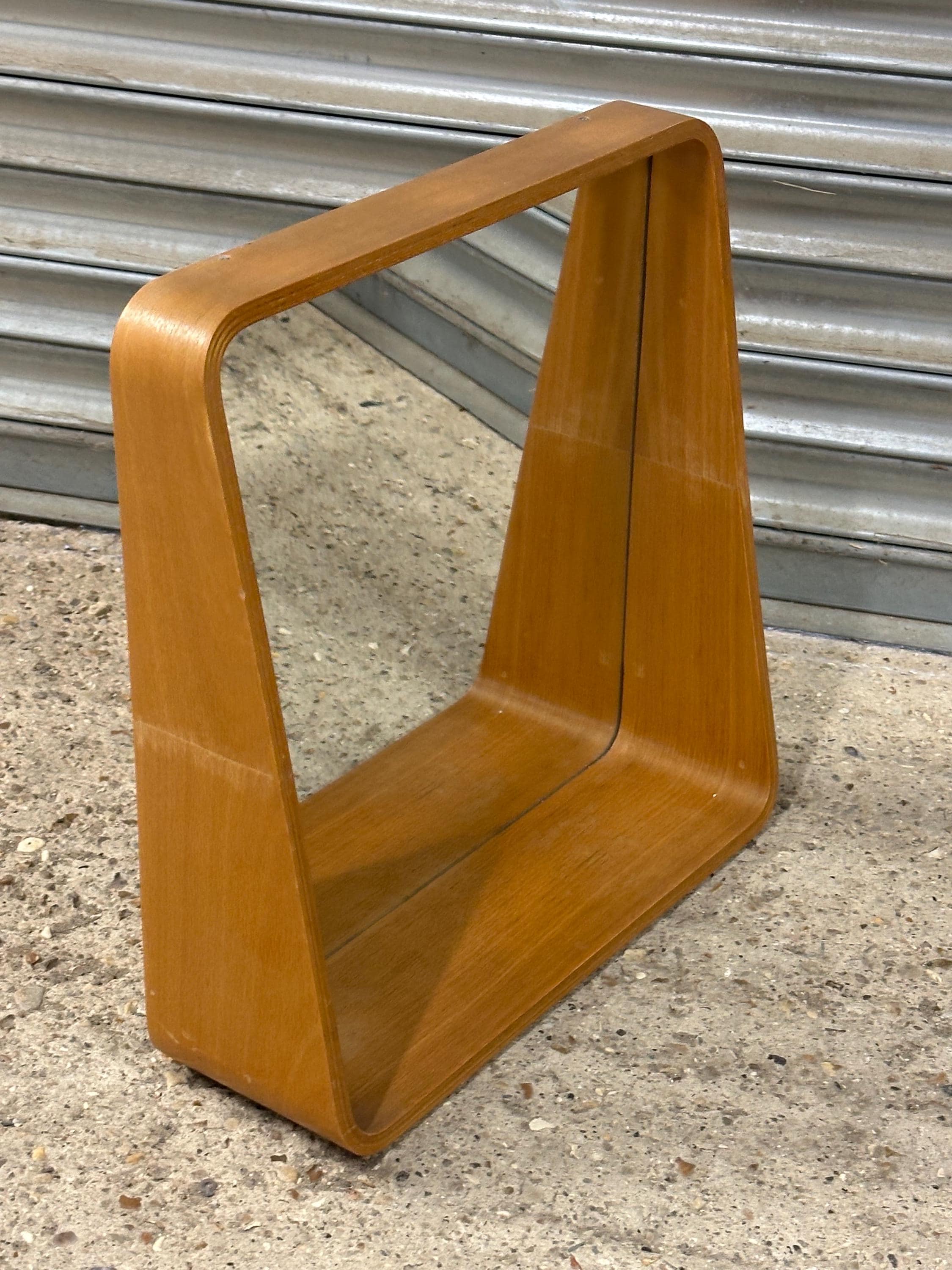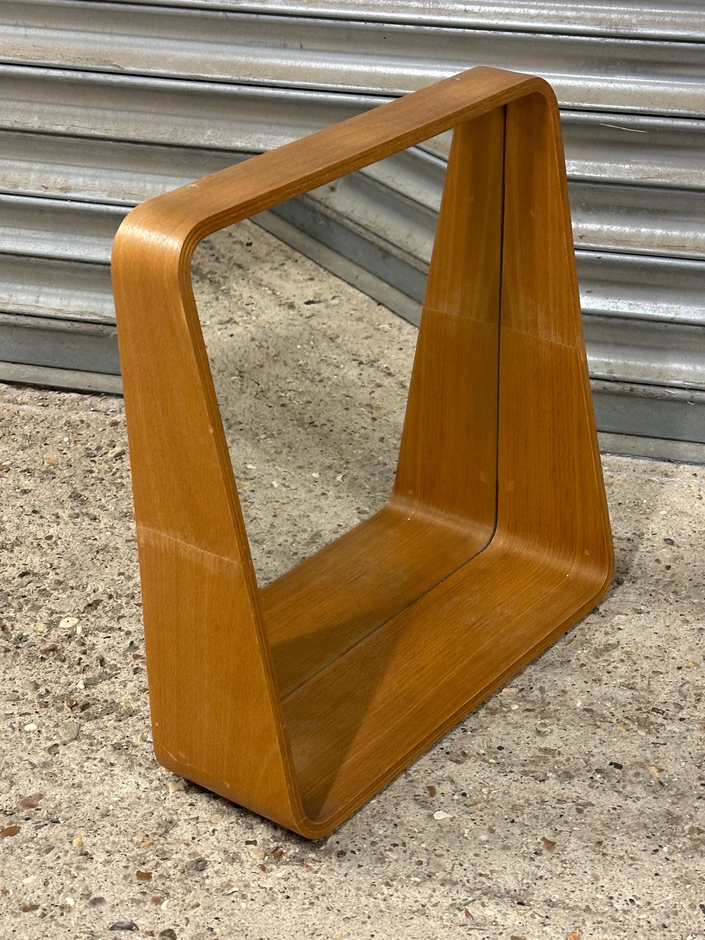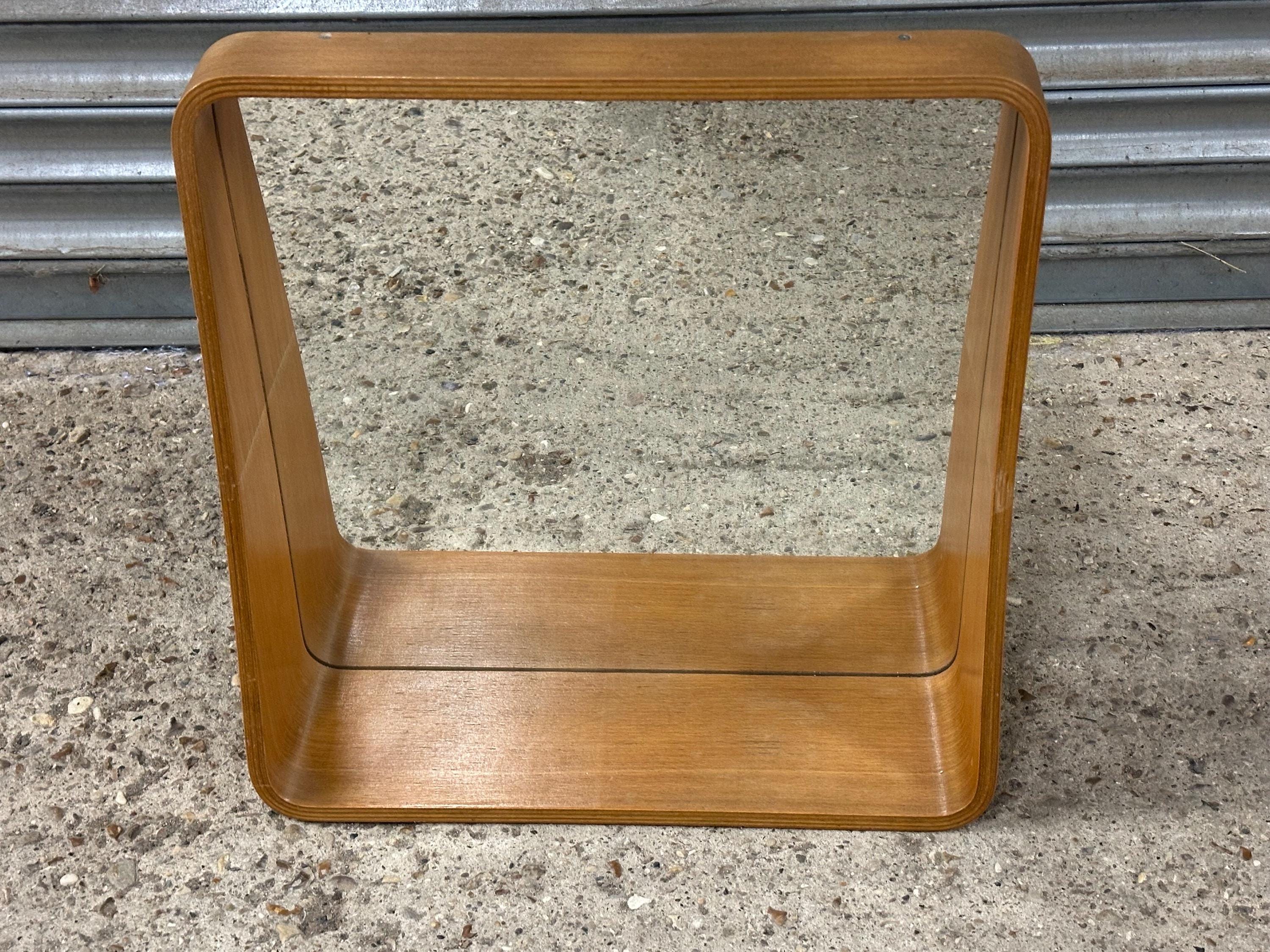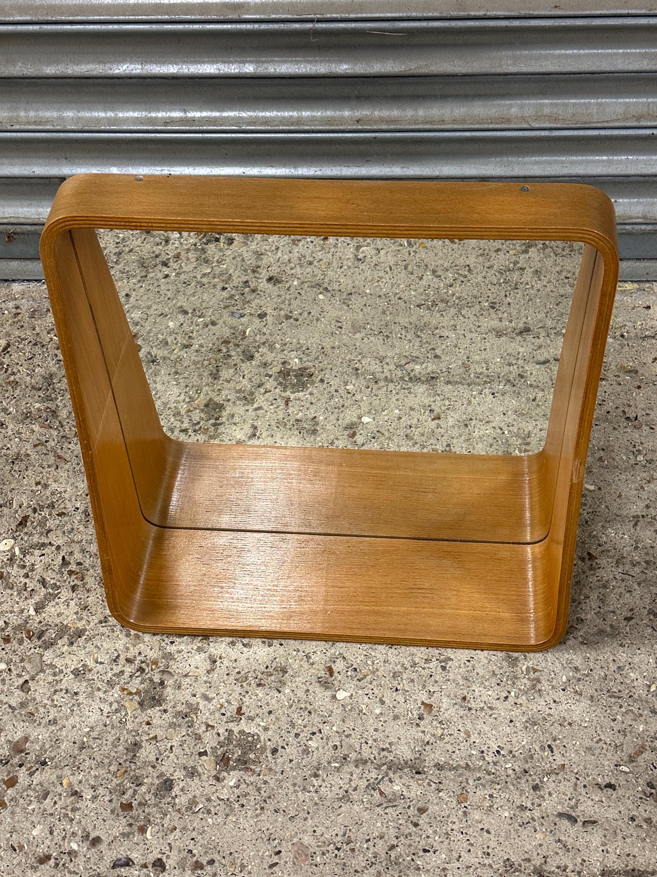 Stylish mid-century modern teak mirror featuring a distinctive curved frame design with an integrated shelf. The warm teak veneer and sleek, minimalist shape reflect the iconic Scandinavian aesthetic of the 1960s–70s.