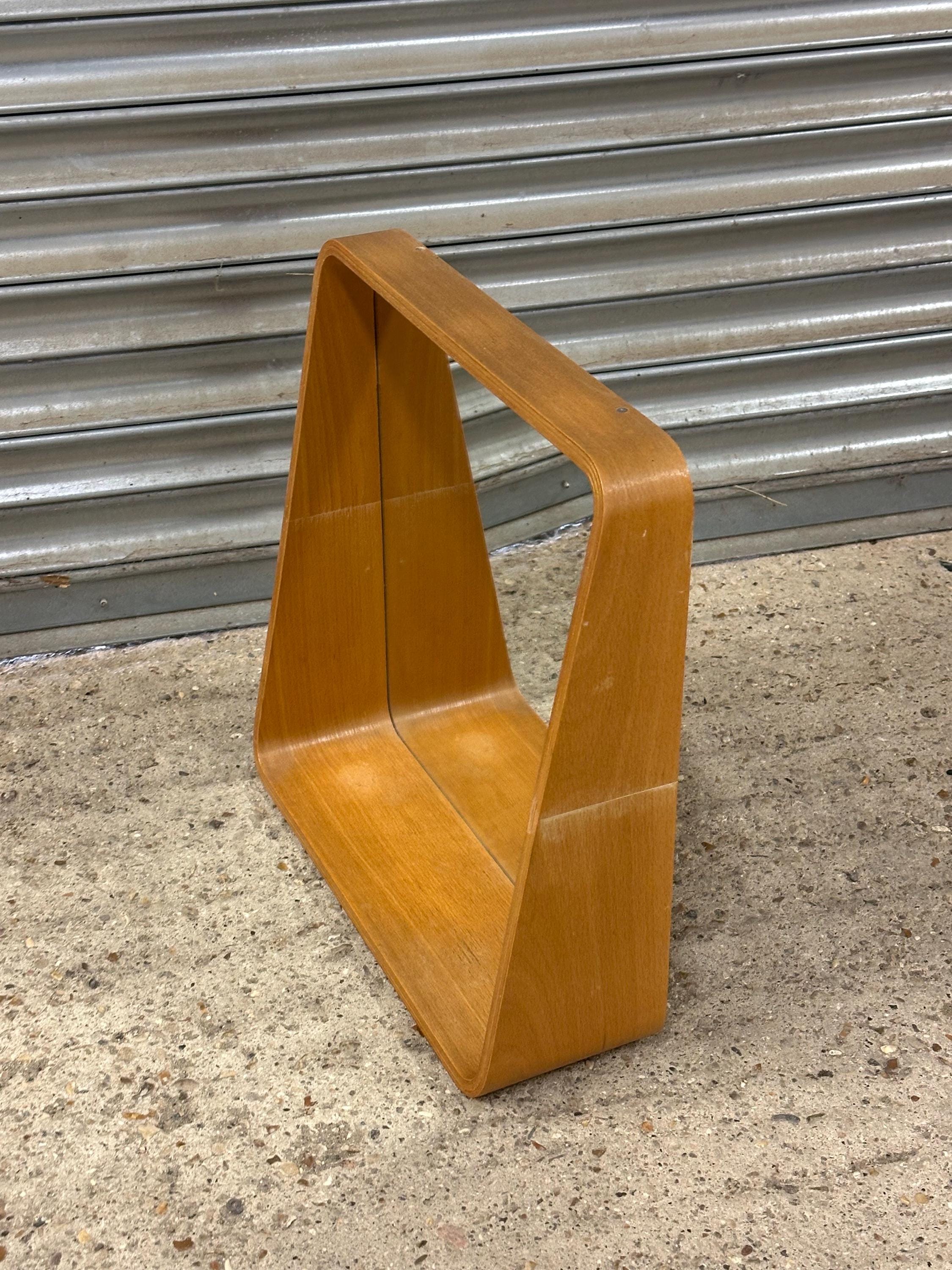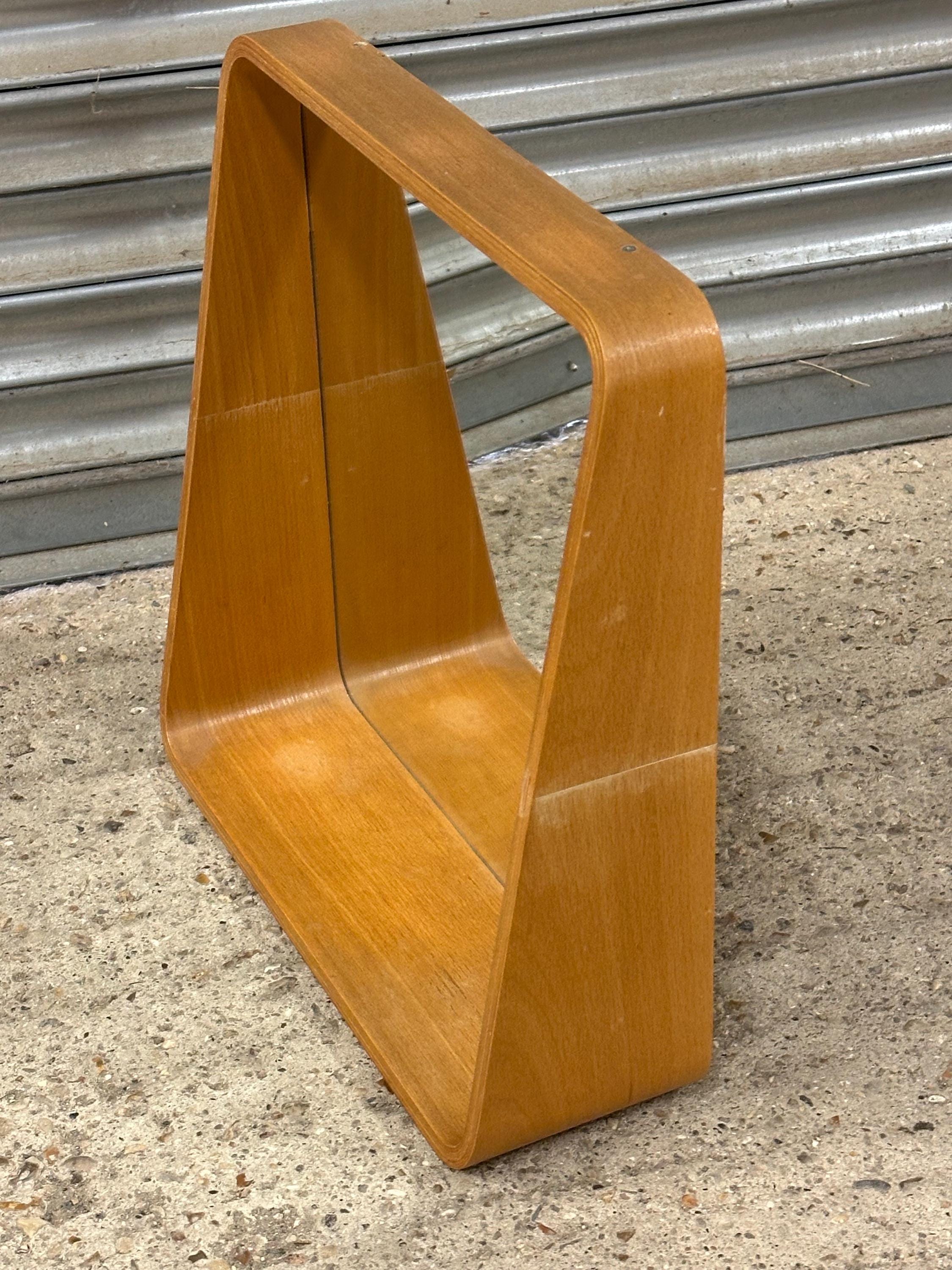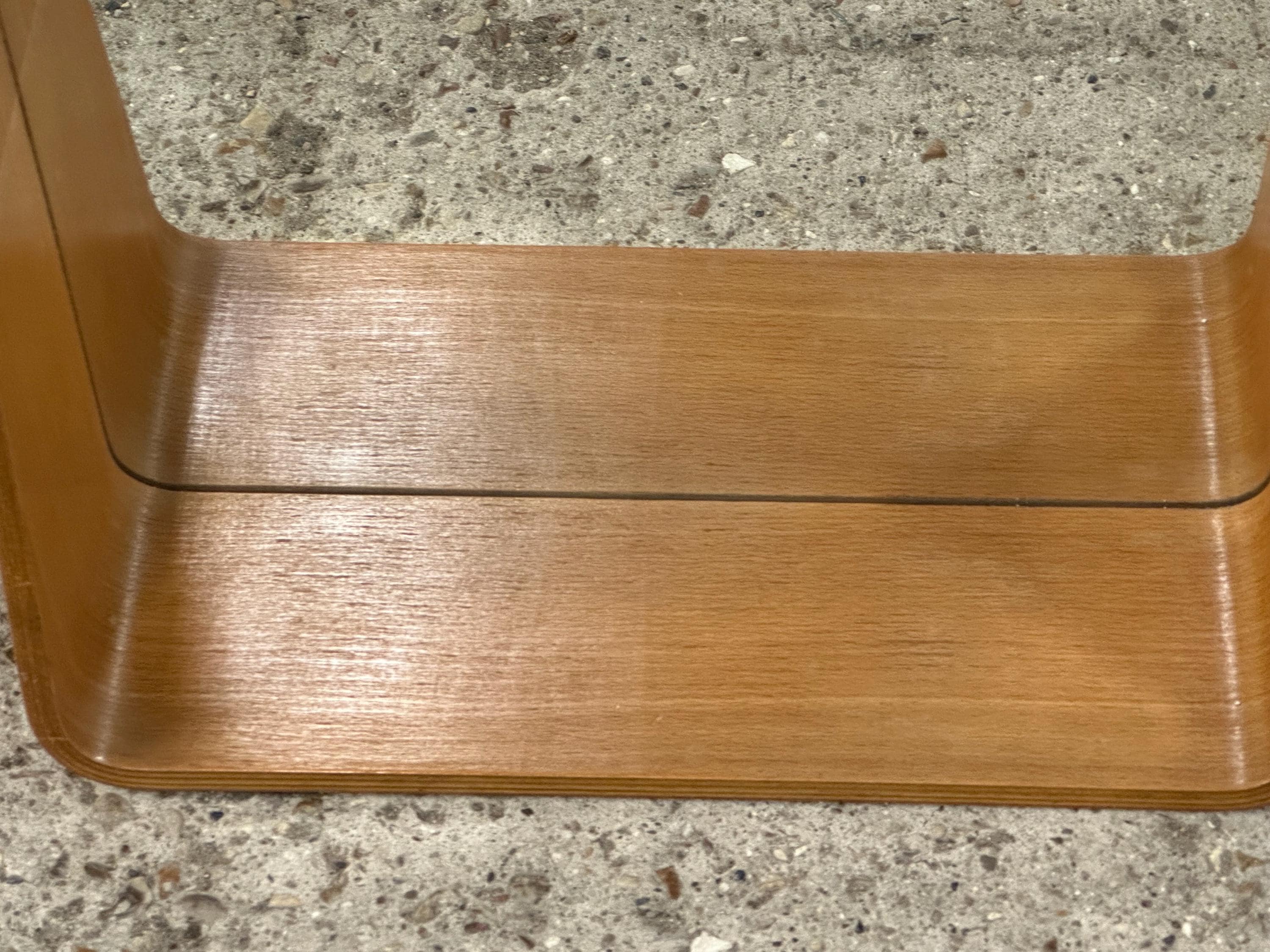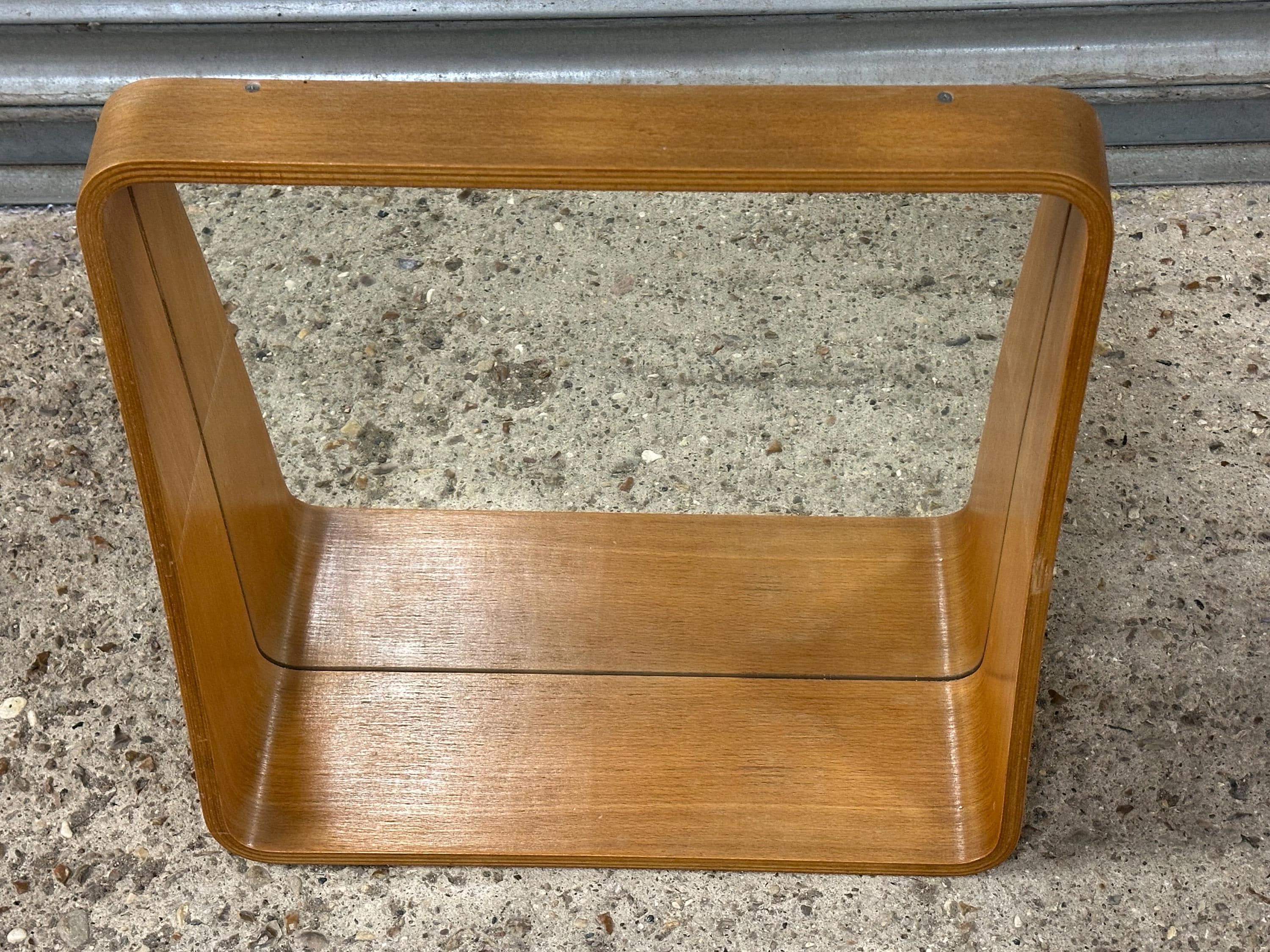 Stylish mid-century modern teak mirror featuring a distinctive curved frame design with an integrated shelf. The warm teak veneer and sleek, minimalist shape reflect the iconic Scandinavian aesthetic of the 1960s–70s.