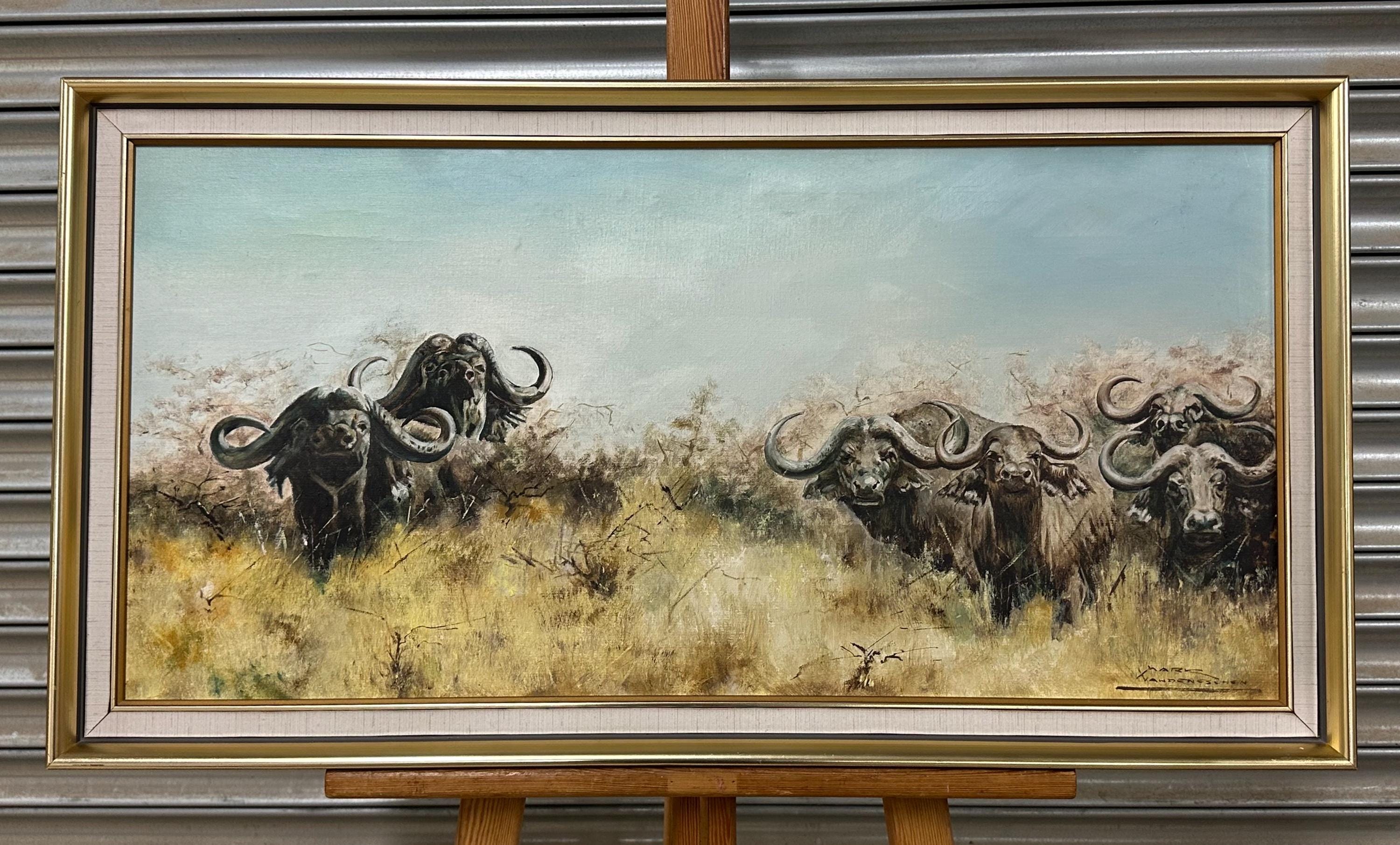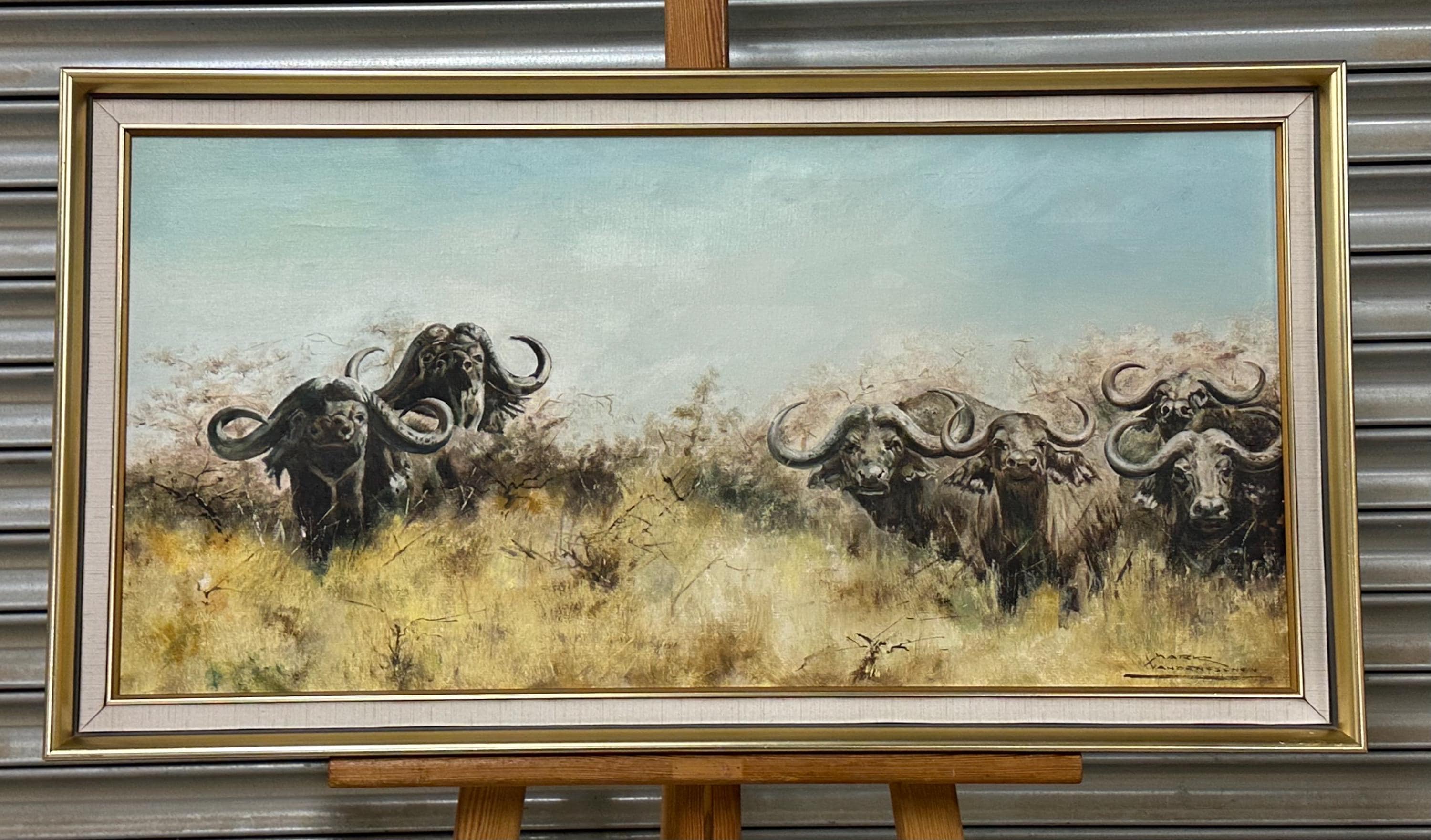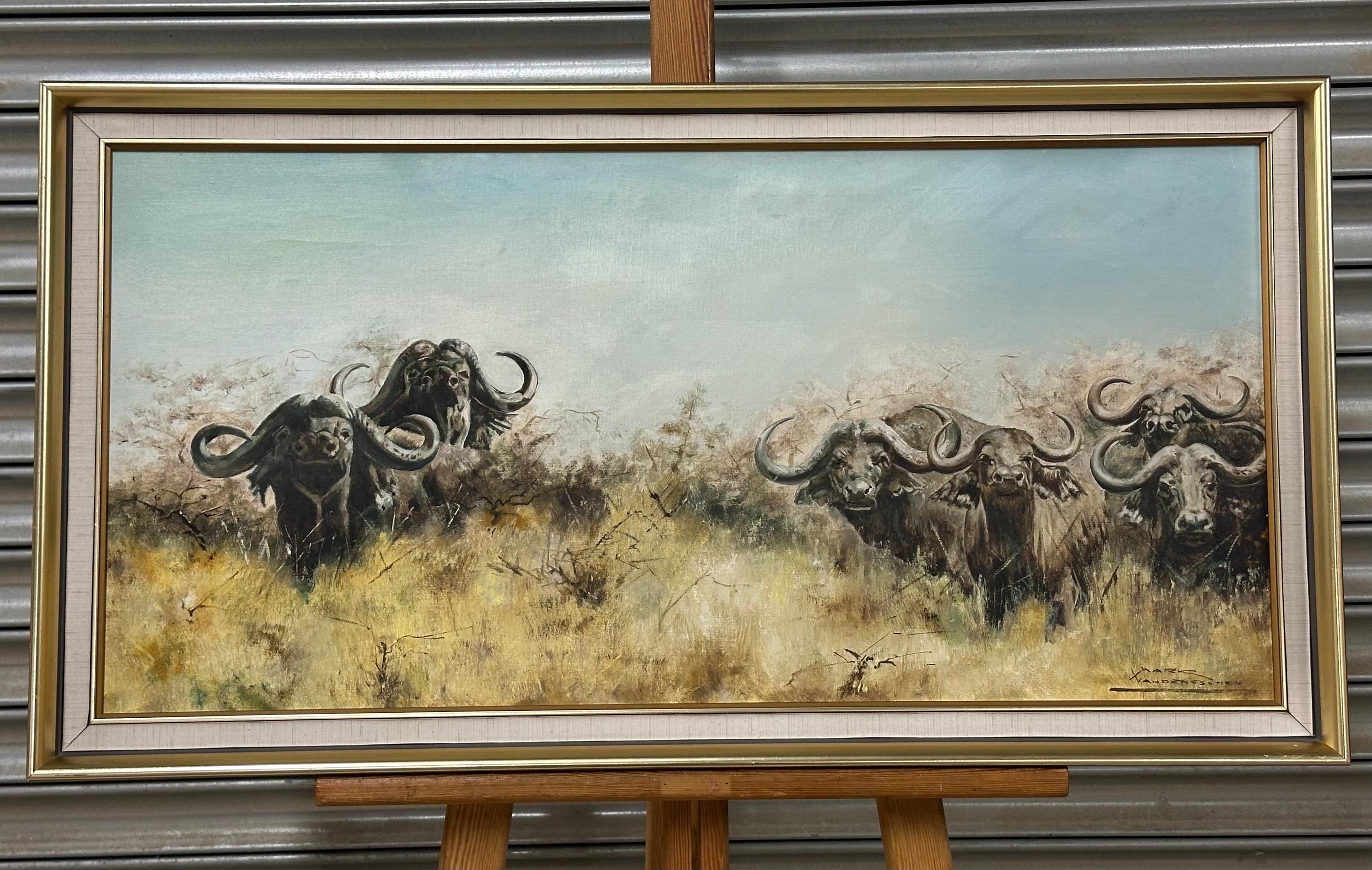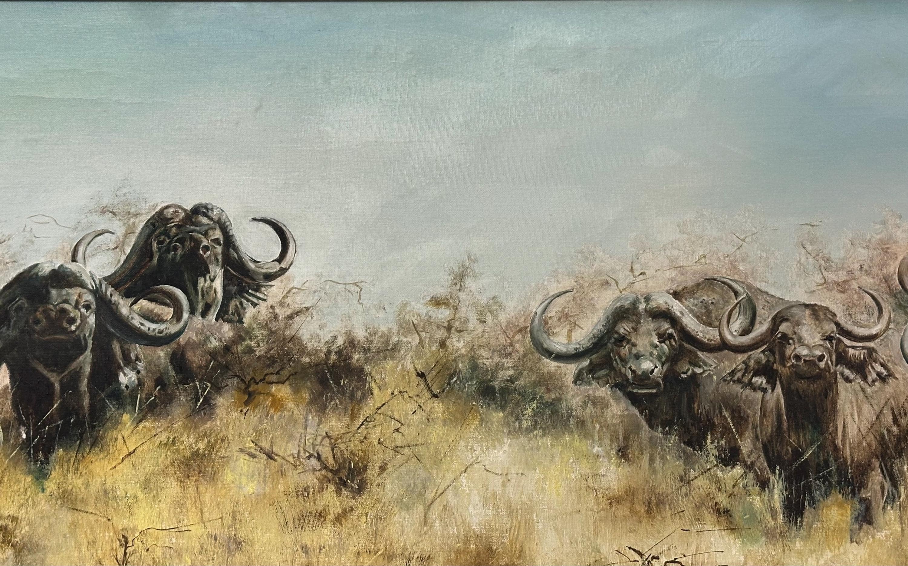 A striking and atmospheric original oil painting by the accomplished wildlife artist Mark Van Den Eschen, depicting a dramatic herd of Cape buffalo charging across the African savannah.