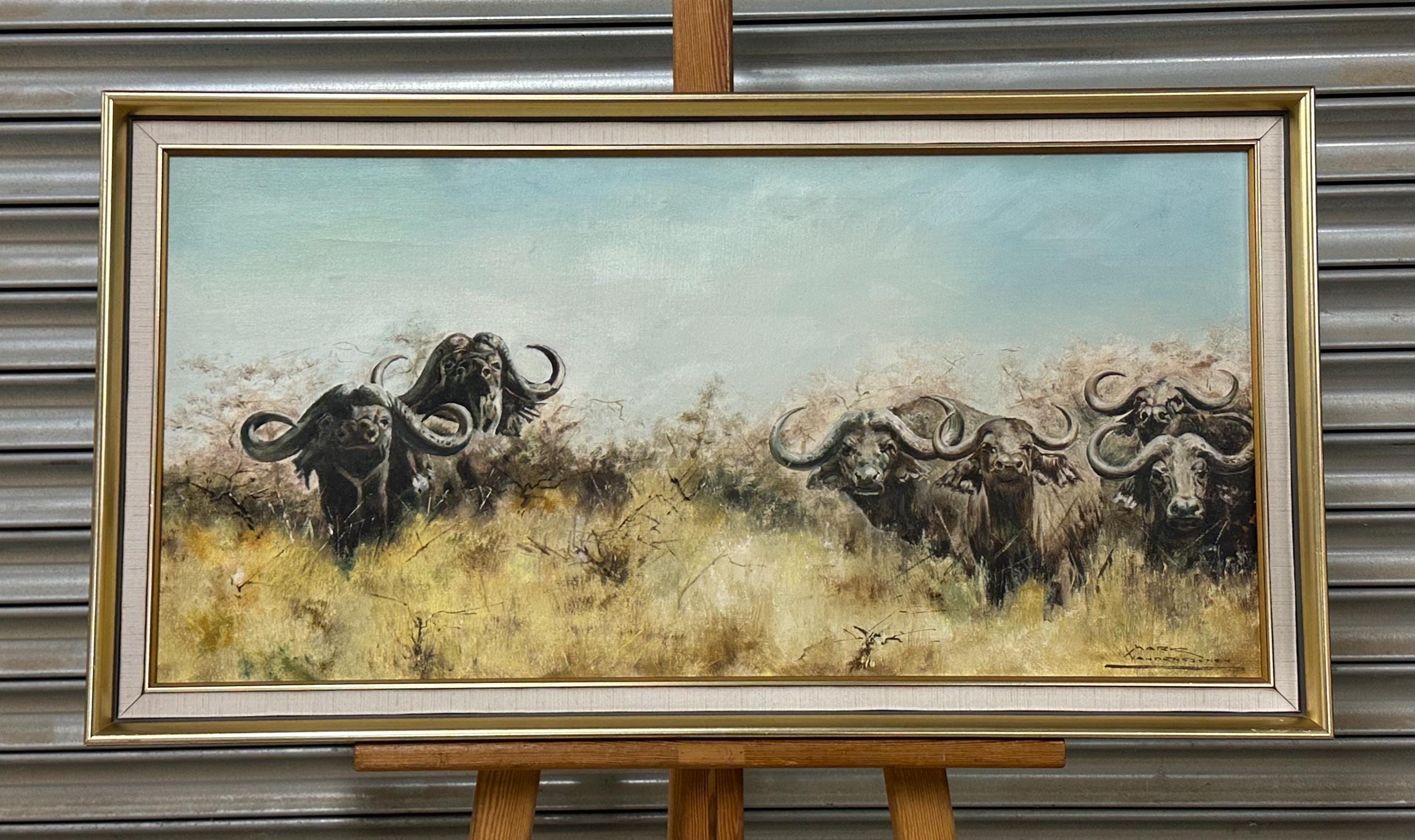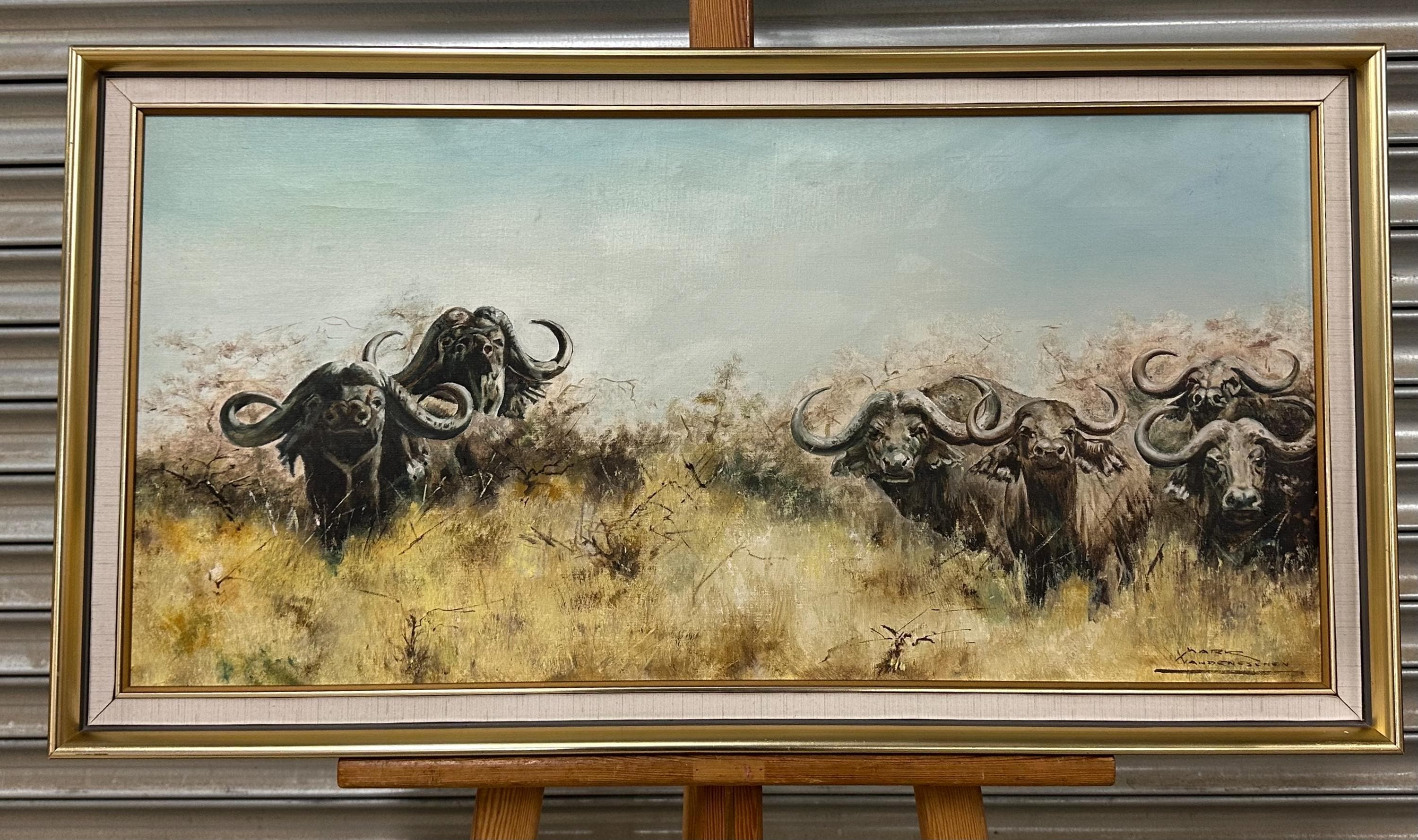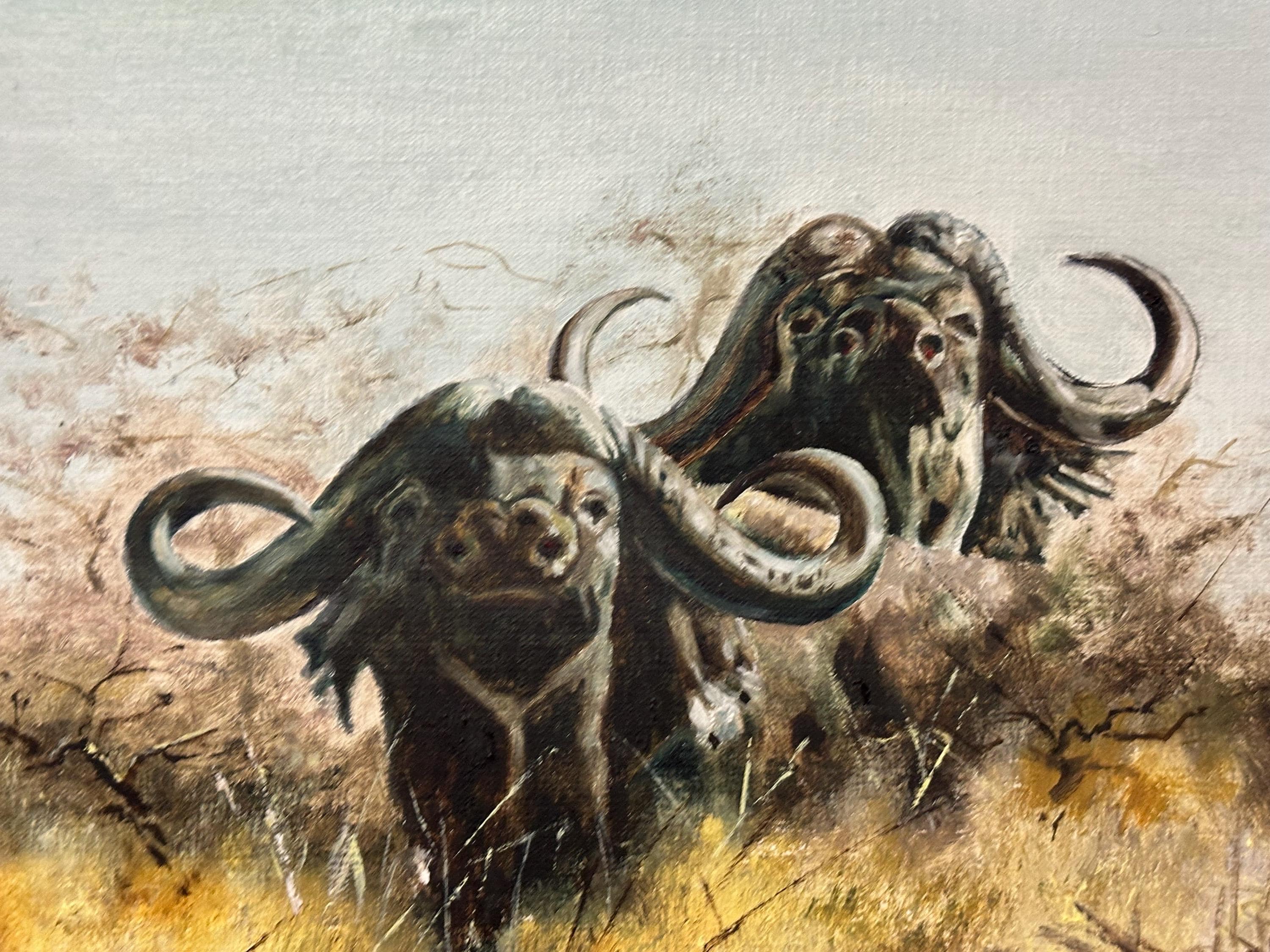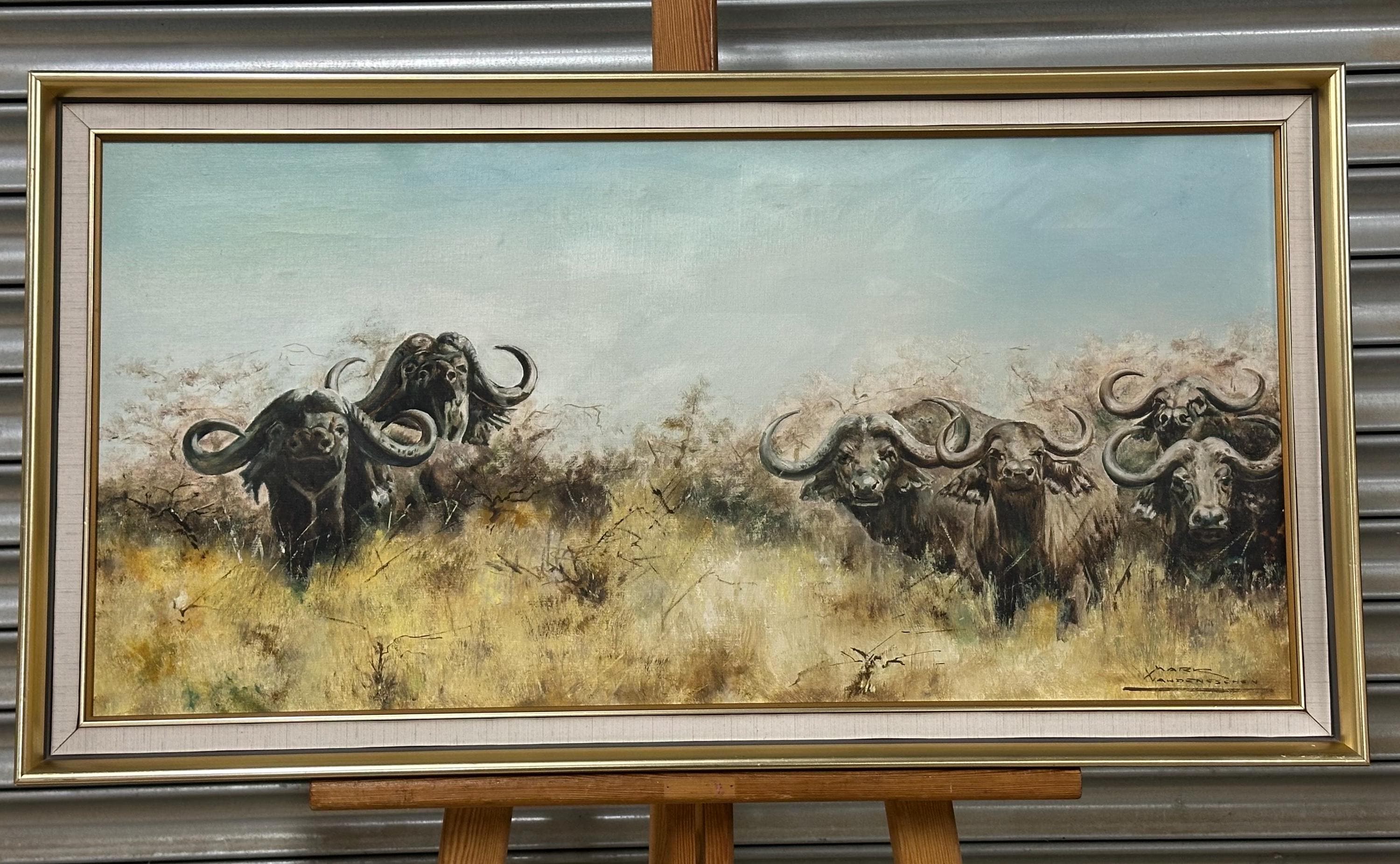 A striking and atmospheric original oil painting by the accomplished wildlife artist Mark Van Den Eschen, depicting a dramatic herd of Cape buffalo charging across the African savannah.