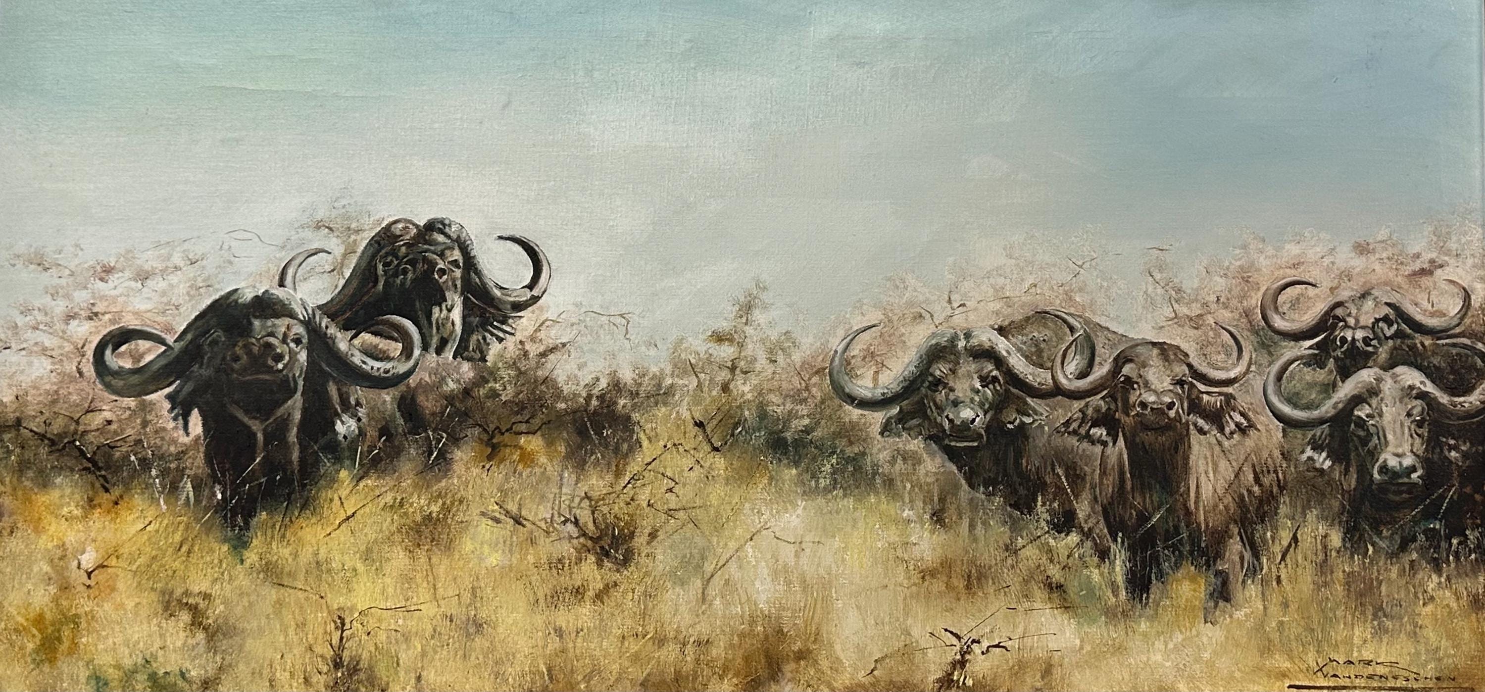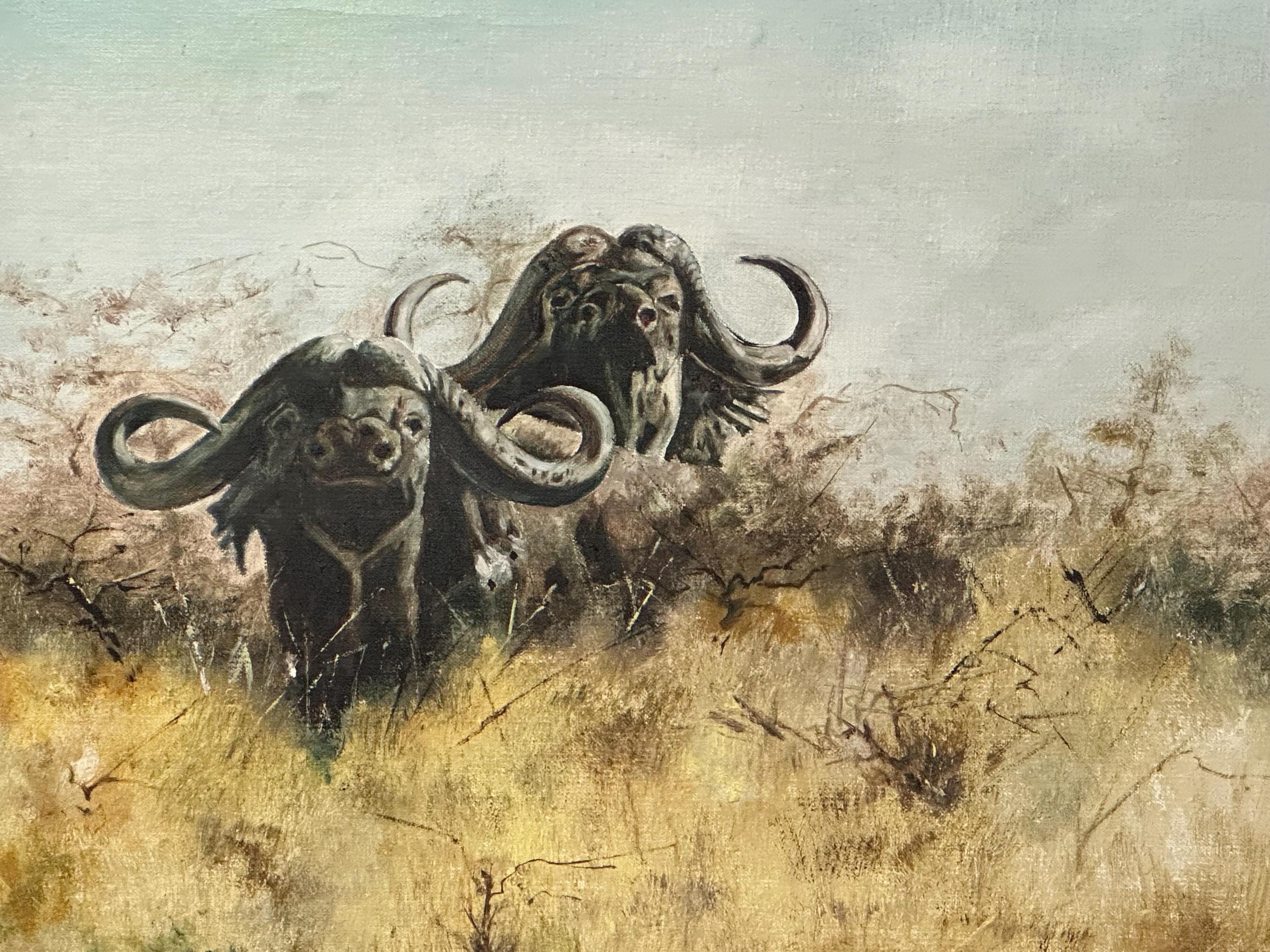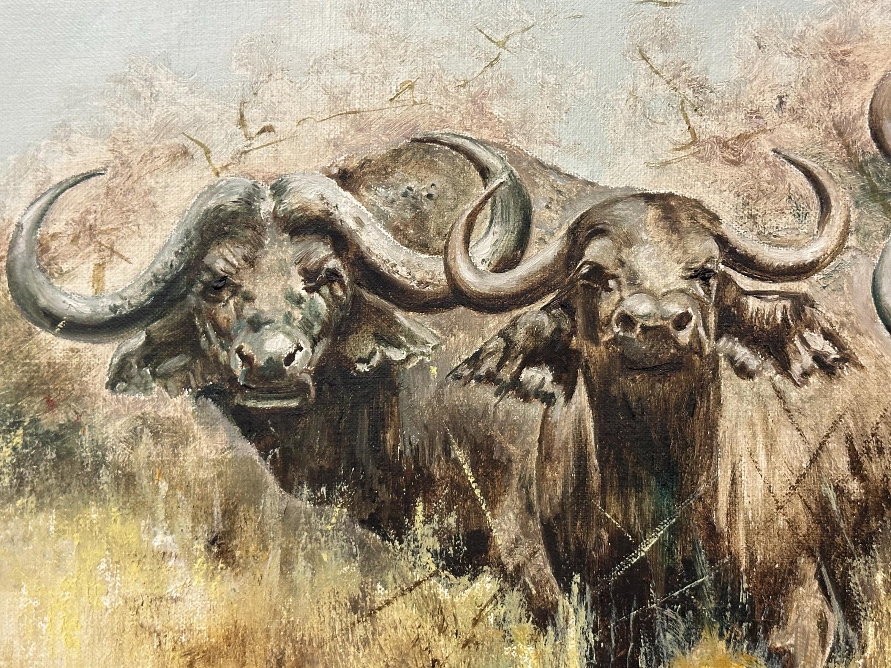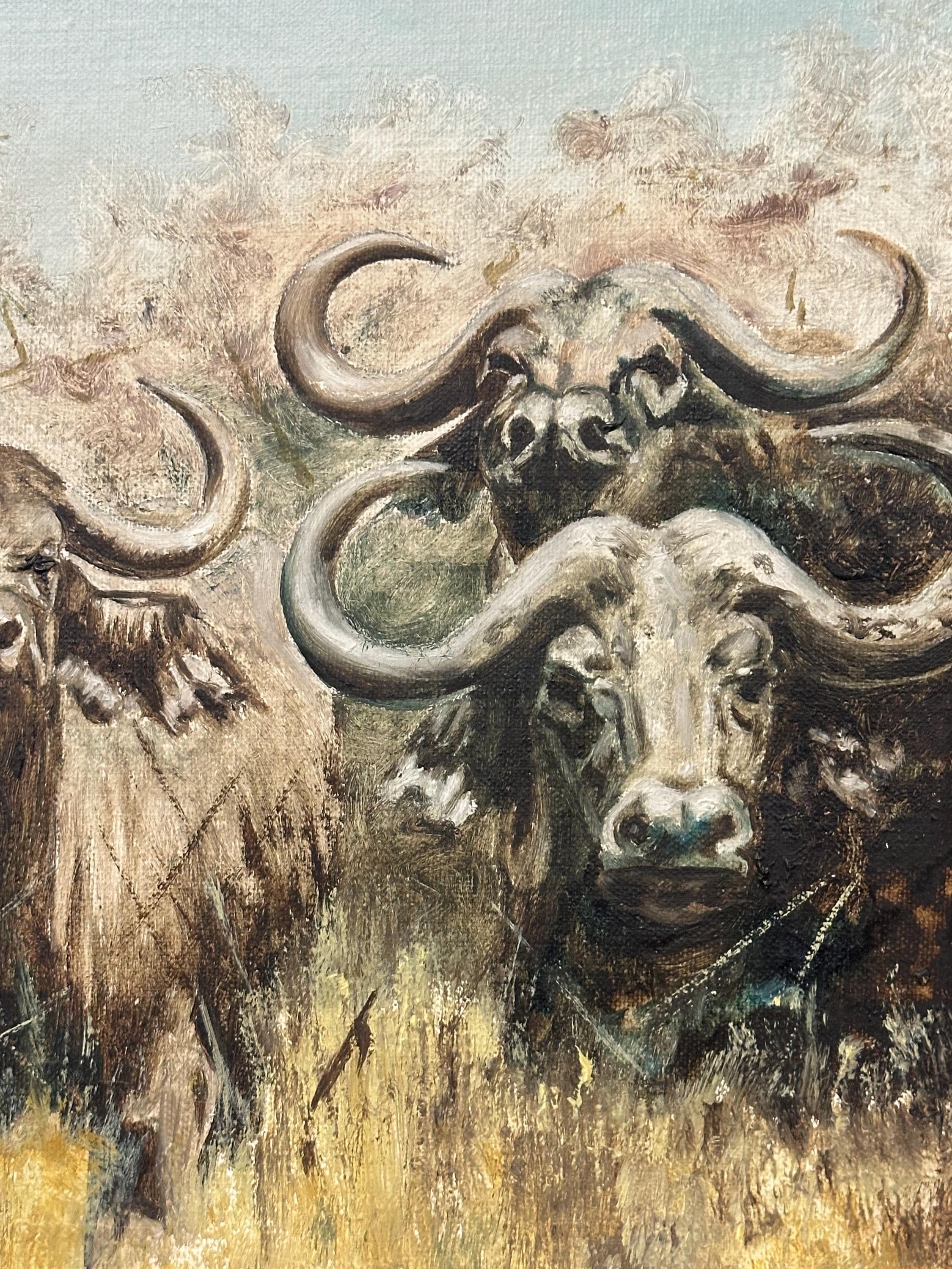 A striking and atmospheric original oil painting by the accomplished wildlife artist Mark Van Den Eschen, depicting a dramatic herd of Cape buffalo charging across the African savannah.