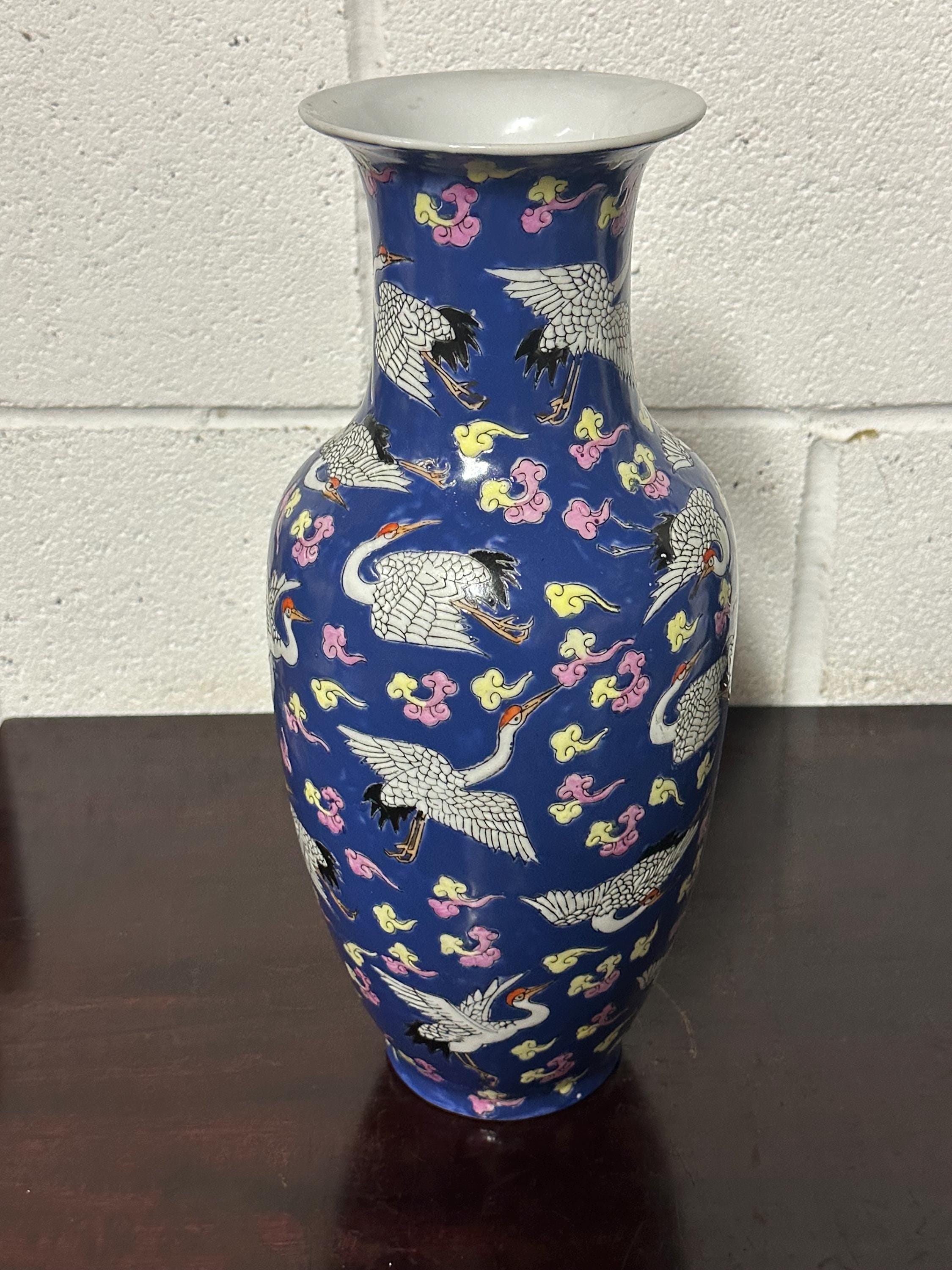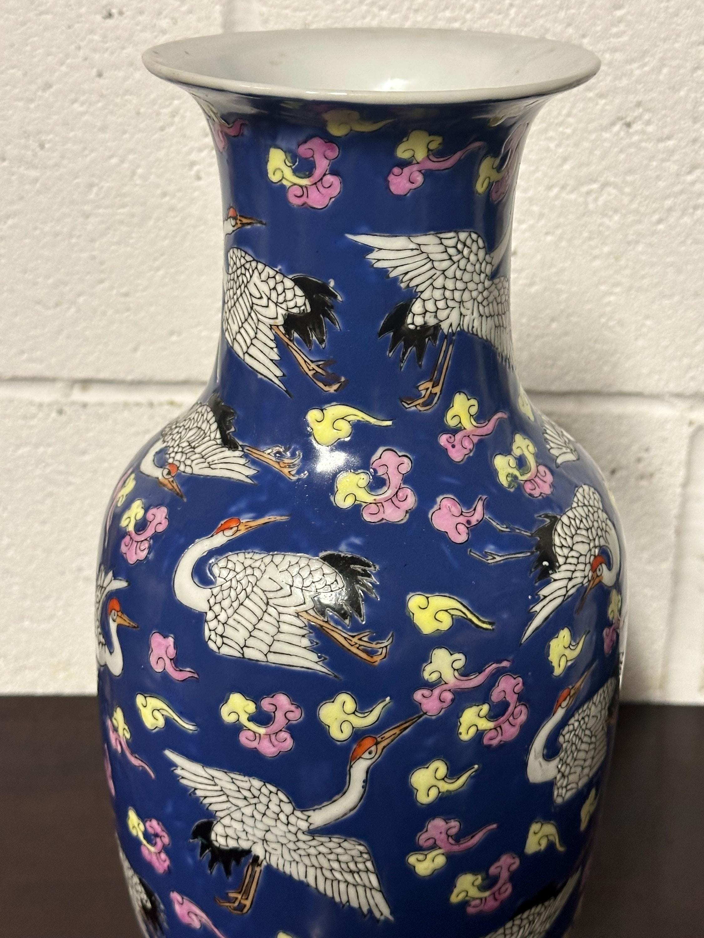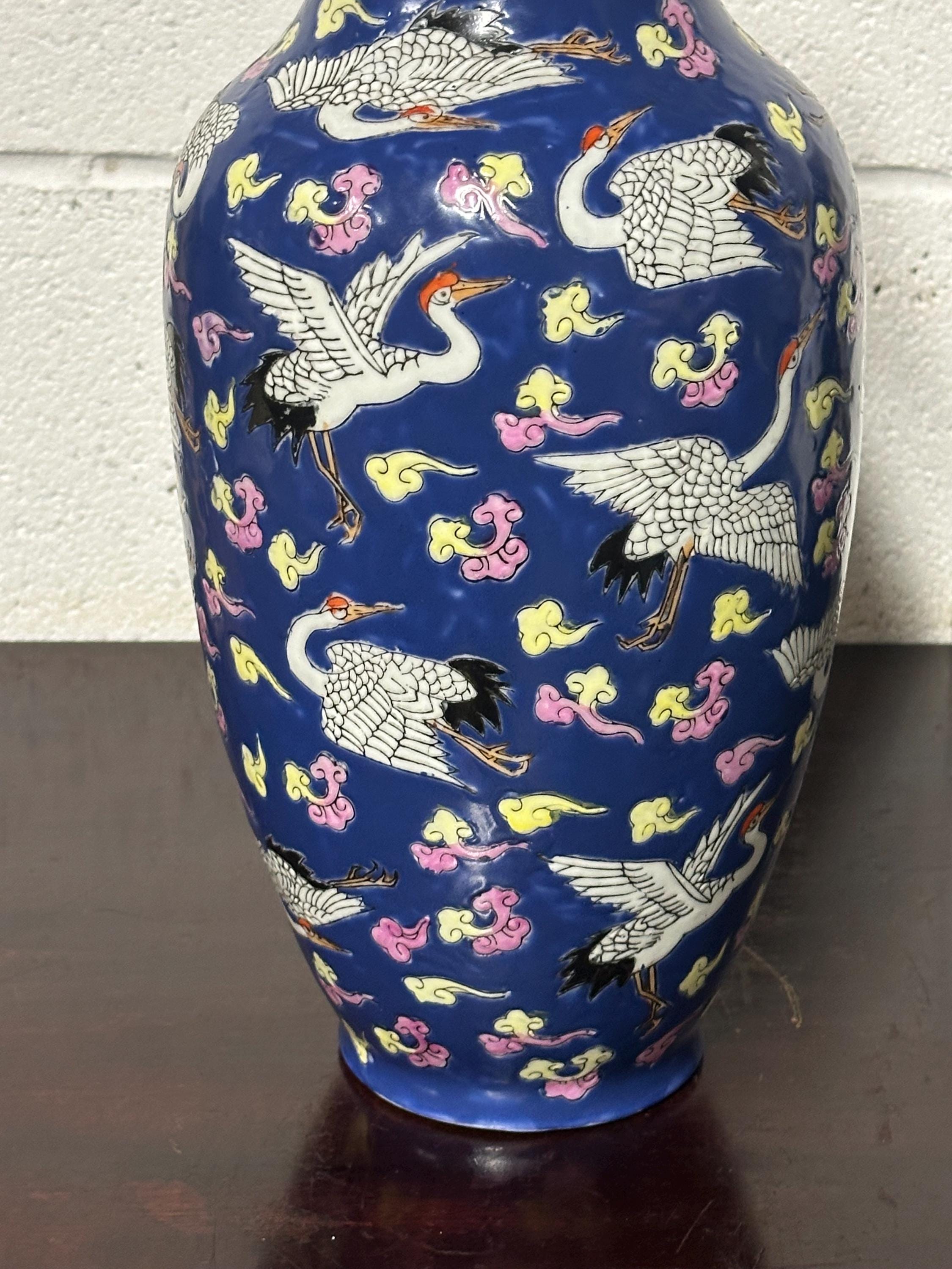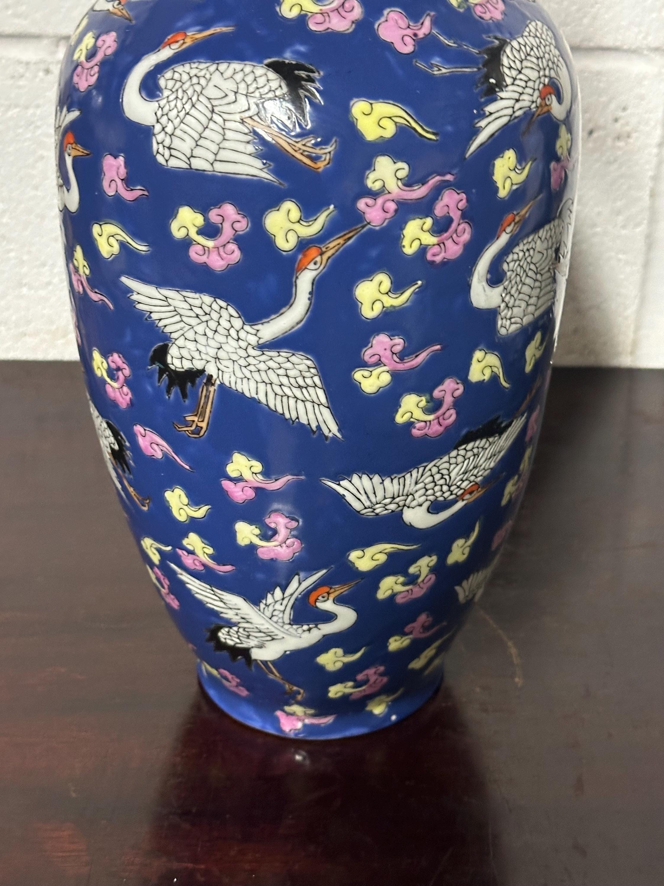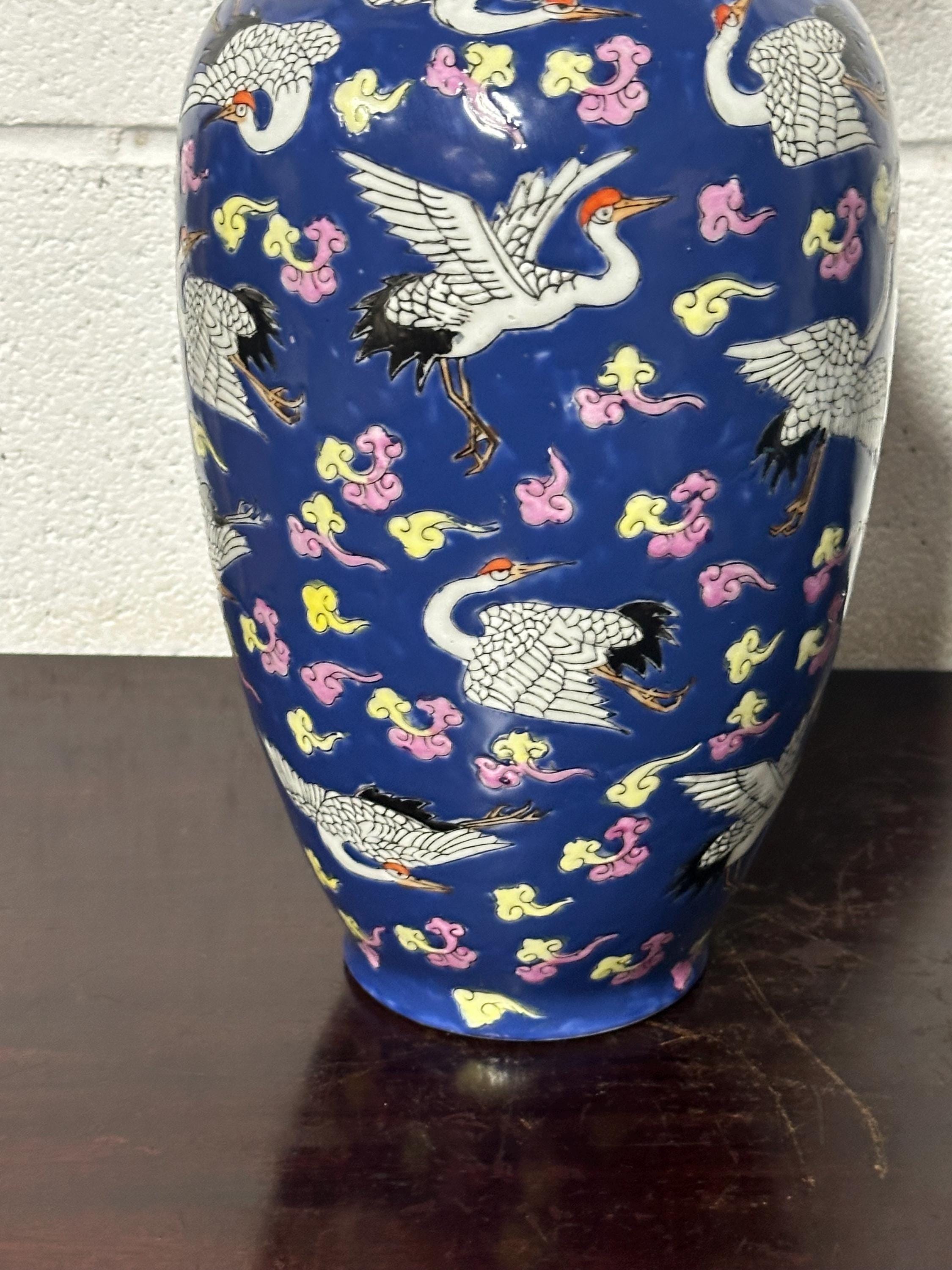 A striking vintage Chinese Famille Rose porcelain vase featuring an elegant deep blue ground richly decorated with flying cranes among colourful scrolling clouds. The design is beautifully hand-painted in fine detail with white cranes outlined in black and highlighted with red crests — a traditional Chinese symbol of longevity and good fortune.