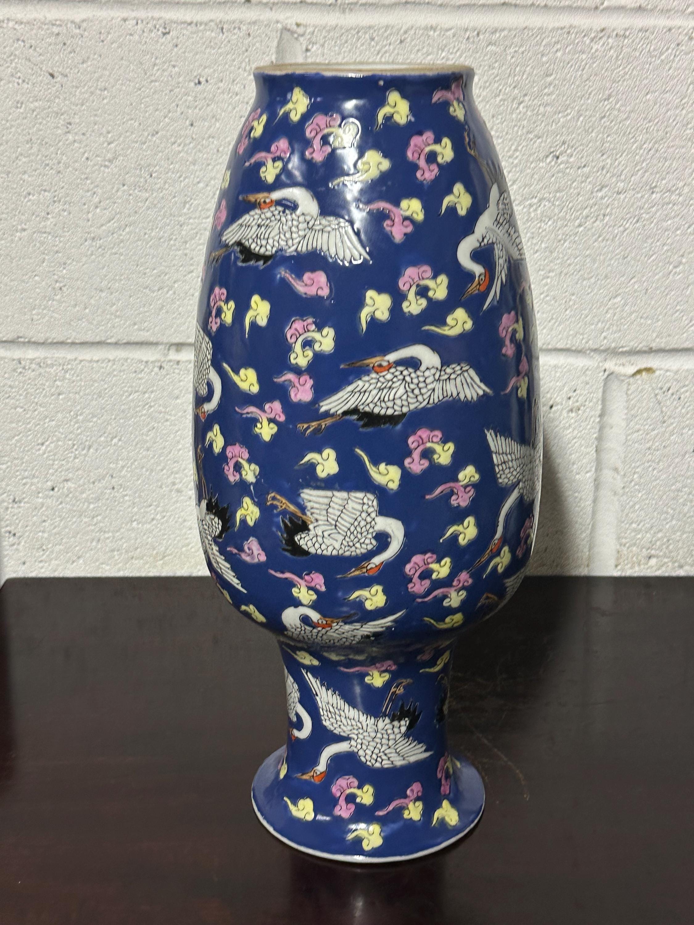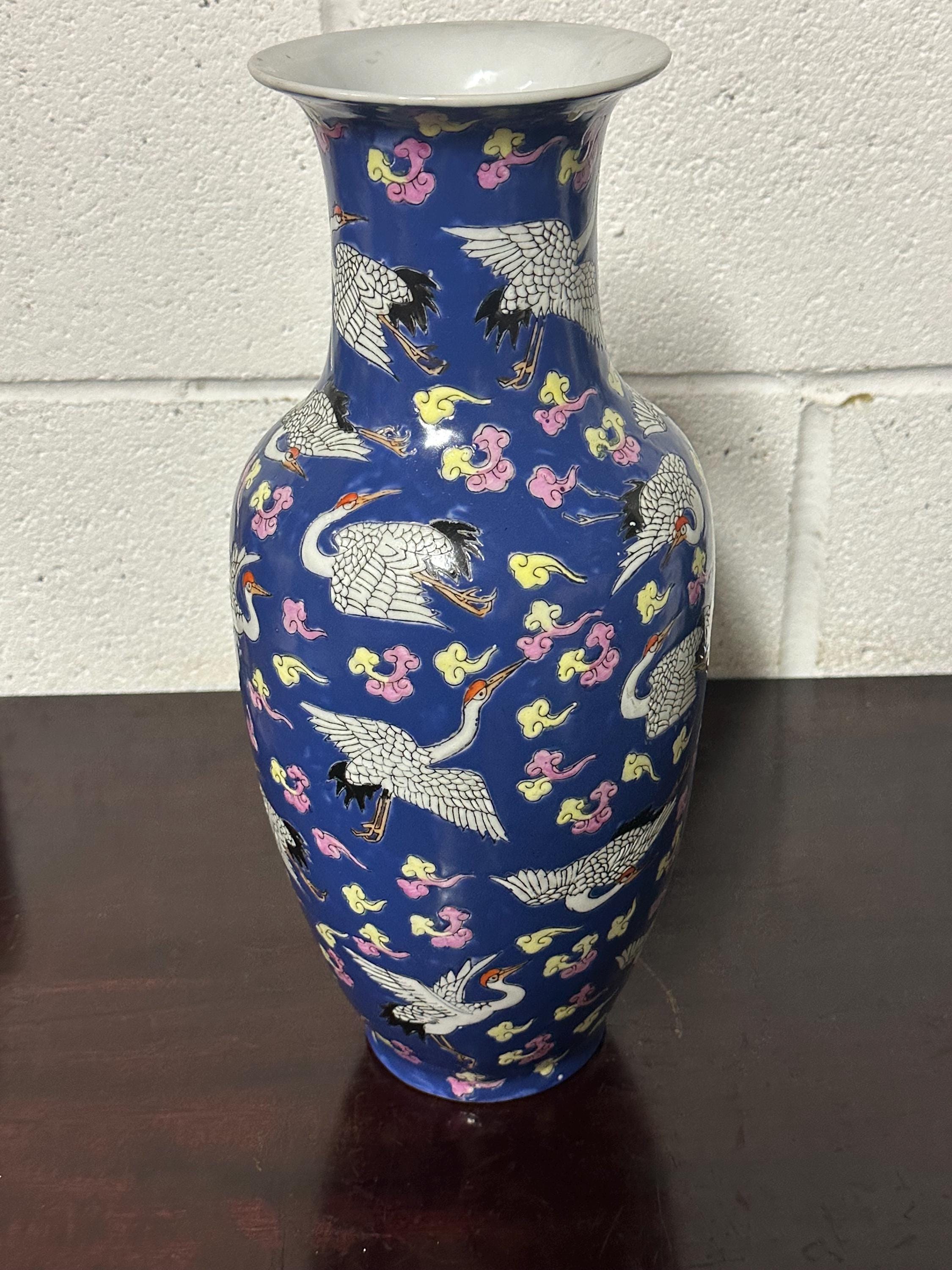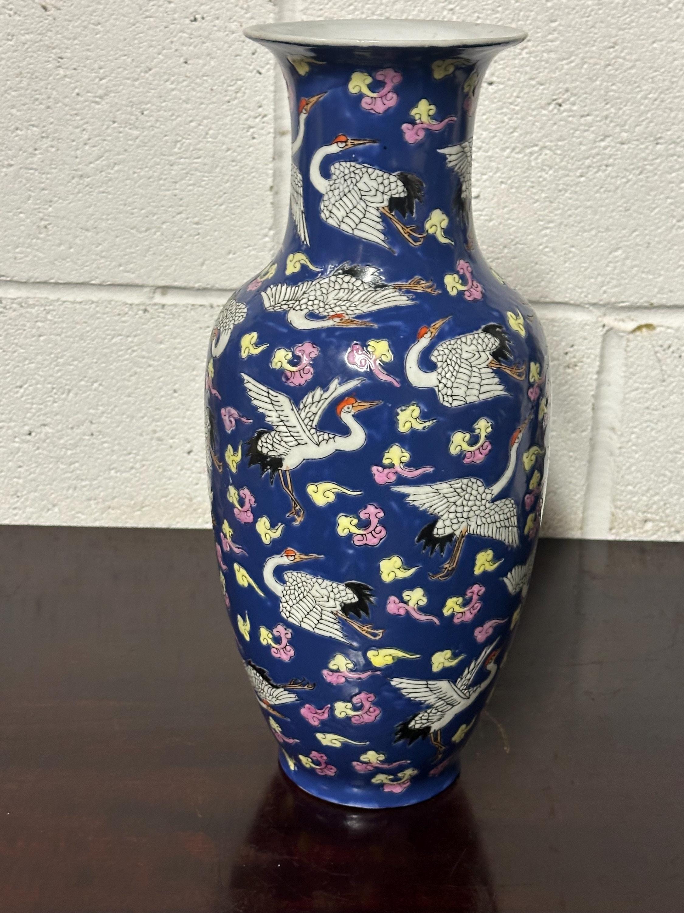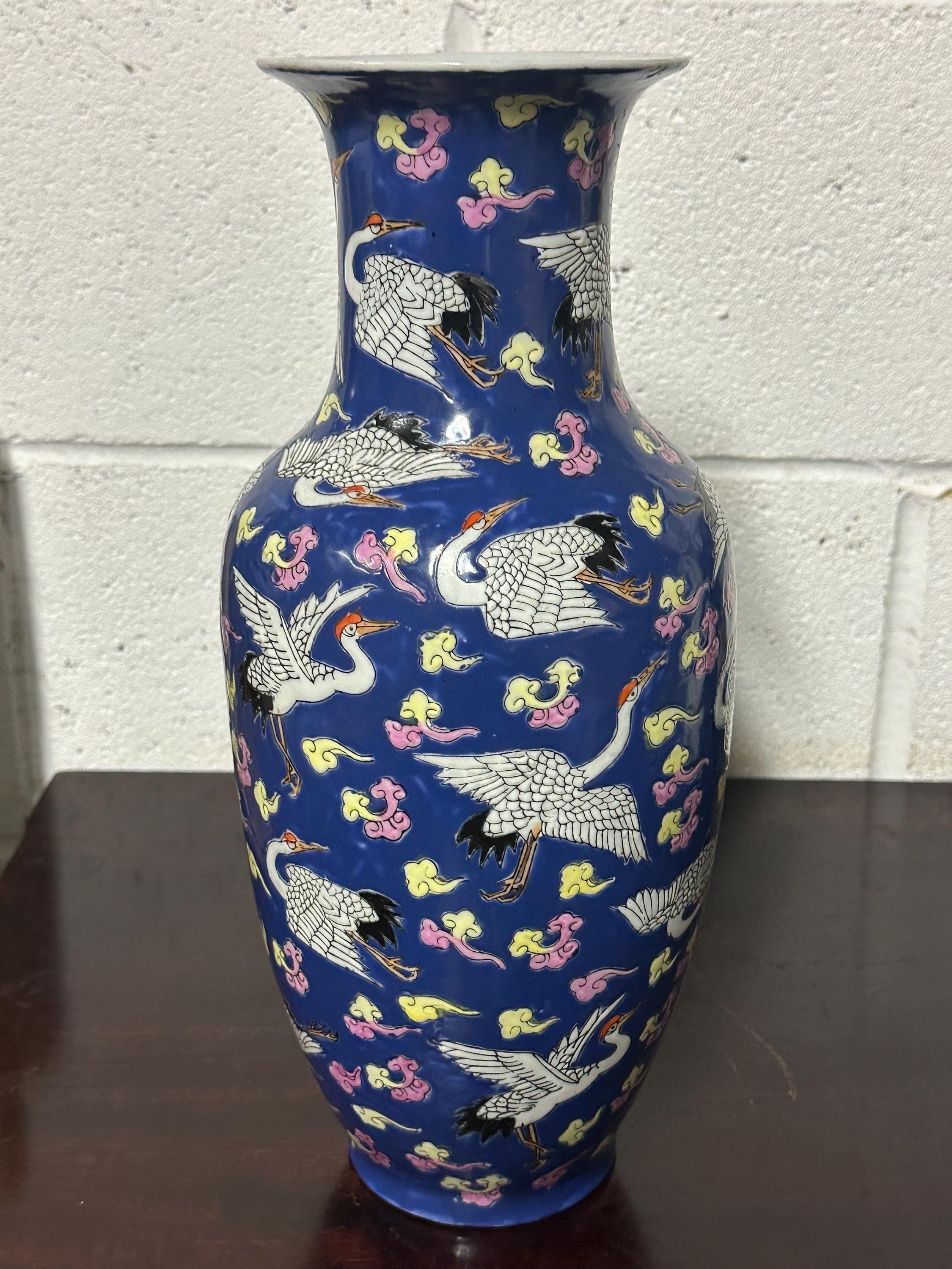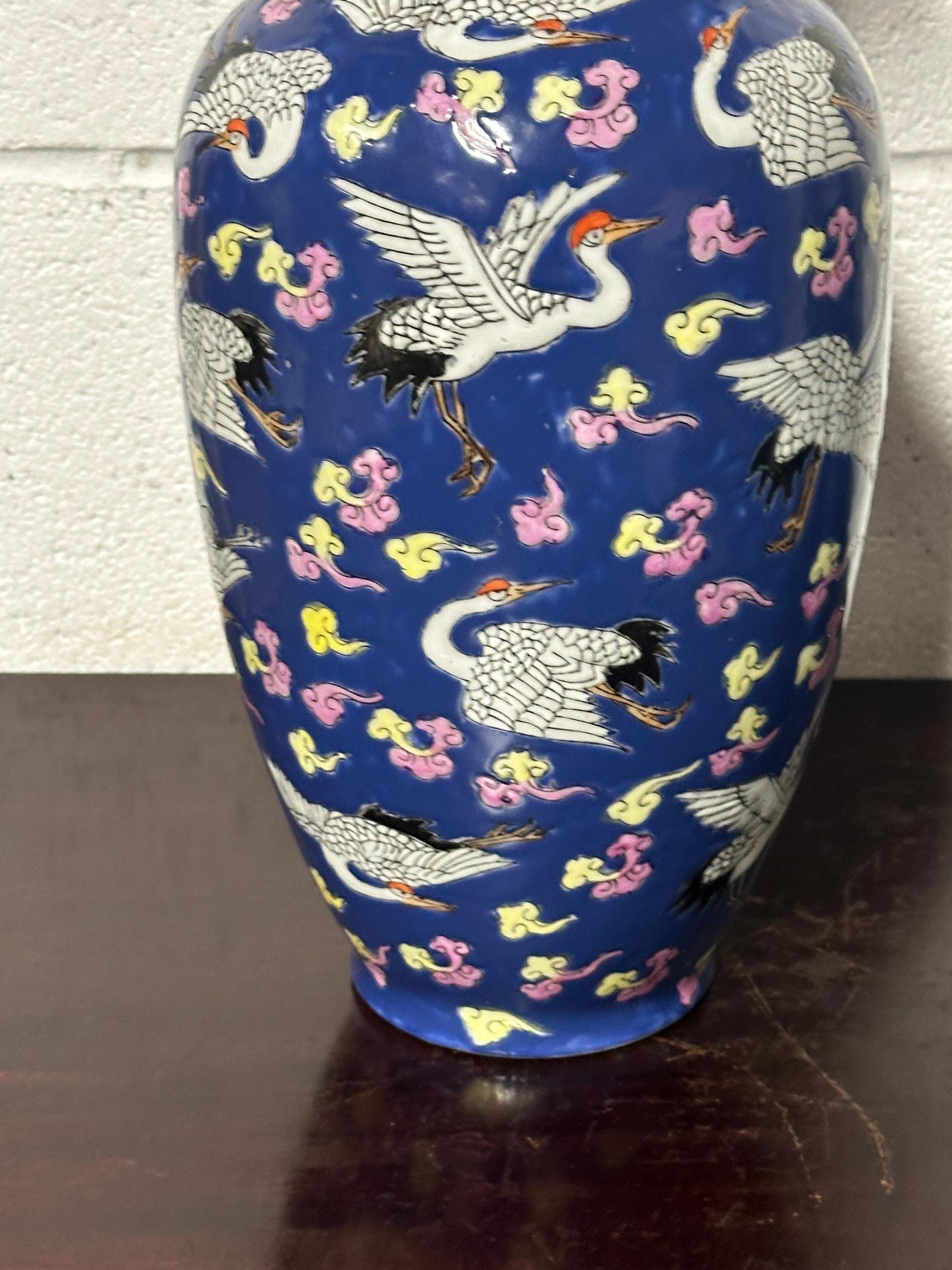 A striking vintage Chinese Famille Rose porcelain vase featuring an elegant deep blue ground richly decorated with flying cranes among colourful scrolling clouds. The design is beautifully hand-painted in fine detail with white cranes outlined in black and highlighted with red crests — a traditional Chinese symbol of longevity and good fortune.