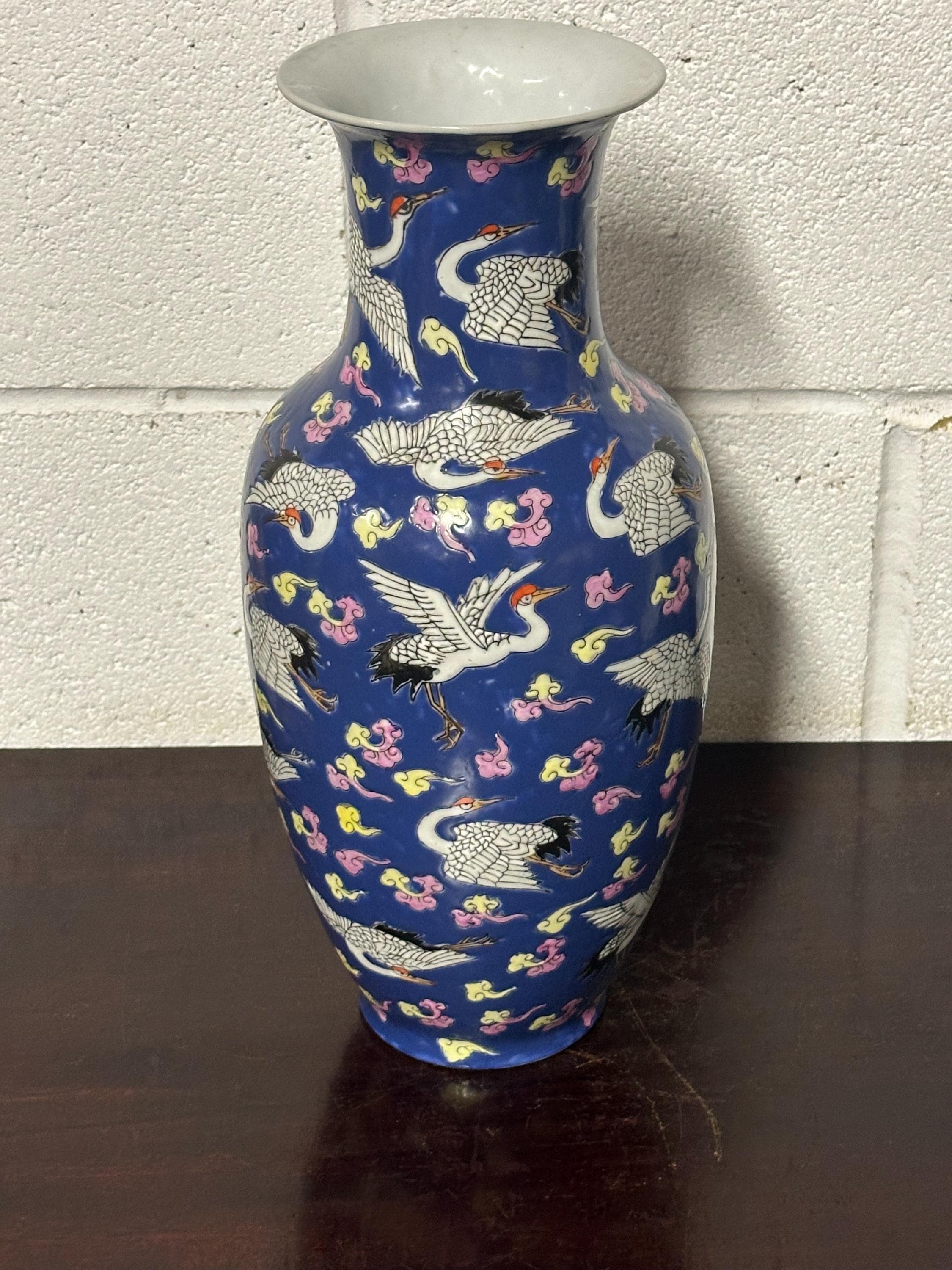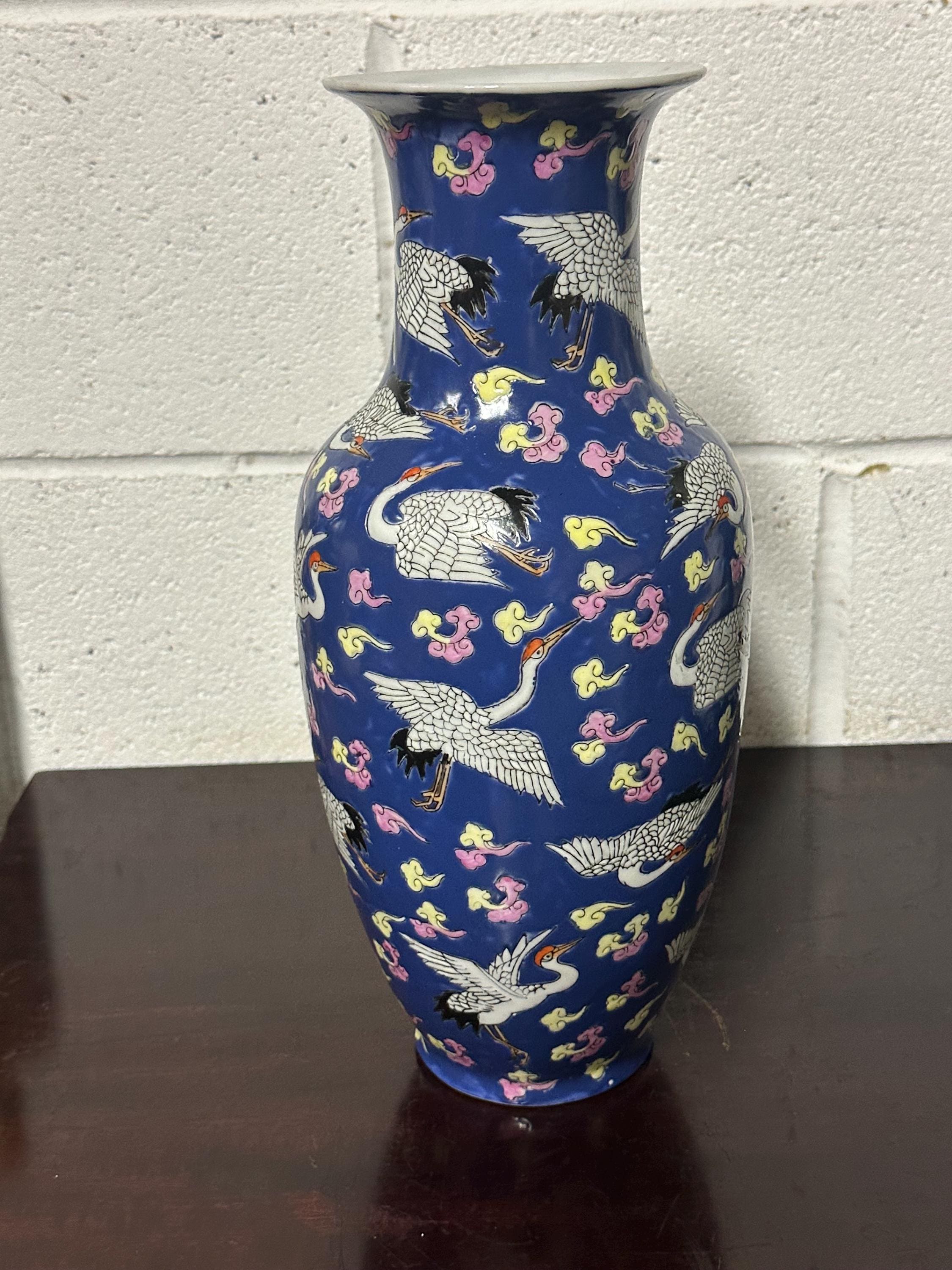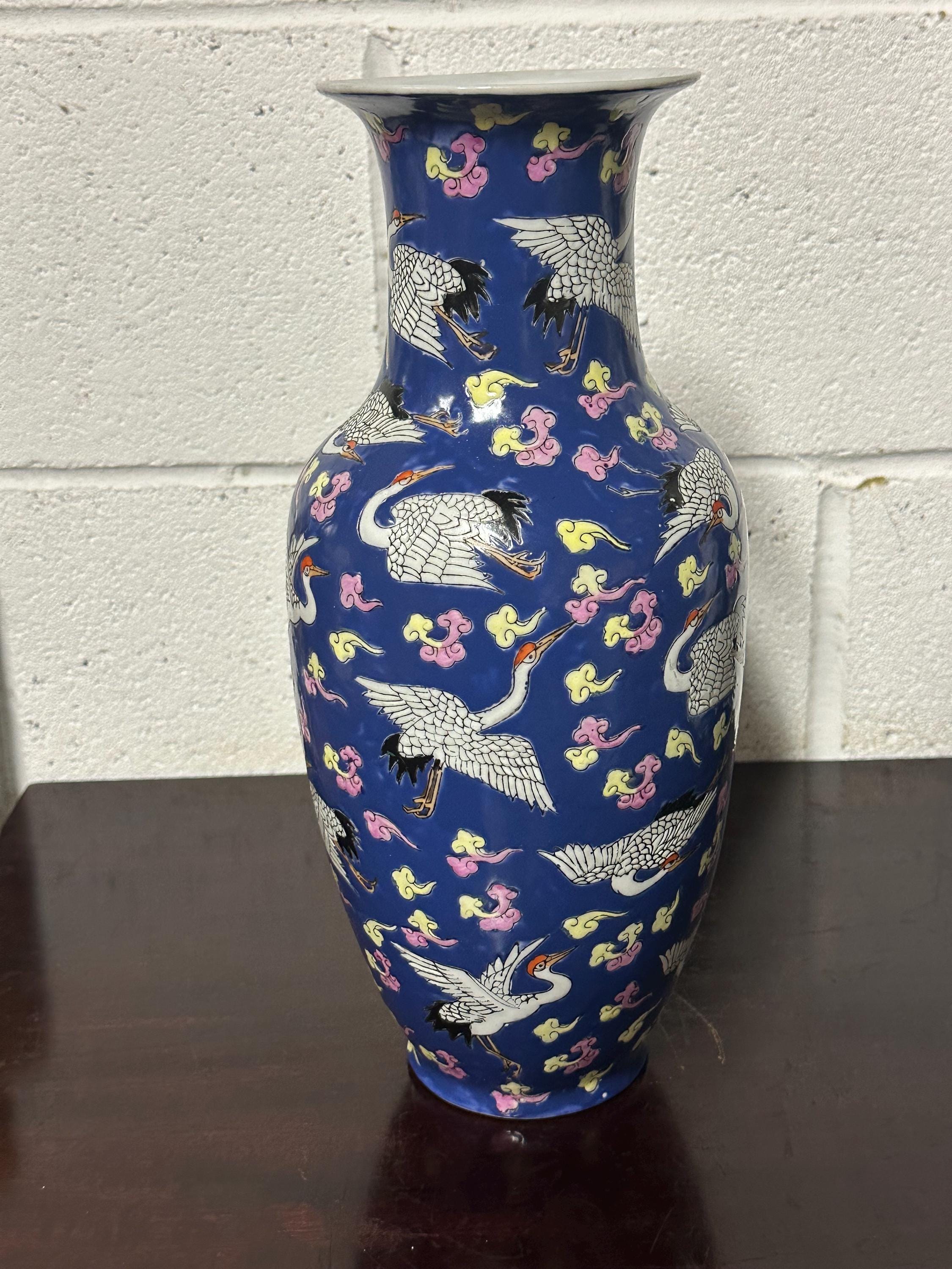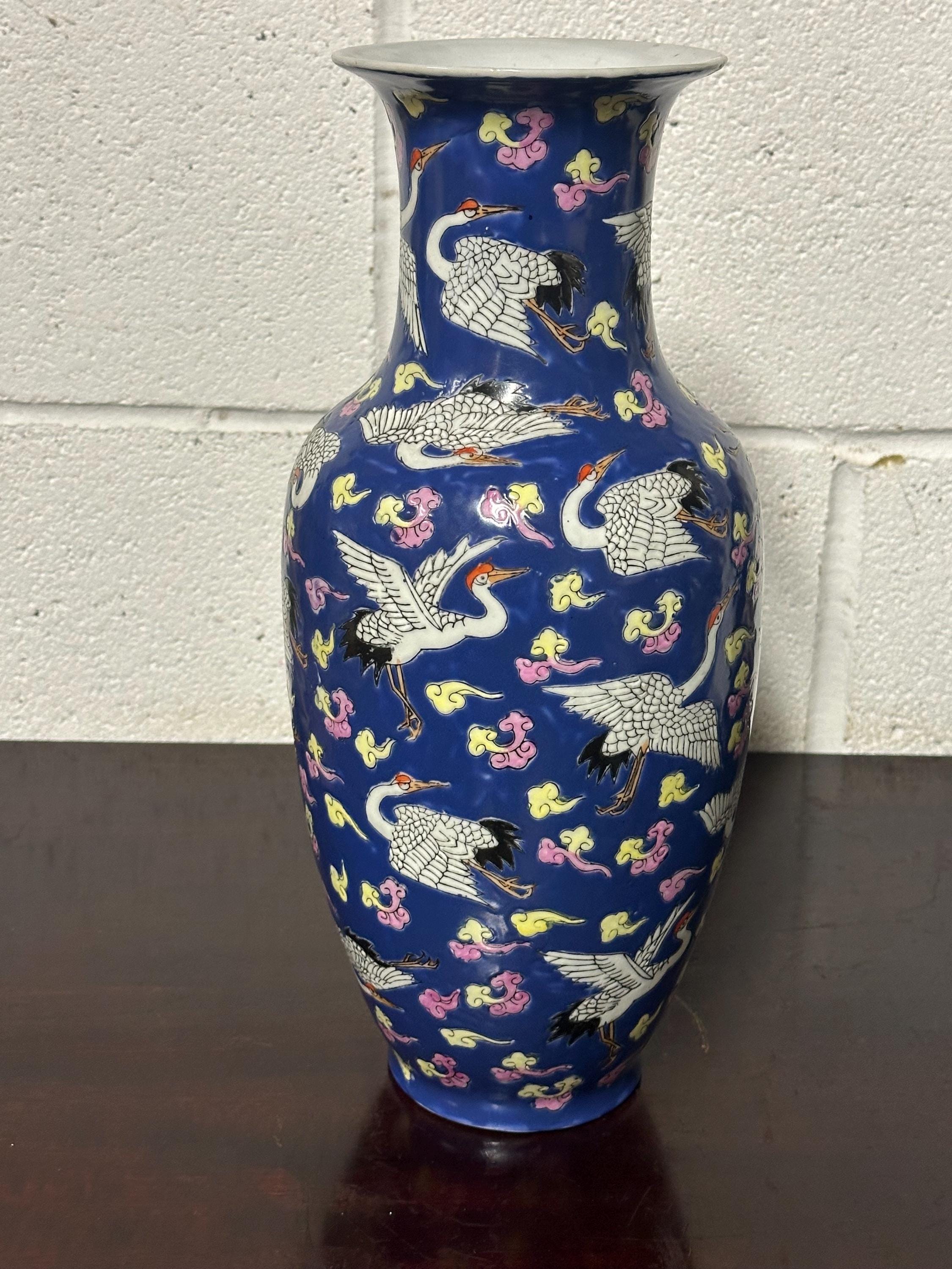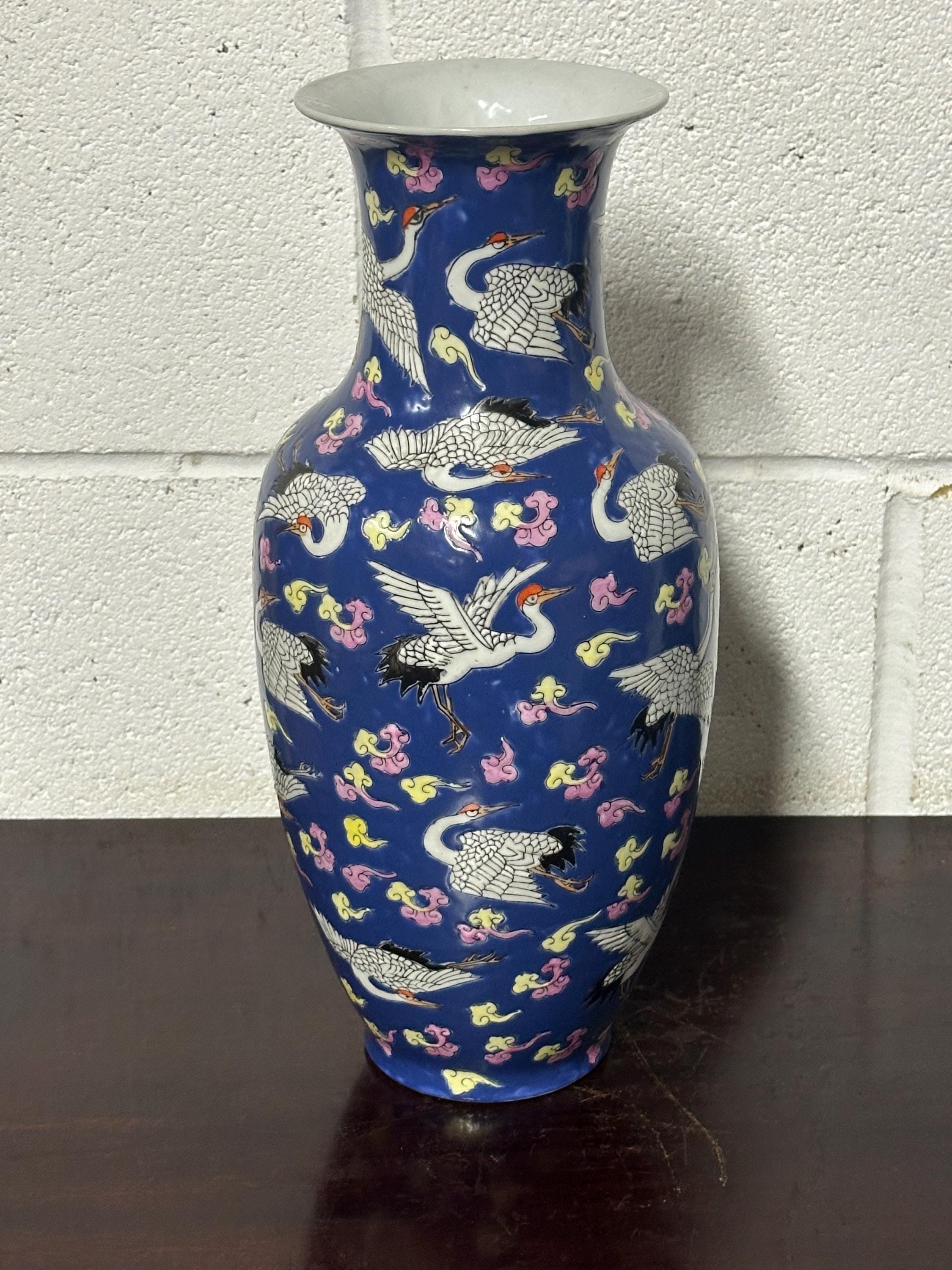 A striking vintage Chinese Famille Rose porcelain vase featuring an elegant deep blue ground richly decorated with flying cranes among colourful scrolling clouds. The design is beautifully hand-painted in fine detail with white cranes outlined in black and highlighted with red crests — a traditional Chinese symbol of longevity and good fortune.