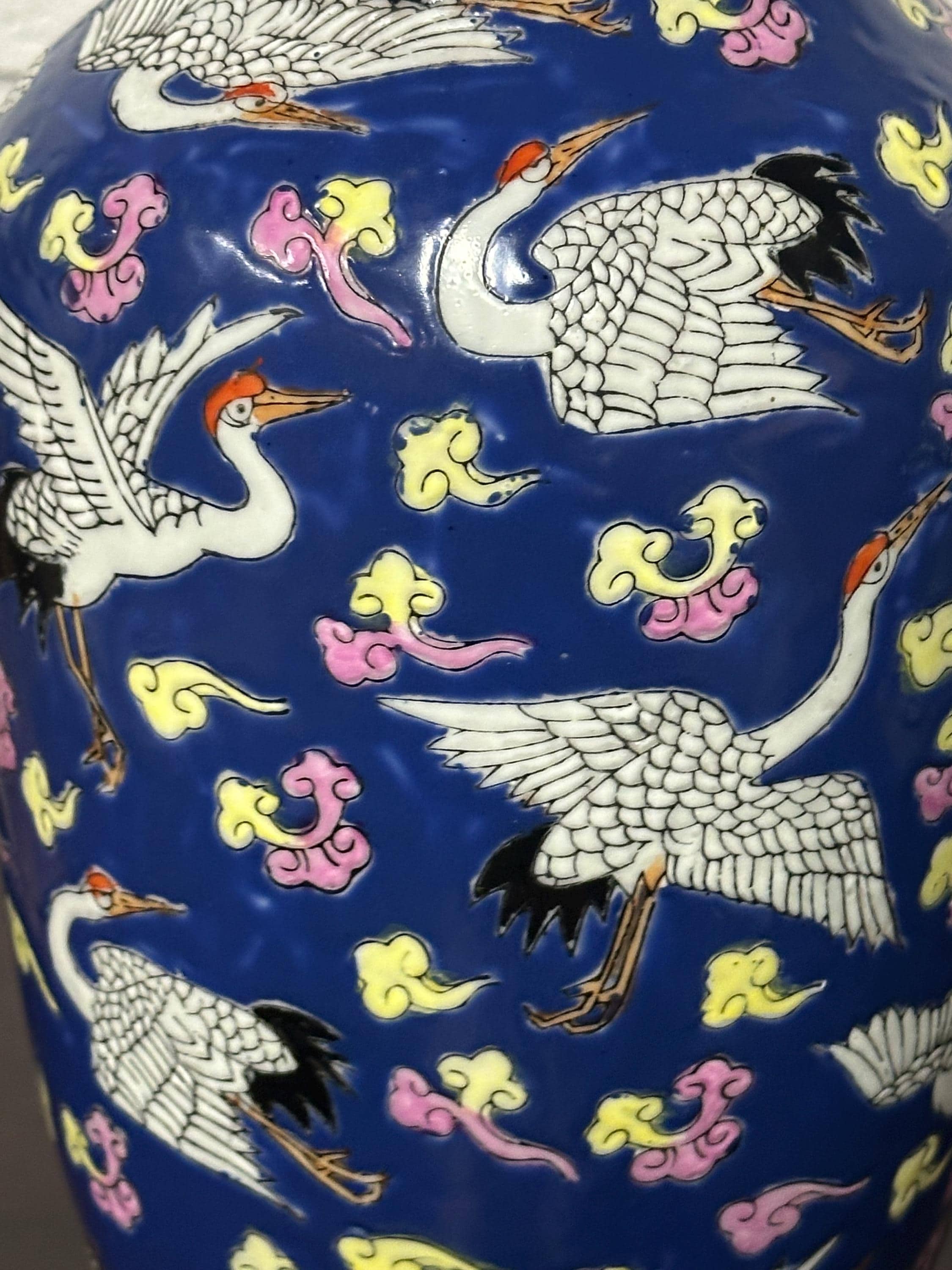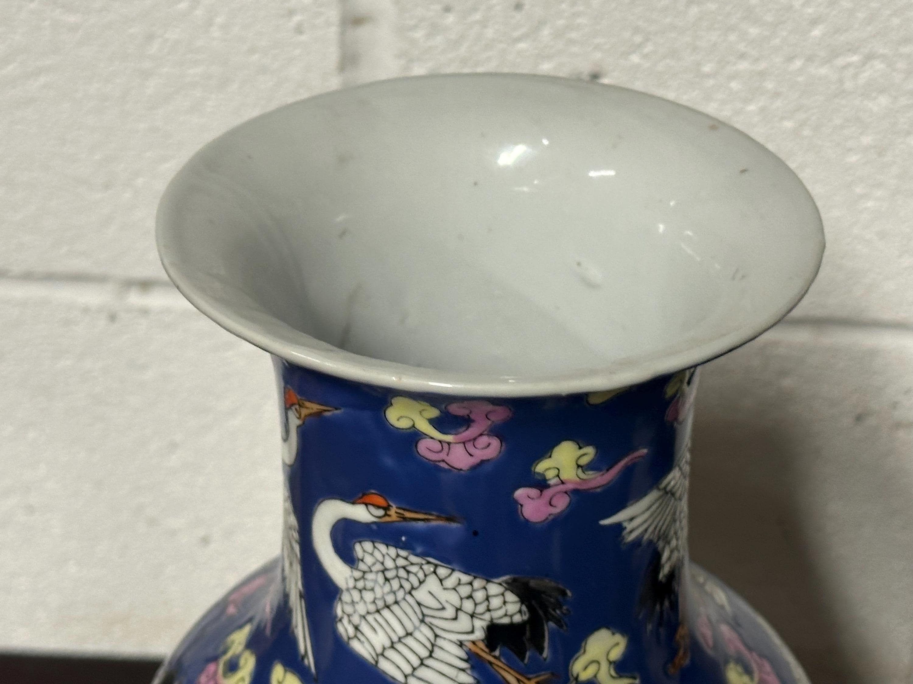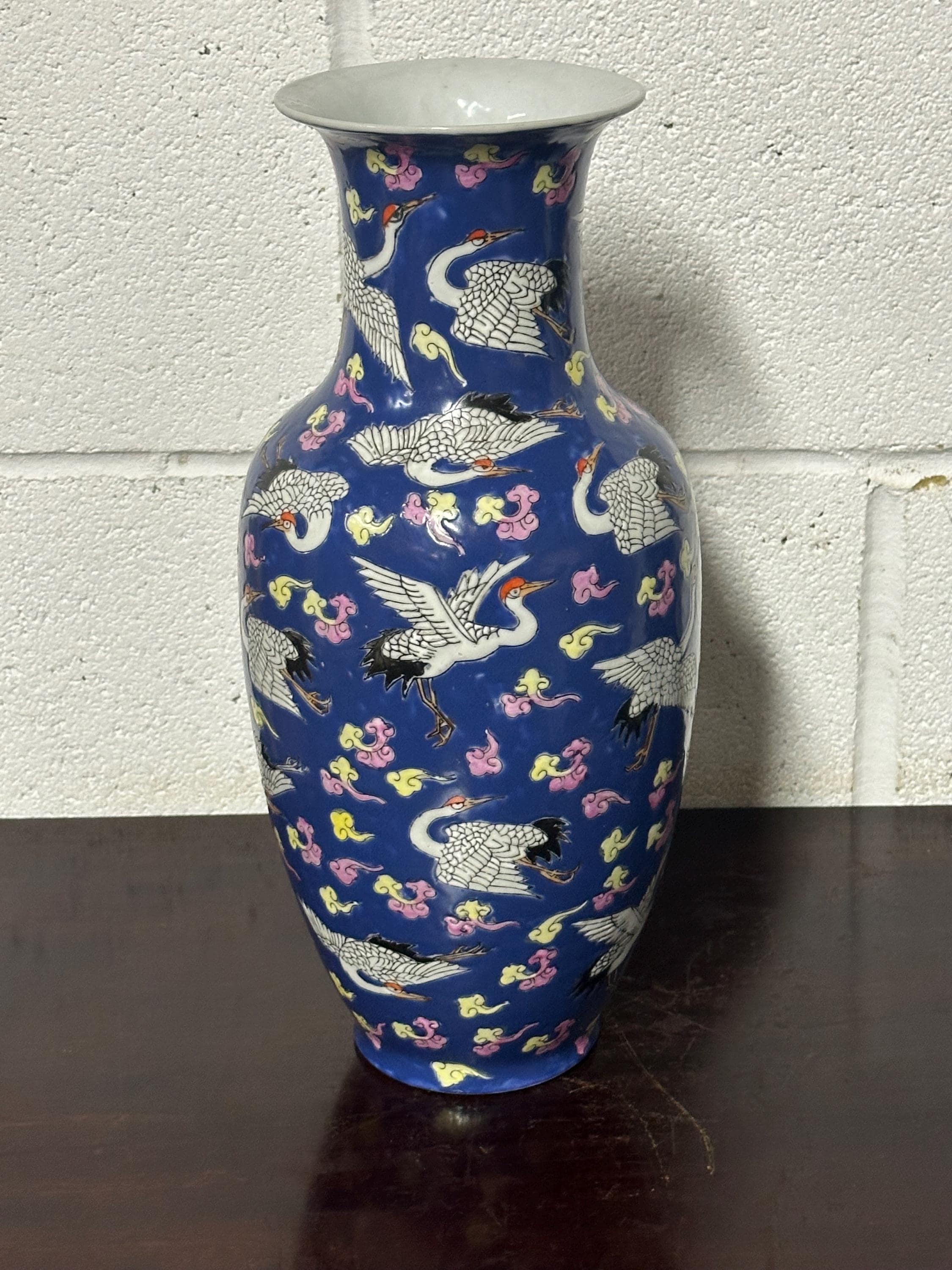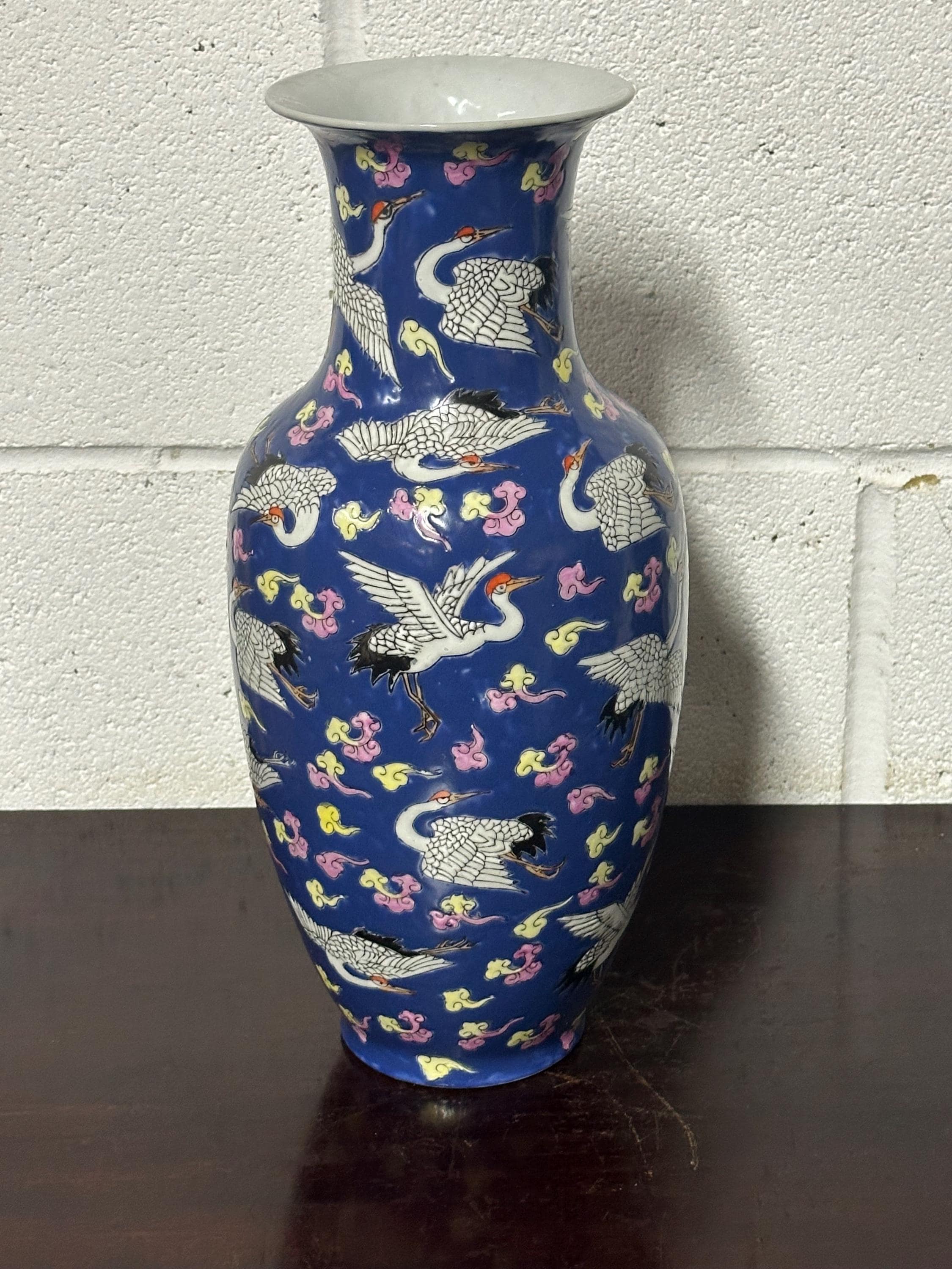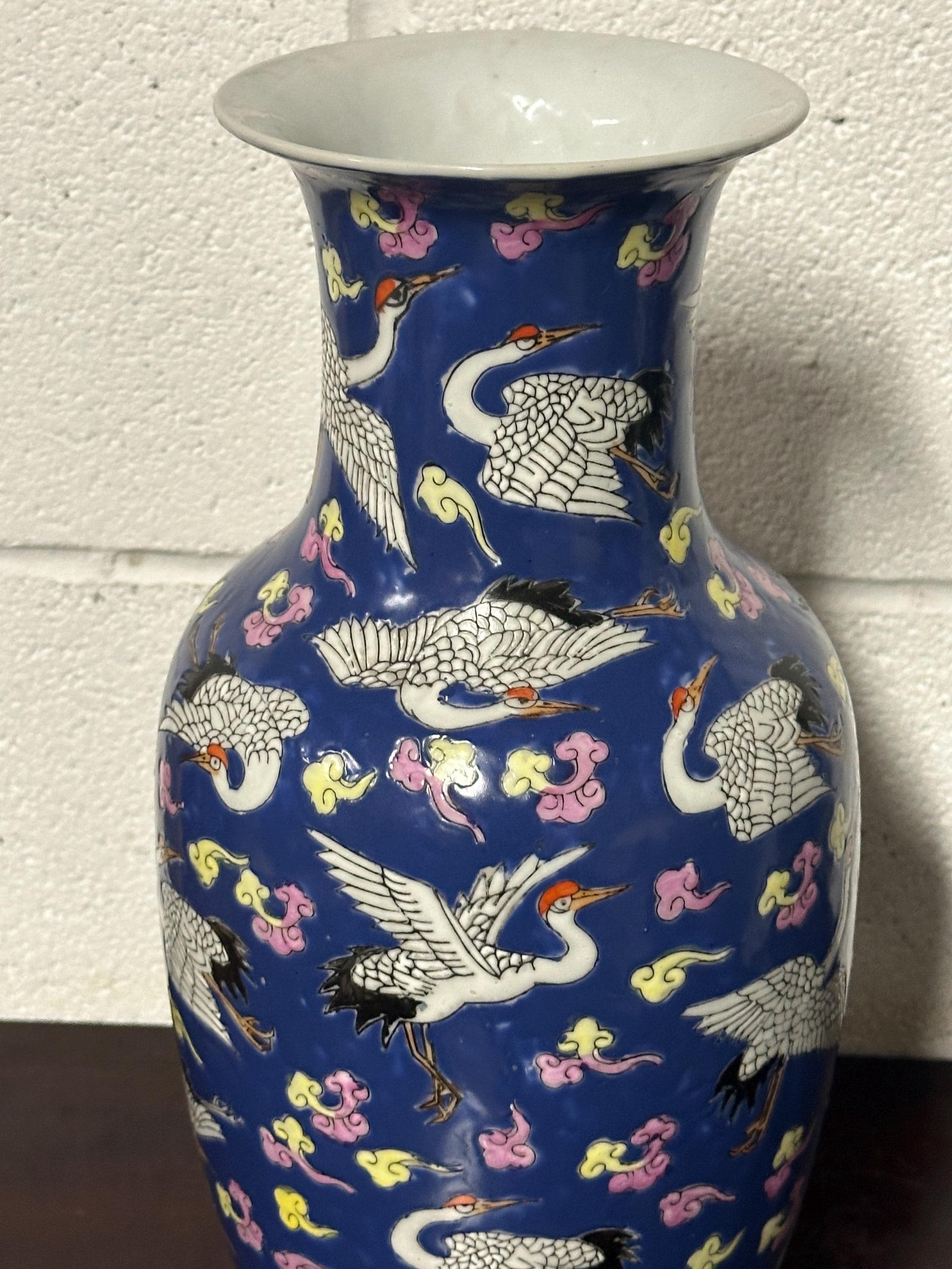 A striking vintage Chinese Famille Rose porcelain vase featuring an elegant deep blue ground richly decorated with flying cranes among colourful scrolling clouds. The design is beautifully hand-painted in fine detail with white cranes outlined in black and highlighted with red crests — a traditional Chinese symbol of longevity and good fortune.