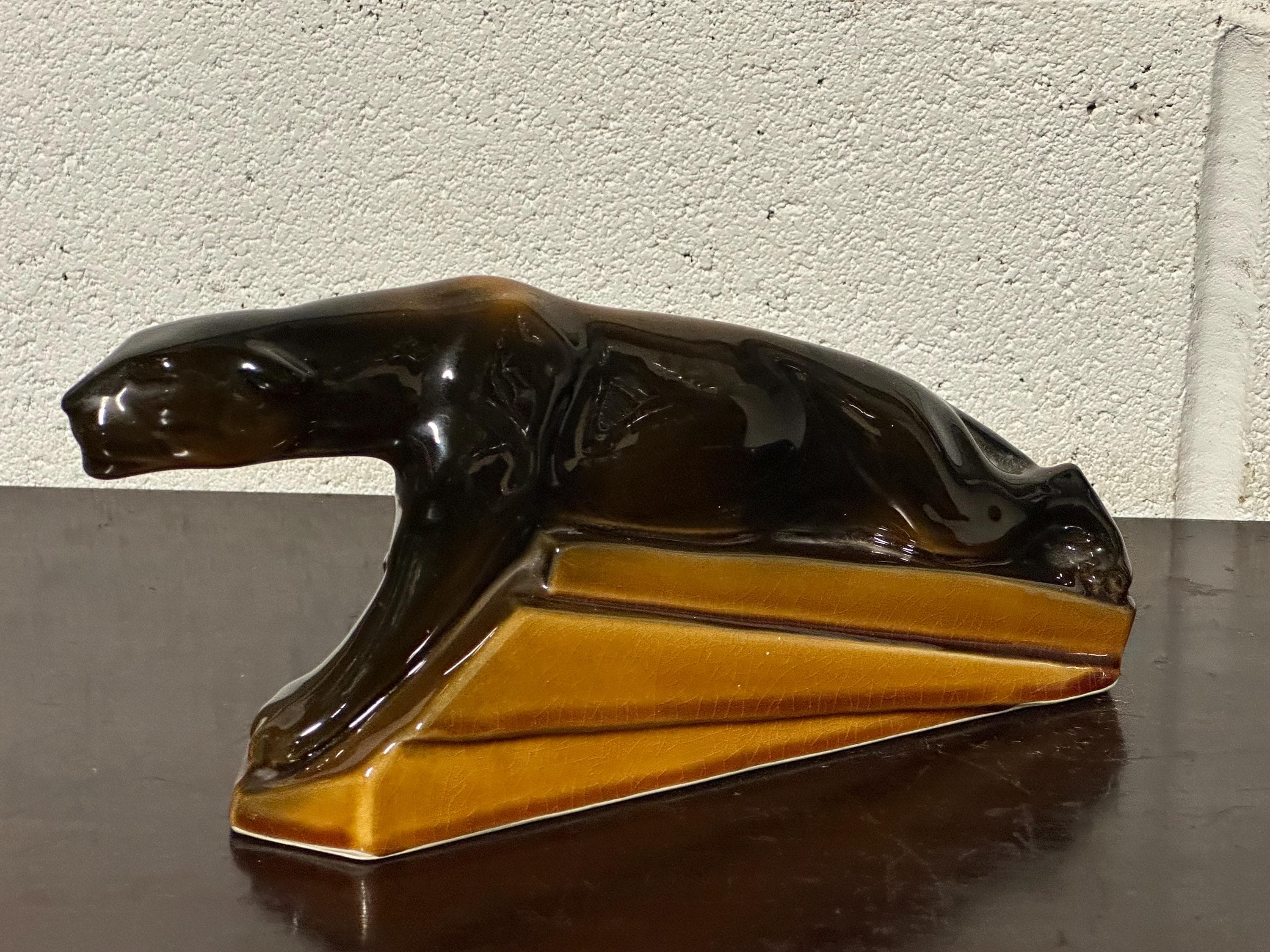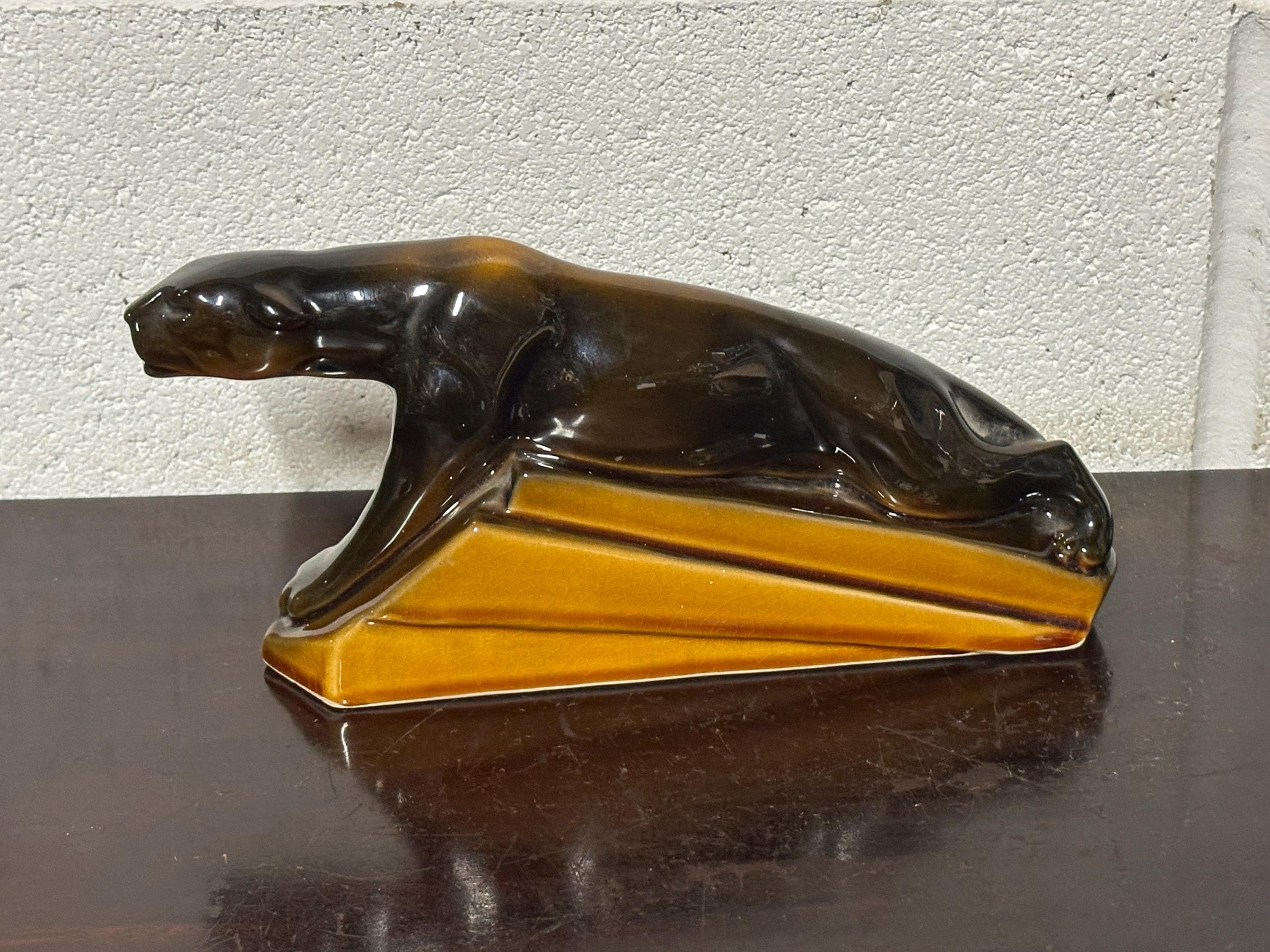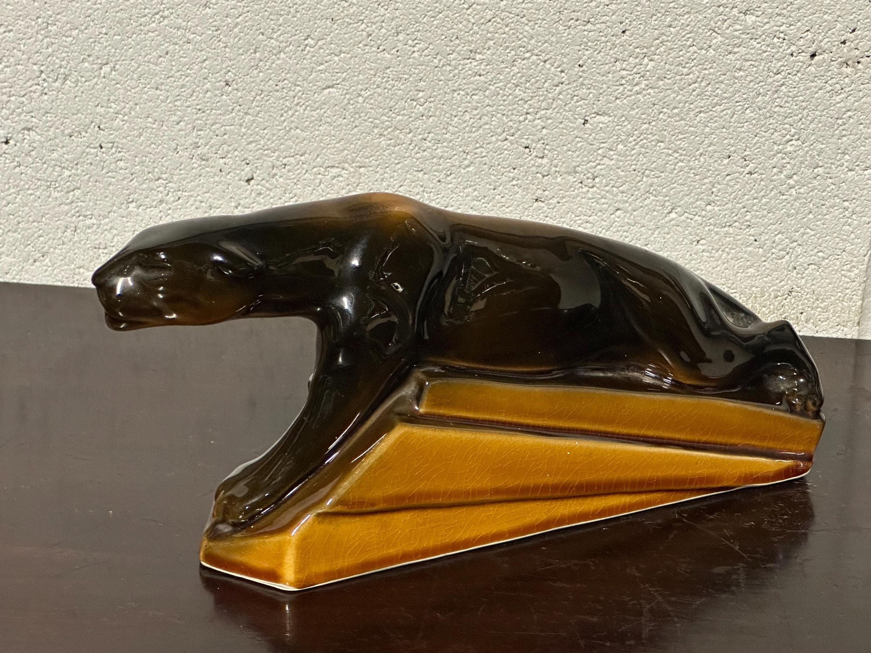 A striking Art Deco ceramic panther figurine dating from around the 1930s. This elegant piece captures the sleek power and grace of a prowling panther, sculpted in a streamlined and geometric form typical of the Art Deco era.