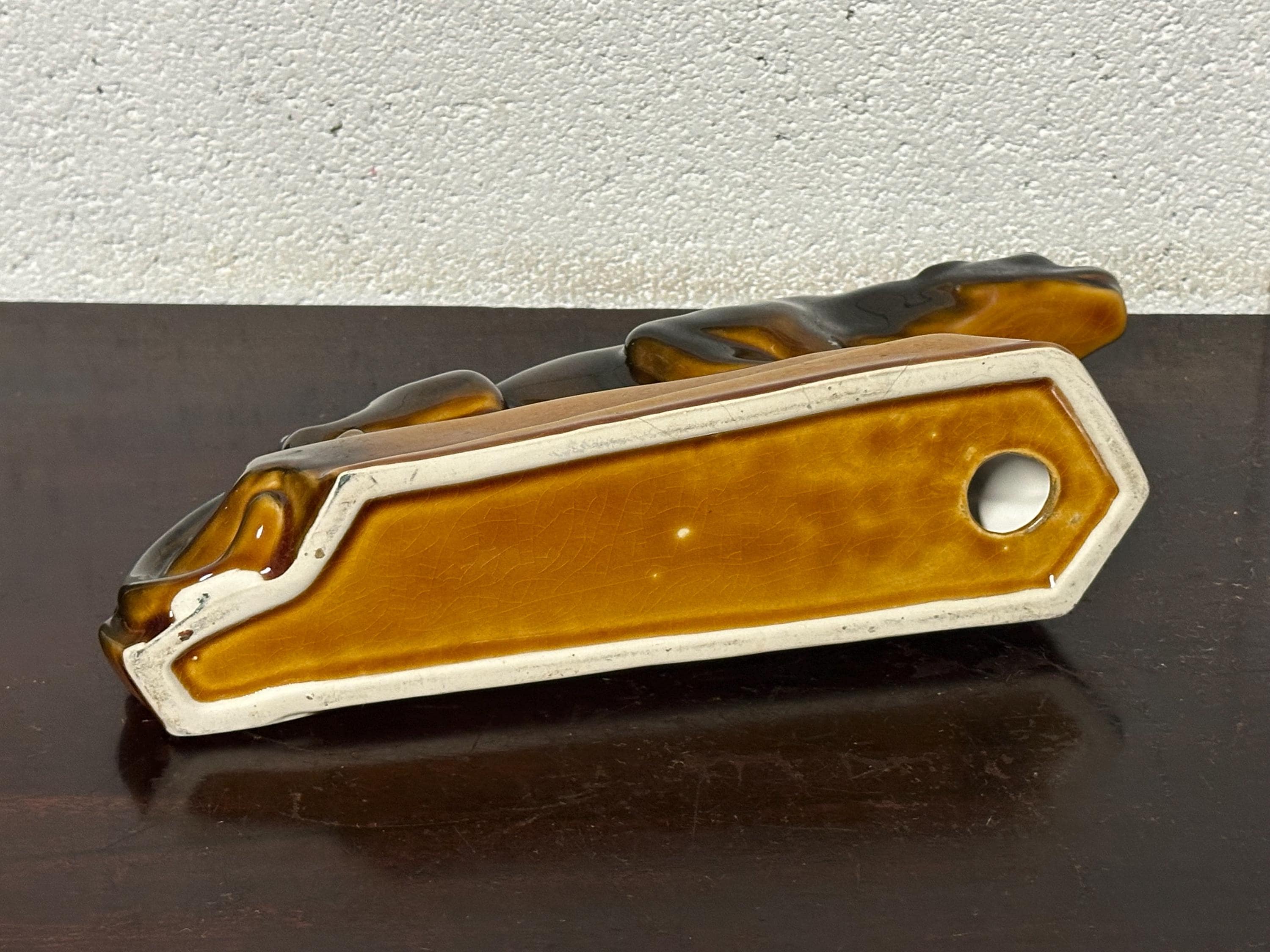 The rich glaze transitions from deep ebony to warm amber tones, accentuating the stylised contours of the animal and its angular plinth base. A fine example of early 20th-century decorative ceramics, perfect for display on a sideboard, mantle, or as part of a vintage interior collection.