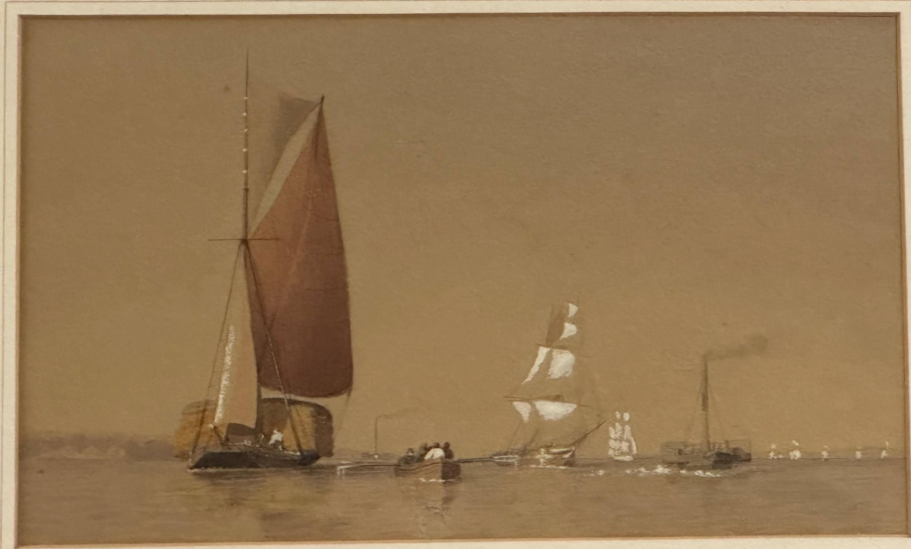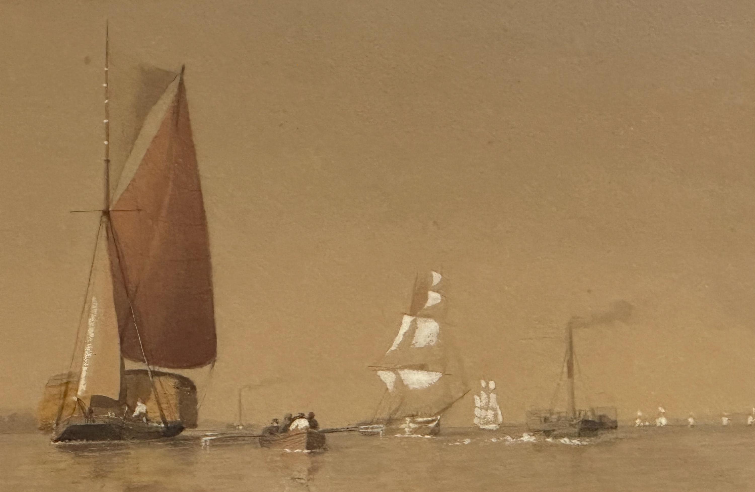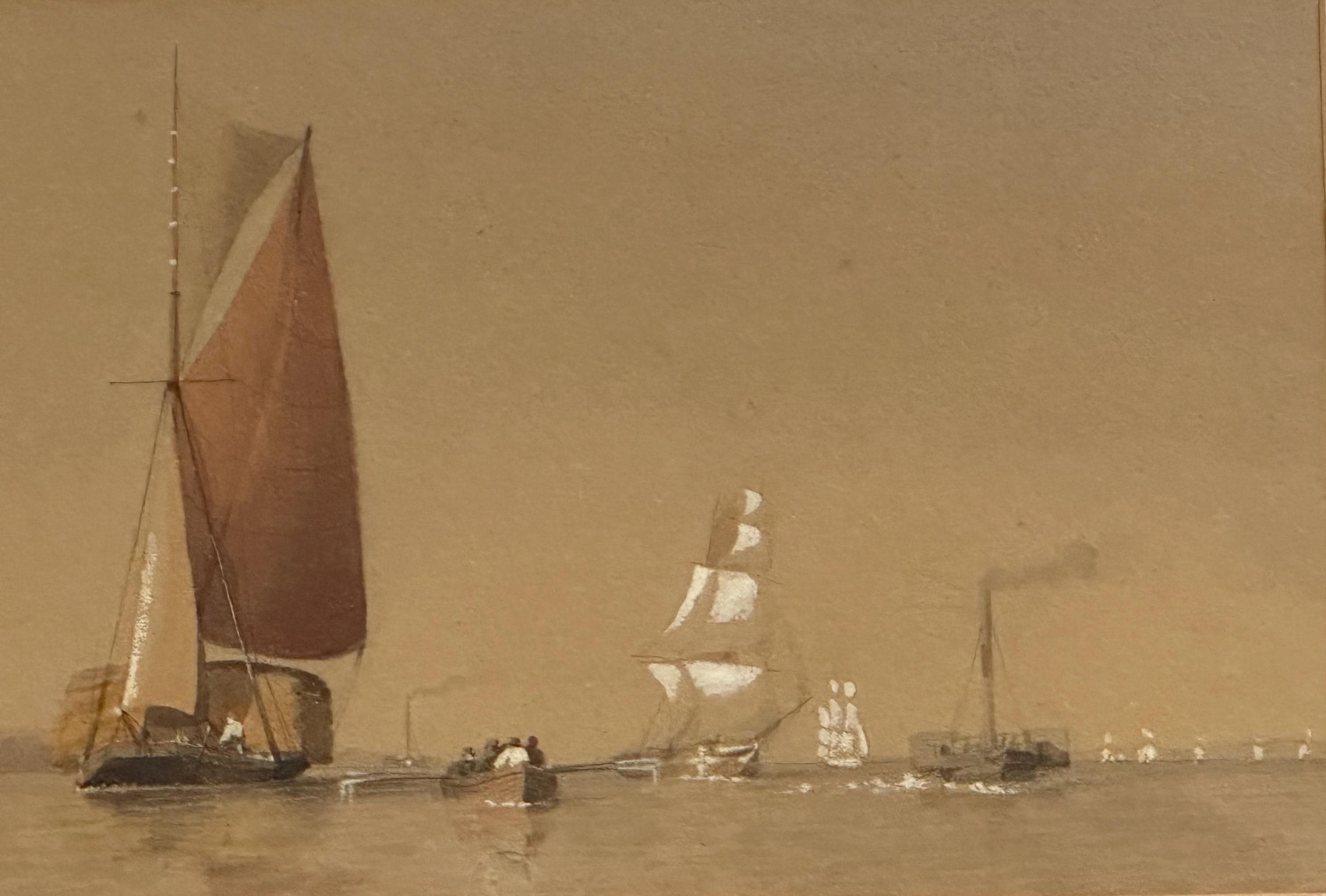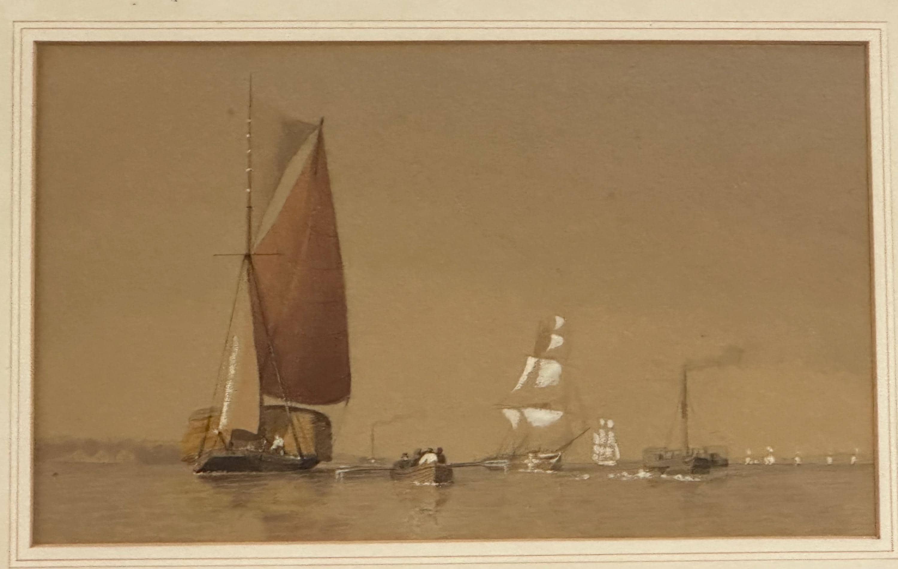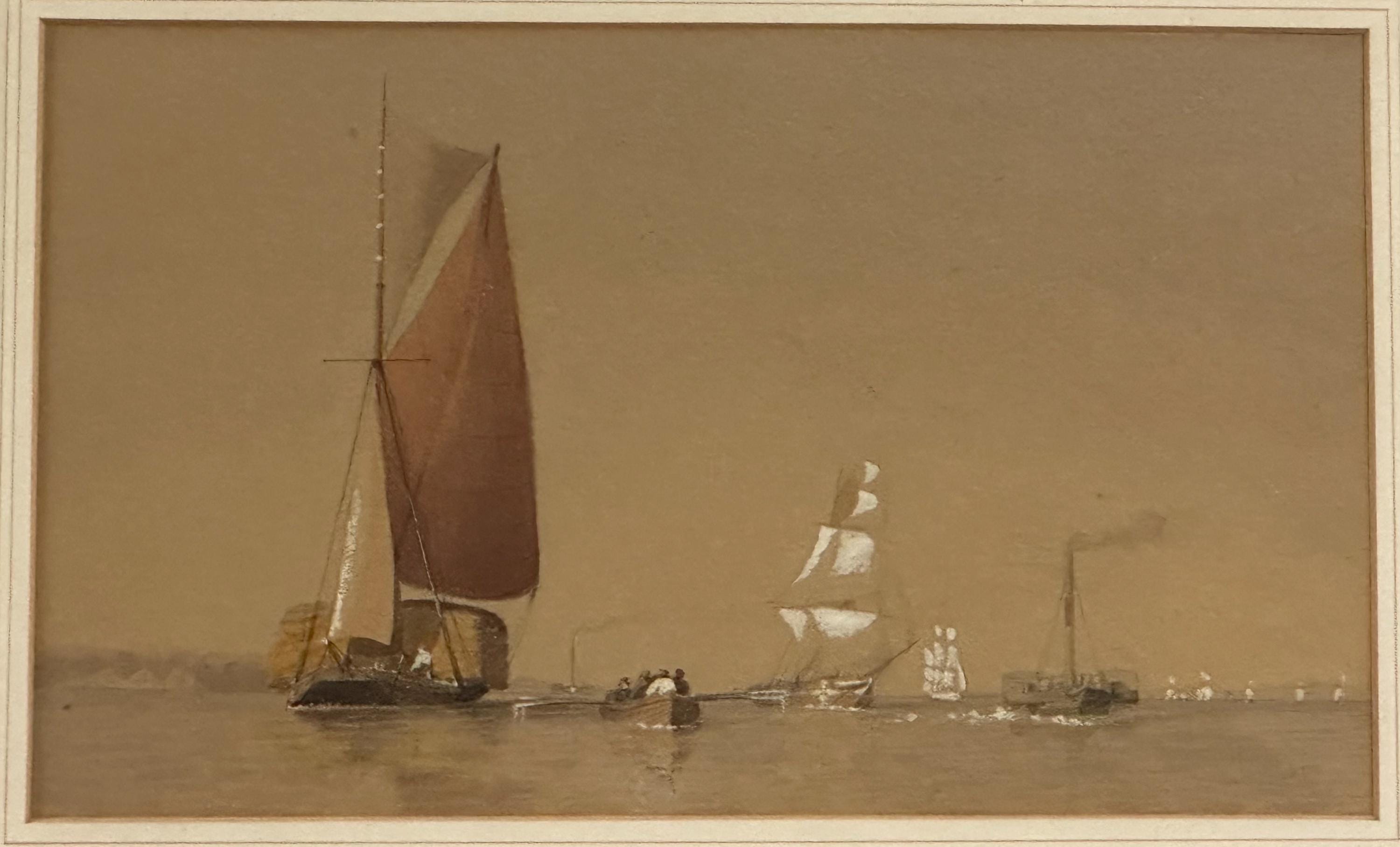 A charming 19th-century watercolour depicting a tranquil maritime scene featuring a mix of sailing and steam vessels gliding across calm waters under a soft, muted sky. The artist captures the subtle transition from sail to steam, illustrating an important era in nautical history.
