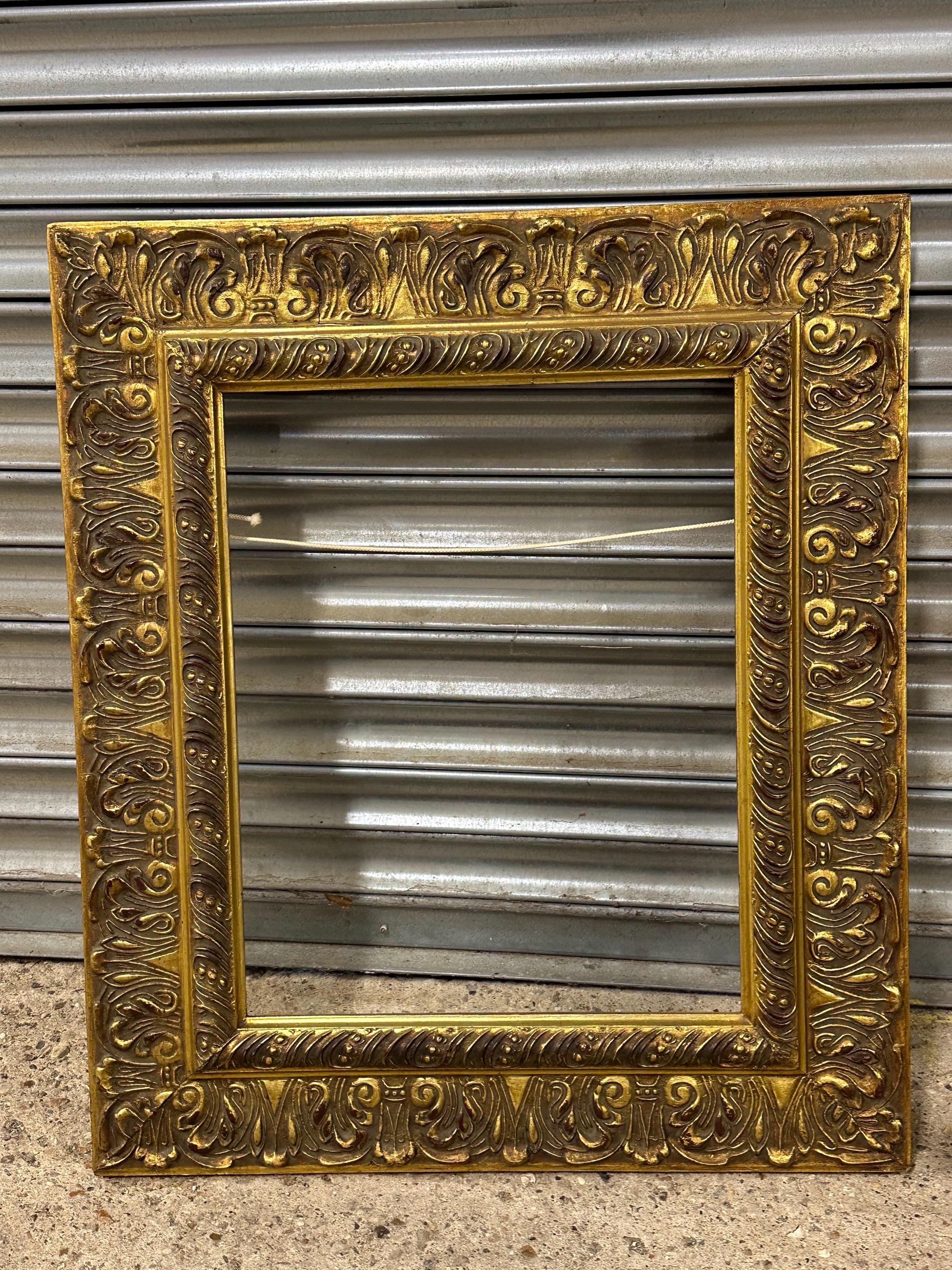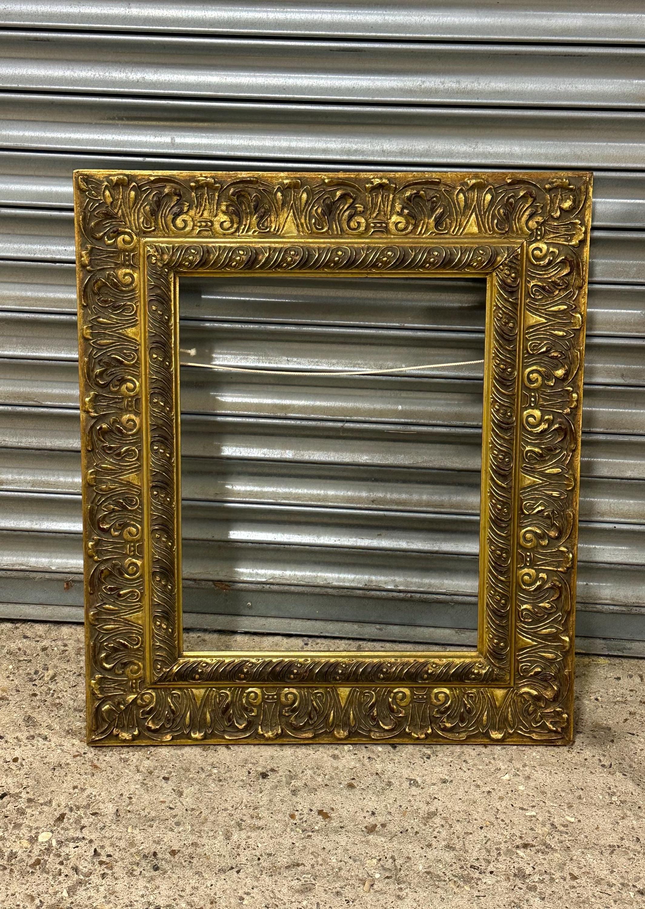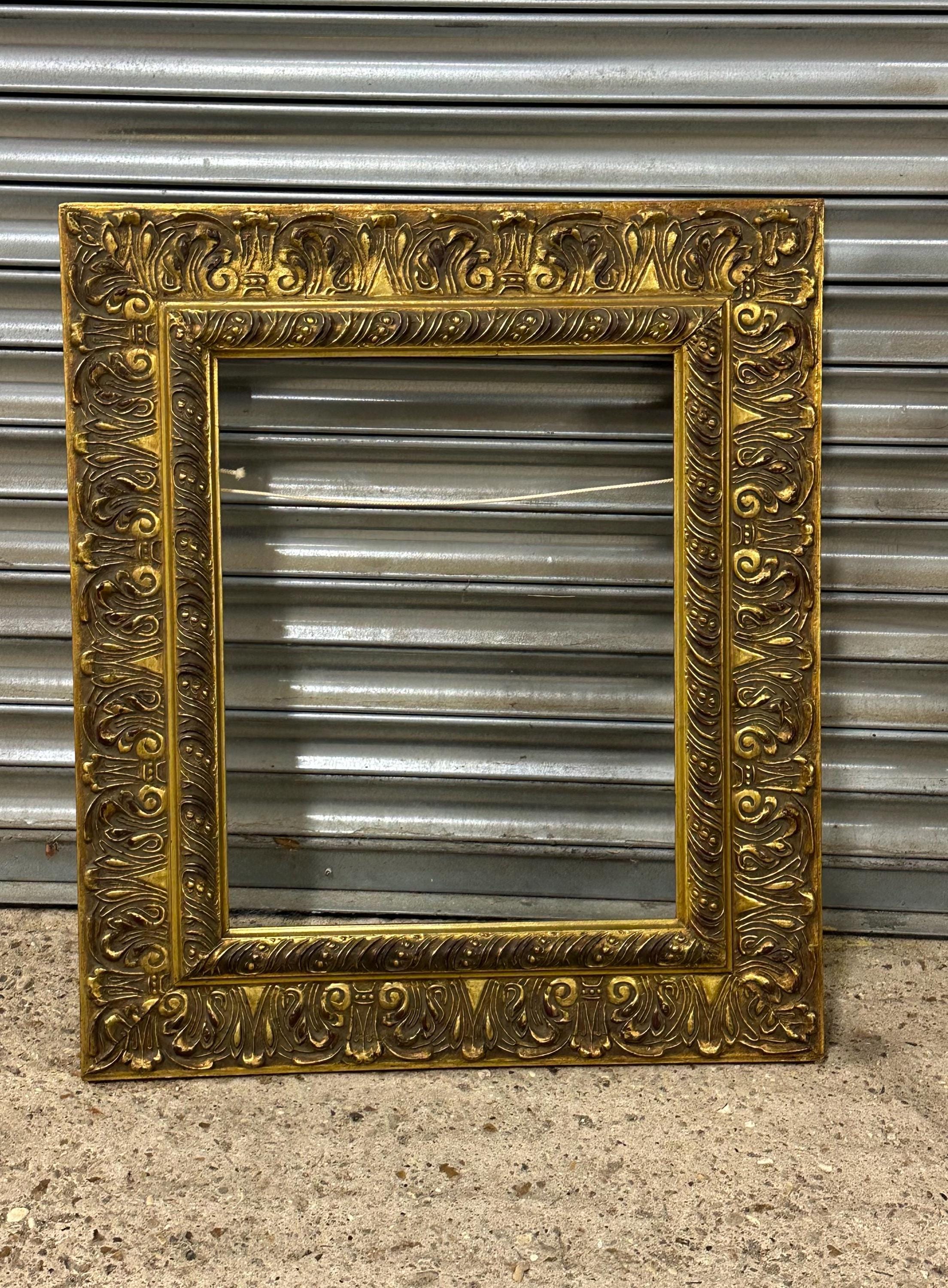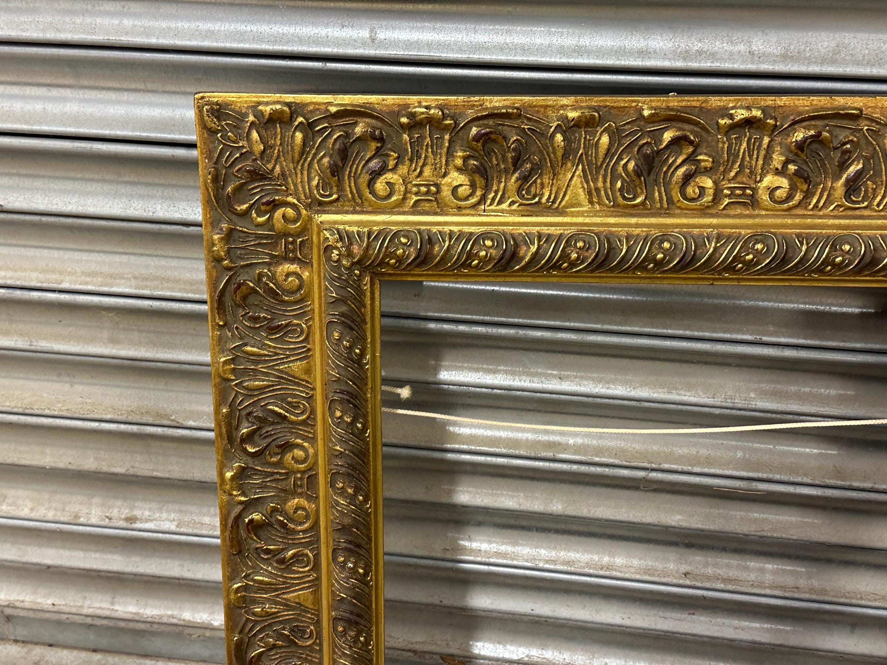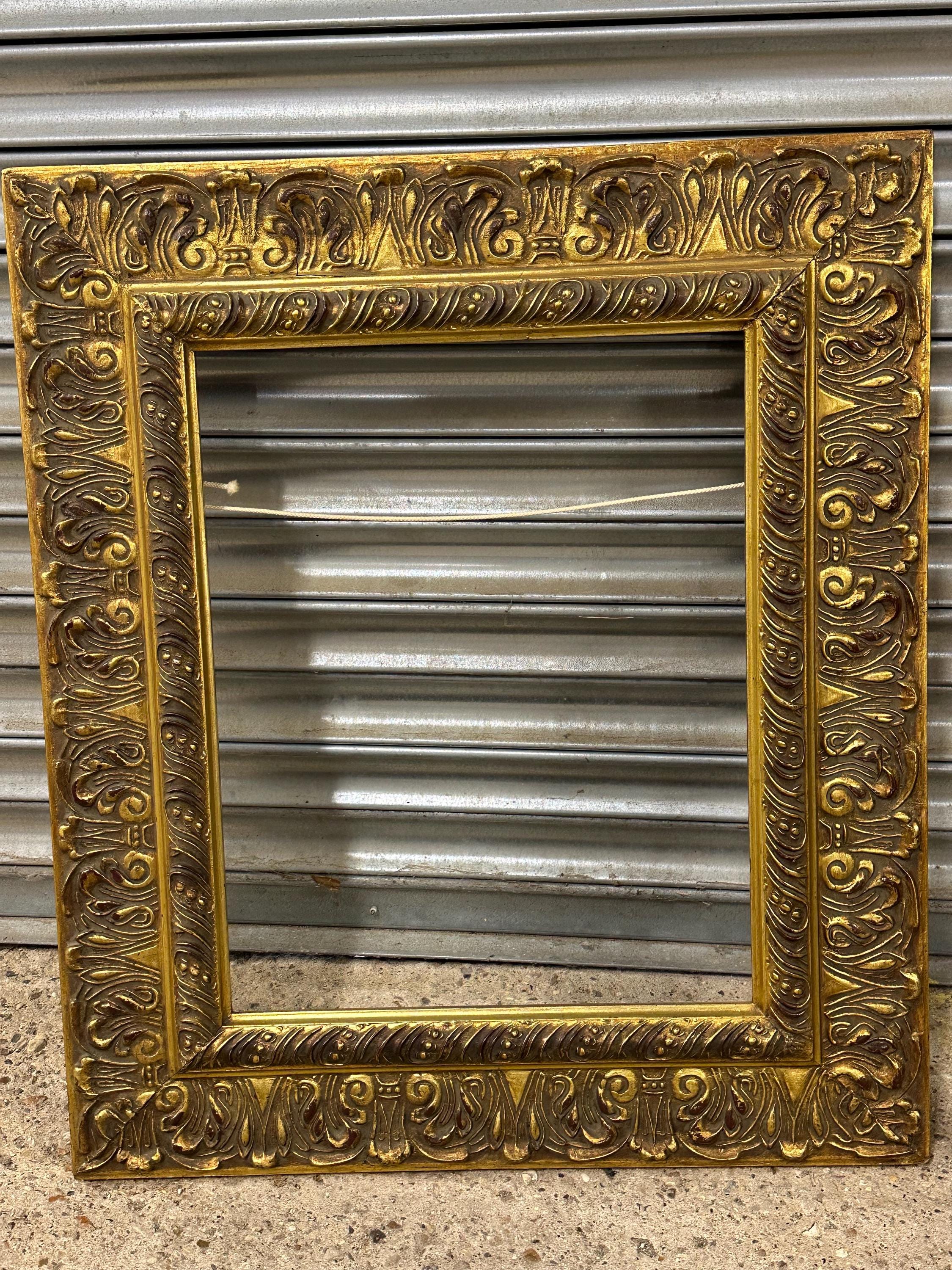 A beautiful and richly detailed gilt frame featuring ornate scrolling and acanthus leaf decoration throughout. The frame has a classic antique look with an aged patina that adds warmth and depth to the gold finish. Ideal for displaying oil paintings, prints, or mirrors, or simply as a decorative interior accent.